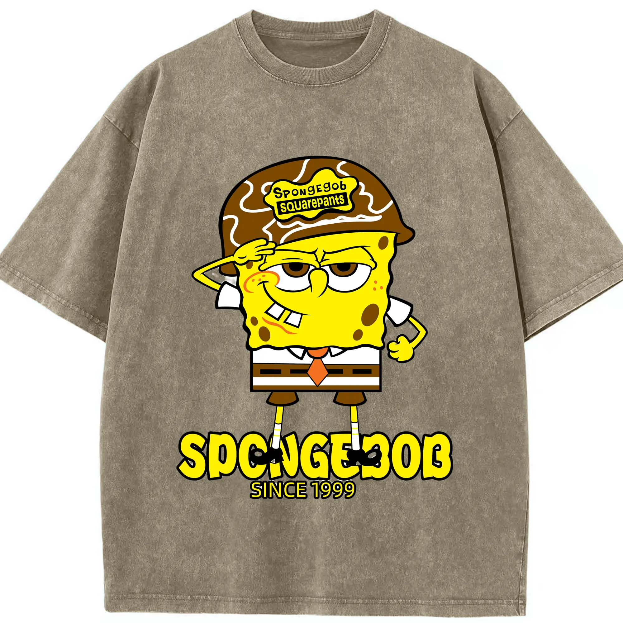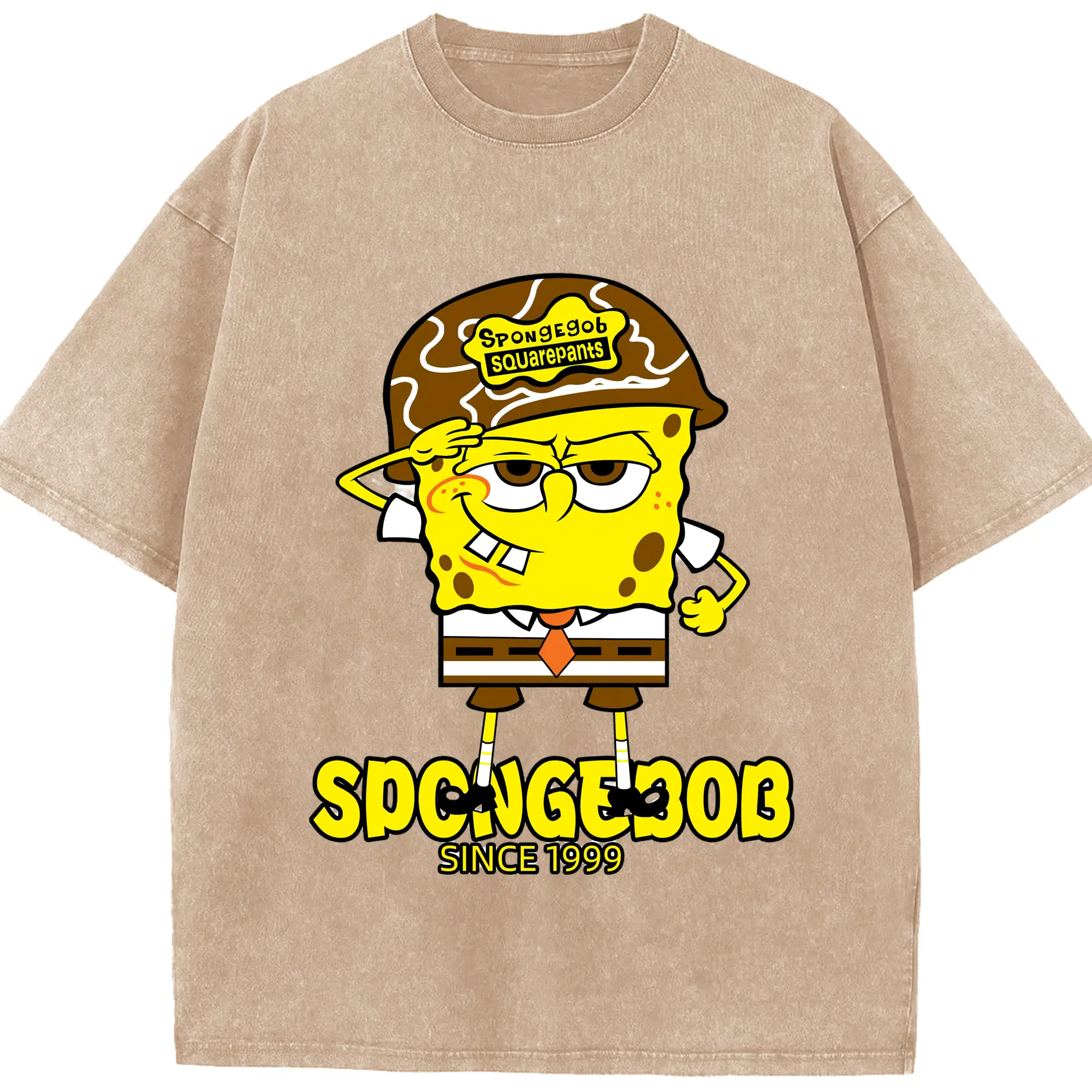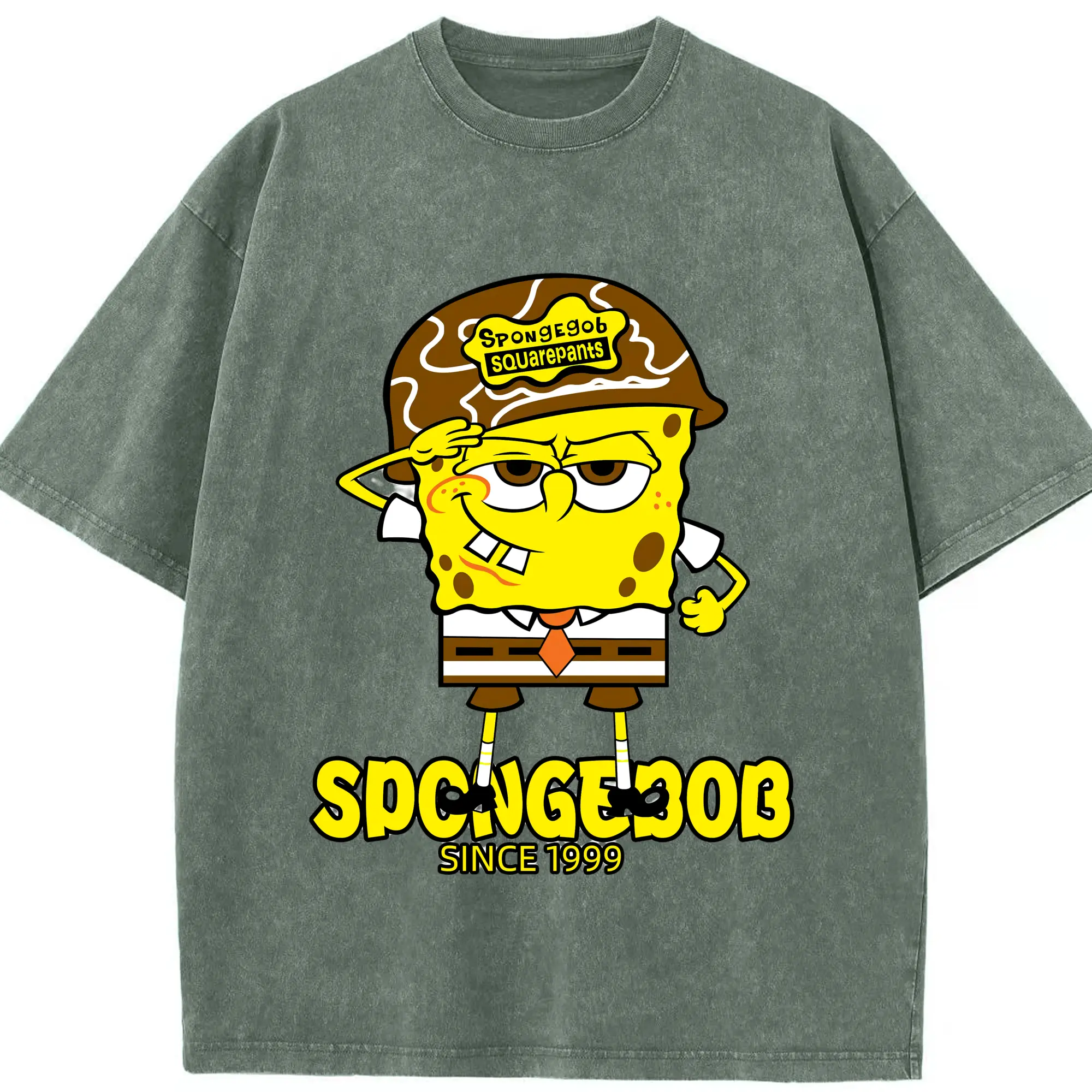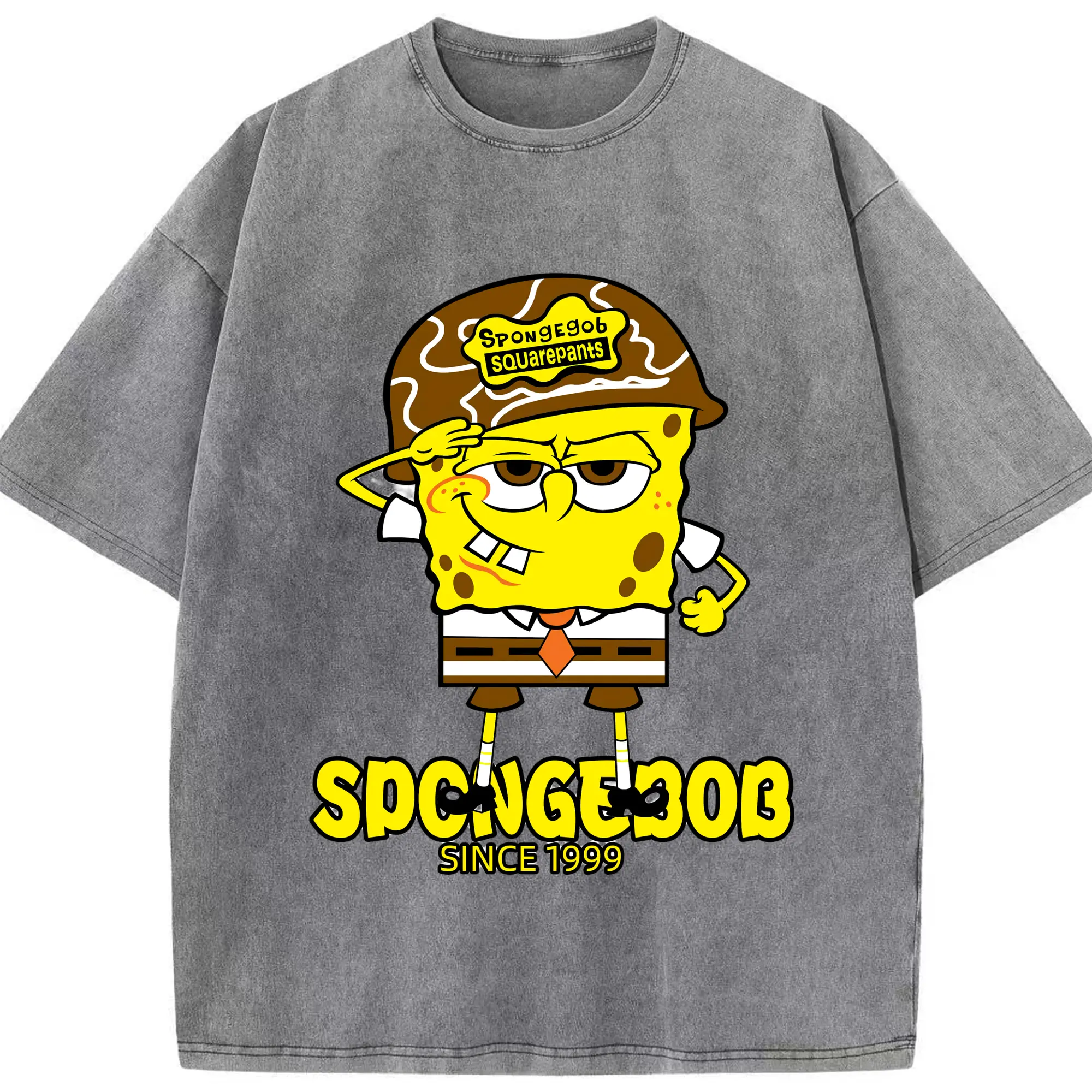 Adults spongebob squarepants soldier graphic t shirts - Washed Vintage Look 230g Cotton Oversized T-Shirt With Front Heat Transfer Print – Soft, Lightweight, Stylish Fit – Comfortable Casual Wear For Sports & Everyday Use