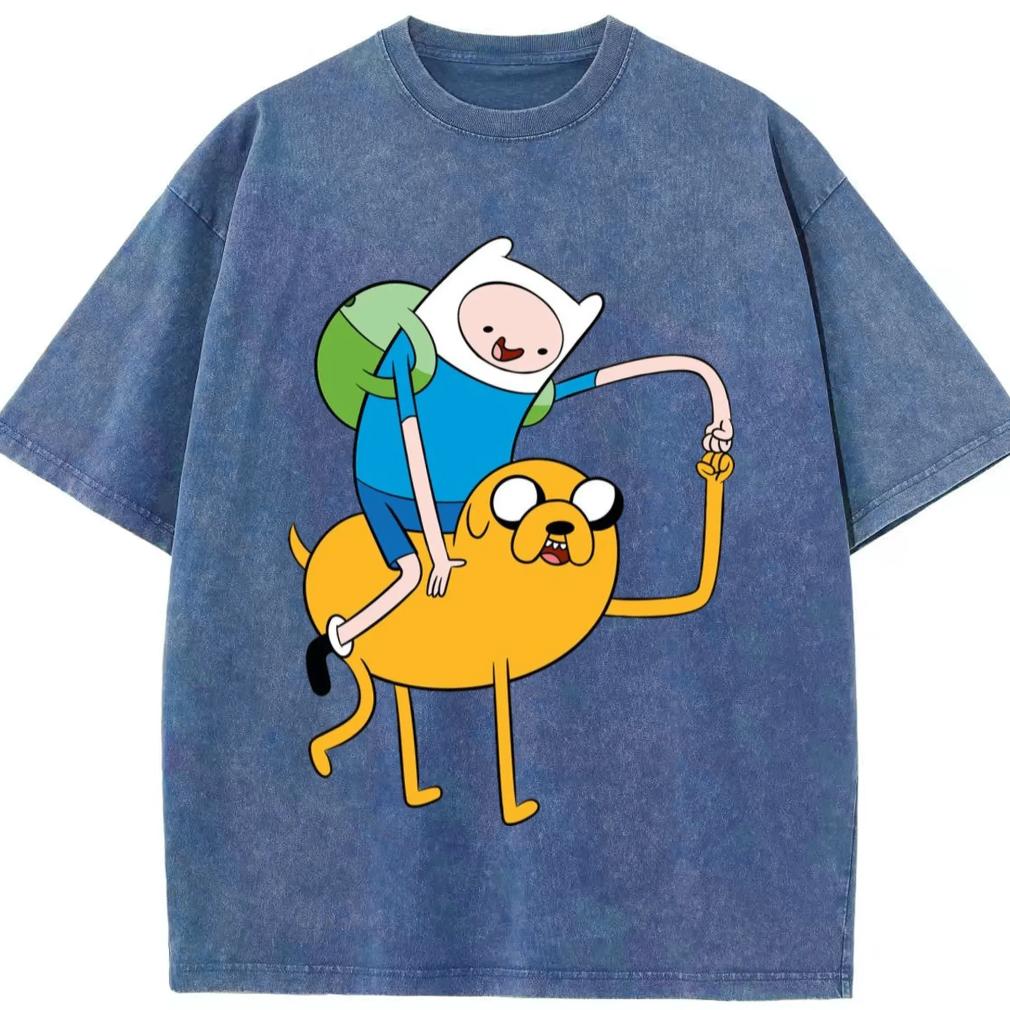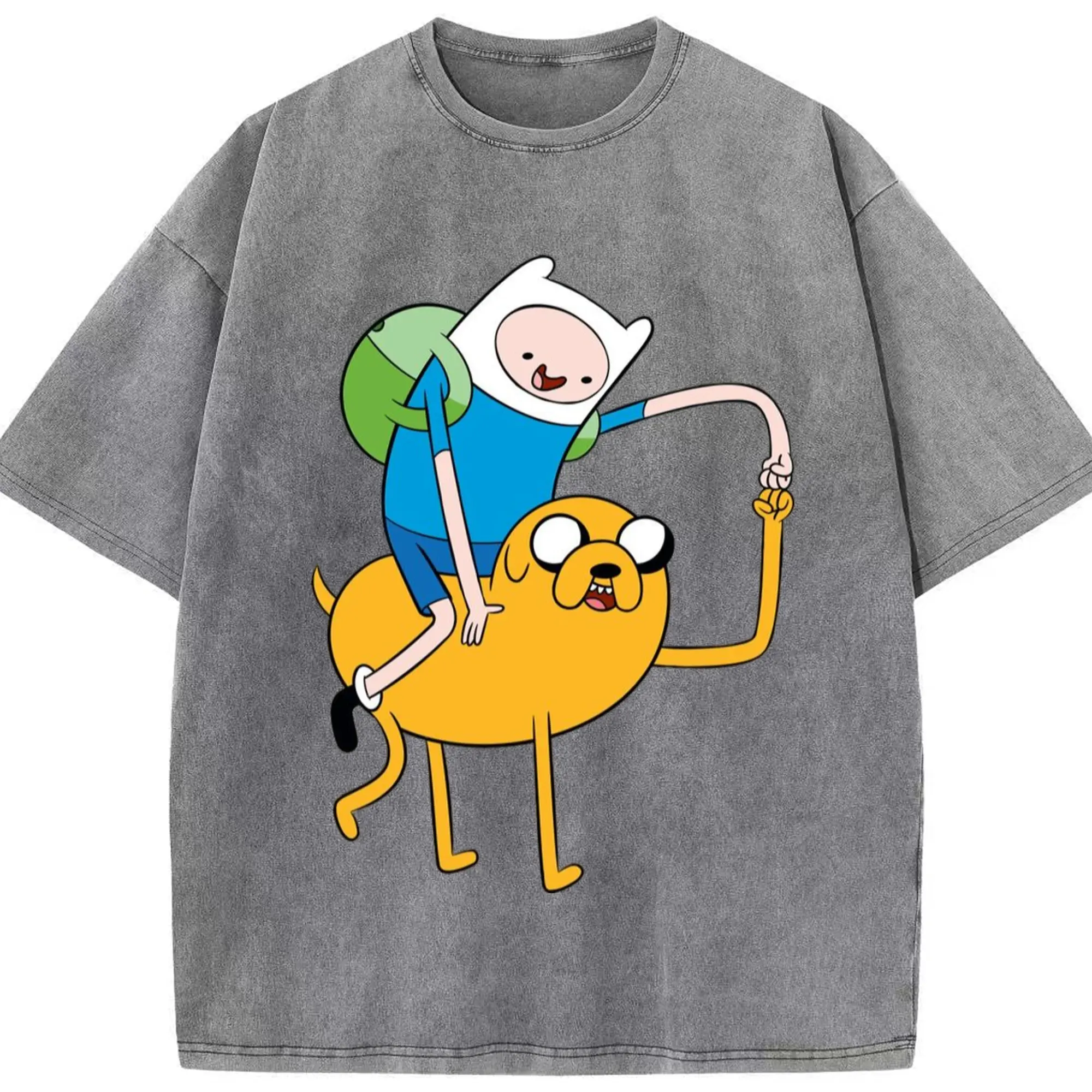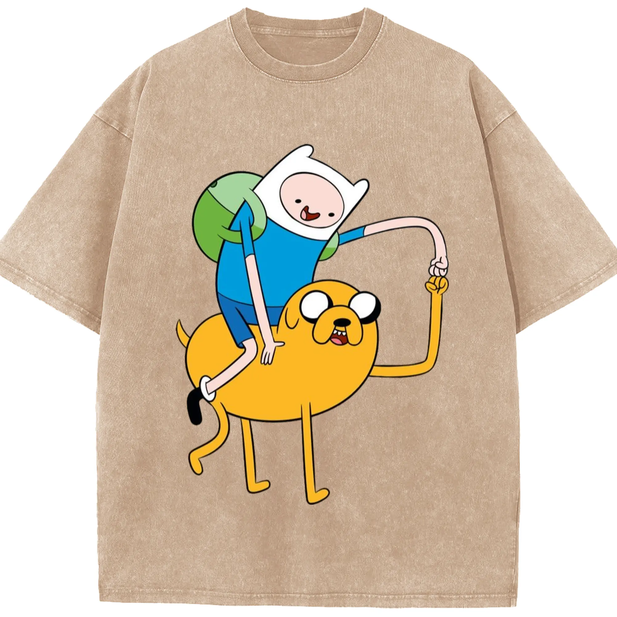Adventure Time Finn and Jake Tee - Washed Vintage Look 230g Cotton Oversized T-Shirt With Front Heat Transfer Print – Soft, Lightweight, Stylish Fit – Comfortable Casual Wear For Sports & Everyday Use