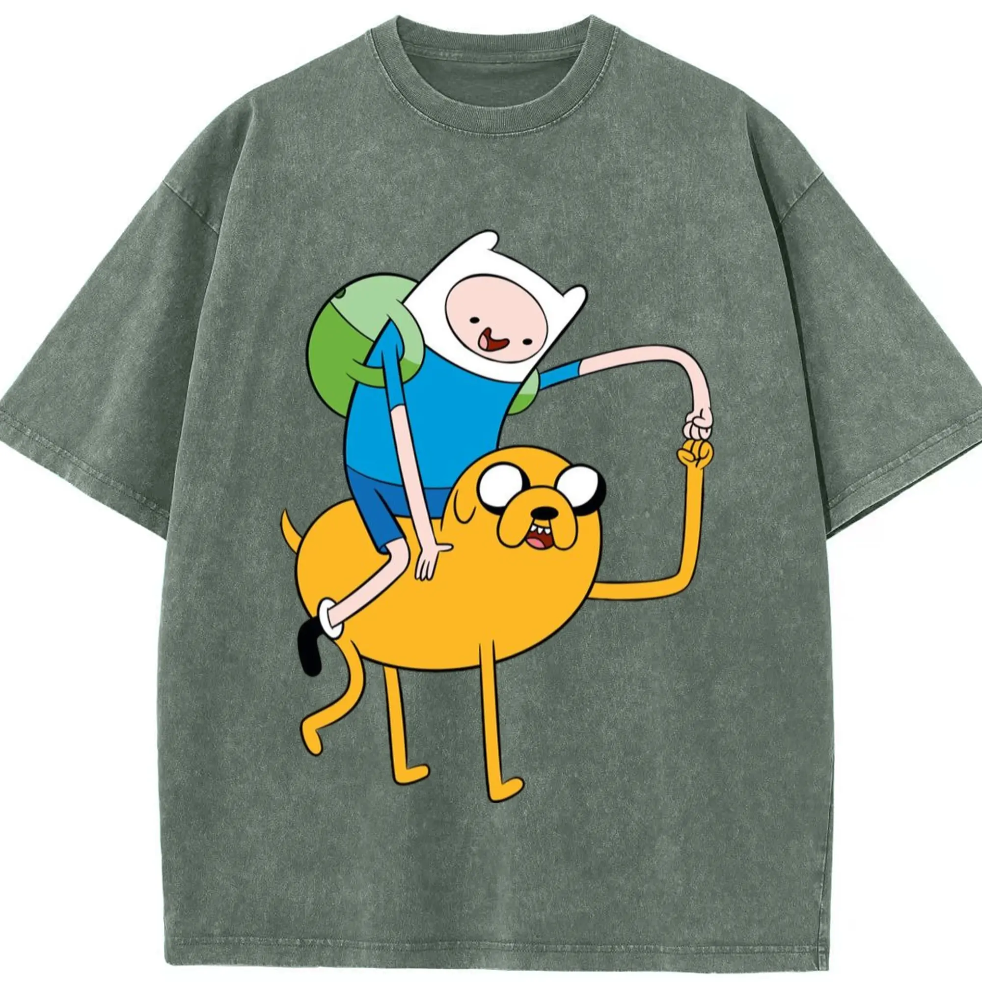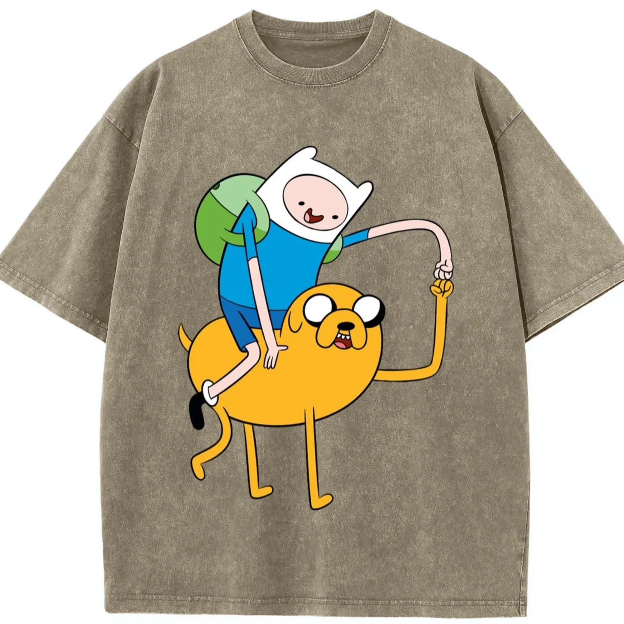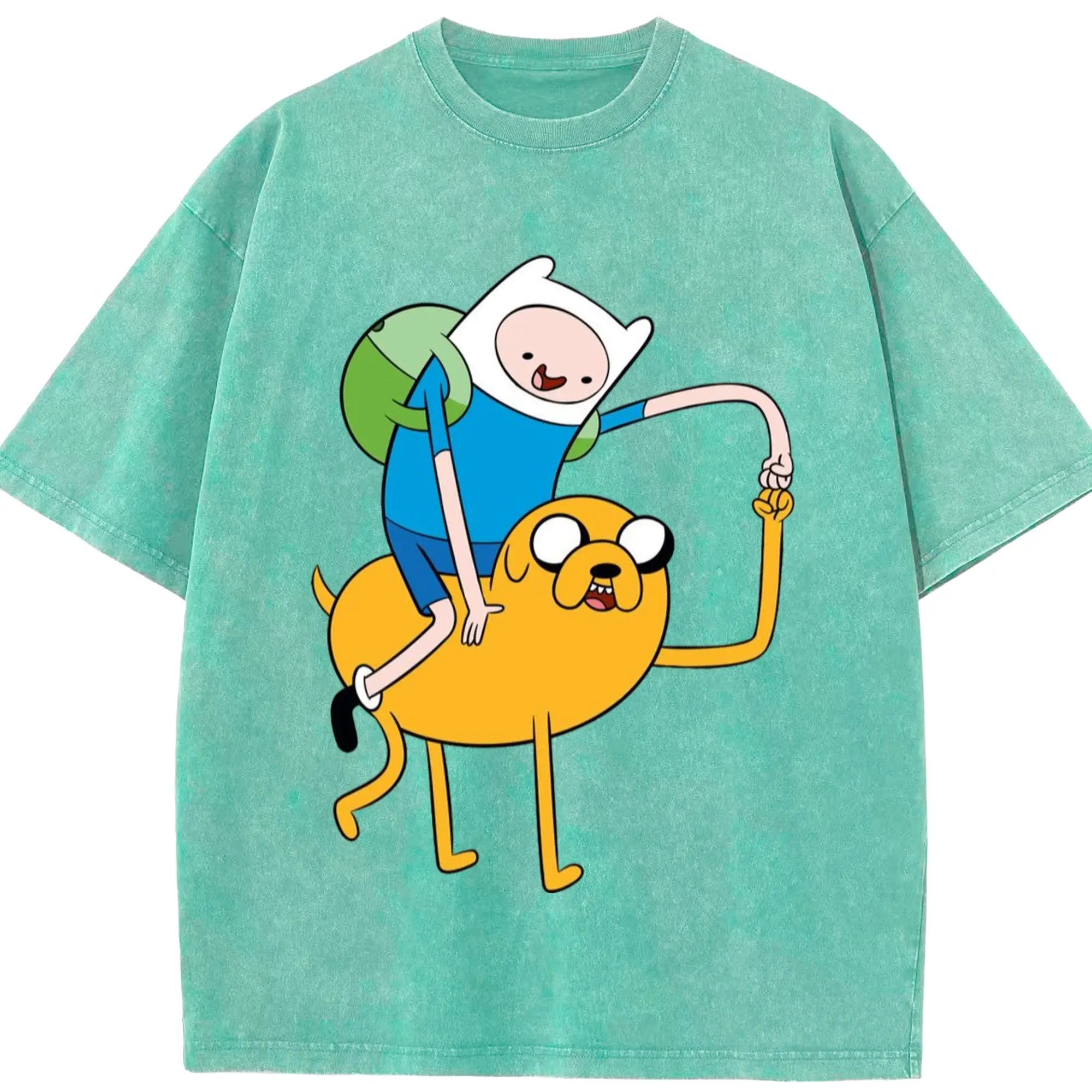 Adventure Time Finn and Jake Tee - Washed Vintage Look 230g Cotton Oversized T-Shirt With Front Heat Transfer Print – Soft, Lightweight, Stylish Fit – Comfortable Casual Wear For Sports & Everyday Use