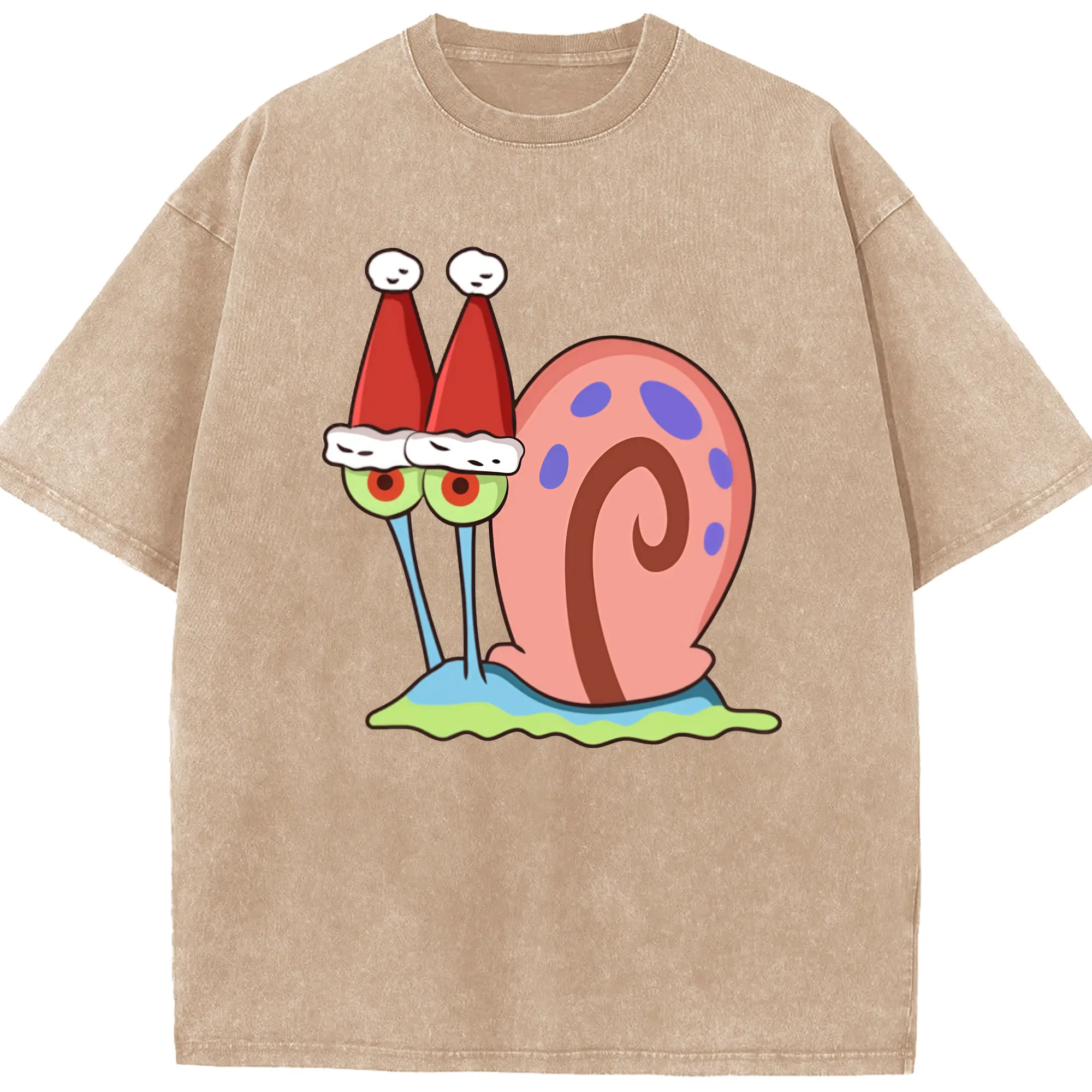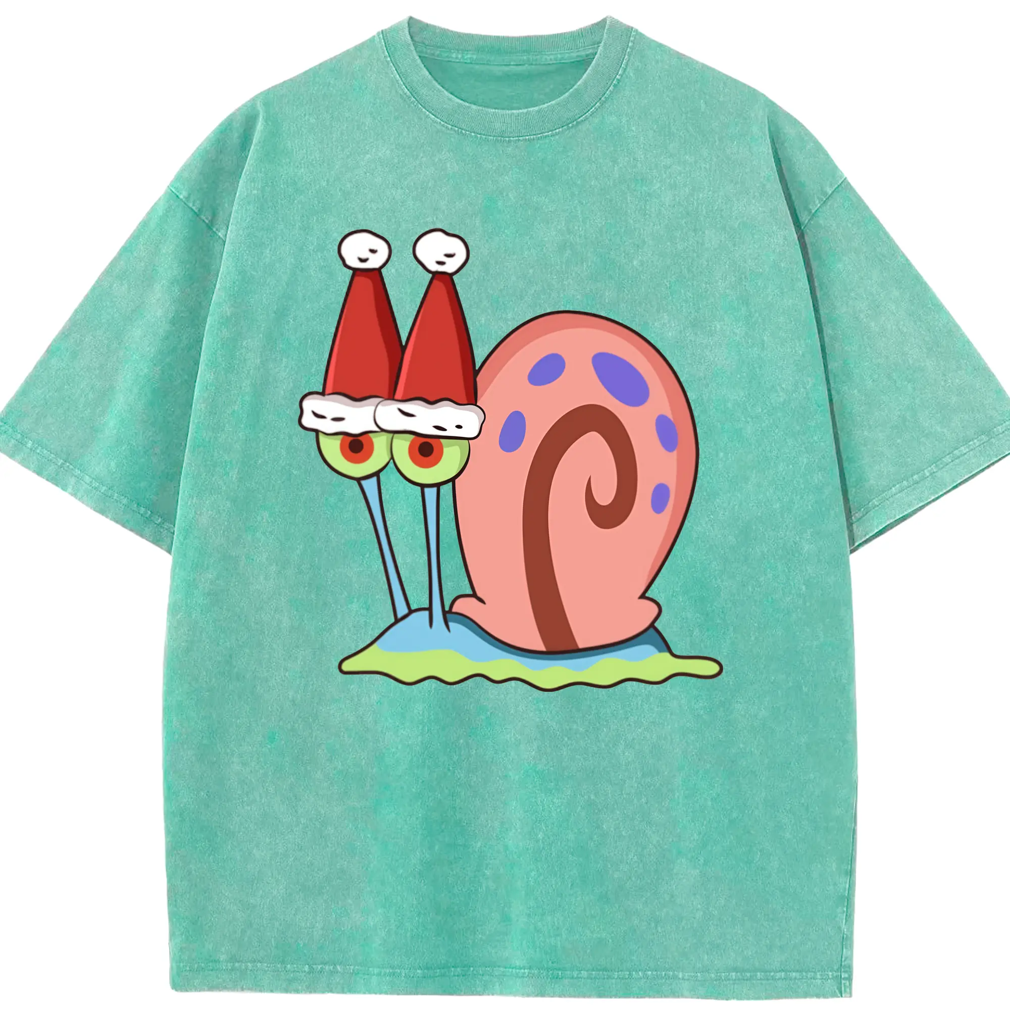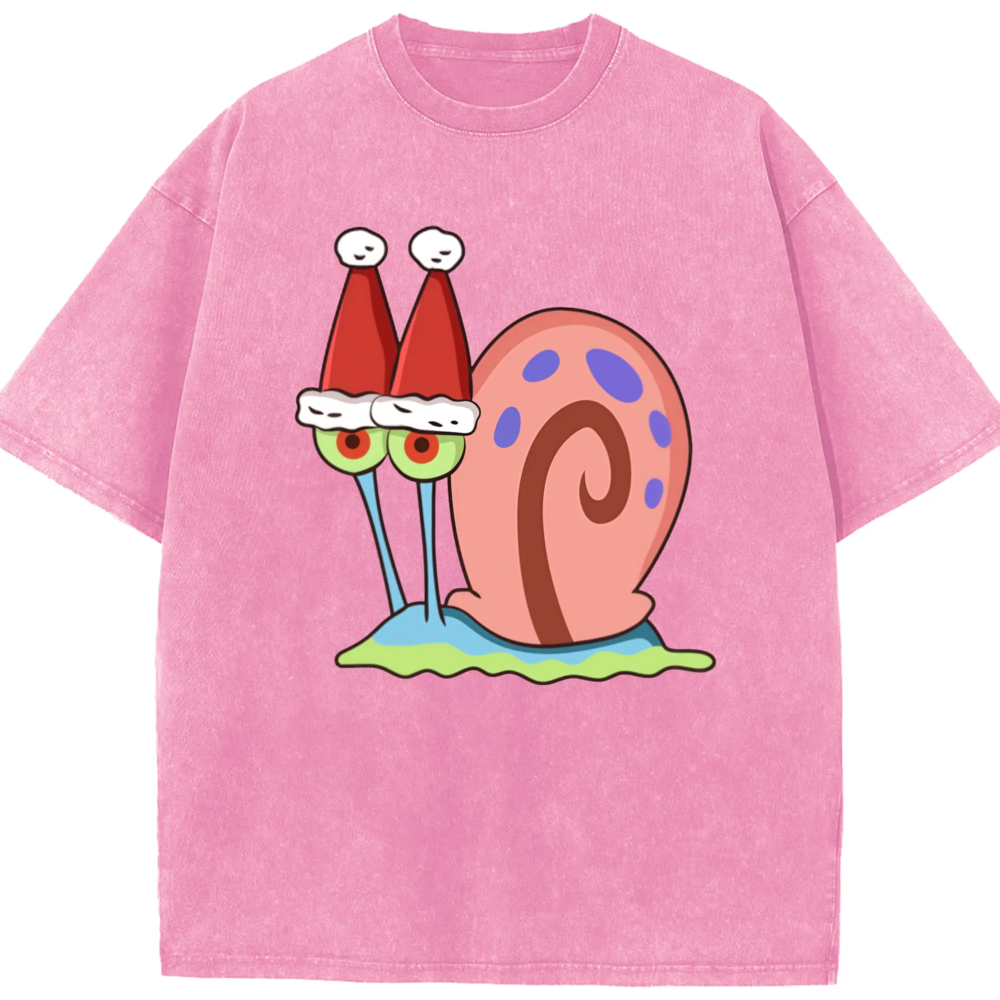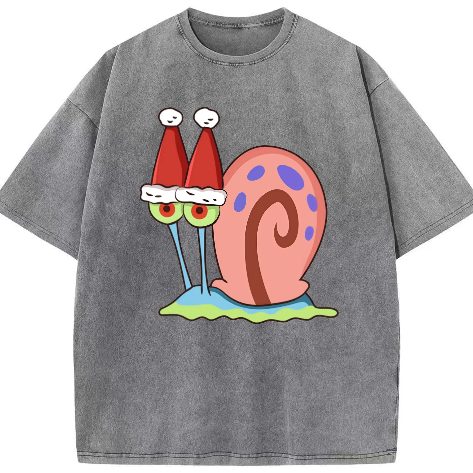 Gary The Snail Short Sleeve Christmas hat Graphic T-Shirt - Washed Vintage Look 230g Cotton Oversized T-Shirt With Front Heat Transfer Print – Soft, Lightweight, Stylish Fit – Comfortable Casual Wear For Sports & Everyday Use
