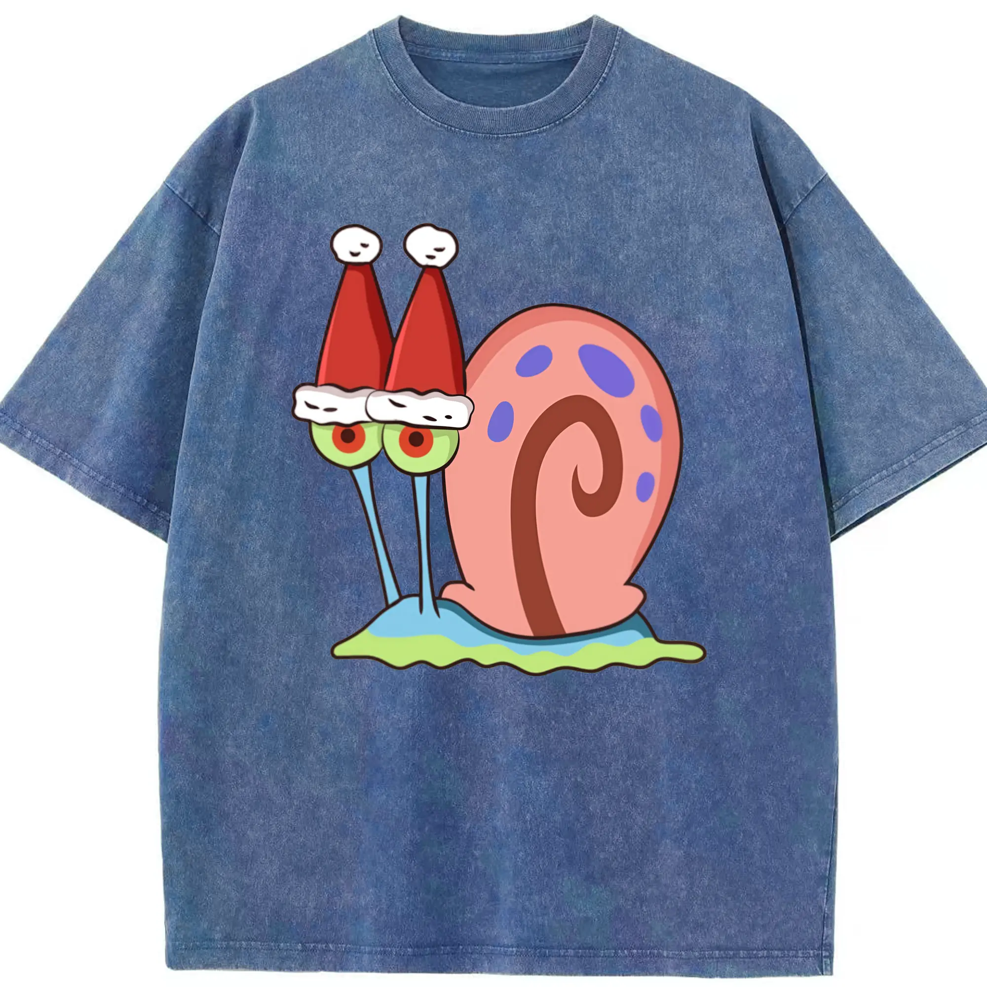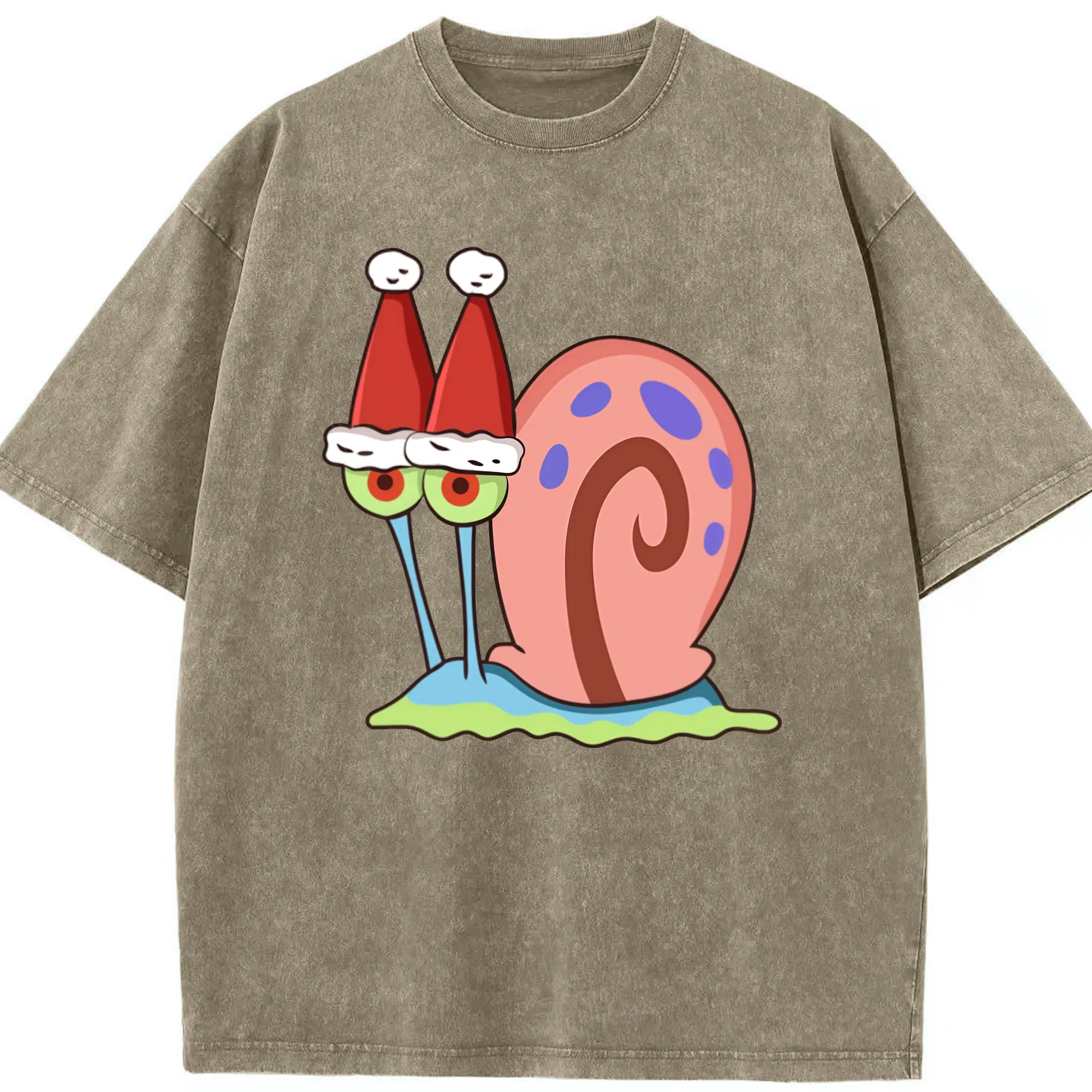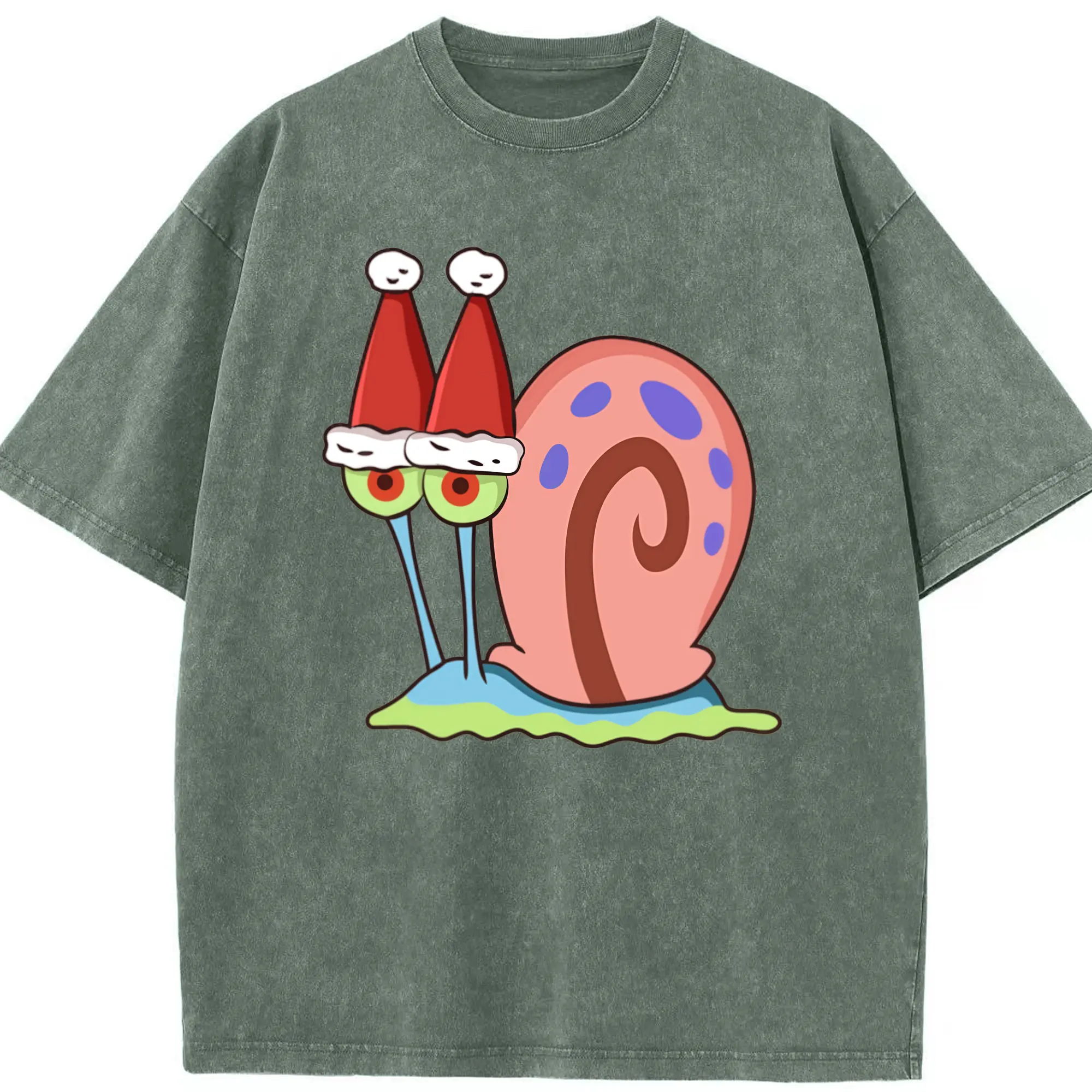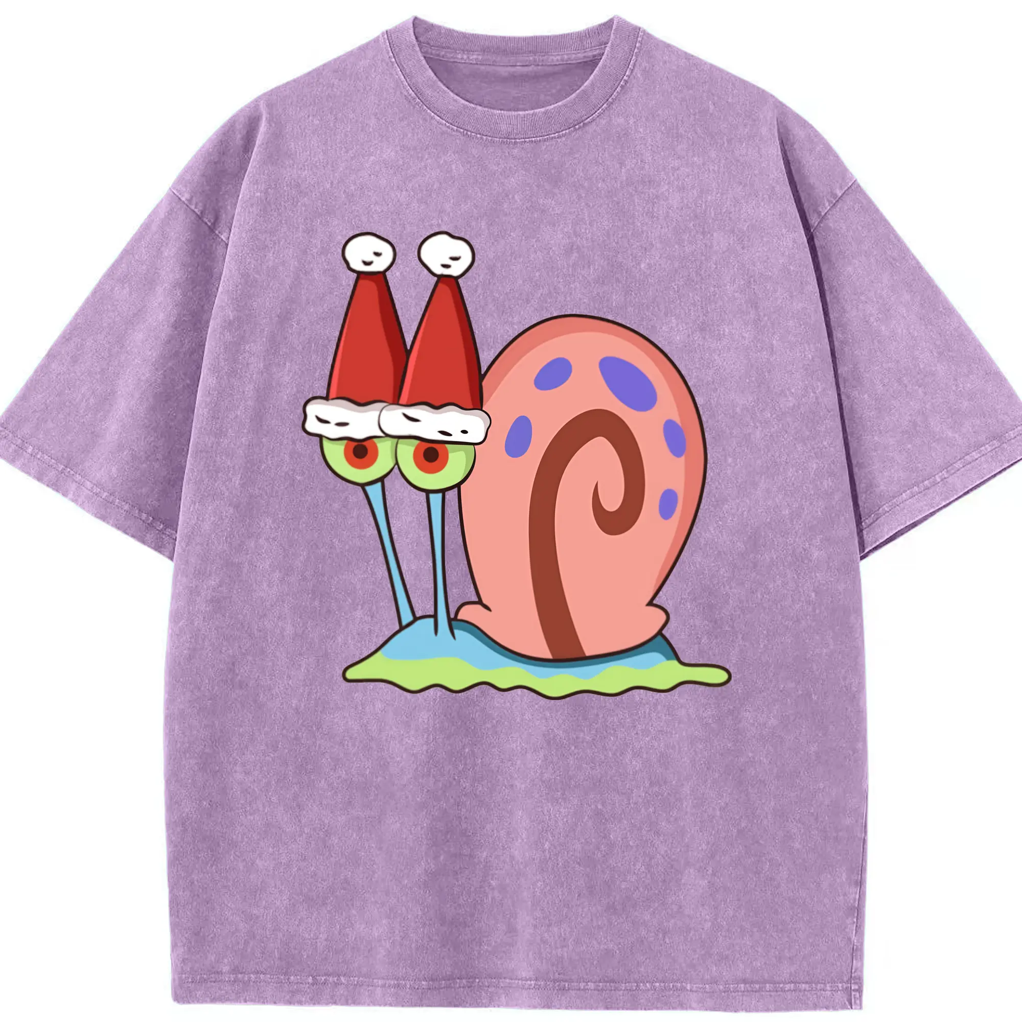 Gary The Snail Short Sleeve Christmas hat Graphic T-Shirt - Washed Vintage Look 230g Cotton Oversized T-Shirt With Front Heat Transfer Print – Soft, Lightweight, Stylish Fit – Comfortable Casual Wear For Sports & Everyday Use