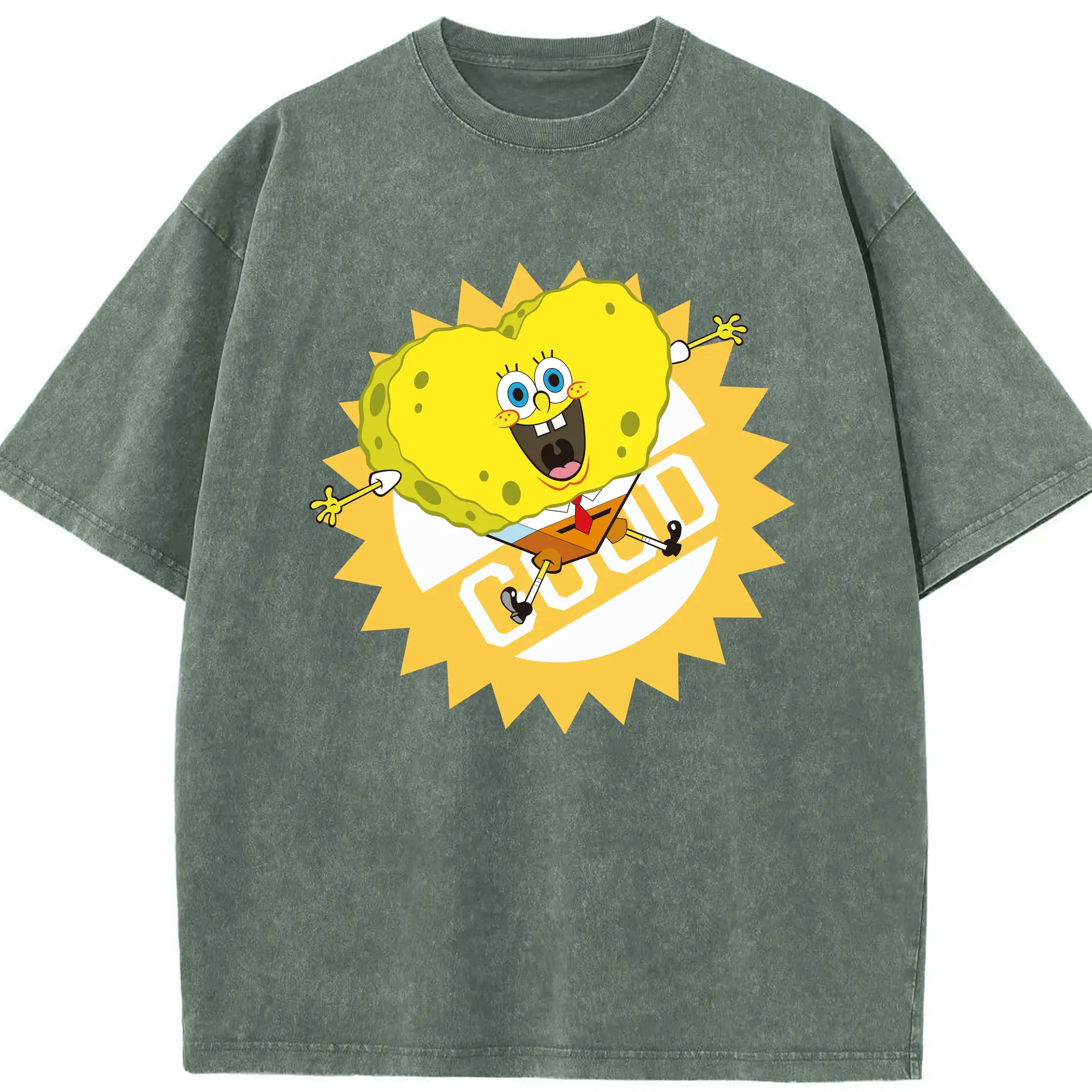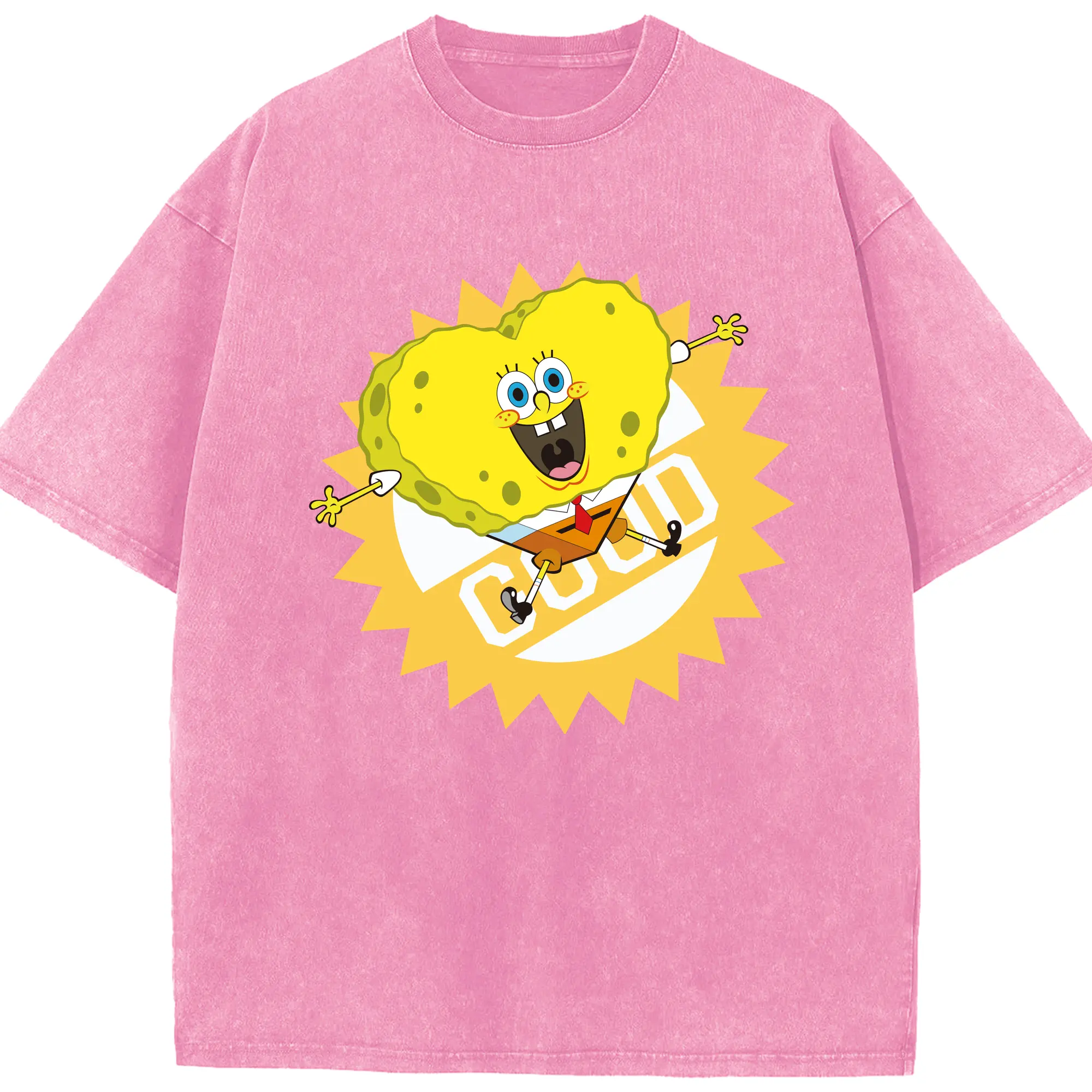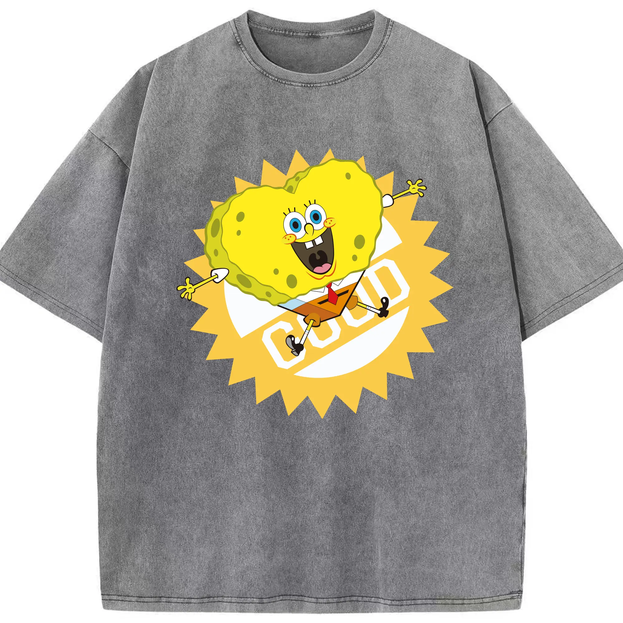 Heart-shaped spongebob squarepants t shirt - Washed Vintage Look 230g Cotton Oversized T-Shirt With Front Heat Transfer Print – Soft, Lightweight, Stylish Fit – Comfortable Casual Wear For Sports & Everyday Use