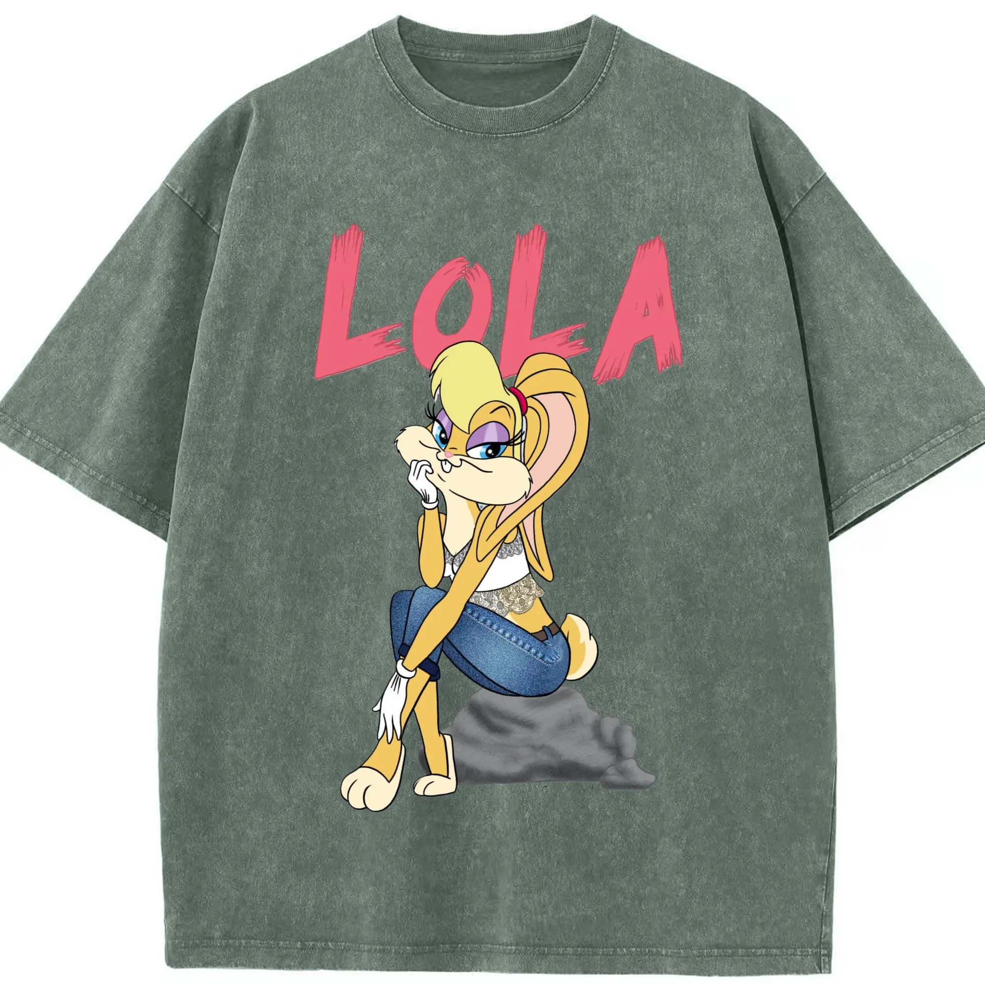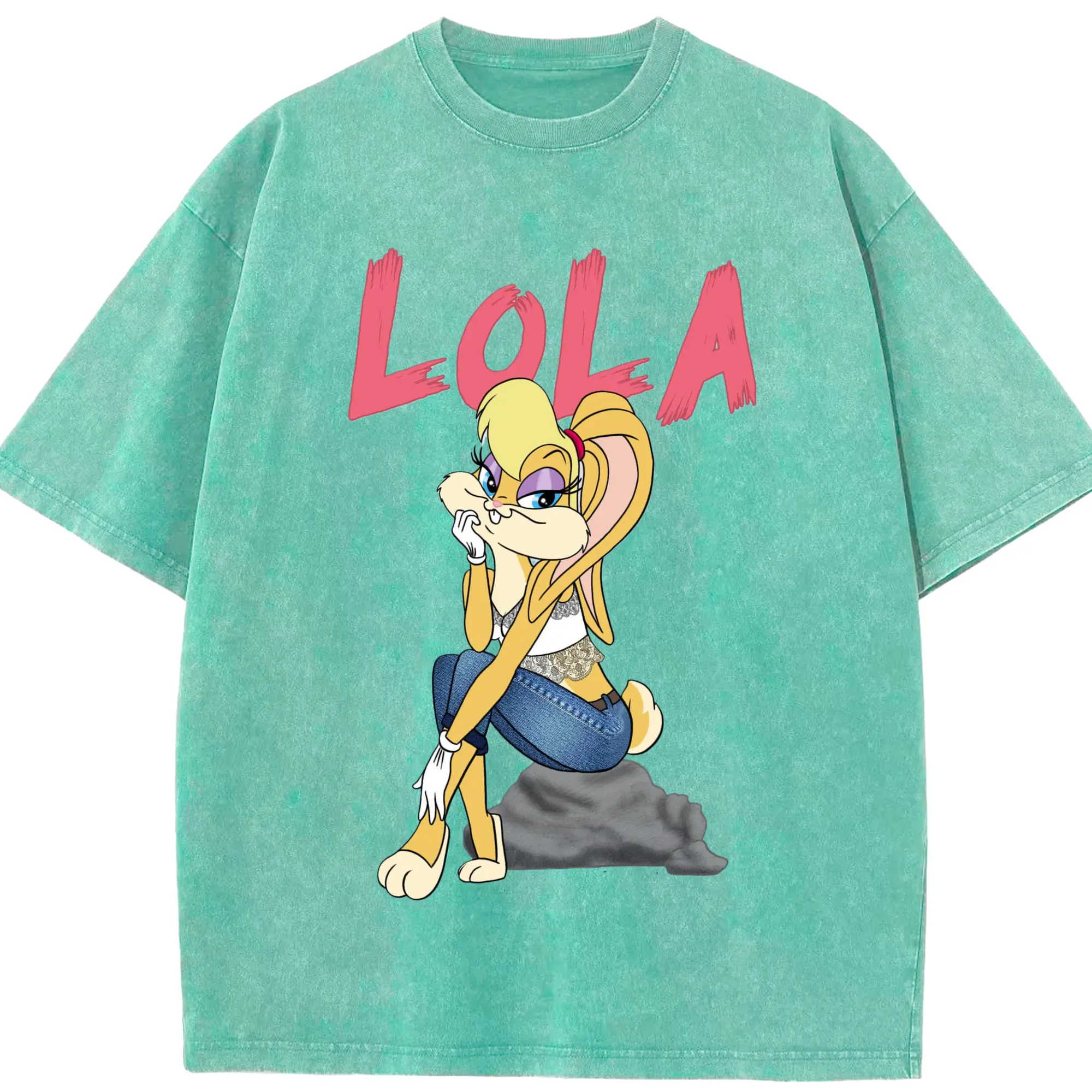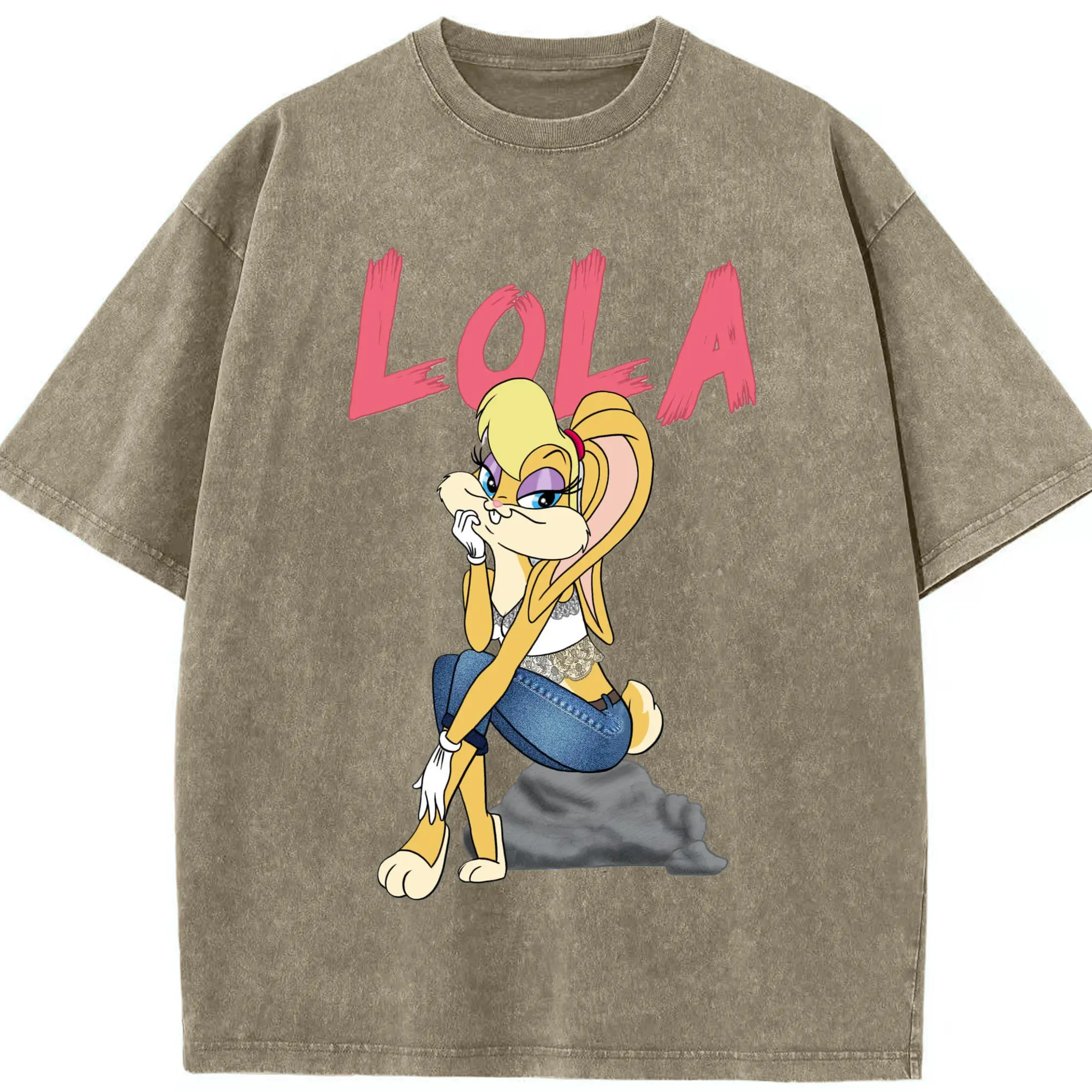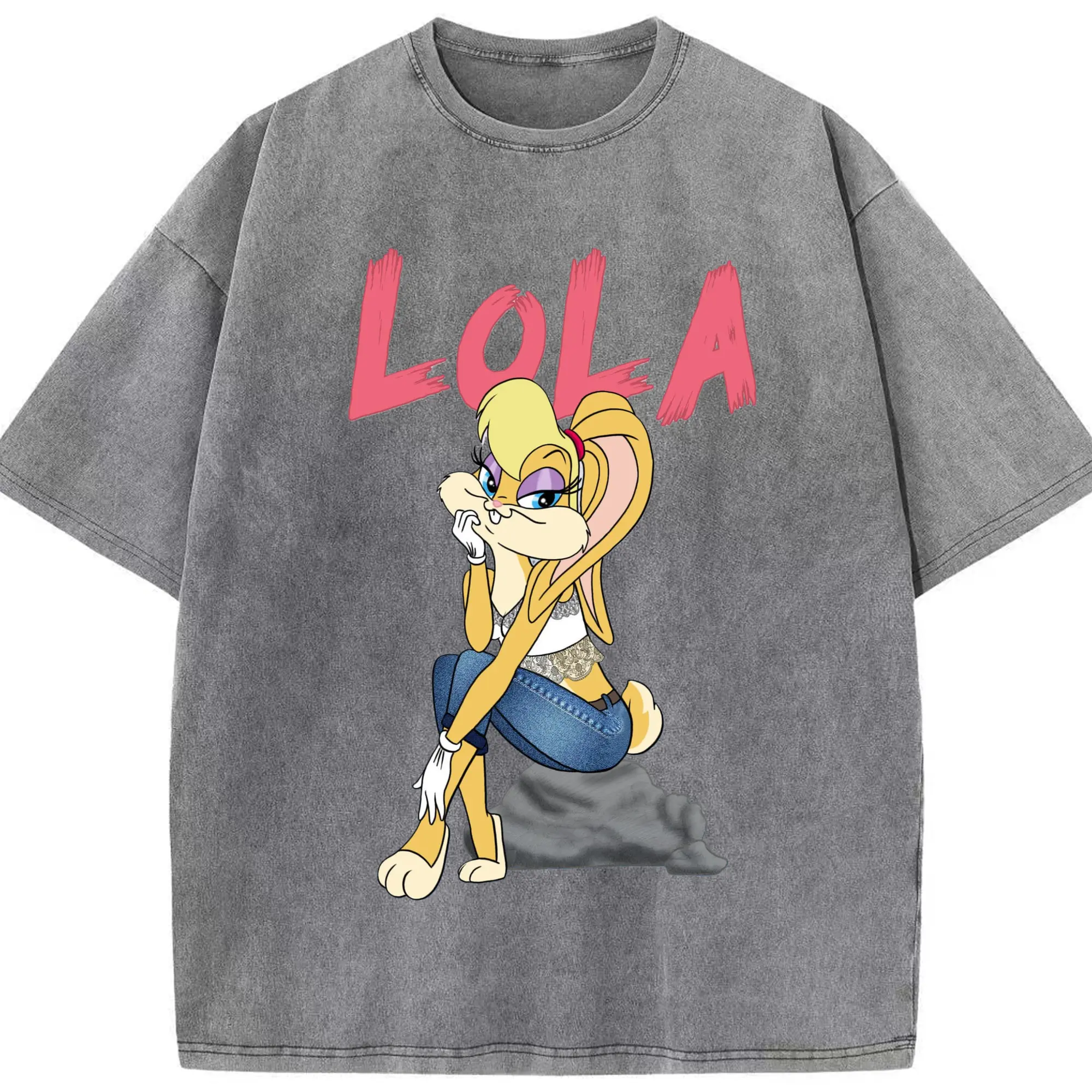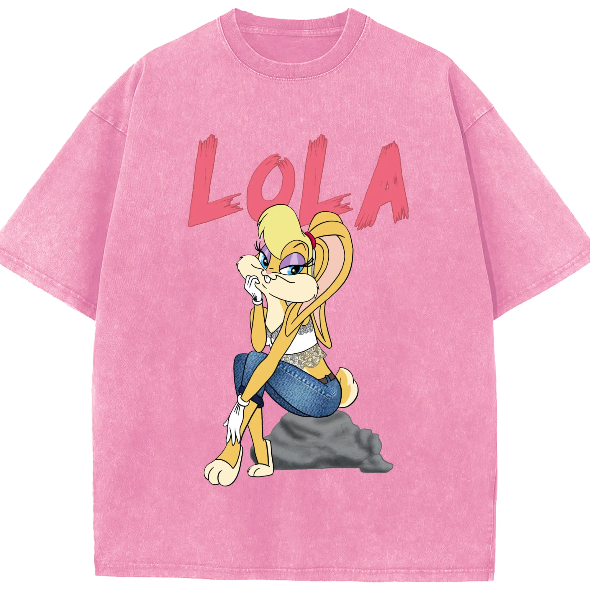 Lola bunny graphic t-shirt​ - Washed Vintage Look 230g Cotton Oversized T-Shirt With Front Heat Transfer Print – Soft, Lightweight, Stylish Fit – Comfortable Casual Wear For Sports & Everyday Use