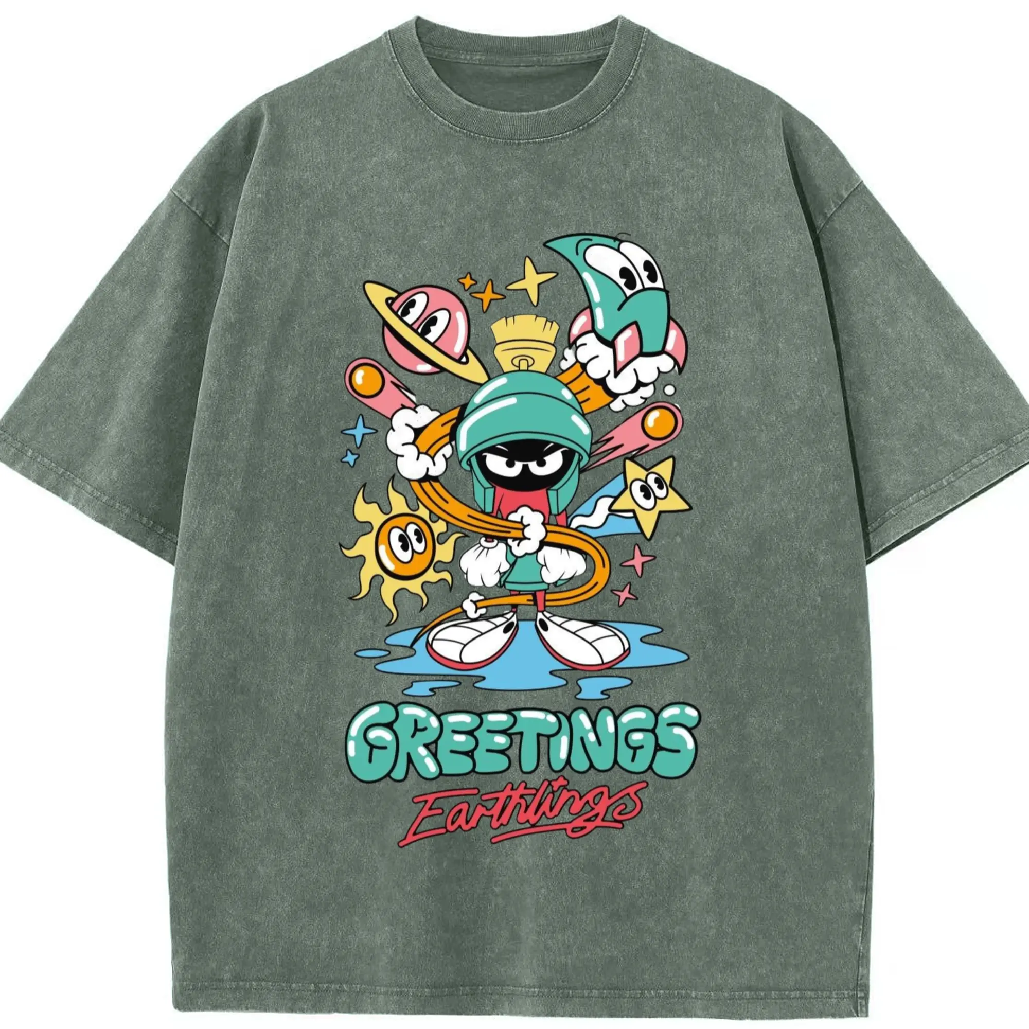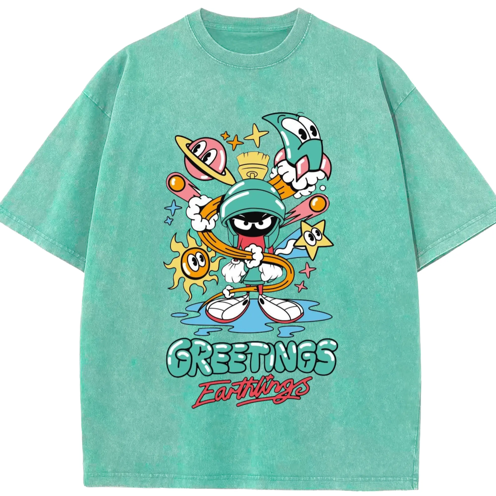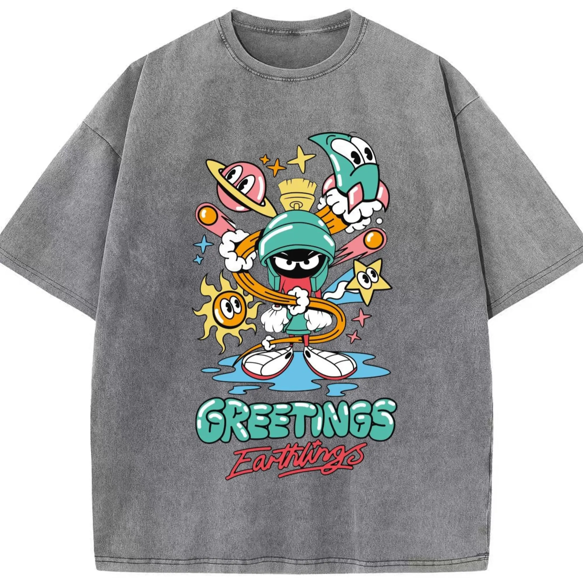 Marvin the martian cartoon t shirt - Washed Vintage Look 230g Cotton Oversized T-Shirt With Front Heat Transfer Print – Soft, Lightweight, Stylish Fit – Comfortable Casual Wear For Sports & Everyday Use