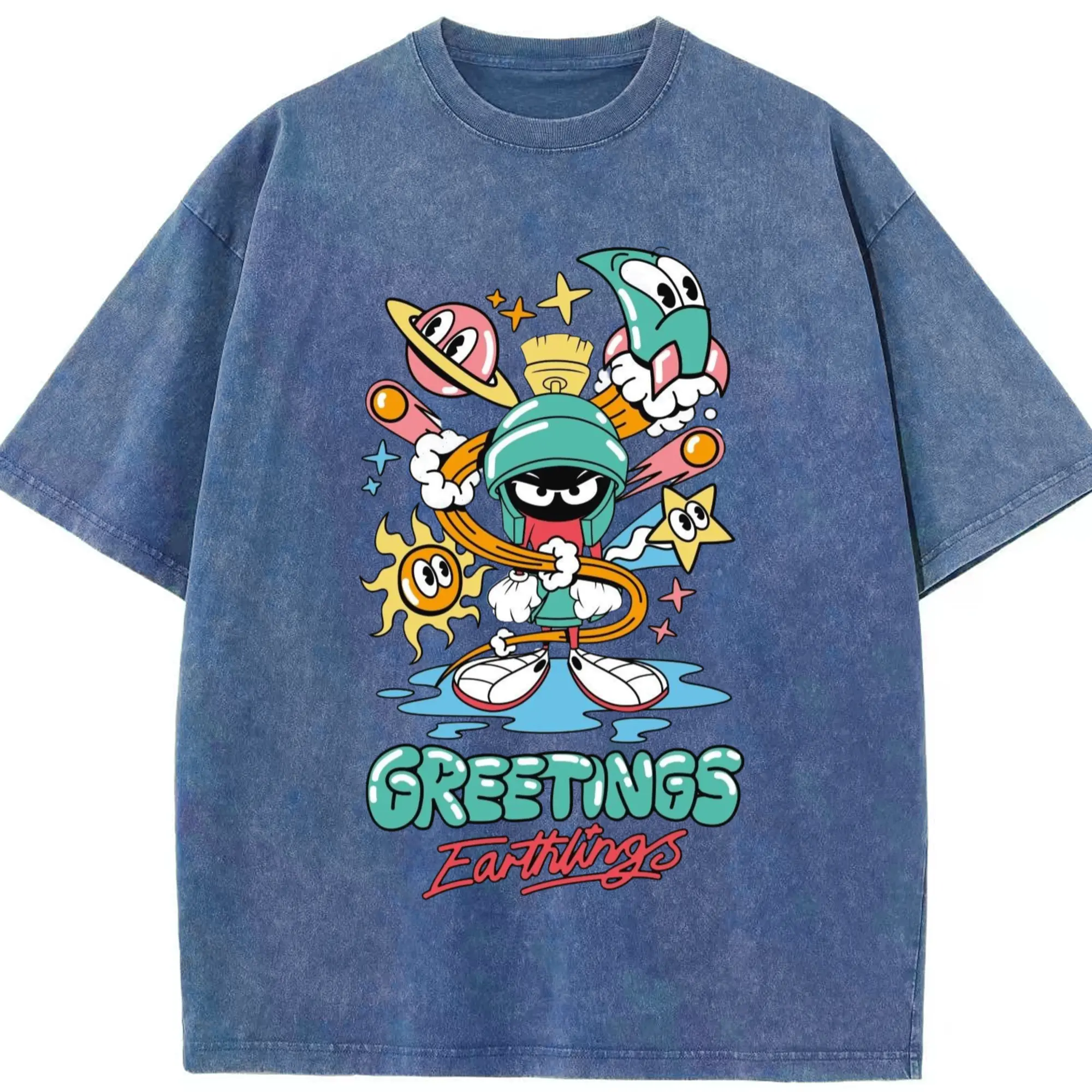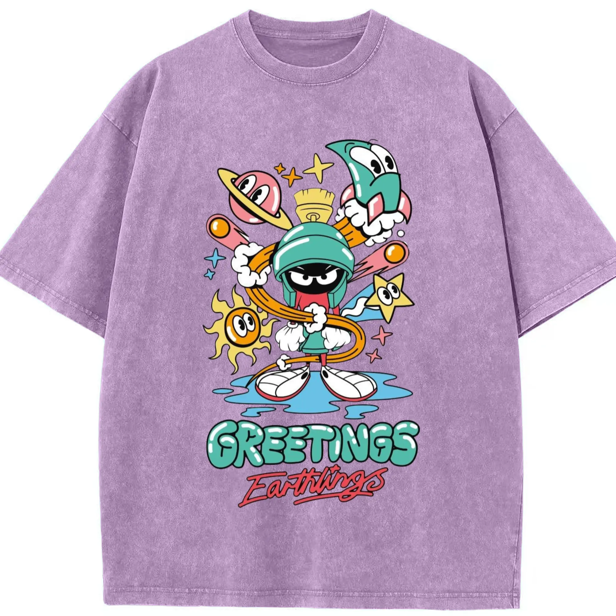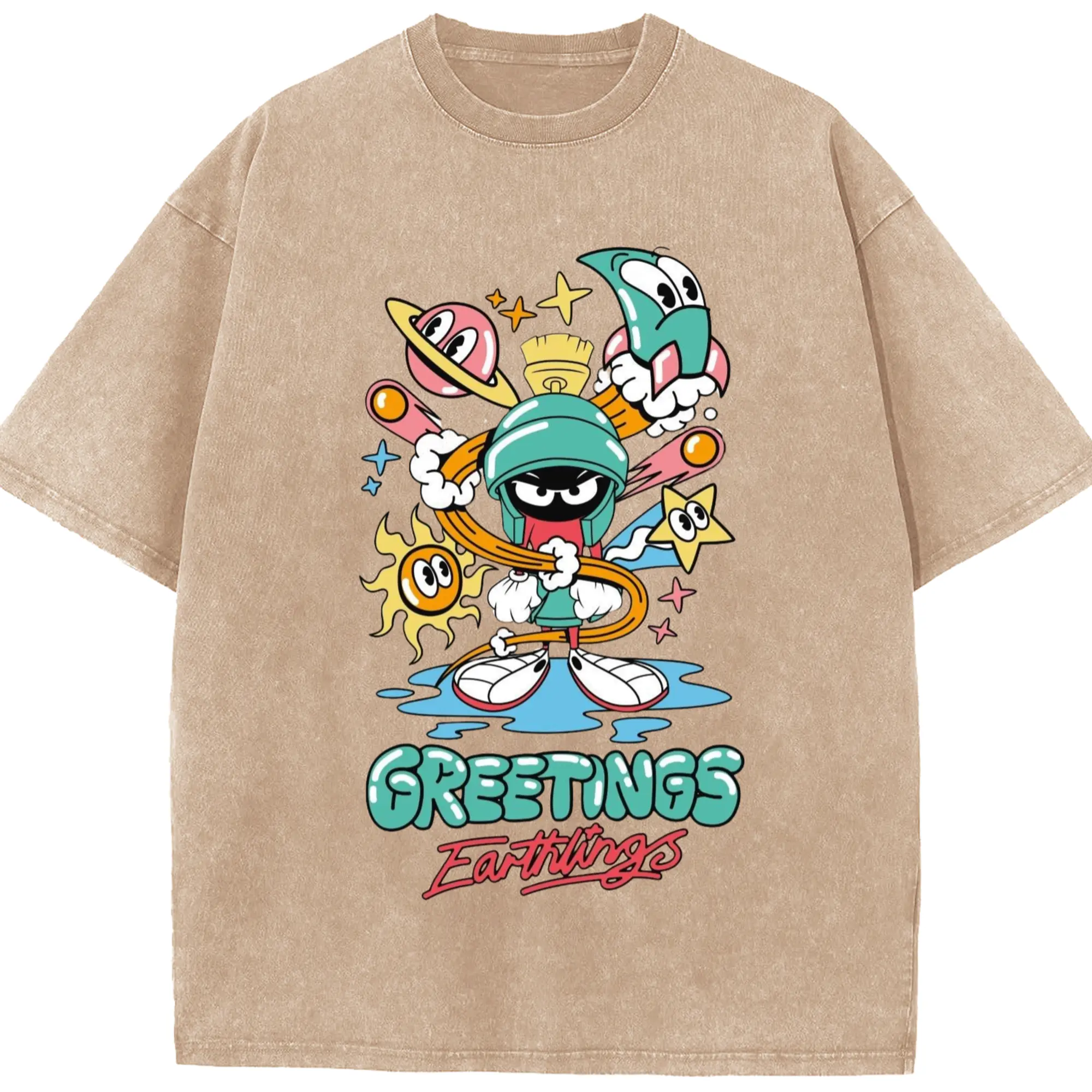 Marvin the martian cartoon t shirt - Washed Vintage Look 230g Cotton Oversized T-Shirt With Front Heat Transfer Print – Soft, Lightweight, Stylish Fit – Comfortable Casual Wear For Sports & Everyday Use