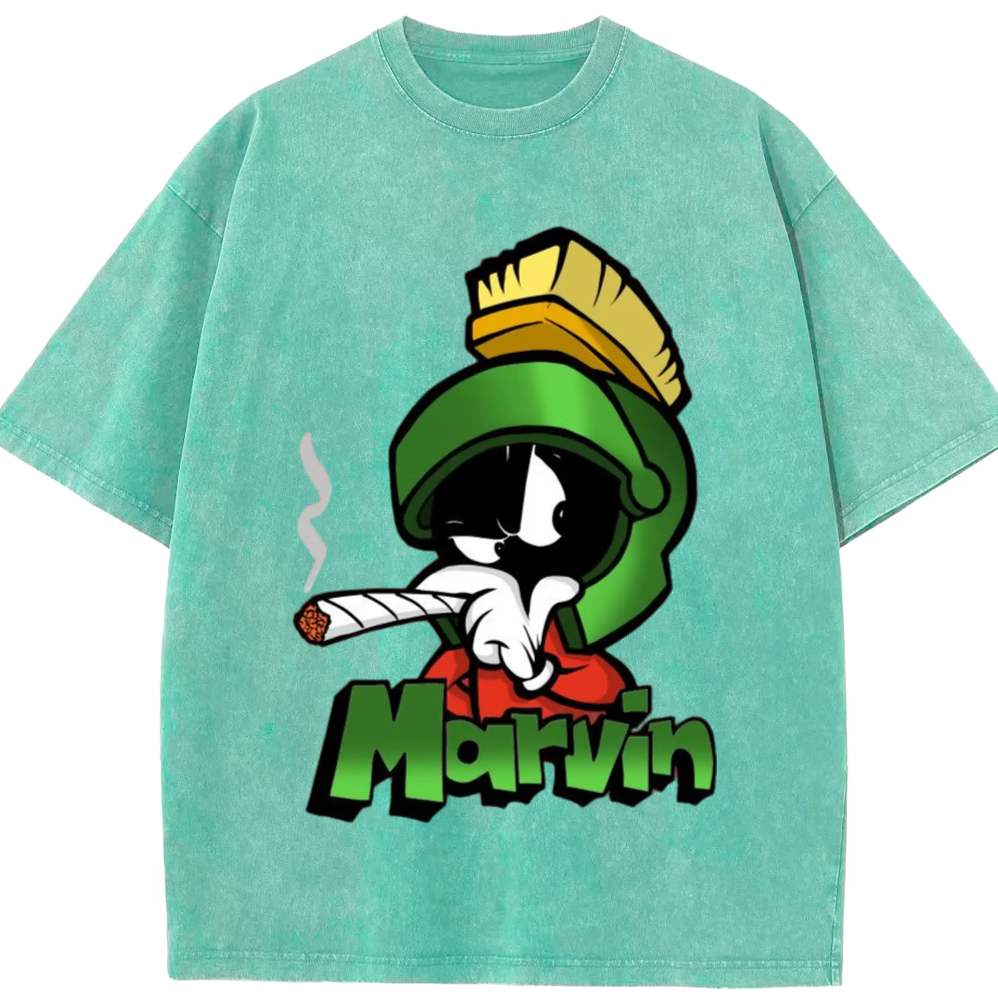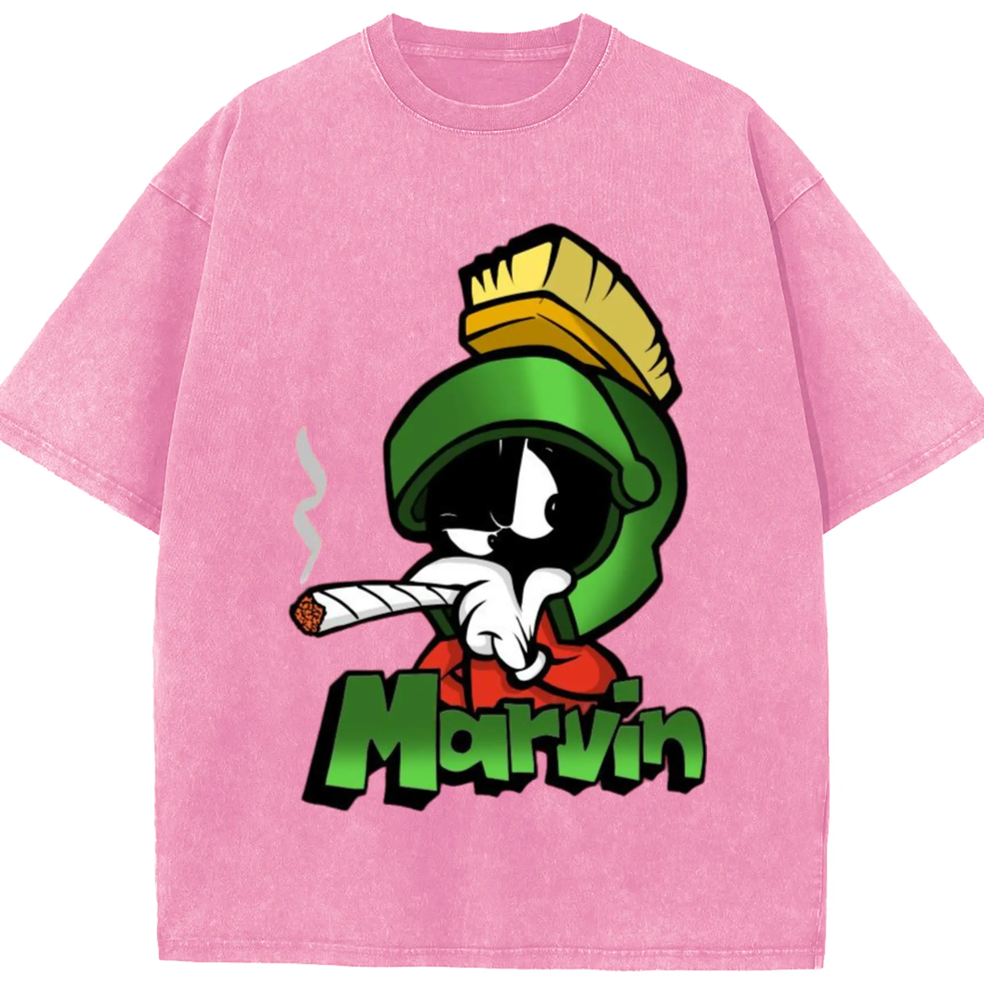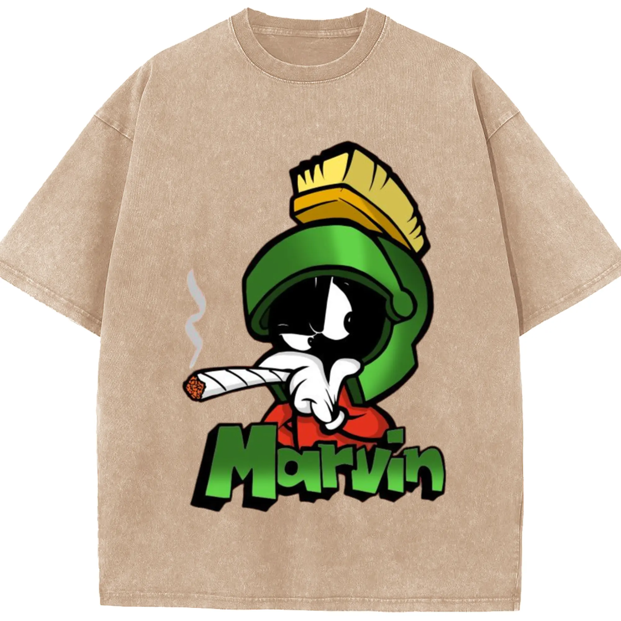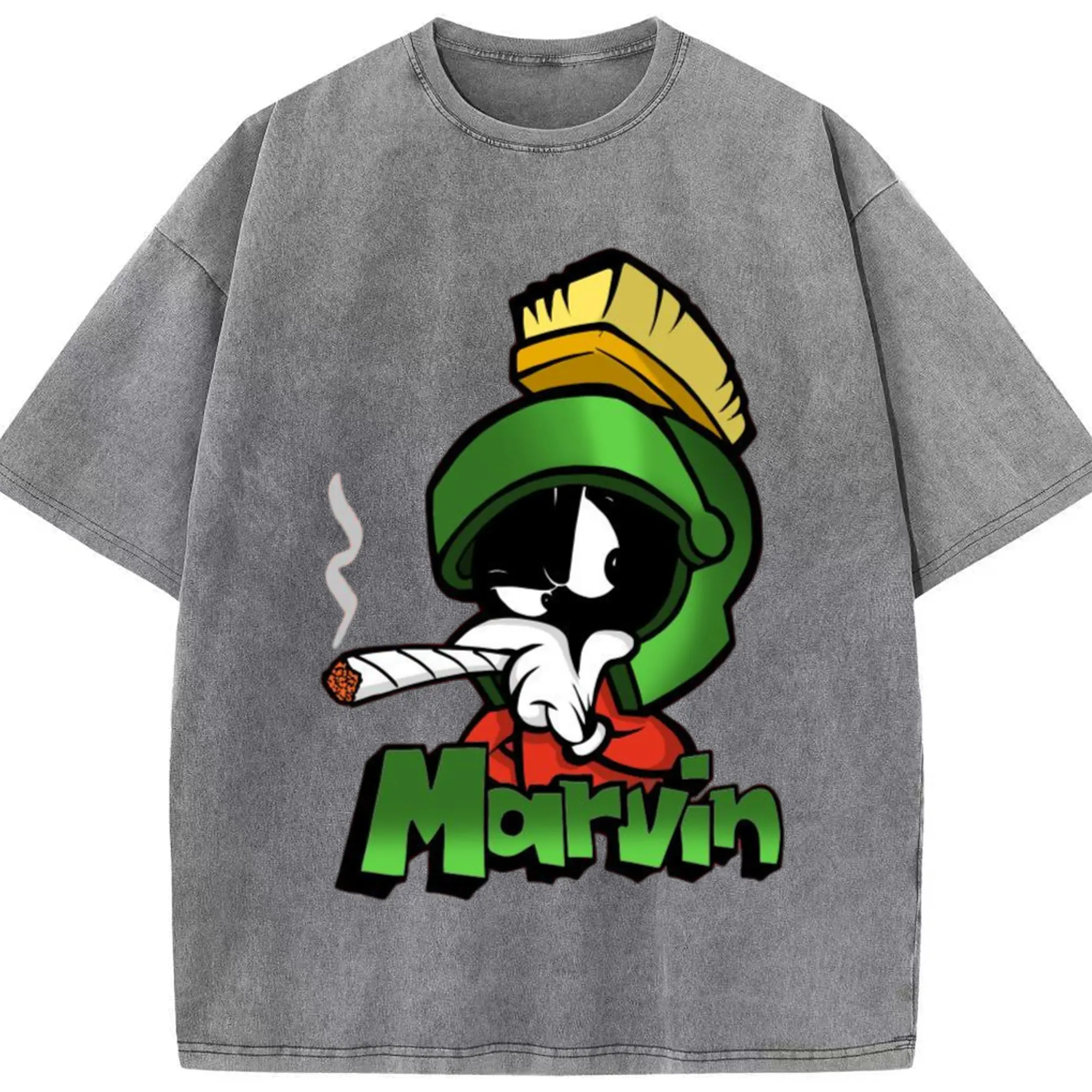 Marvin the martian face t shirt - Washed Vintage Look 230g Cotton Oversized T-Shirt With Front Heat Transfer Print – Soft, Lightweight, Stylish Fit – Comfortable Casual Wear For Sports & Everyday Use