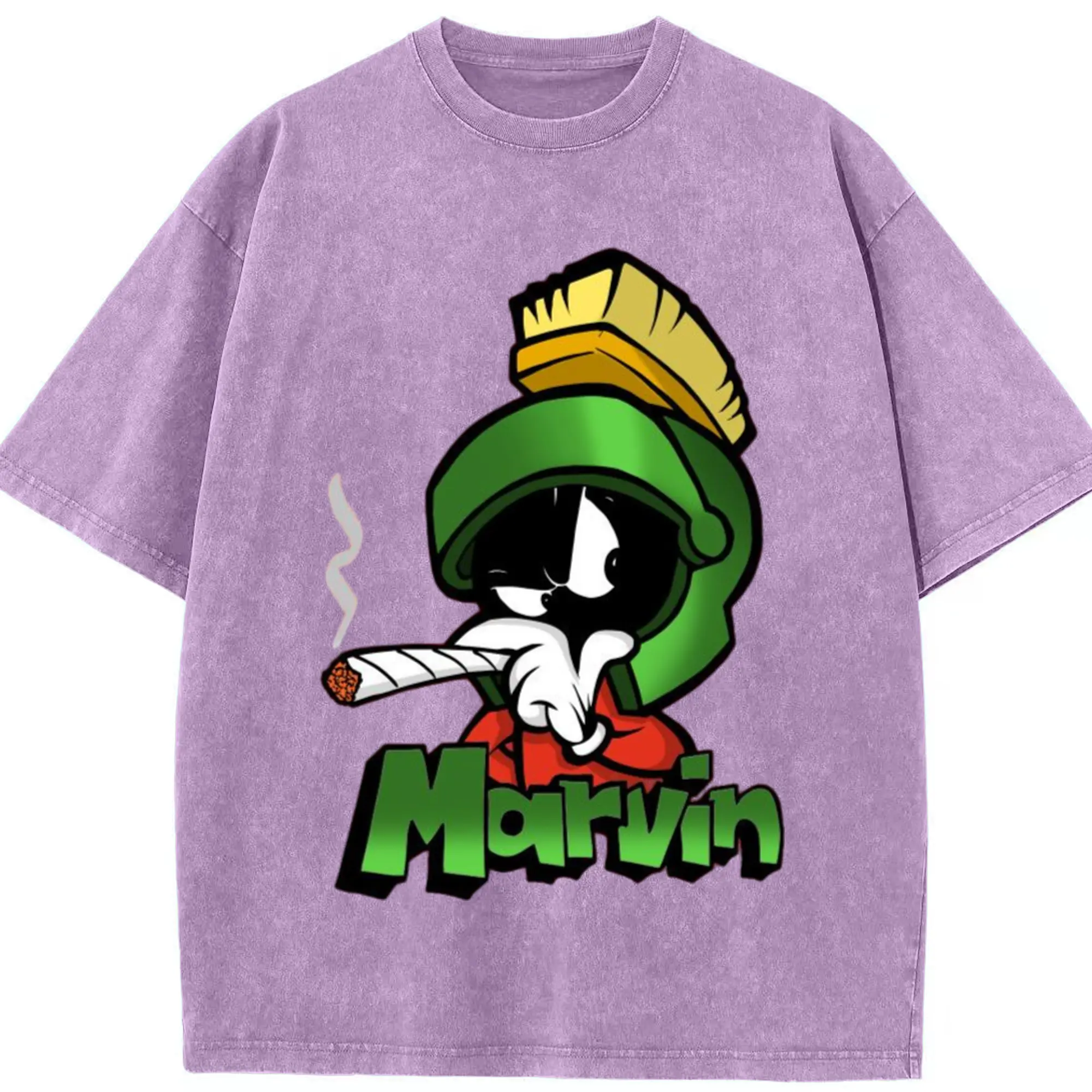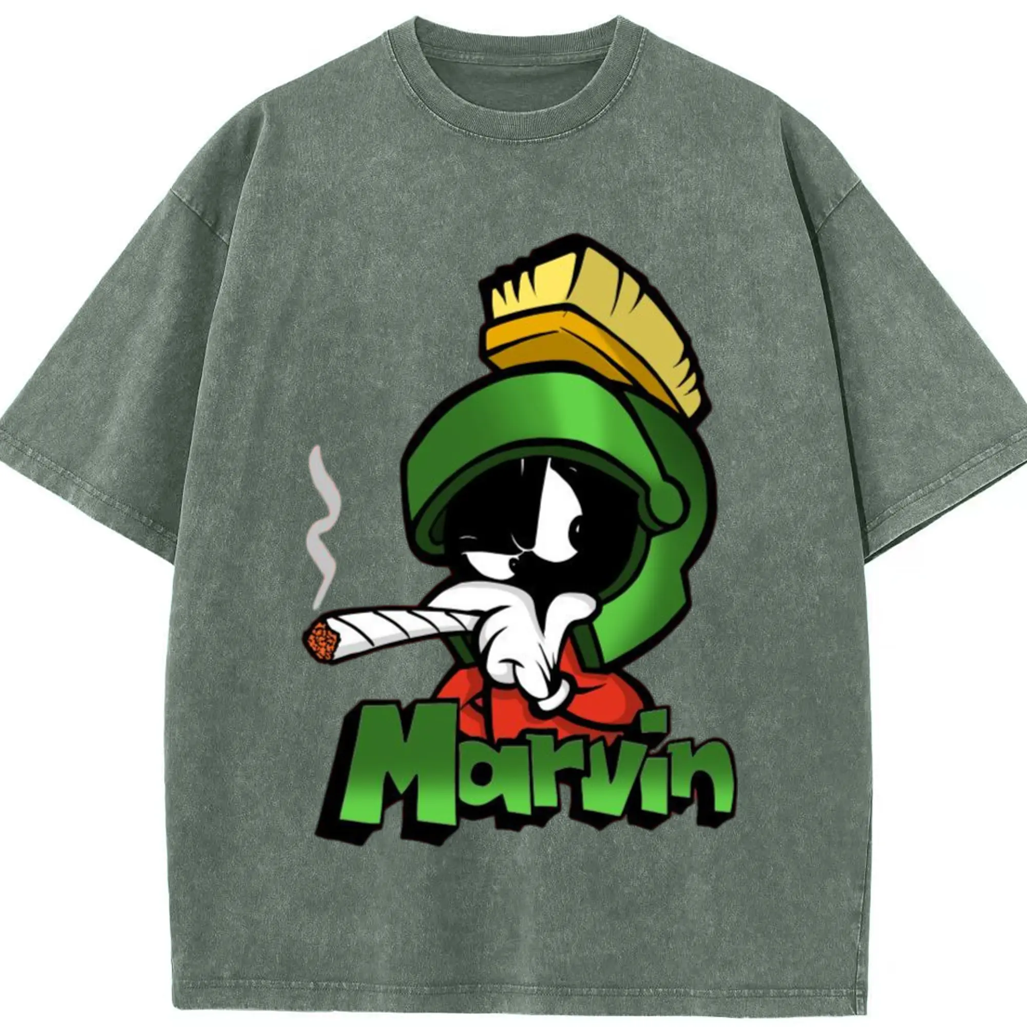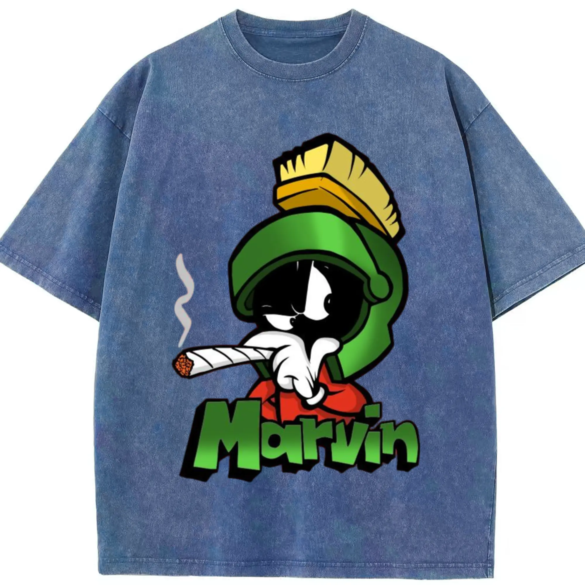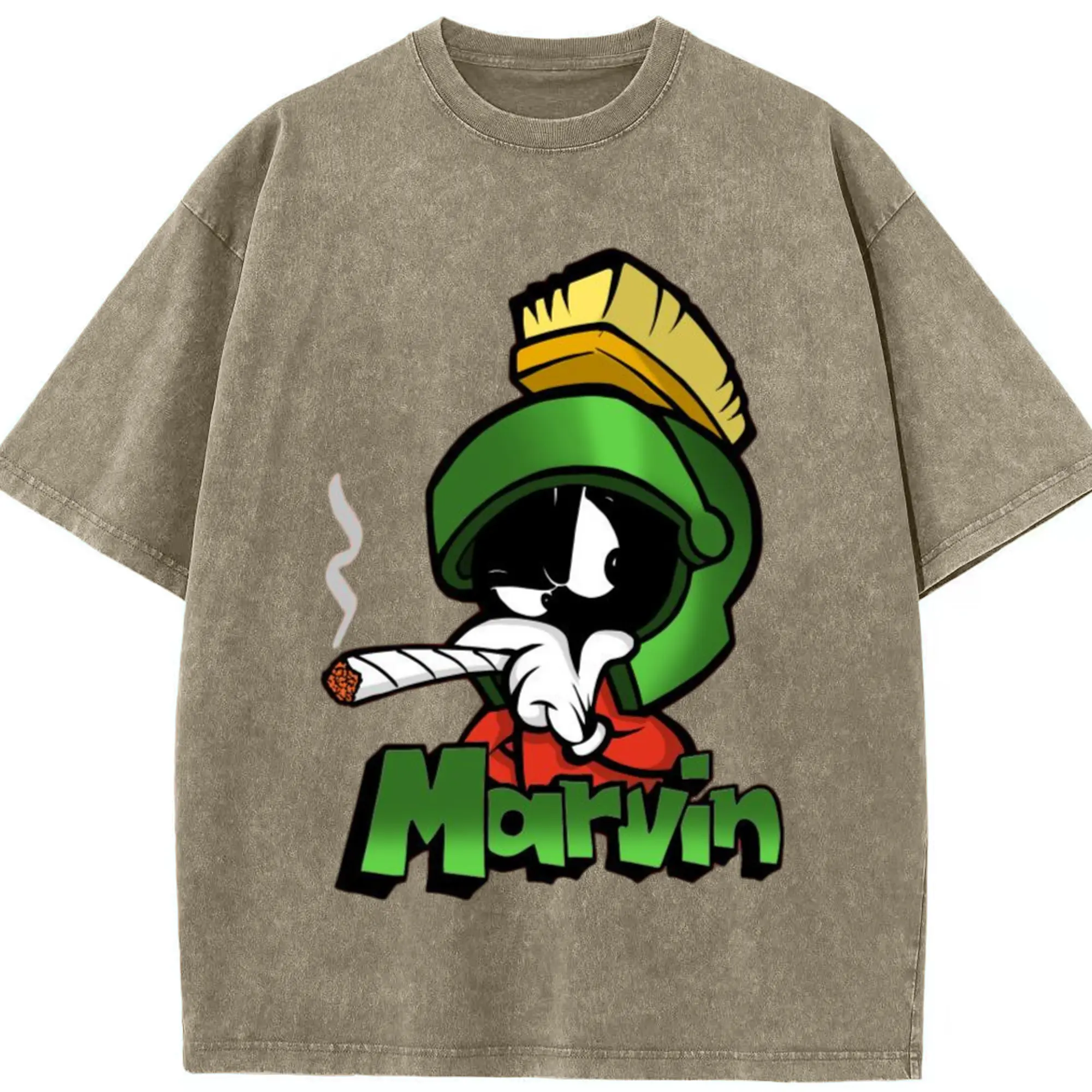 Marvin the martian face t shirt - Washed Vintage Look 230g Cotton Oversized T-Shirt With Front Heat Transfer Print – Soft, Lightweight, Stylish Fit – Comfortable Casual Wear For Sports & Everyday Use