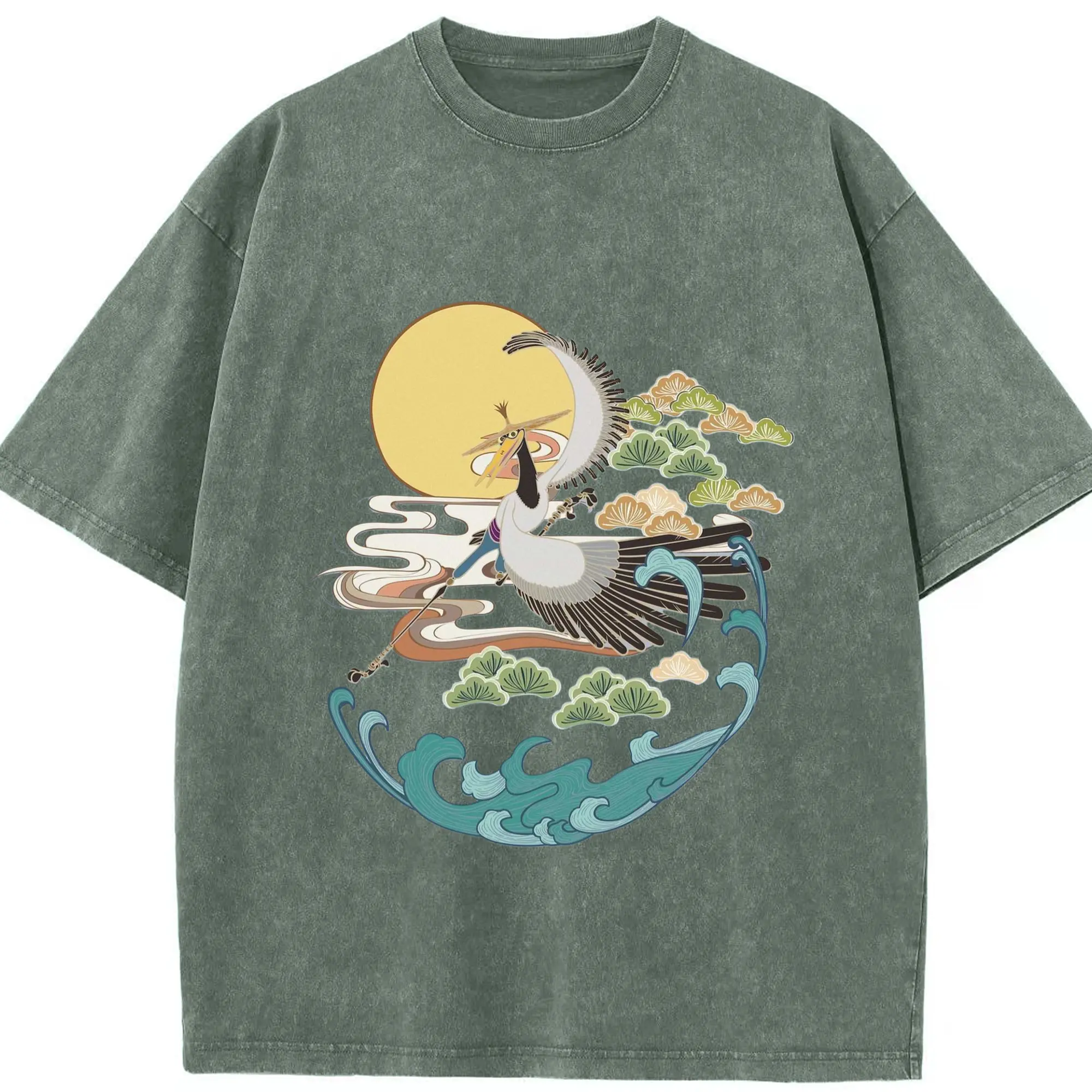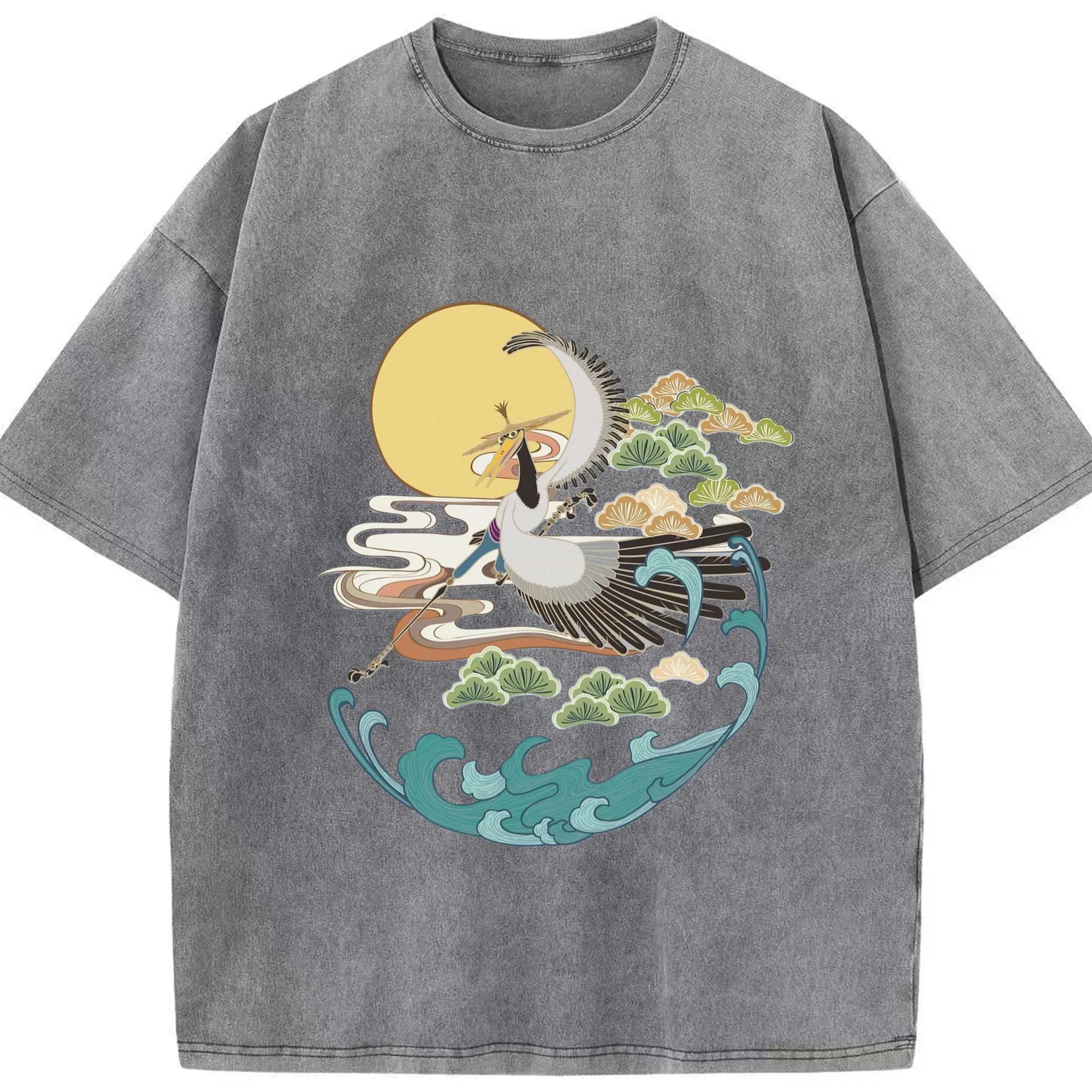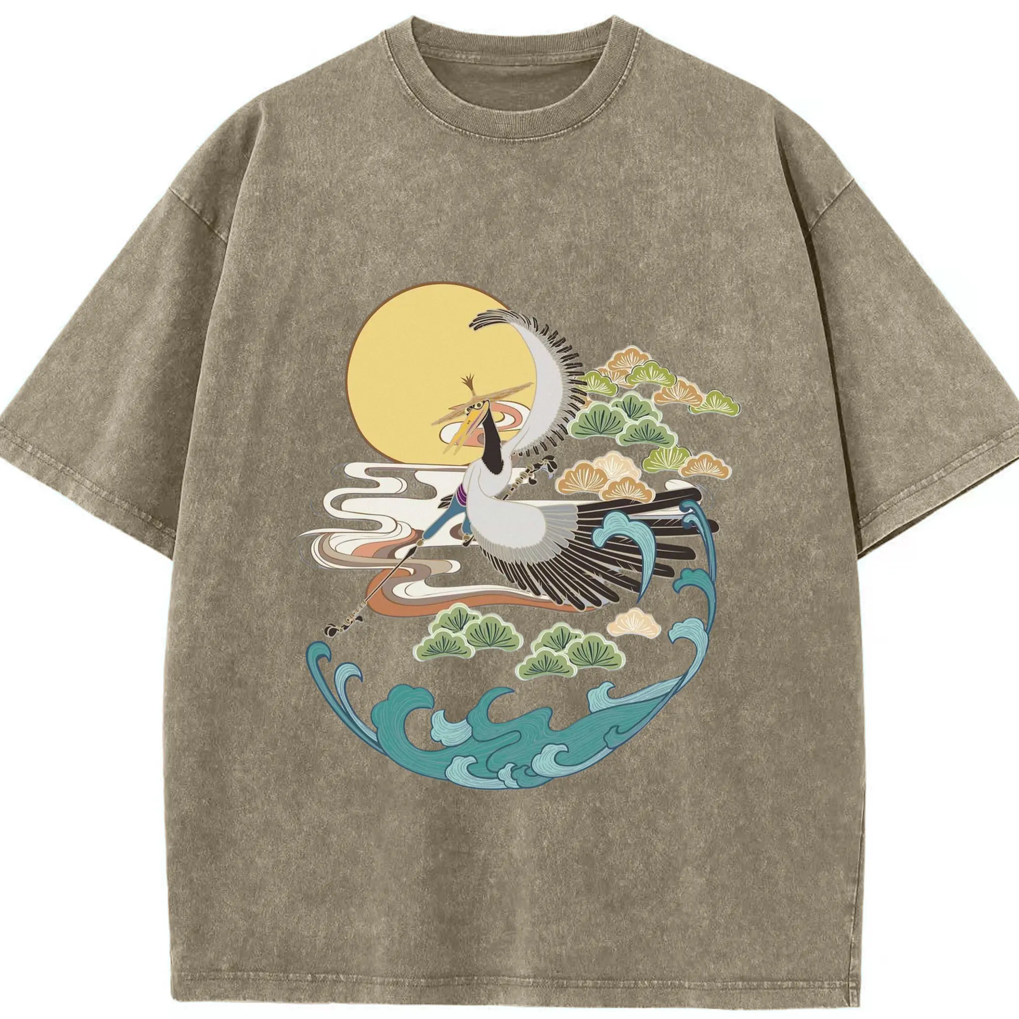 Men's Kung Fu Panda Crane‌ t-shirt - Washed Vintage Look 230g Cotton Oversized T-Shirt With Front Heat Transfer Print – Soft, Lightweight, Stylish Fit – Comfortable Casual Wear For Sports & Everyday Use