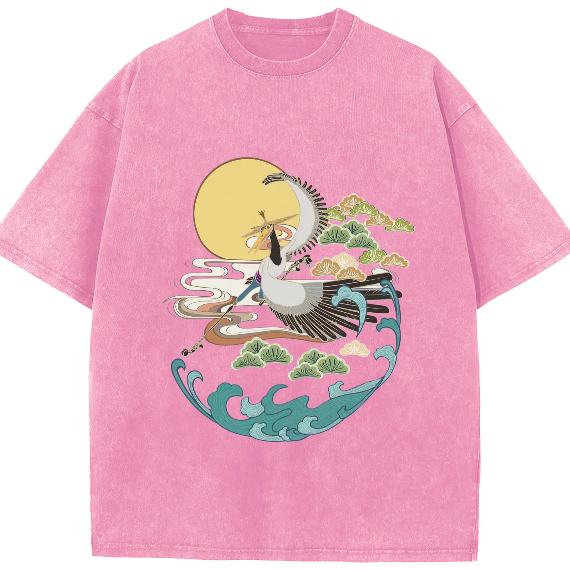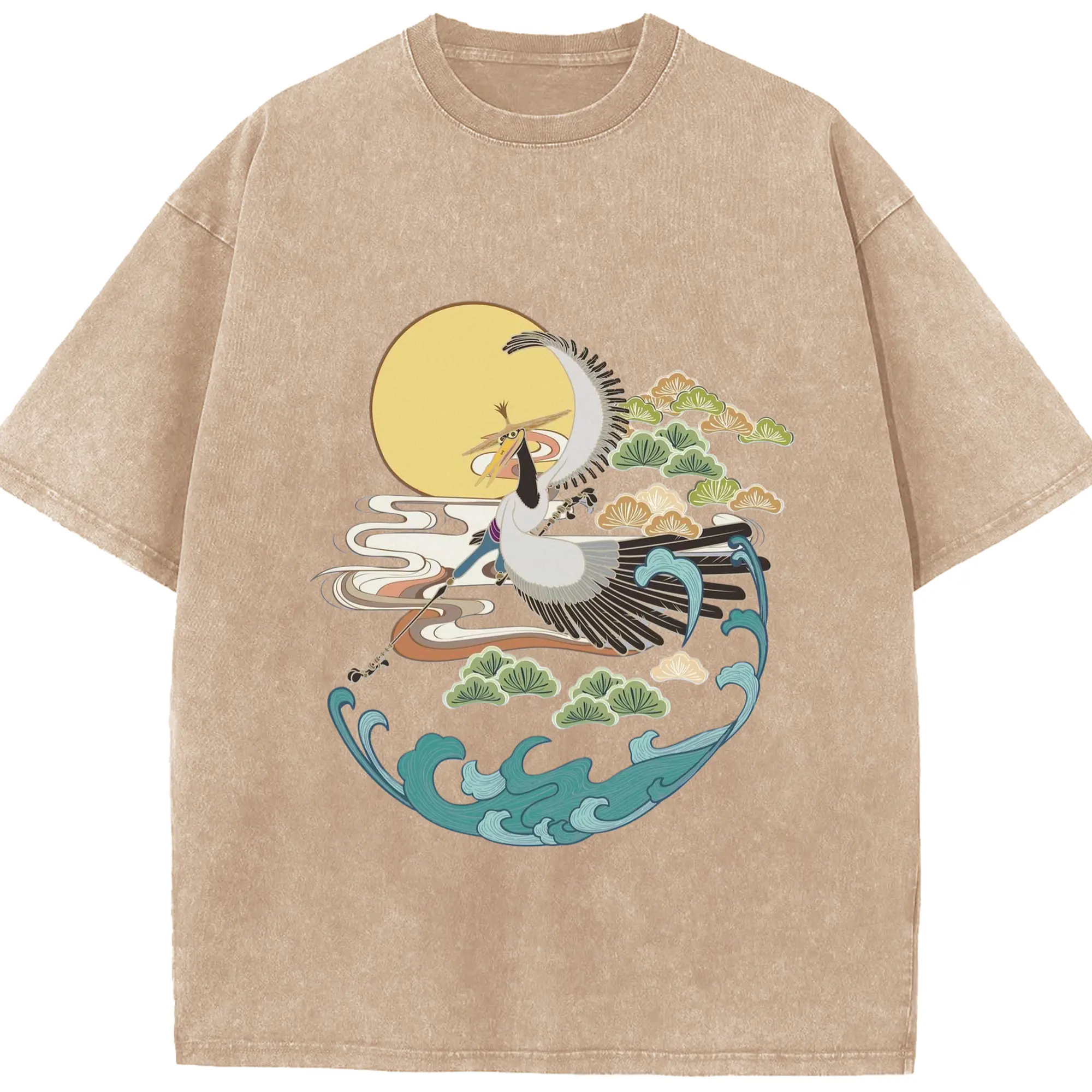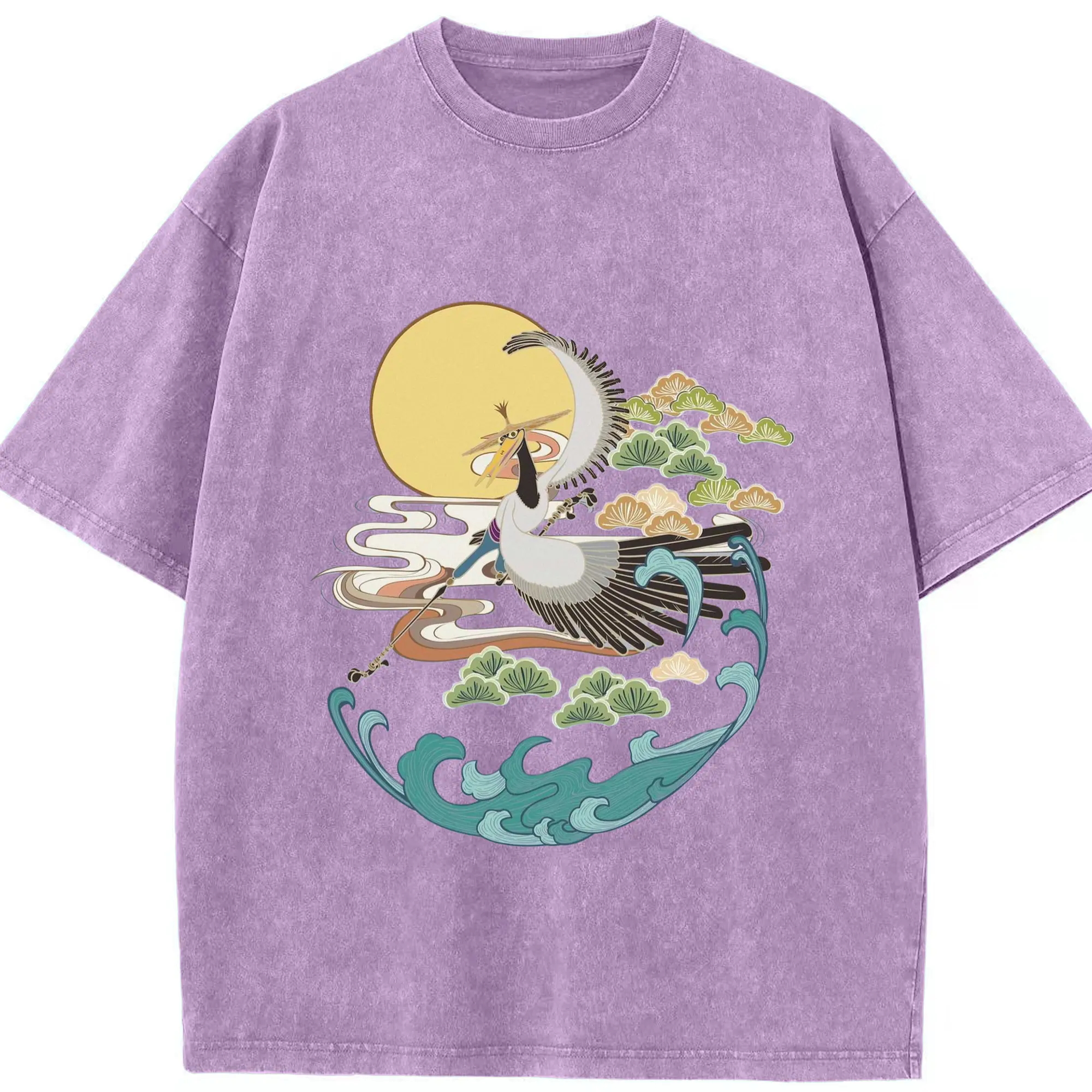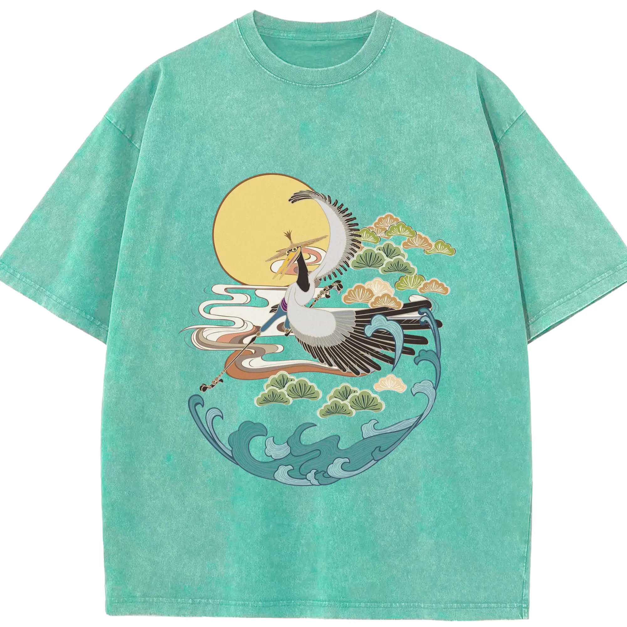 Men's Kung Fu Panda Crane‌ t-shirt - Washed Vintage Look 230g Cotton Oversized T-Shirt With Front Heat Transfer Print – Soft, Lightweight, Stylish Fit – Comfortable Casual Wear For Sports & Everyday Use