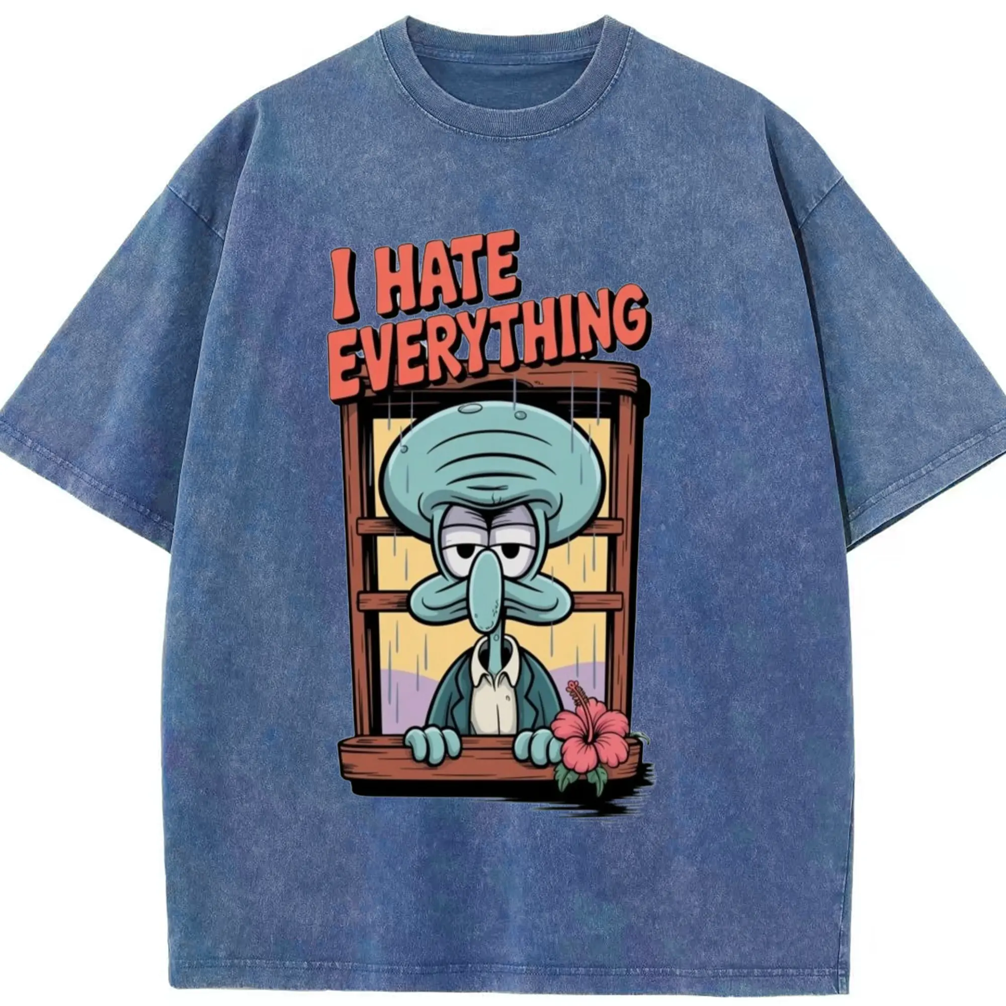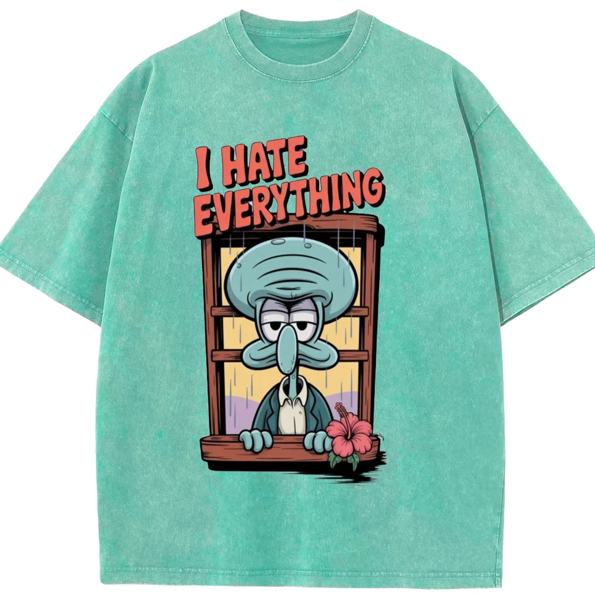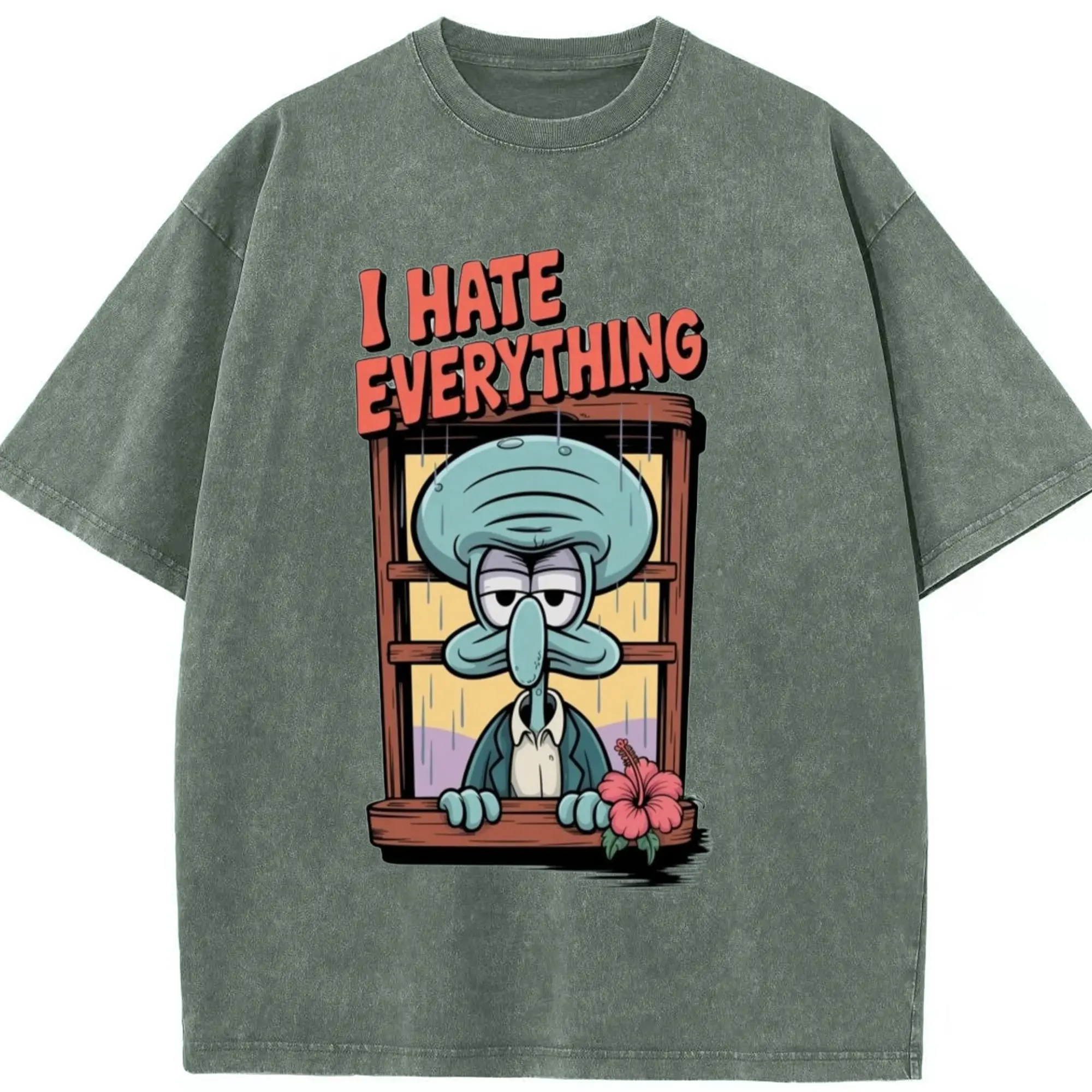 Men's Spongebob Squidward l Hate Everything Tee (2) - Washed Vintage Look 230g Cotton Oversized T-Shirt With Front Heat Transfer Print – Soft, Lightweight, Stylish Fit – Comfortable Casual Wear For Sports & Everyday Use
