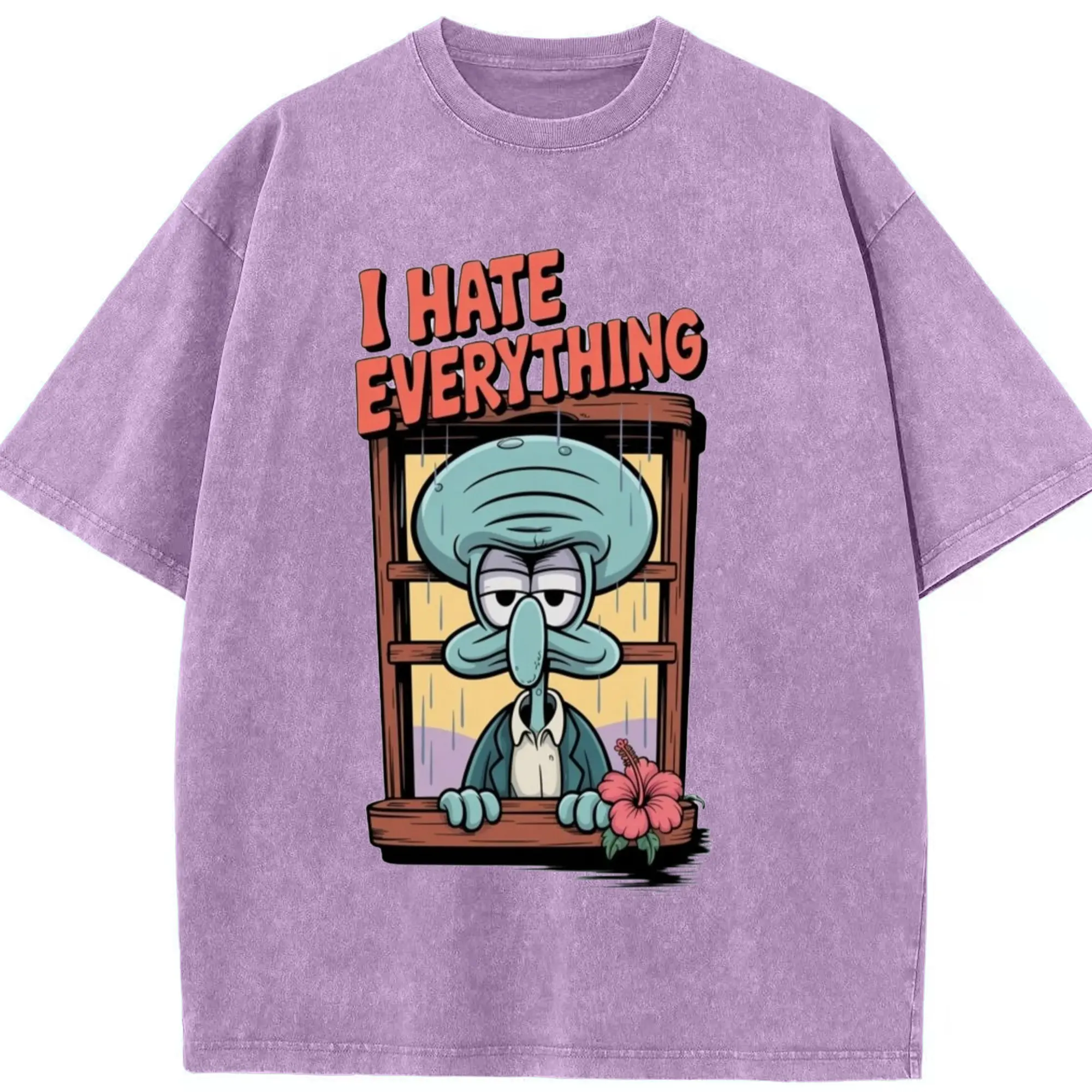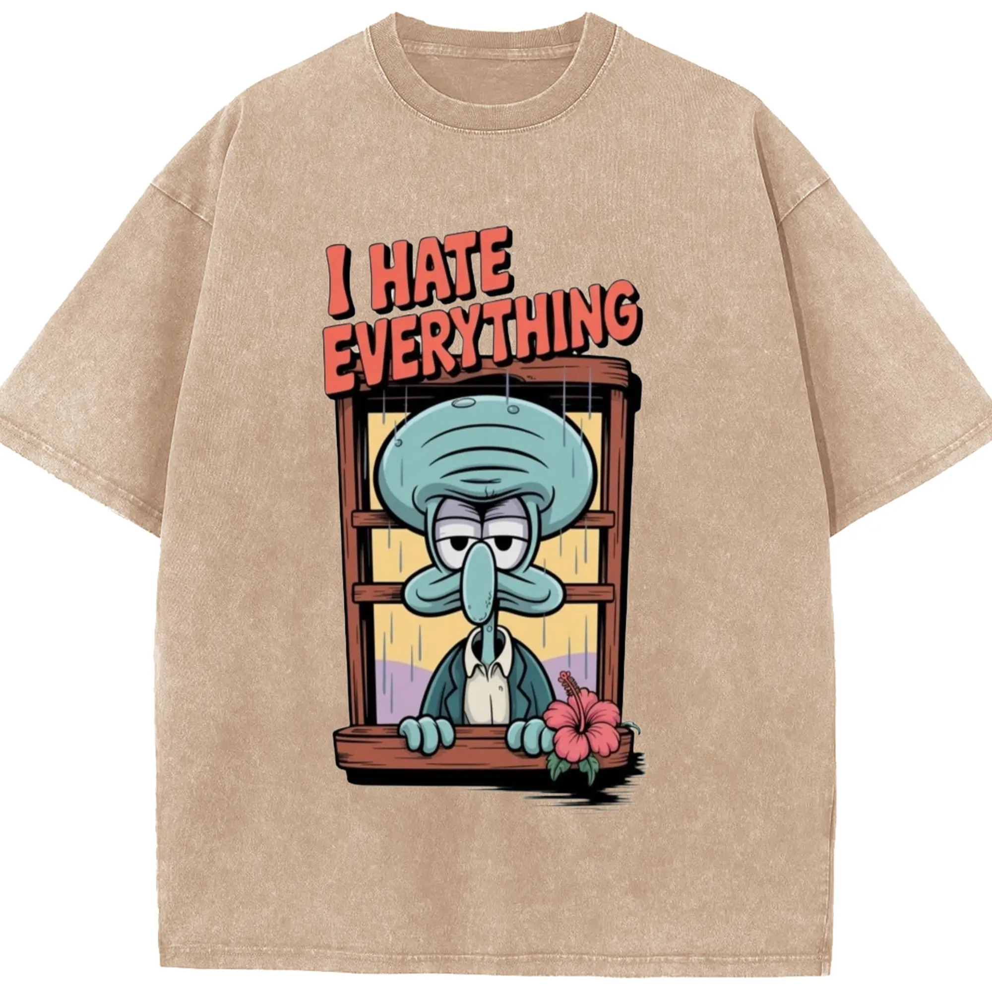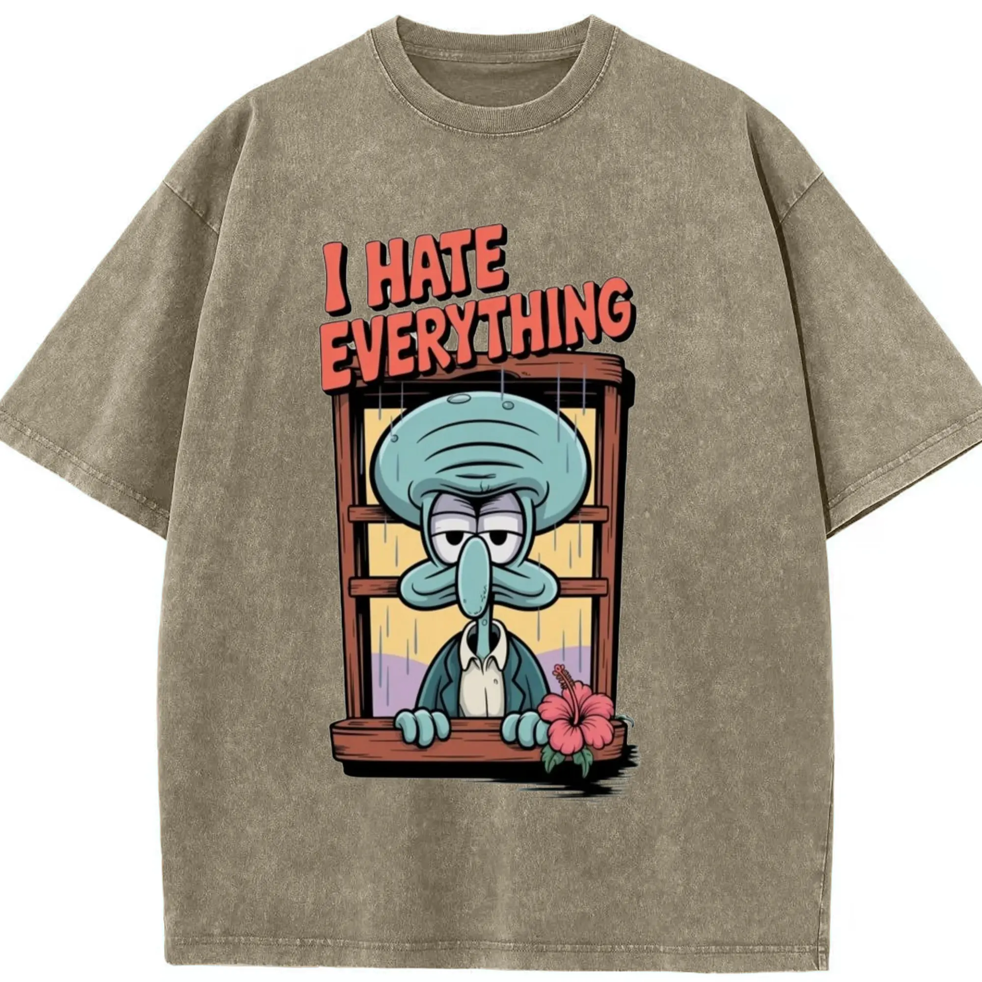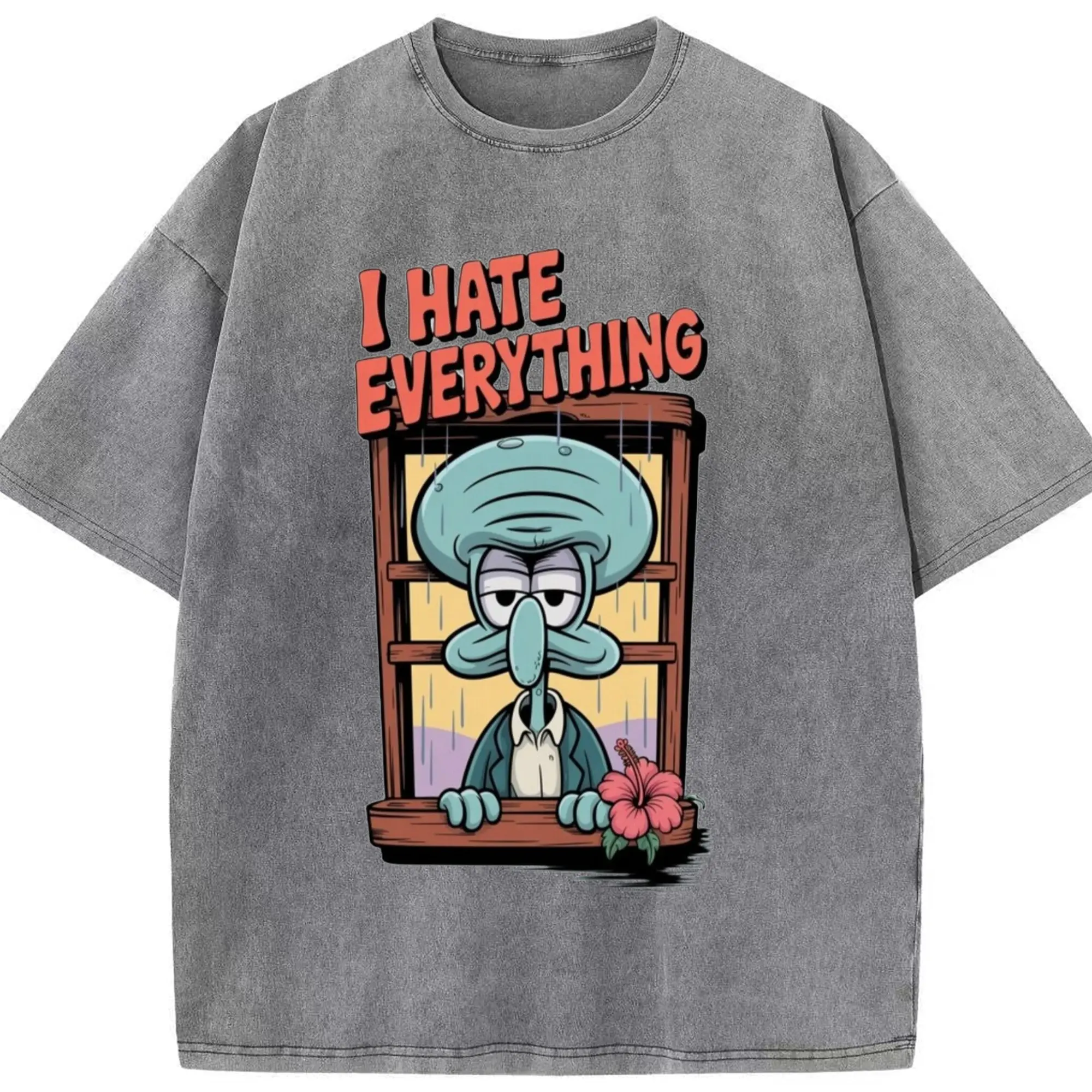 Men's Spongebob Squidward l Hate Everything Tee (2) - Washed Vintage Look 230g Cotton Oversized T-Shirt With Front Heat Transfer Print – Soft, Lightweight, Stylish Fit – Comfortable Casual Wear For Sports & Everyday Use