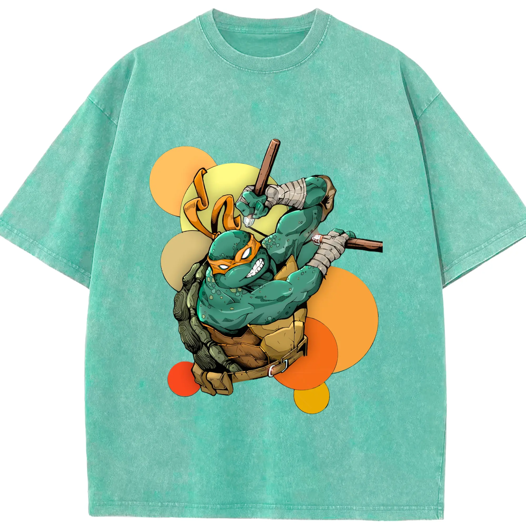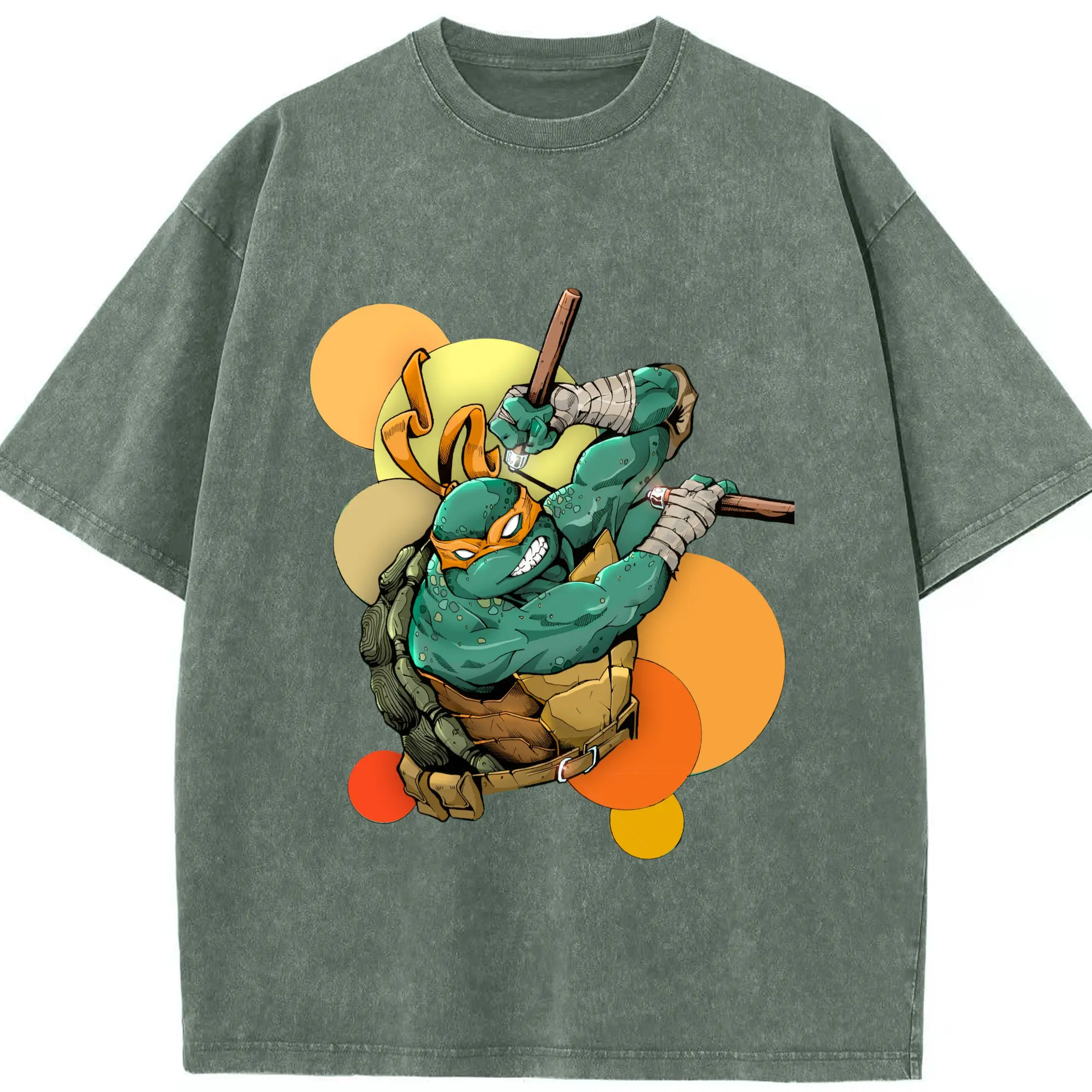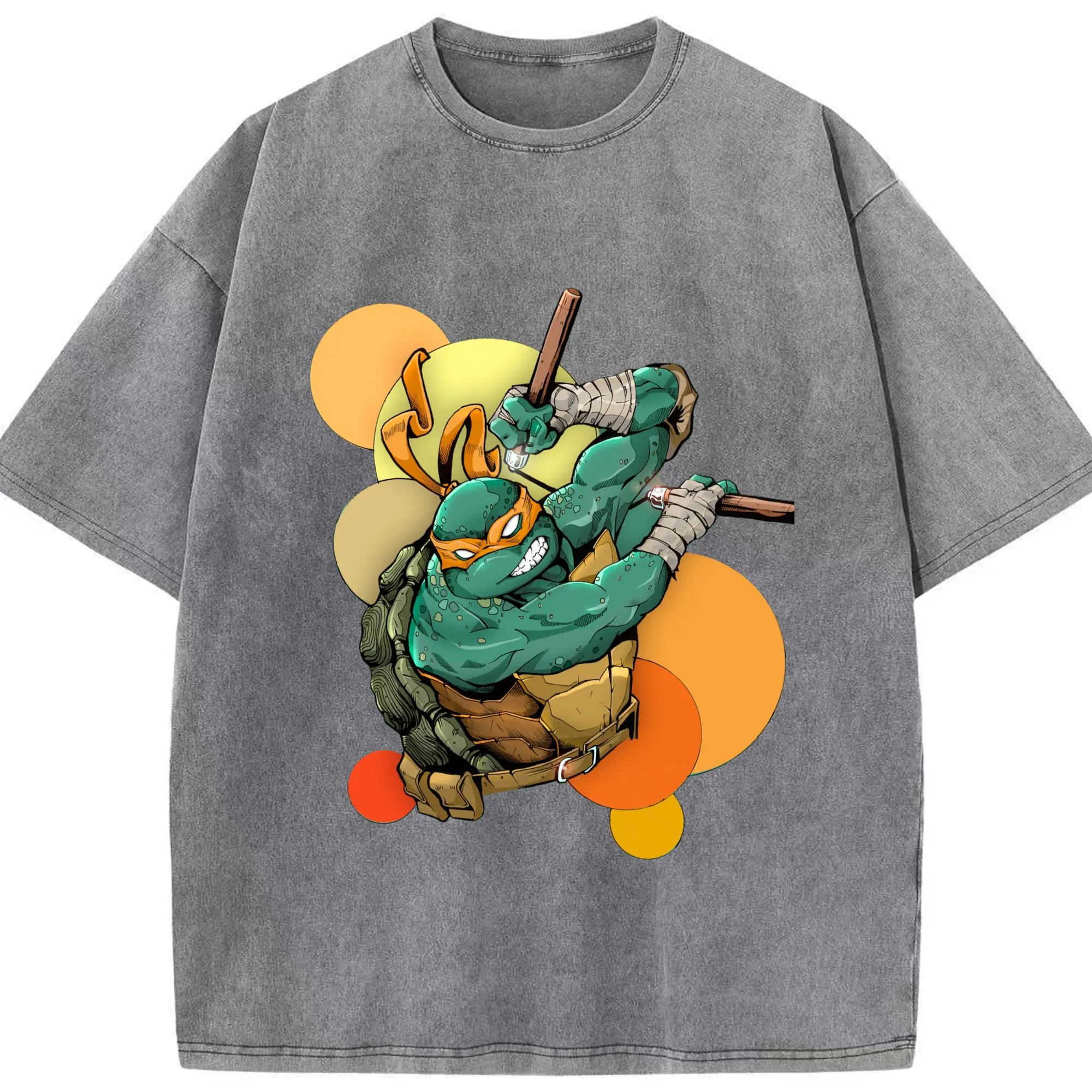 Men's Teenage Mutant Ninja Turtles Michelangelo T-Shirt - Washed Vintage Look 230g Cotton Oversized T-Shirt With Front Heat Transfer Print – Soft, Lightweight, Stylish Fit – Comfortable Casual Wear For Sports & Everyday Use
