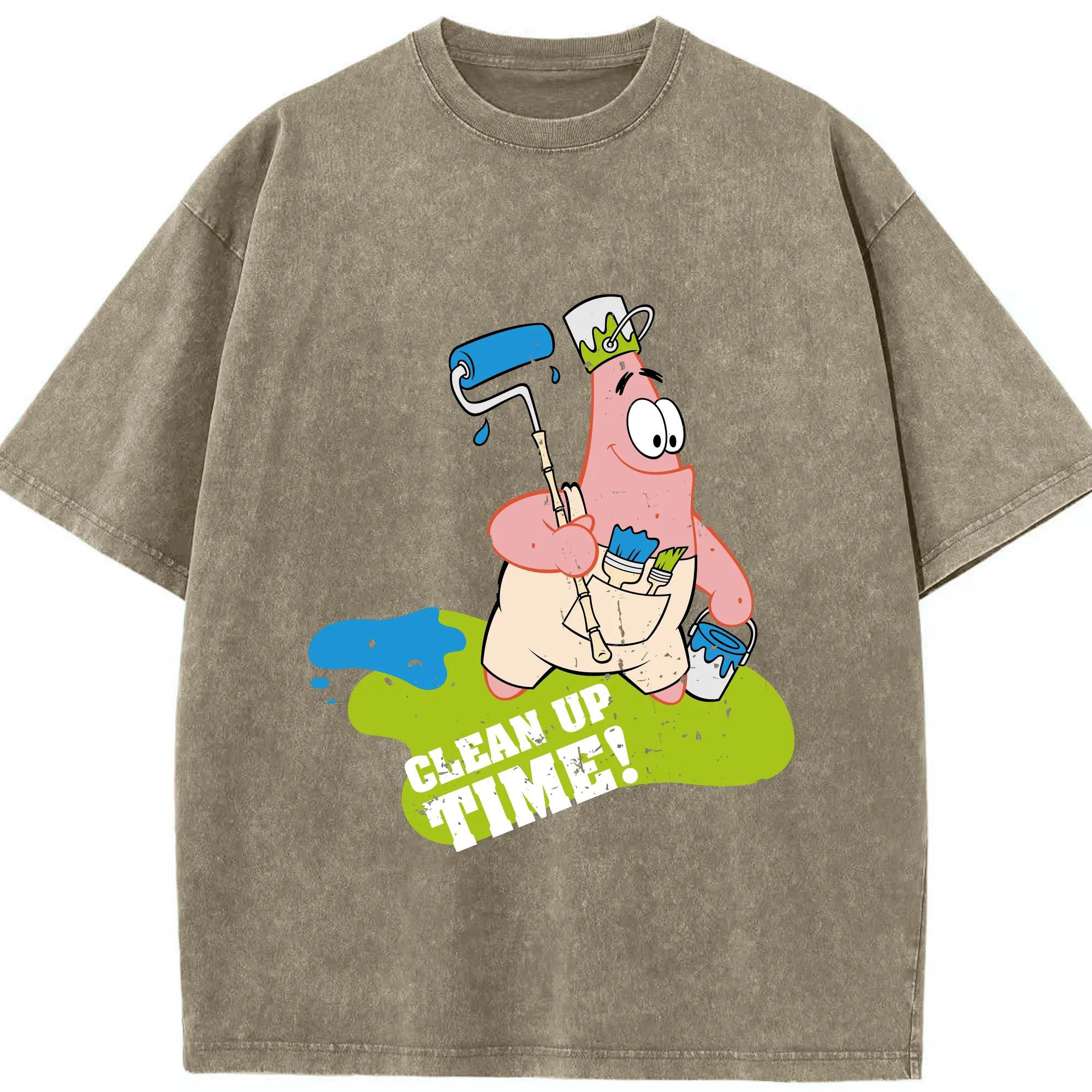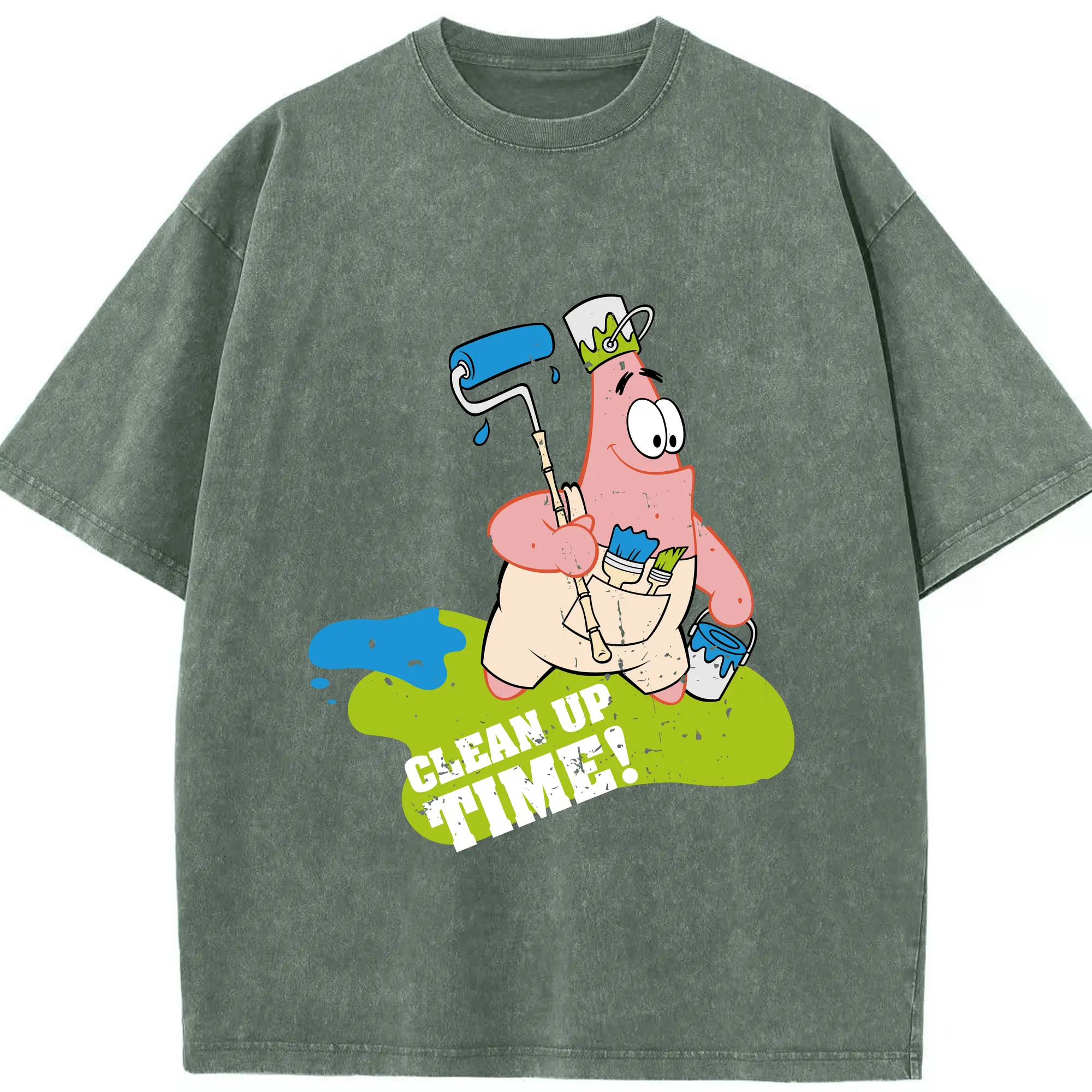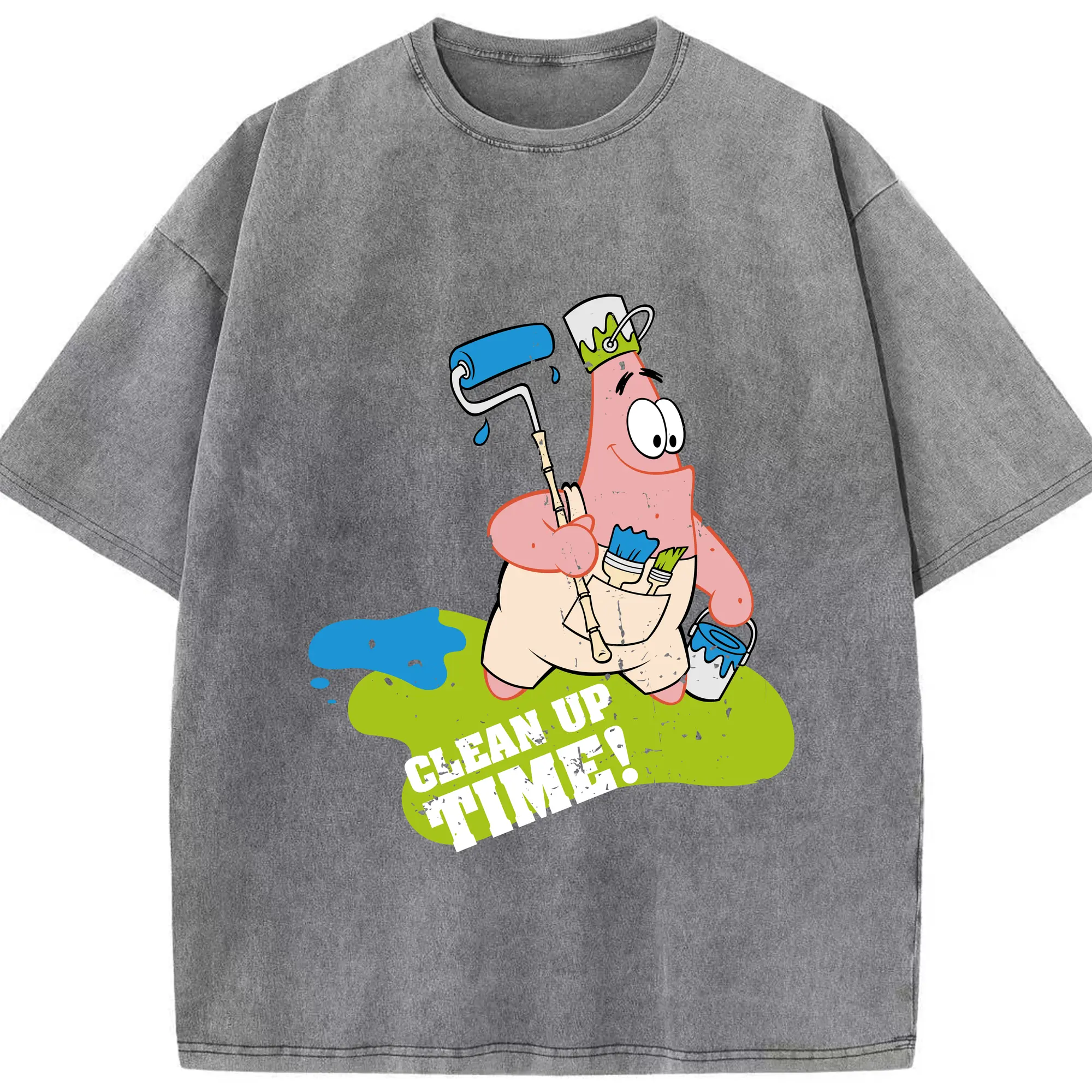 Patrick Star clean up time Graphic T-Shirt - Washed Vintage Look 230g Cotton Oversized T-Shirt With Front Heat Transfer Print – Soft, Lightweight, Stylish Fit – Comfortable Casual Wear For Sports & Everyday Use