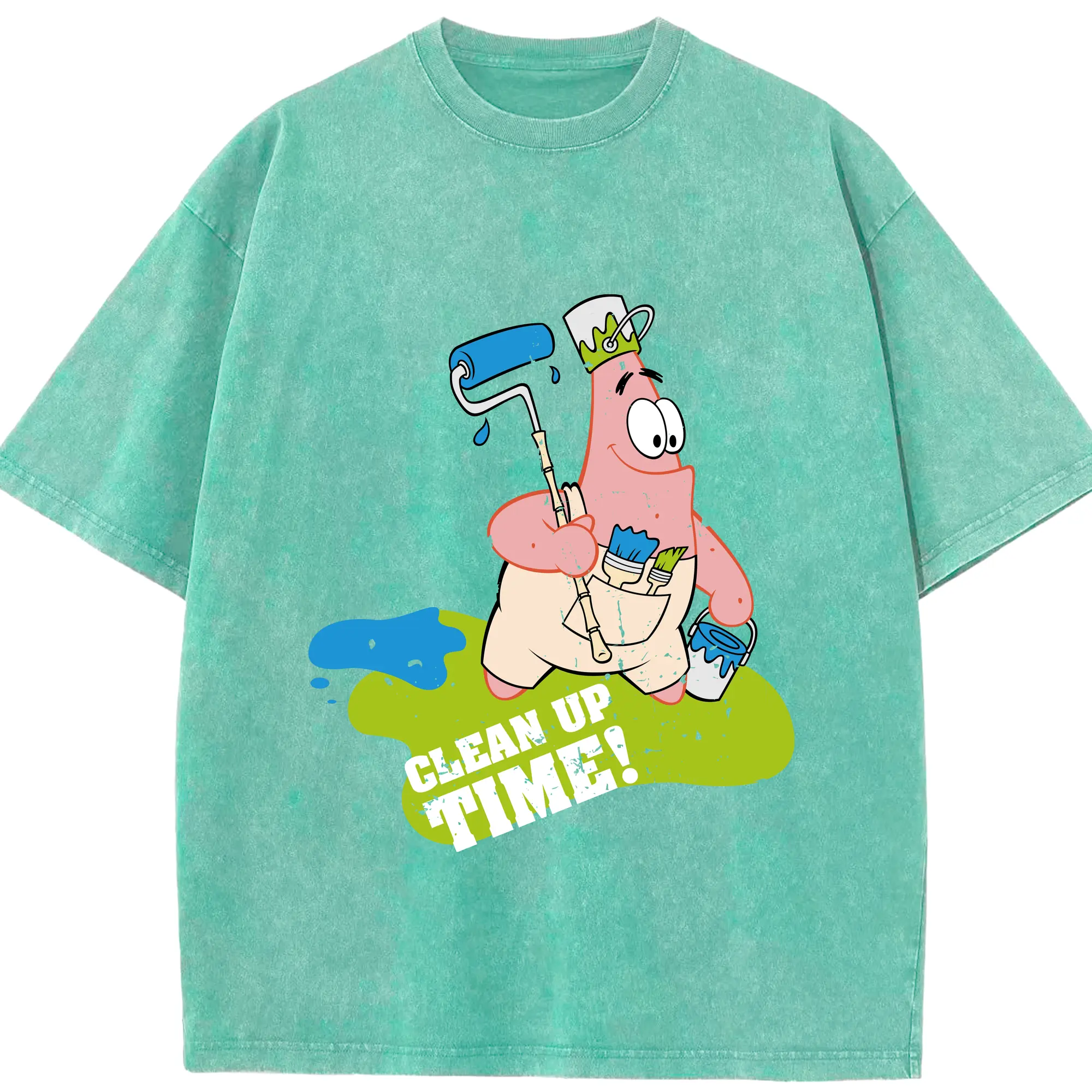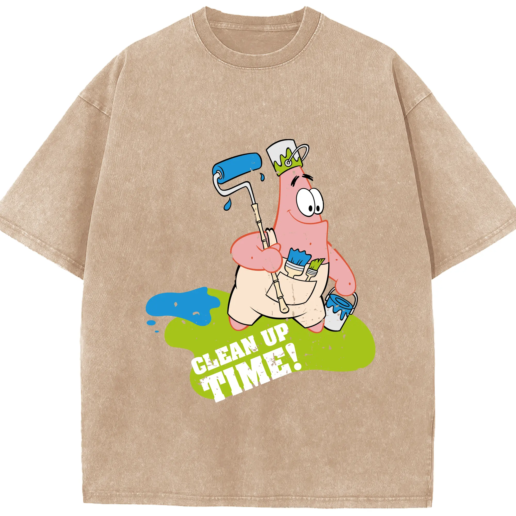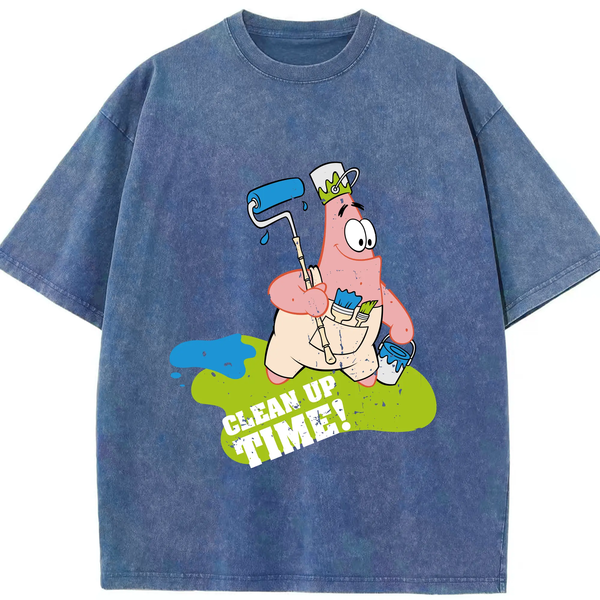 Patrick Star clean up time Graphic T-Shirt - Washed Vintage Look 230g Cotton Oversized T-Shirt With Front Heat Transfer Print – Soft, Lightweight, Stylish Fit – Comfortable Casual Wear For Sports & Everyday Use