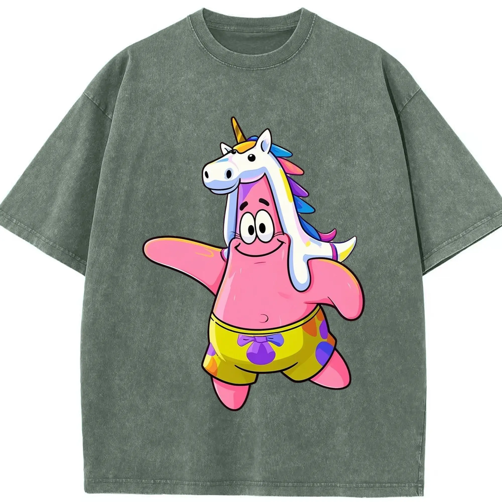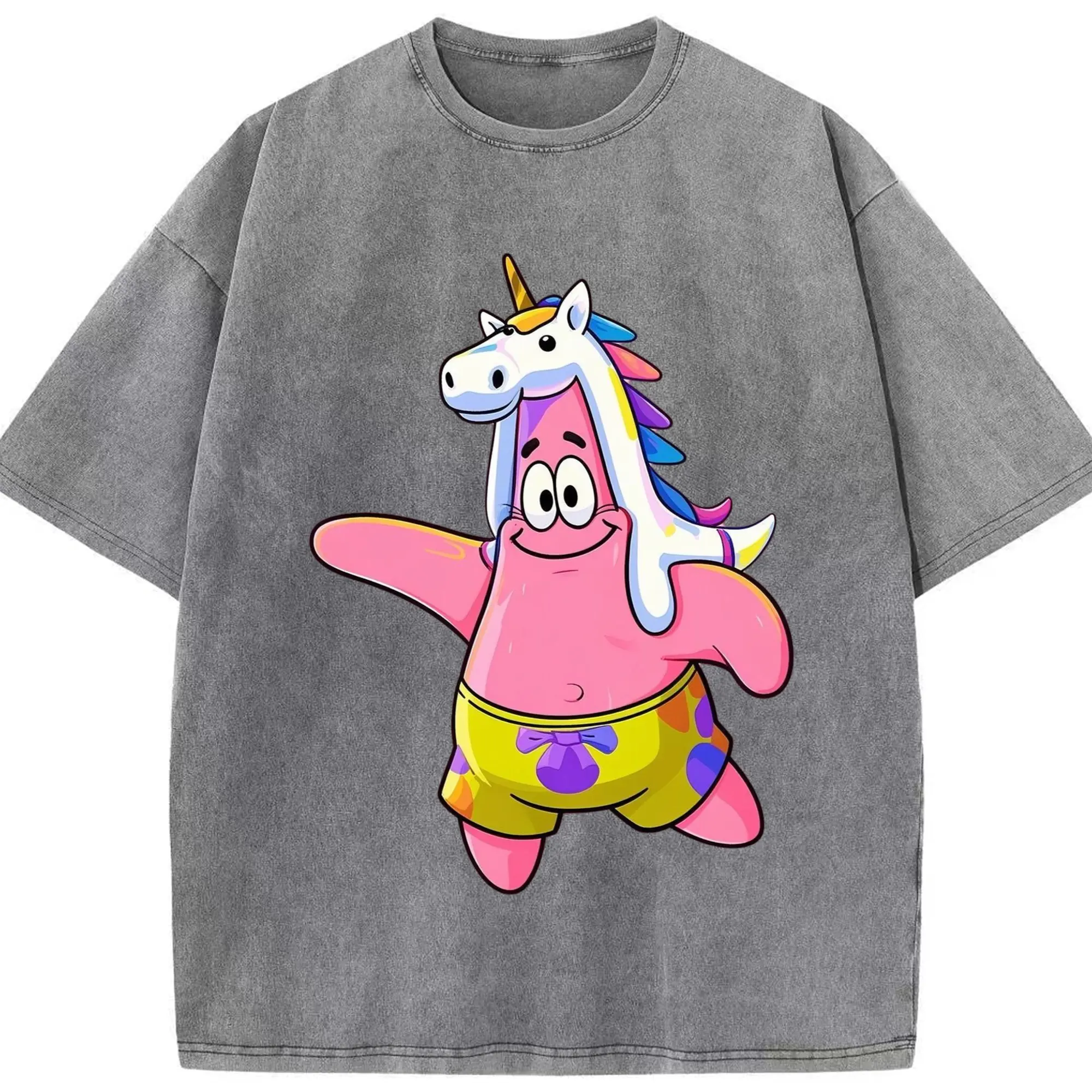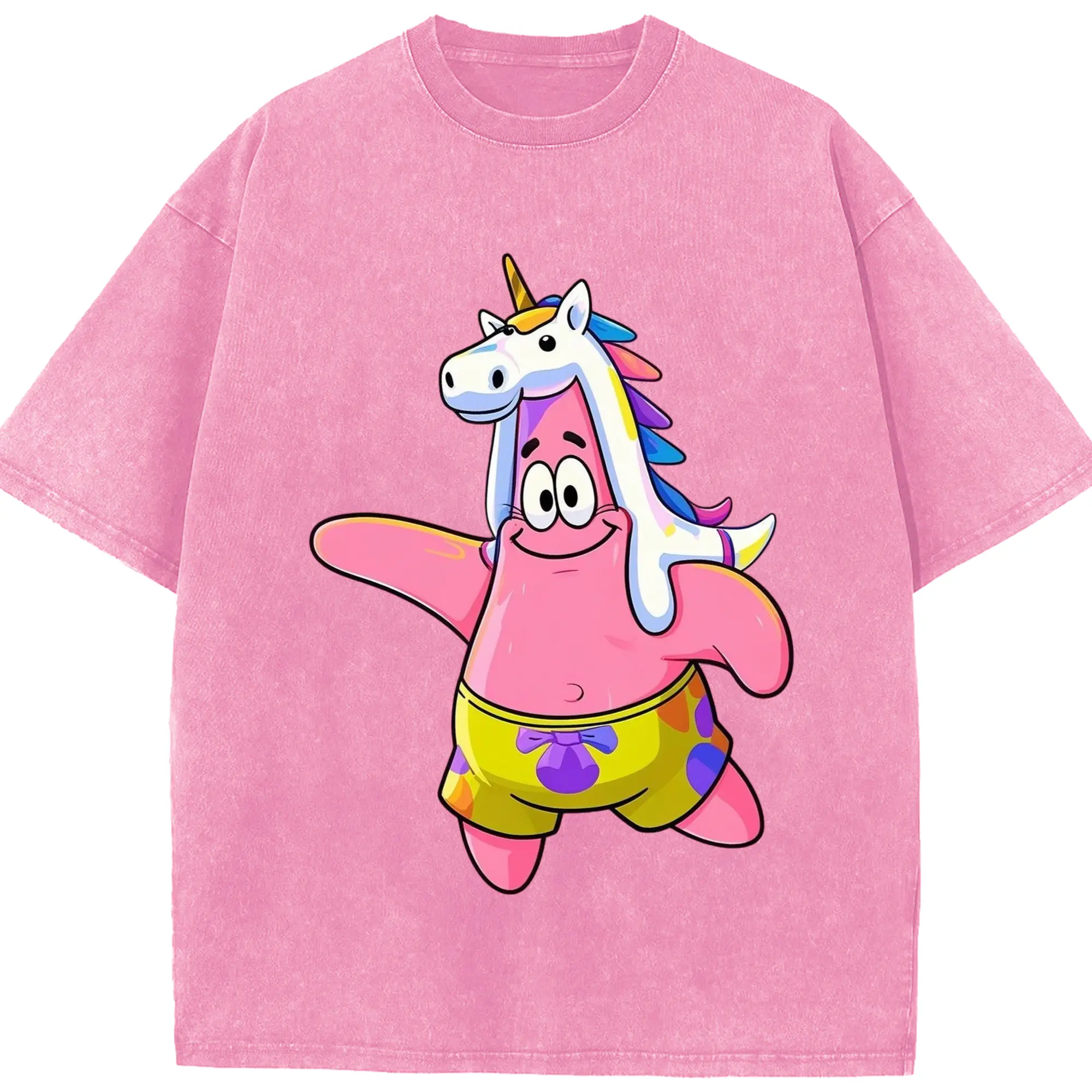 Patrick Star unicorn Graphic T-Shirt - Washed Vintage Look 230g Cotton Oversized T-Shirt With Front Heat Transfer Print – Soft, Lightweight, Stylish Fit – Comfortable Casual Wear For Sports & Everyday Use