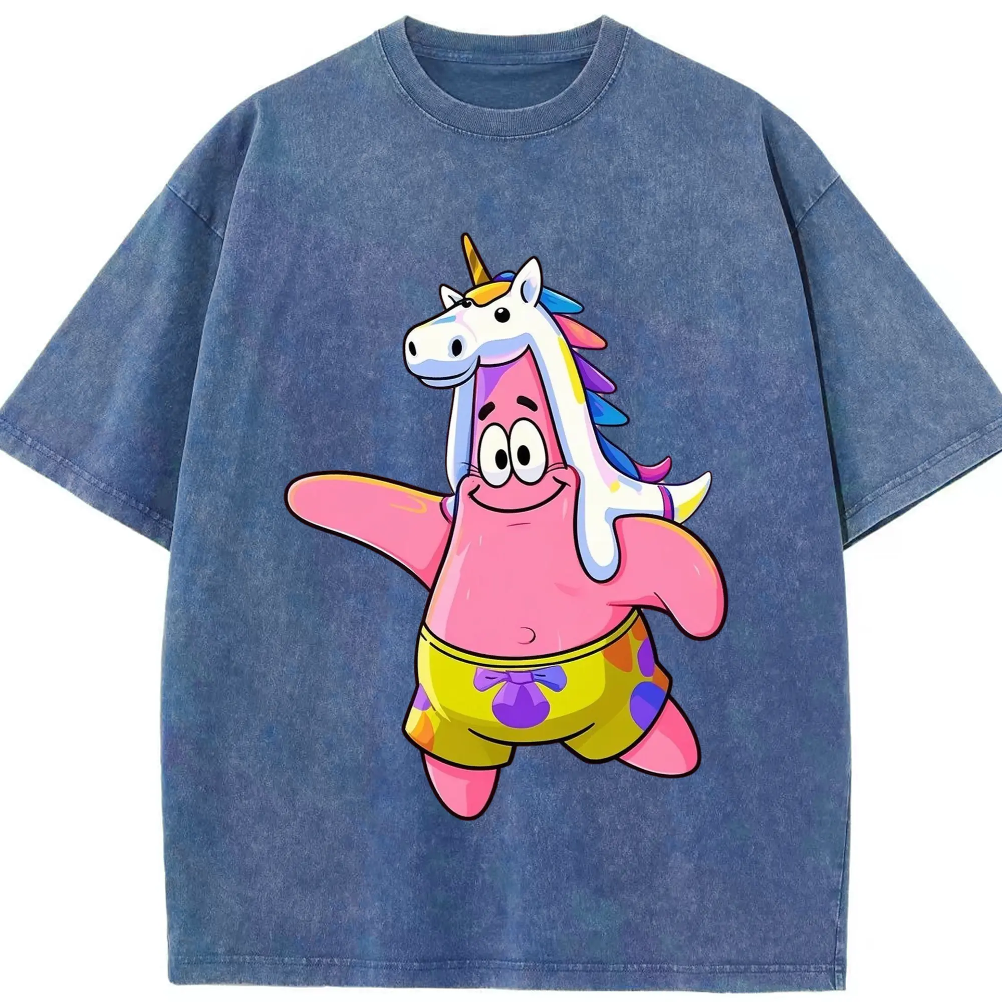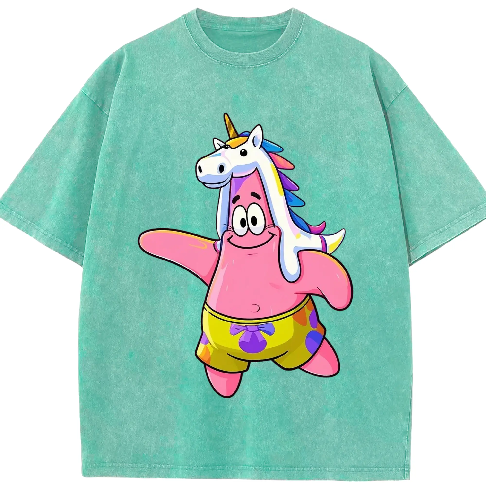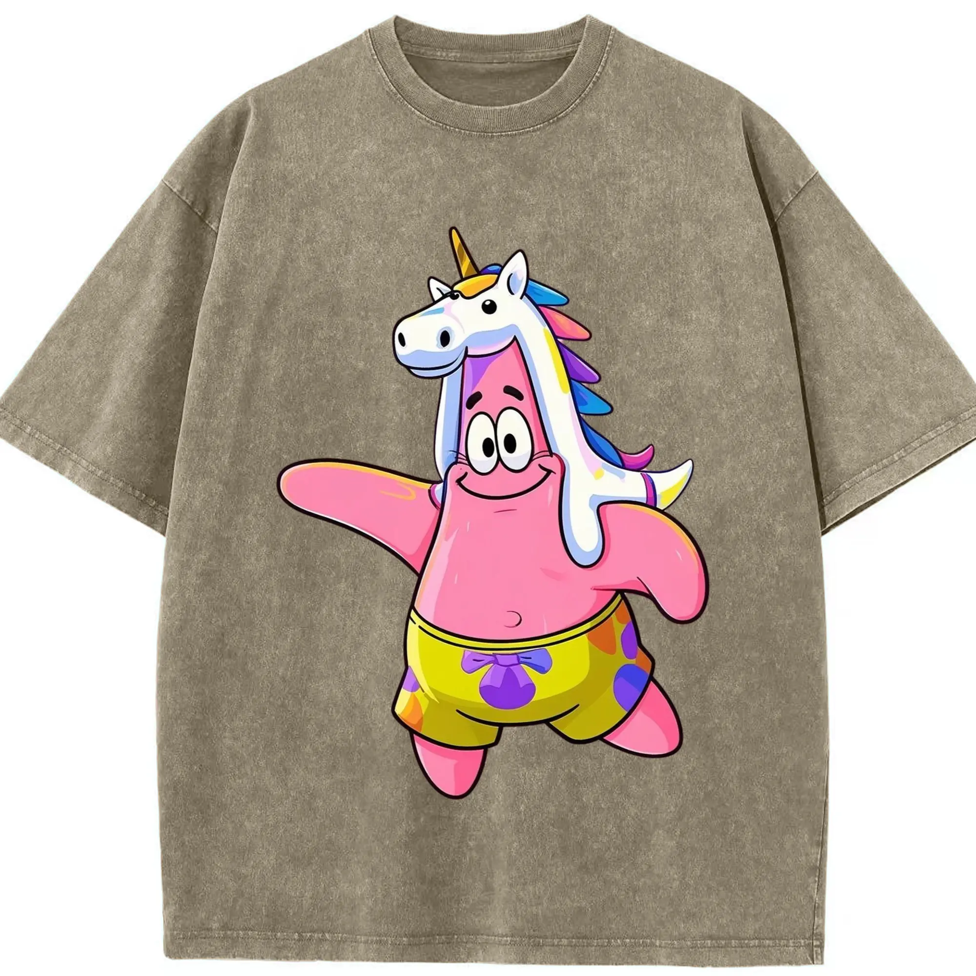 Patrick Star unicorn Graphic T-Shirt - Washed Vintage Look 230g Cotton Oversized T-Shirt With Front Heat Transfer Print – Soft, Lightweight, Stylish Fit – Comfortable Casual Wear For Sports & Everyday Use