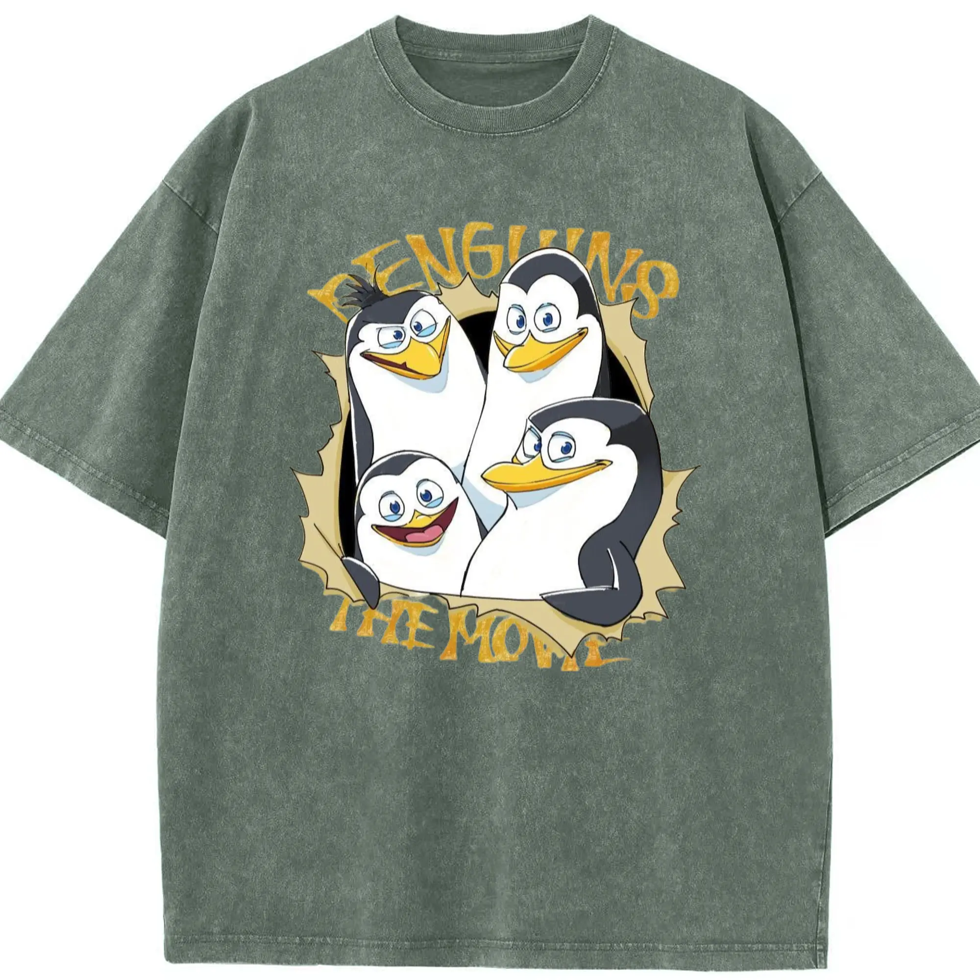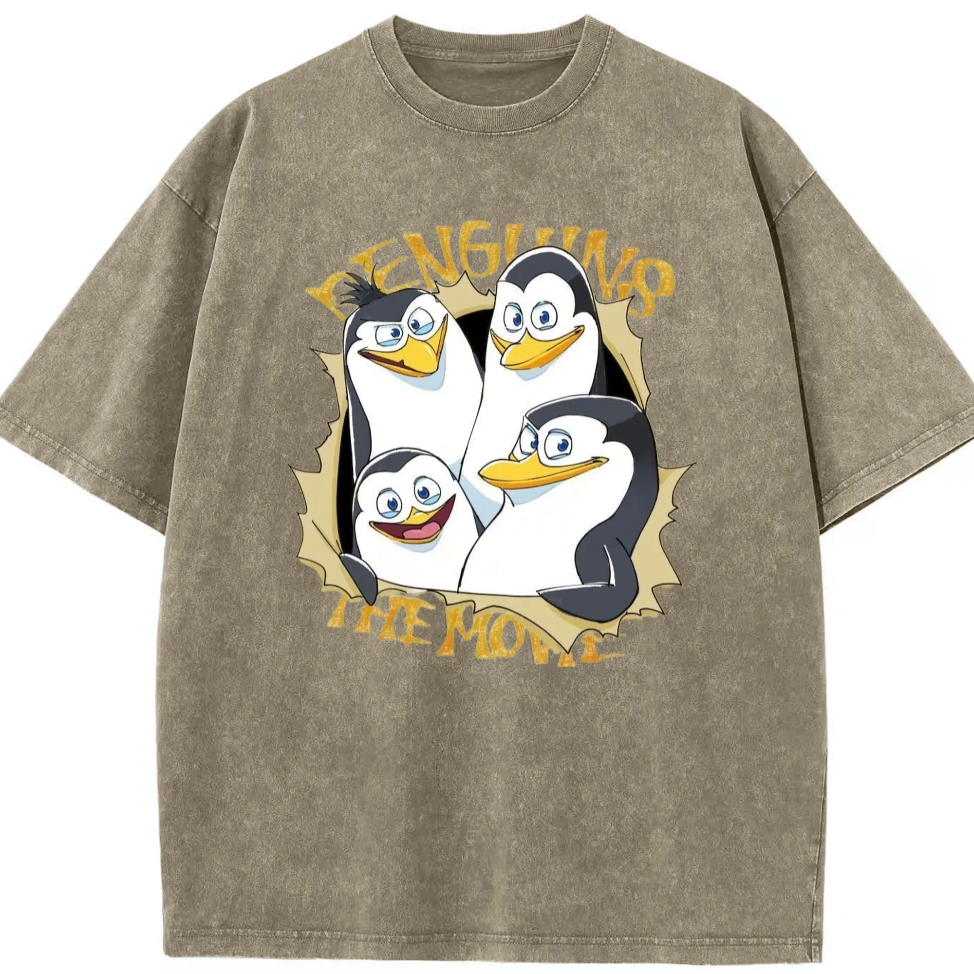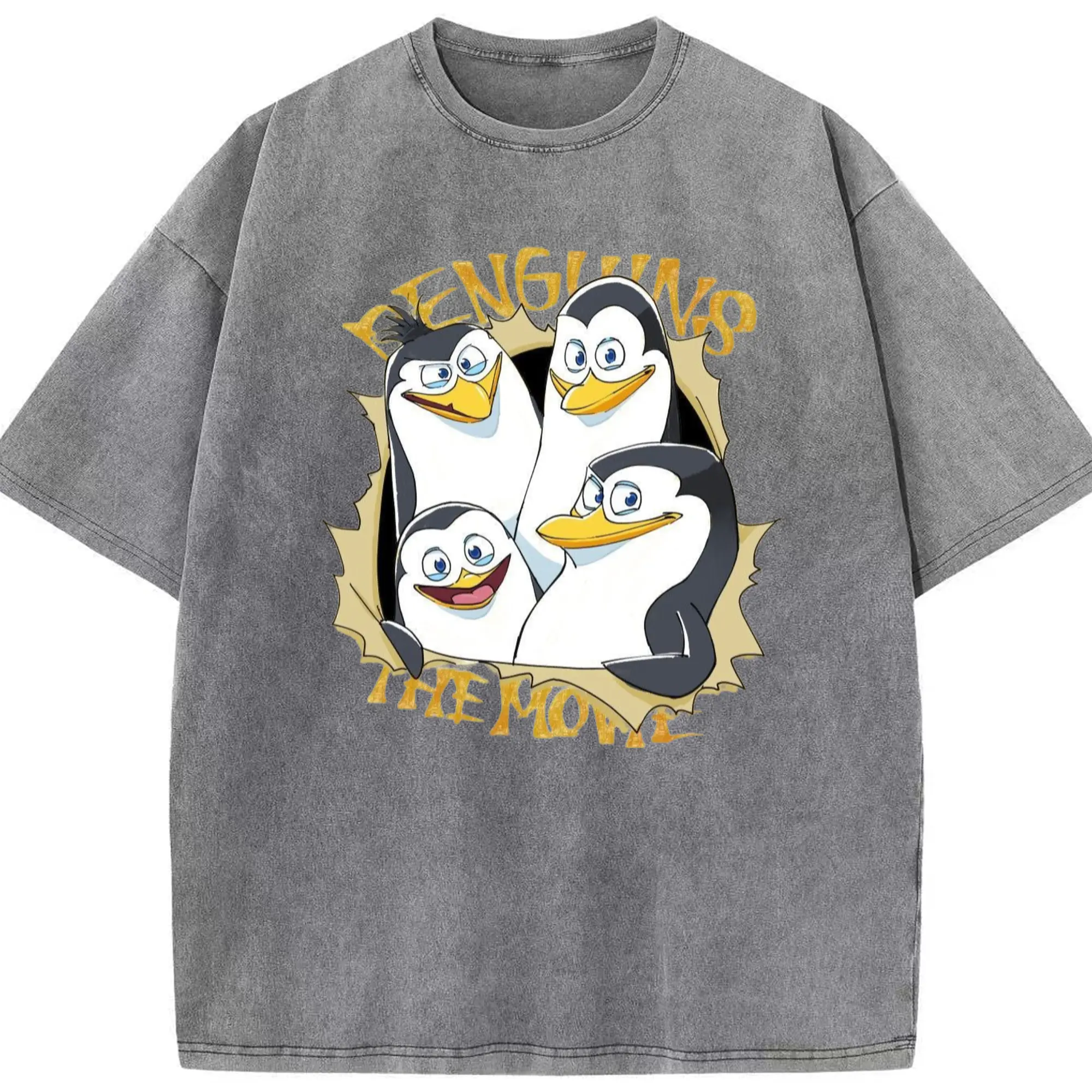 Penguins of madagascar collage t shirt​ - Washed Vintage Look 230g Cotton Oversized T-Shirt With Front Heat Transfer Print – Soft, Lightweight, Stylish Fit – Comfortable Casual Wear For Sports & Everyday Use