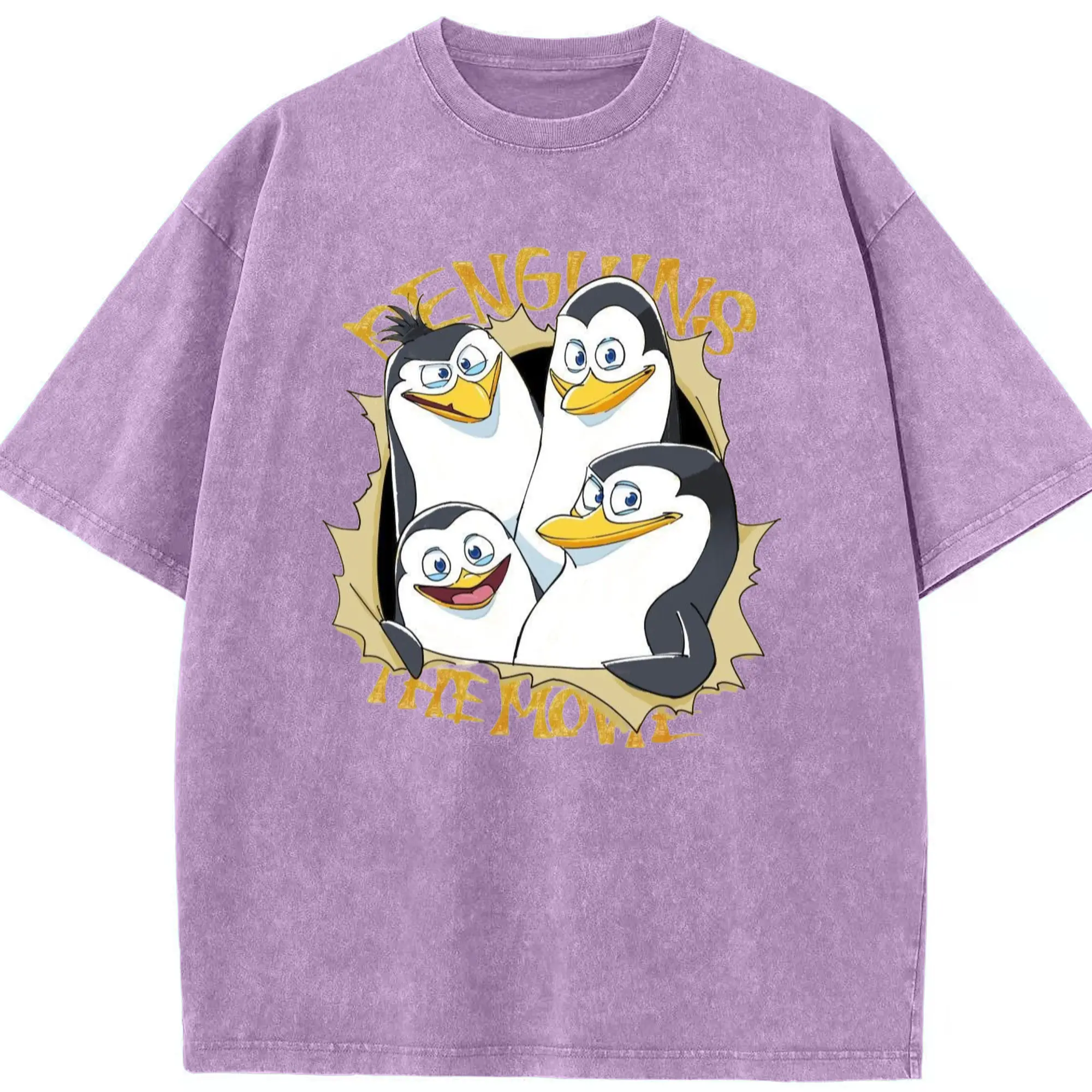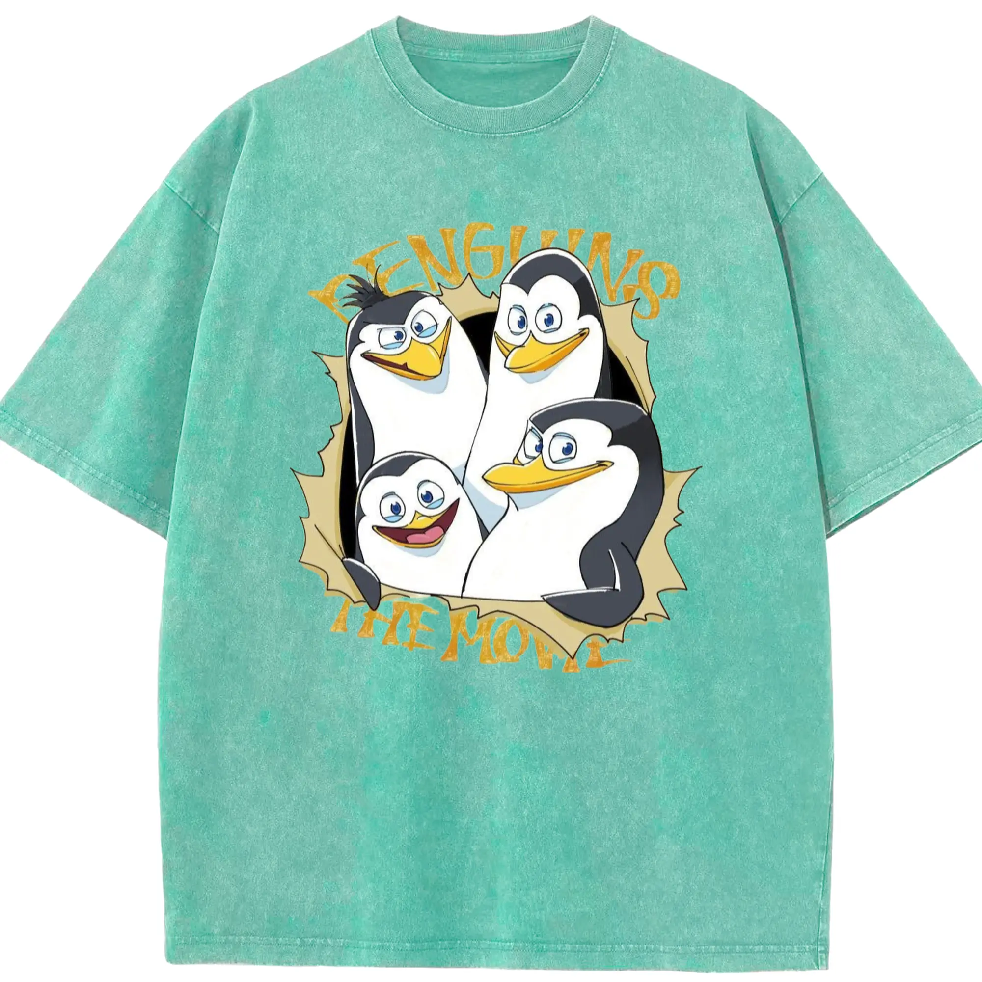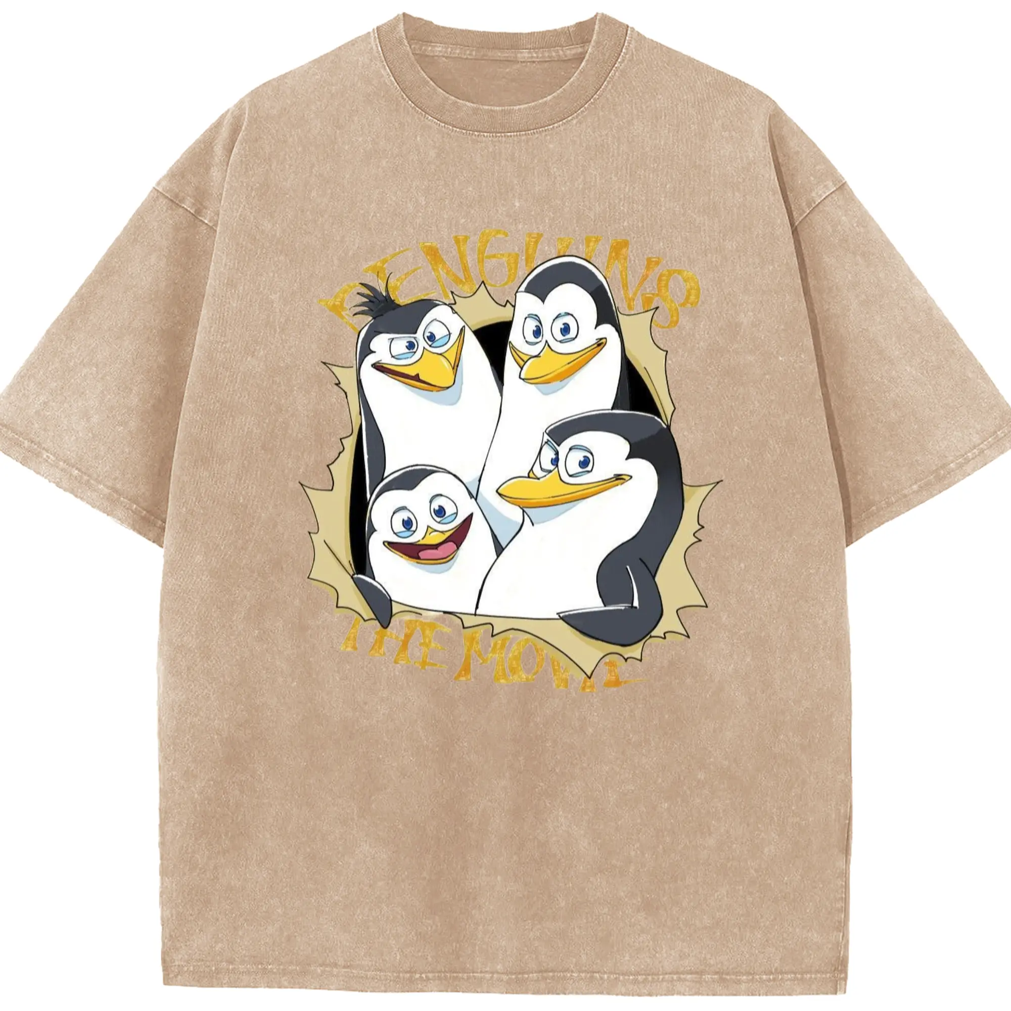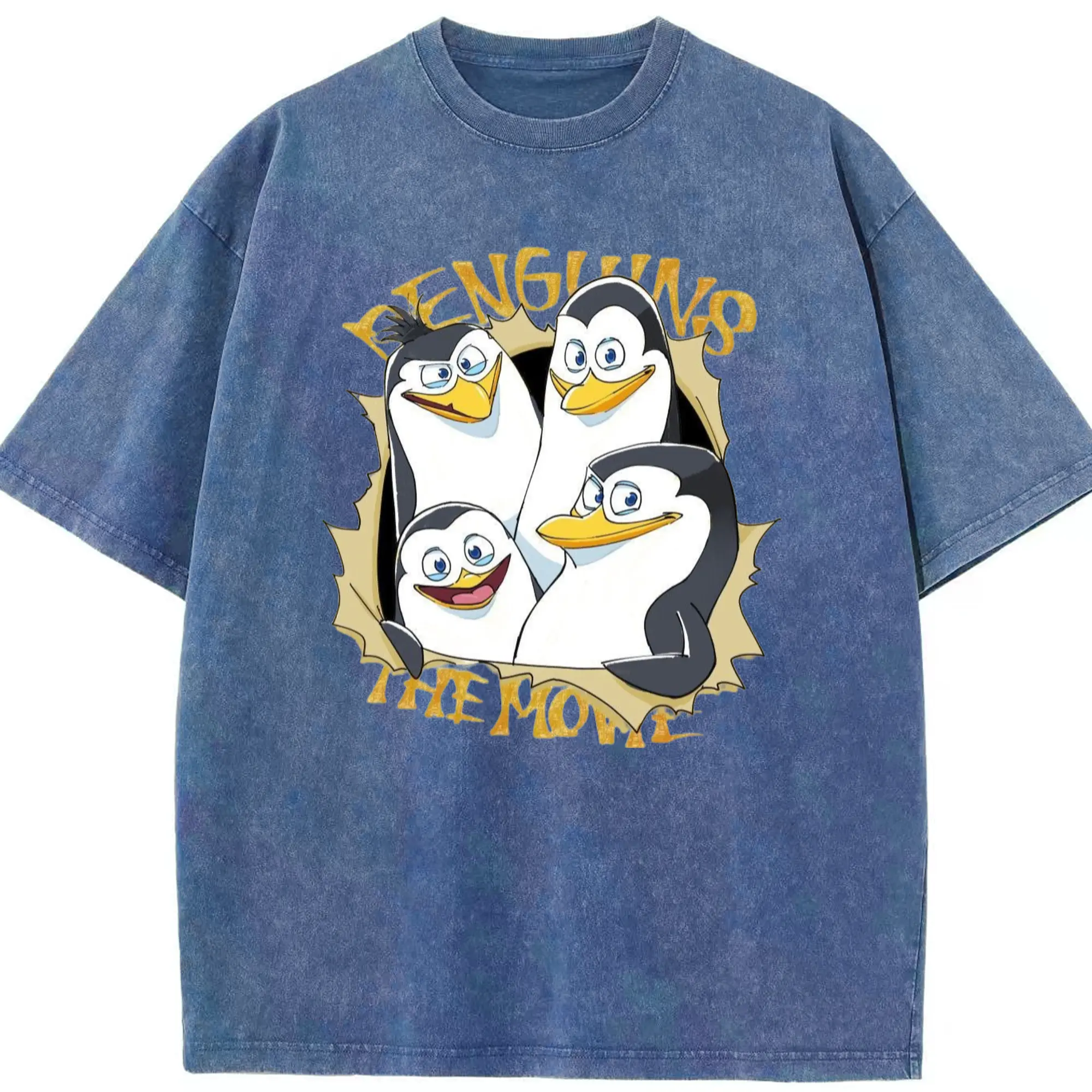 Penguins of madagascar collage t shirt​ - Washed Vintage Look 230g Cotton Oversized T-Shirt With Front Heat Transfer Print – Soft, Lightweight, Stylish Fit – Comfortable Casual Wear For Sports & Everyday Use