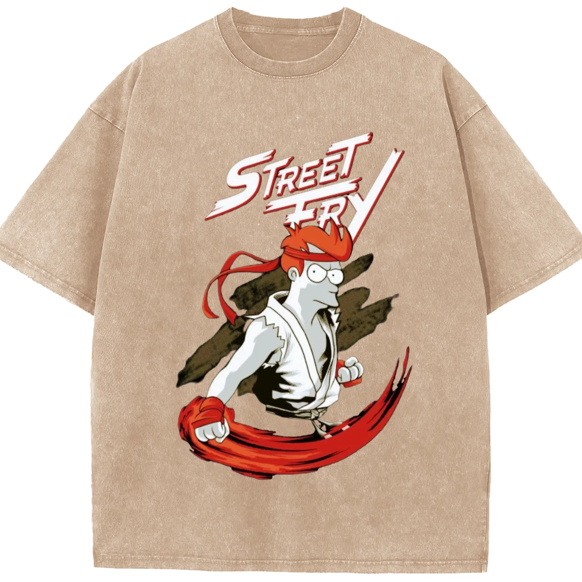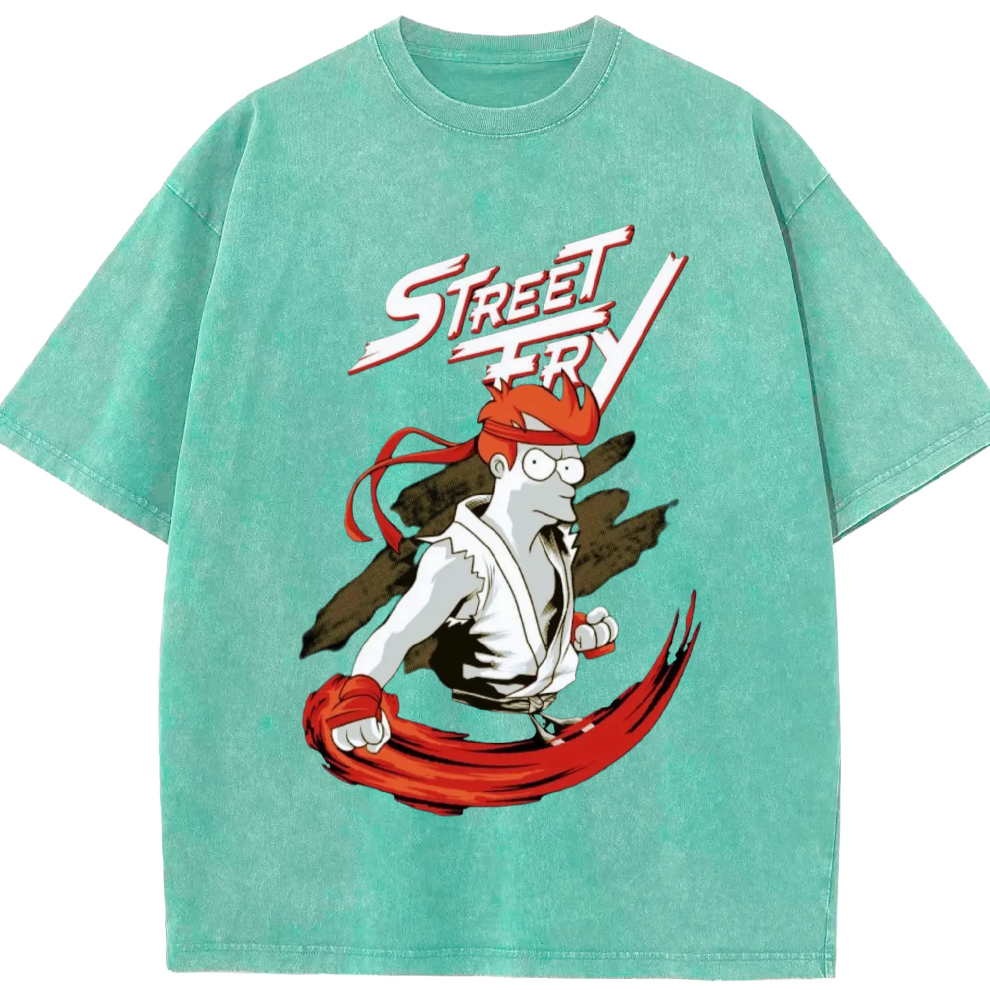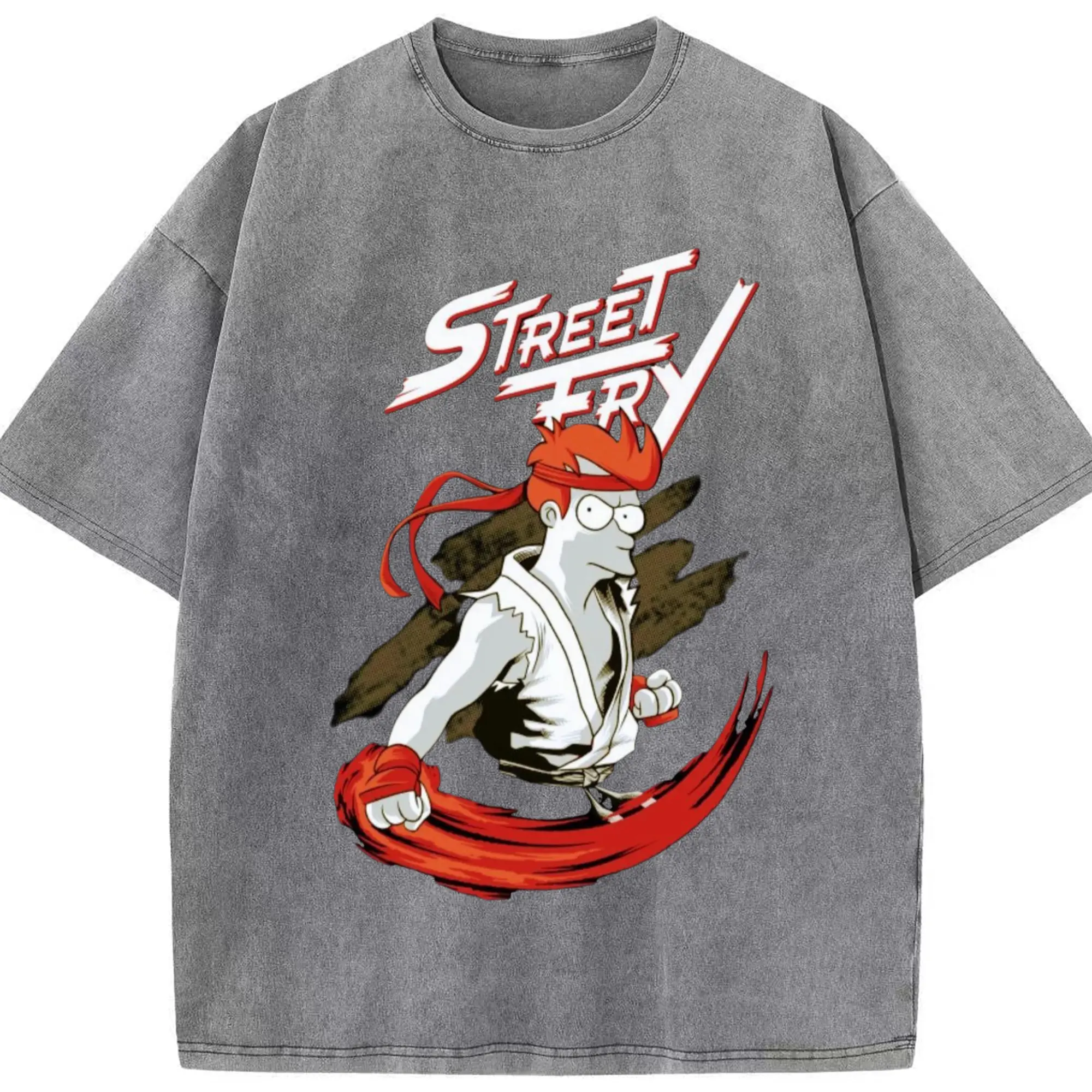Philip j. fry street fight graphic tee - Washed Vintage Look 230g Cotton Oversized T-Shirt With Front Heat Transfer Print – Soft, Lightweight, Stylish Fit – Comfortable Casual Wear For Sports & Everyday Use