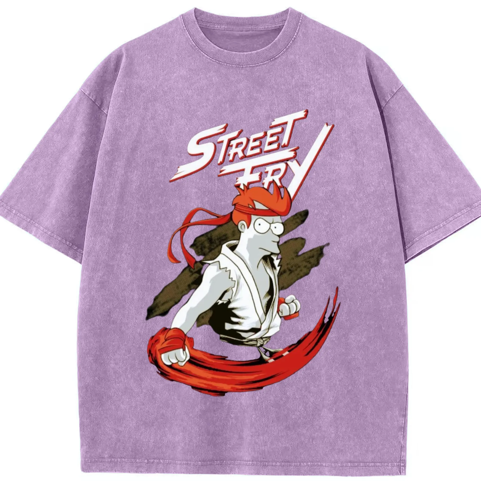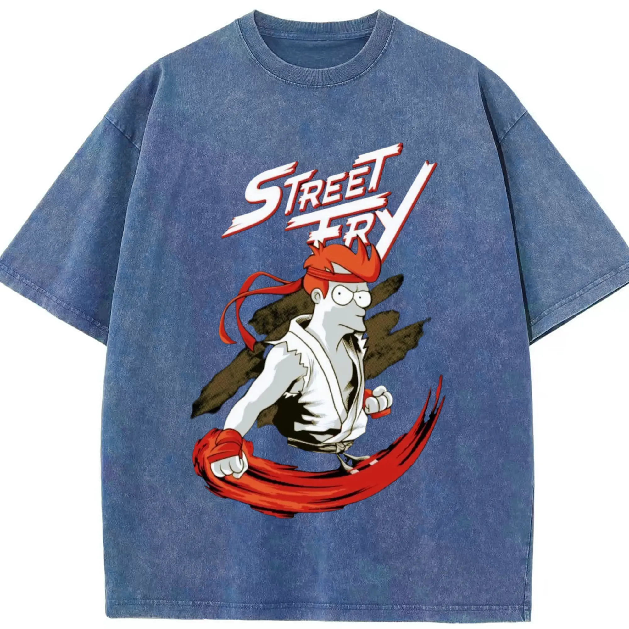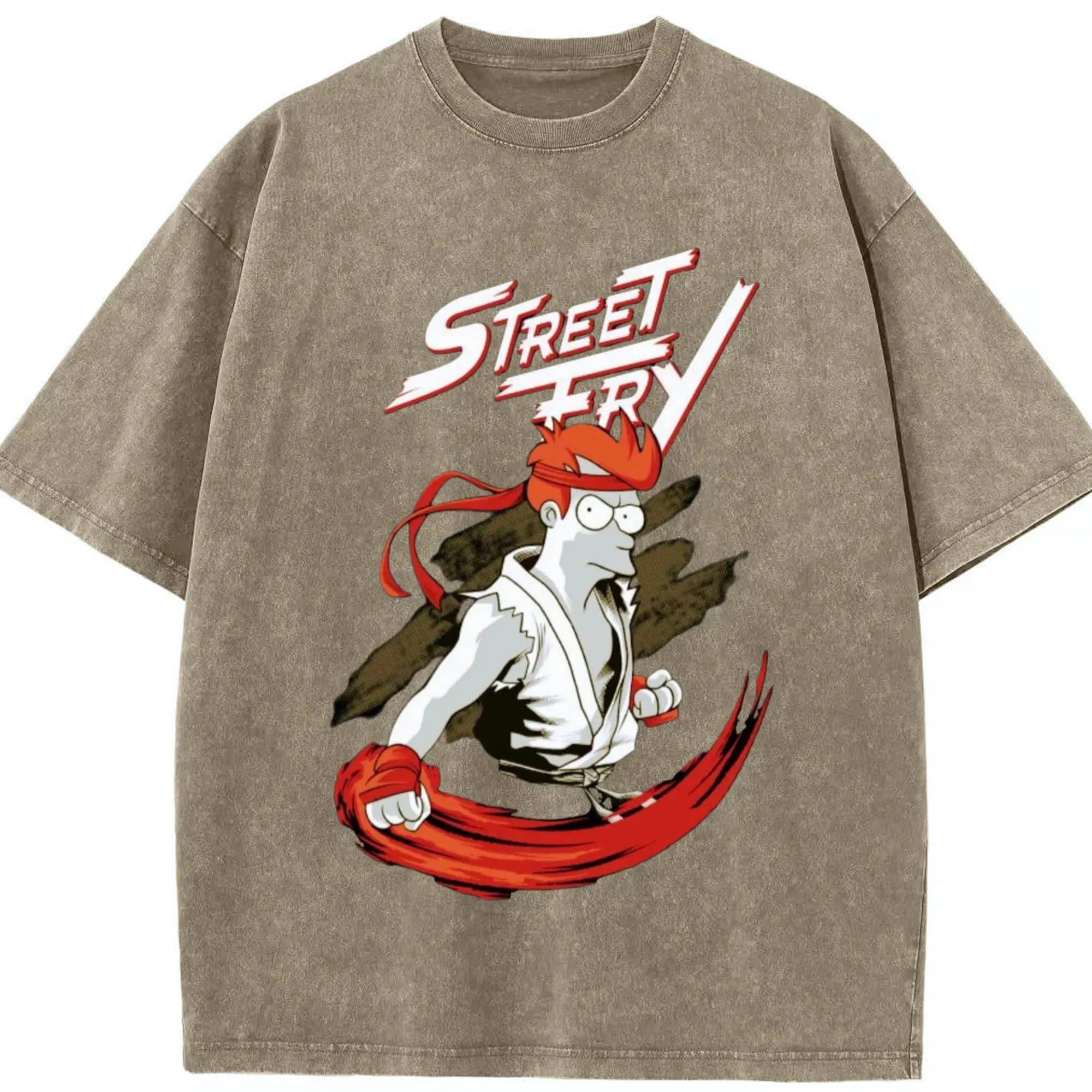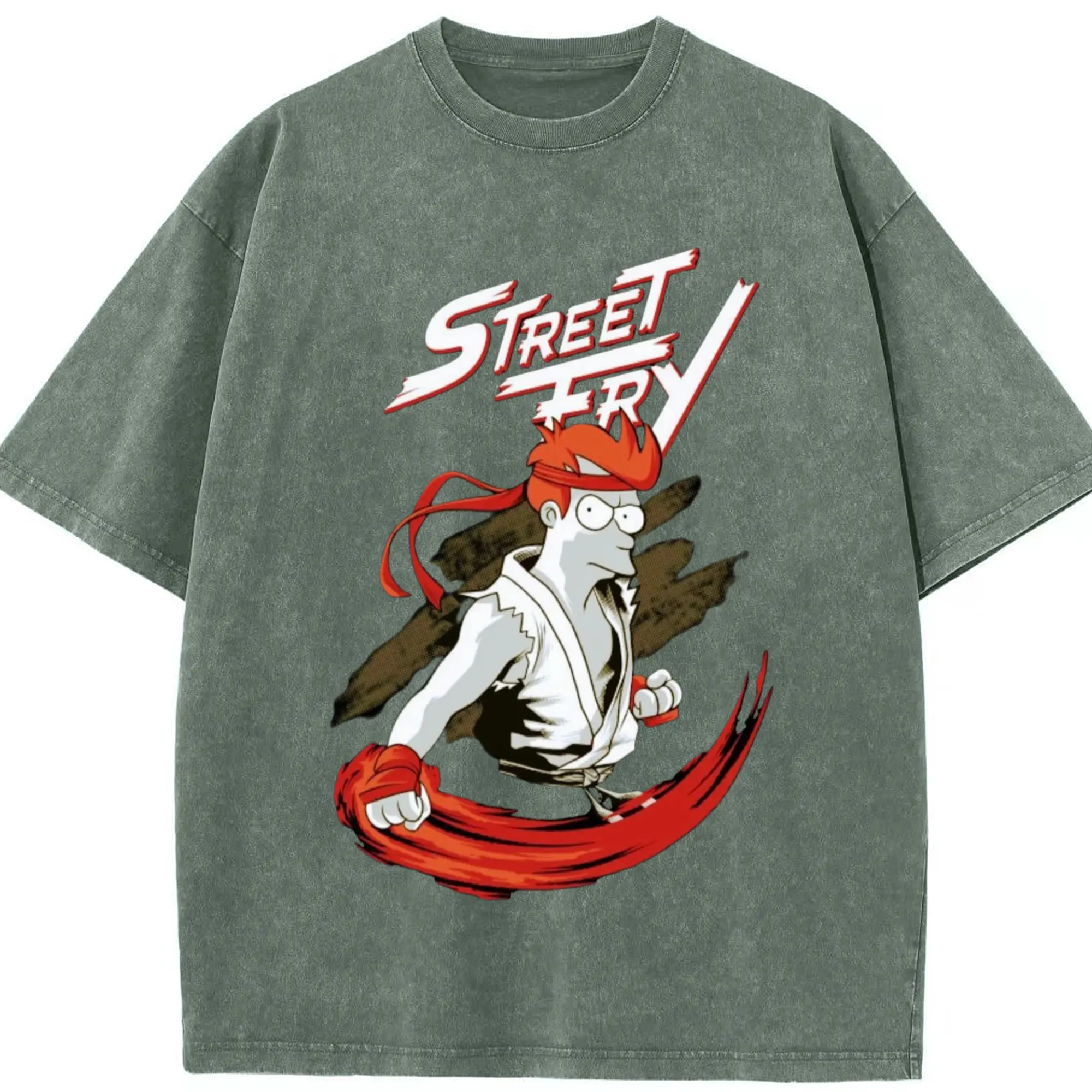 Philip j. fry street fight graphic tee - Washed Vintage Look 230g Cotton Oversized T-Shirt With Front Heat Transfer Print – Soft, Lightweight, Stylish Fit – Comfortable Casual Wear For Sports & Everyday Use