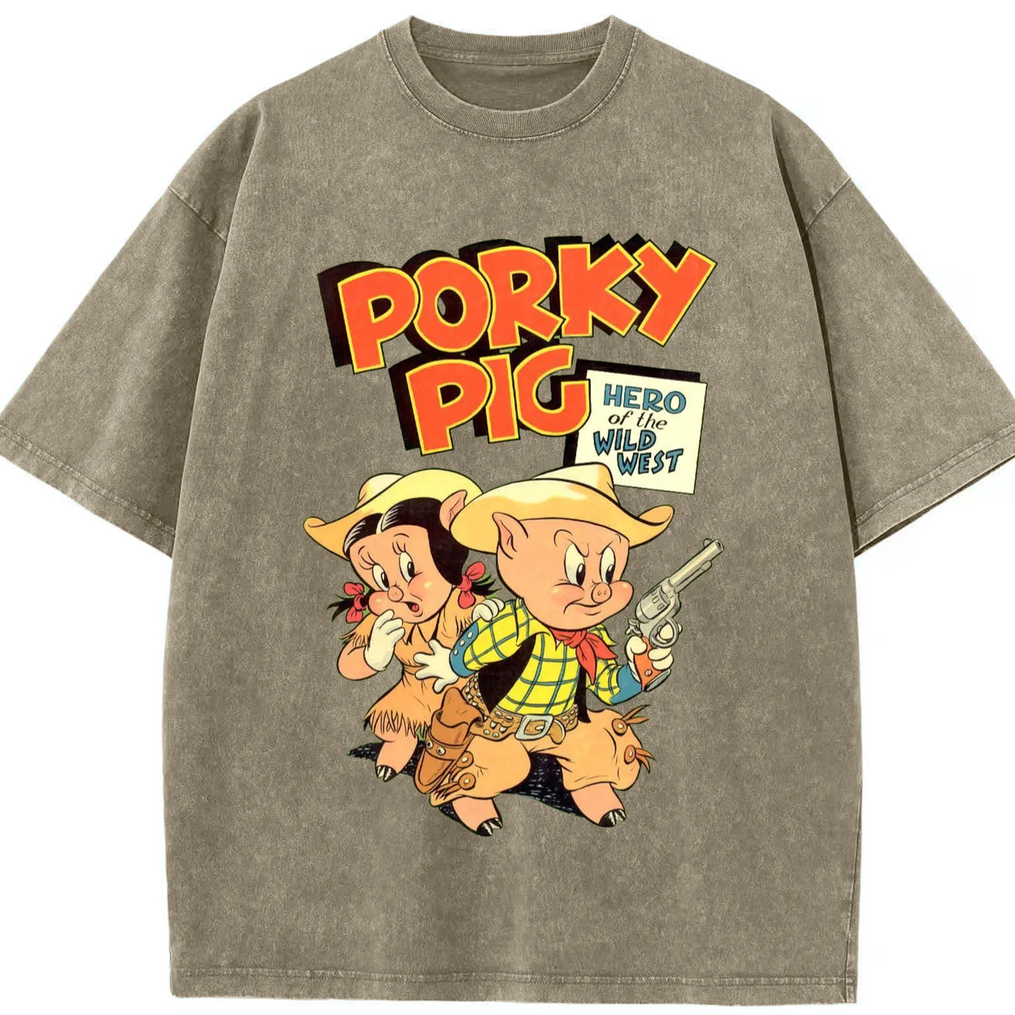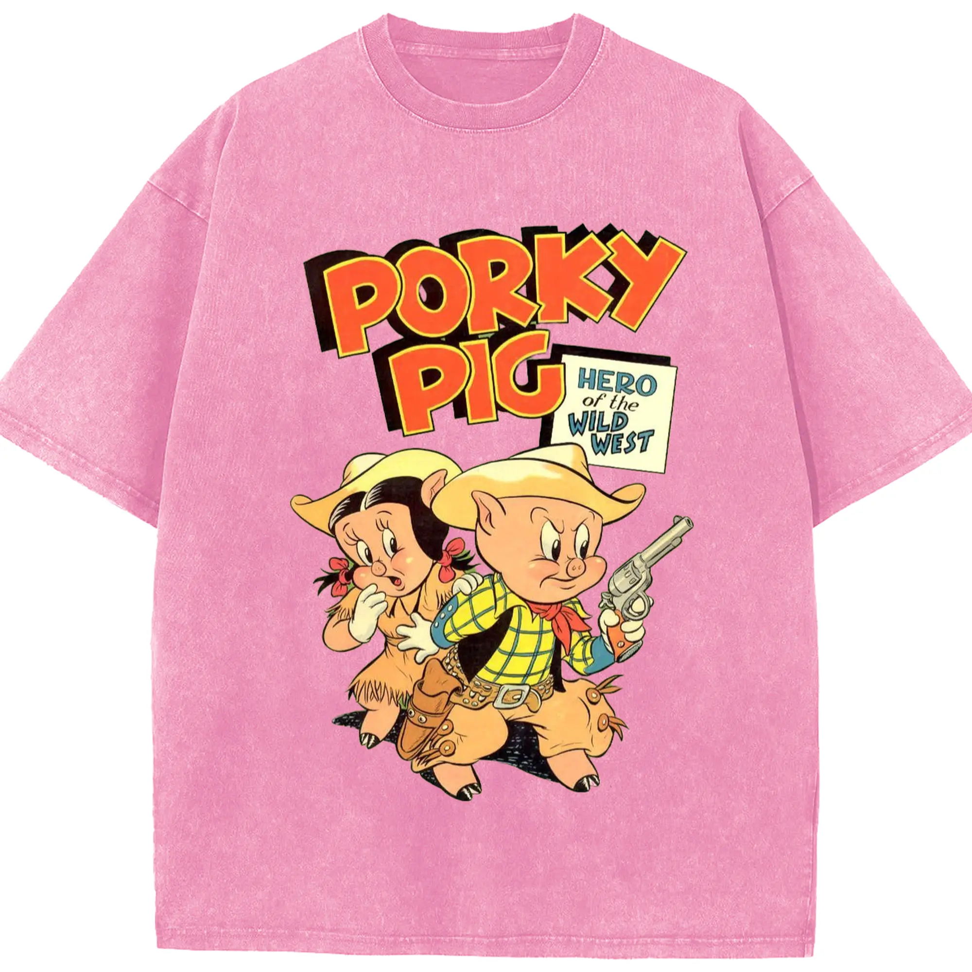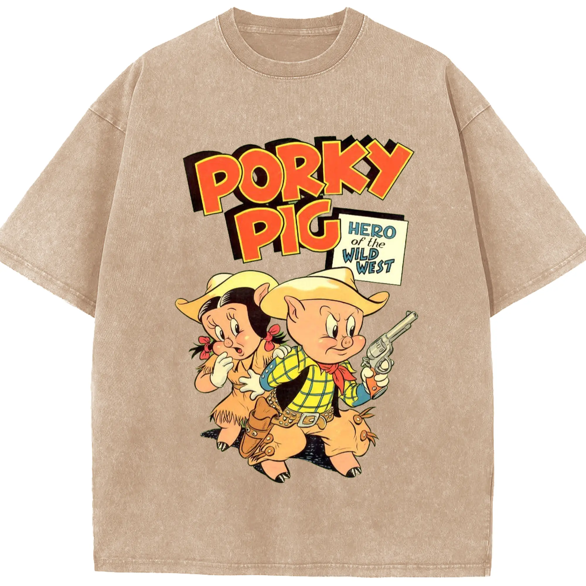 Porky Pig cowboy t-shirt - Washed Vintage Look 230g Cotton Oversized T-Shirt With Front Heat Transfer Print – Soft, Lightweight, Stylish Fit – Comfortable Casual Wear For Sports & Everyday Use