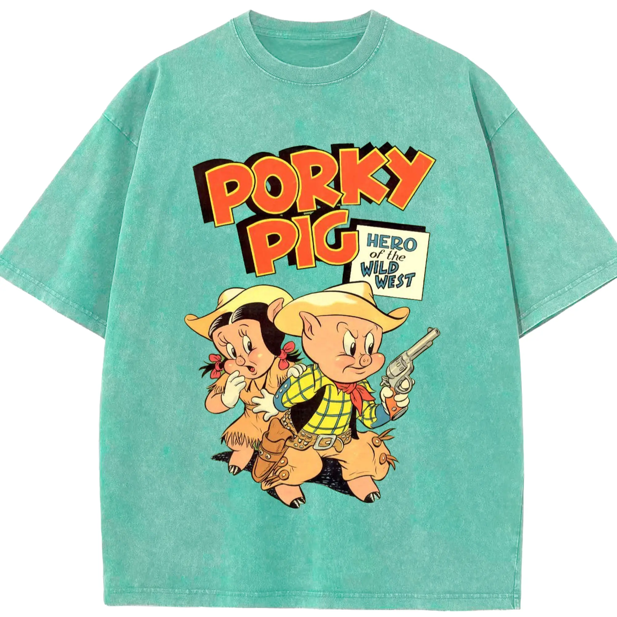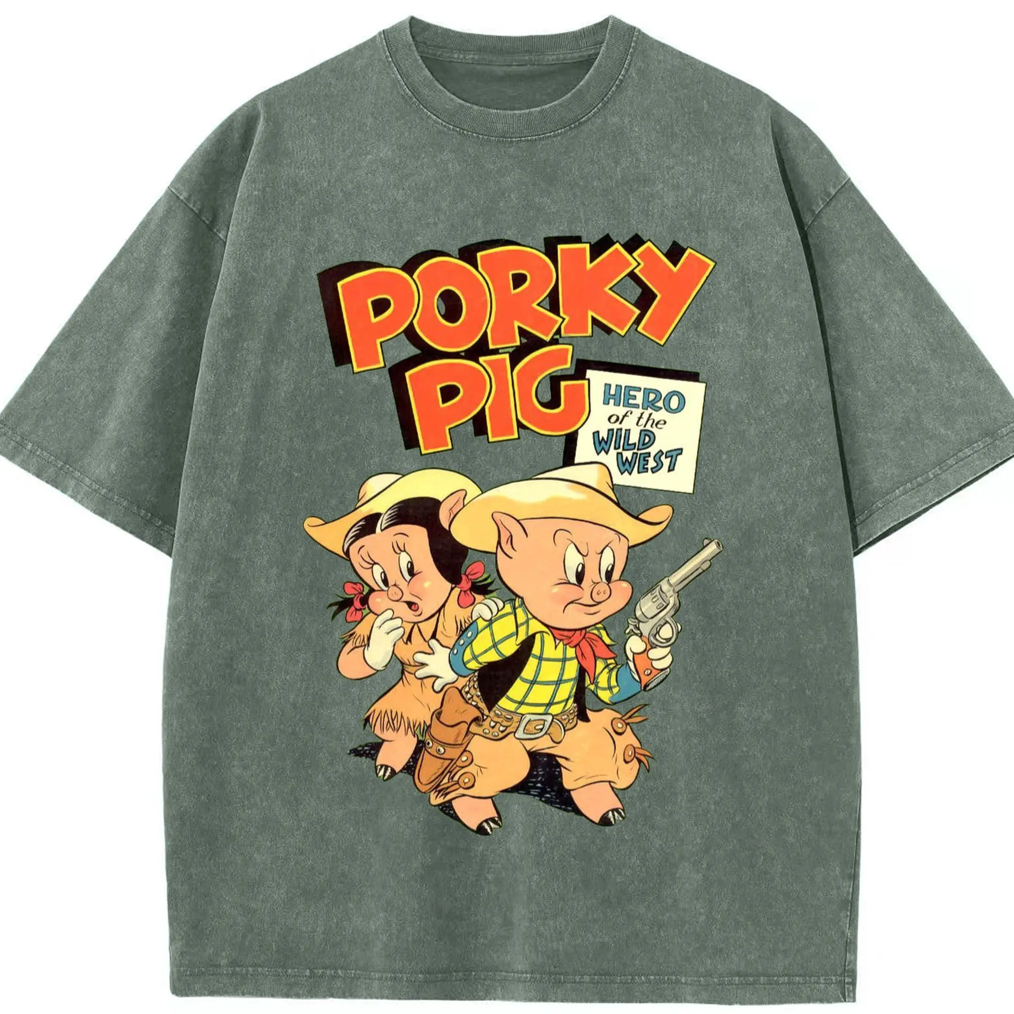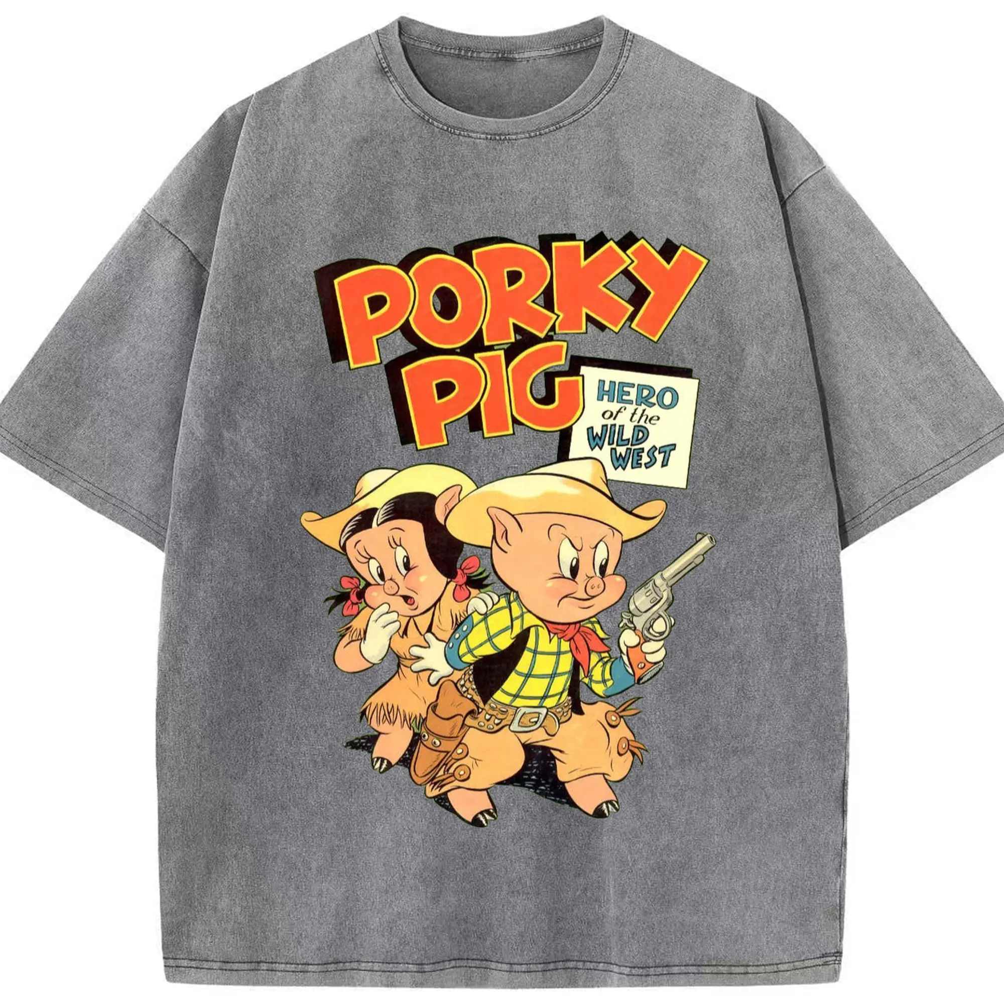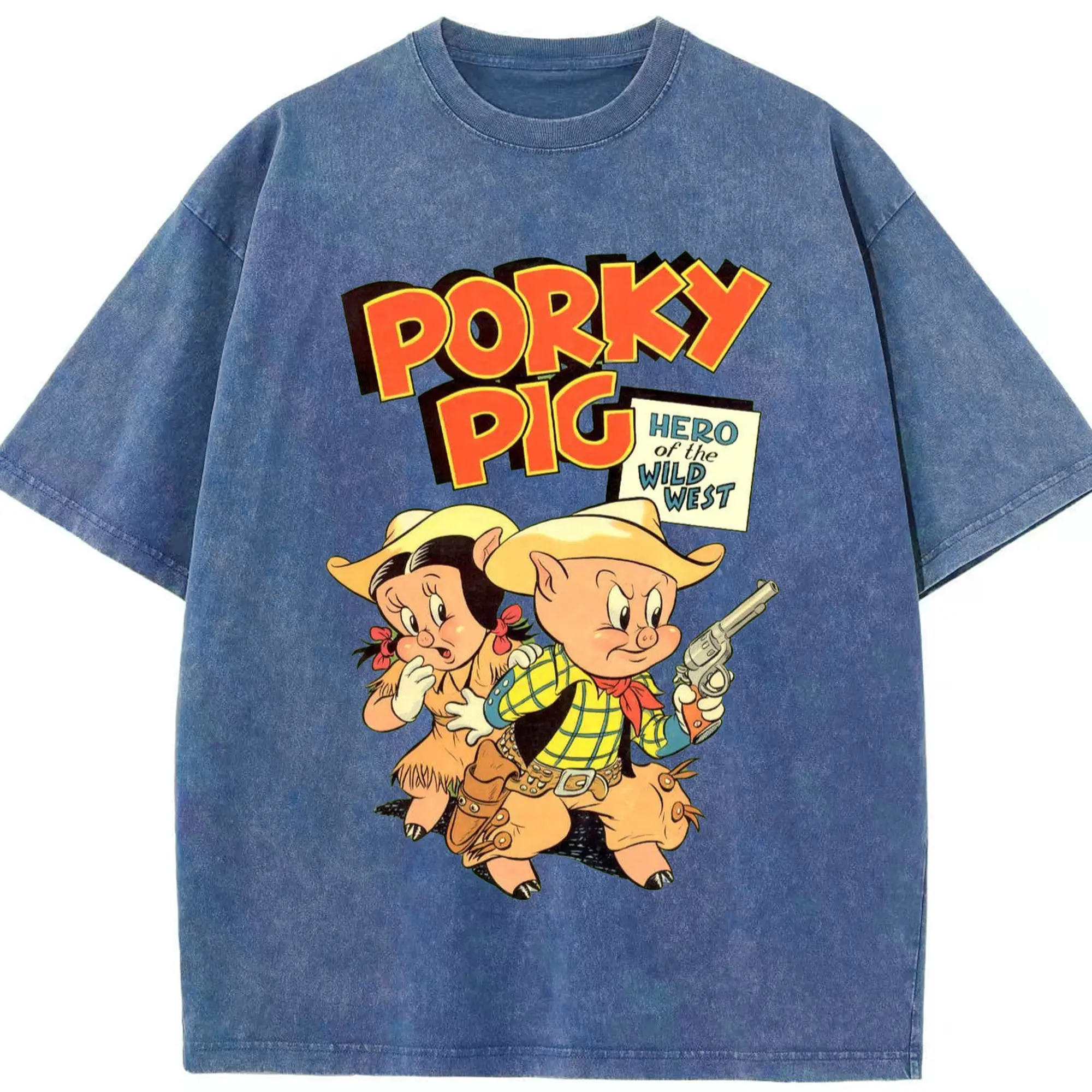 Porky Pig cowboy t-shirt - Washed Vintage Look 230g Cotton Oversized T-Shirt With Front Heat Transfer Print – Soft, Lightweight, Stylish Fit – Comfortable Casual Wear For Sports & Everyday Use
