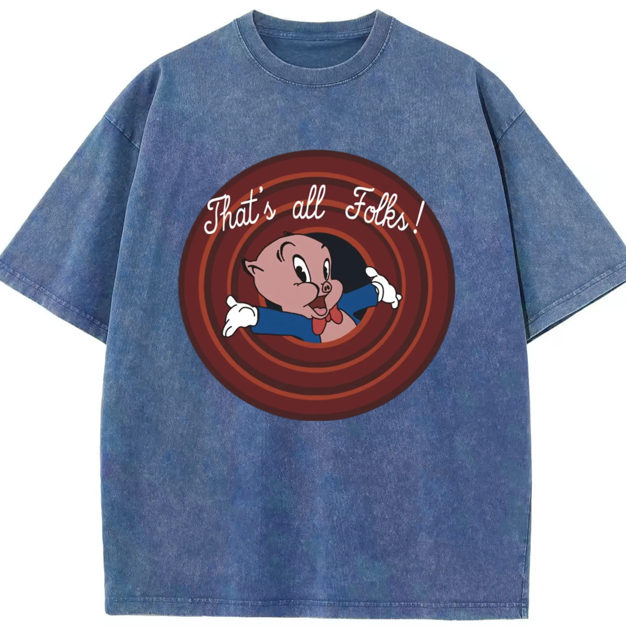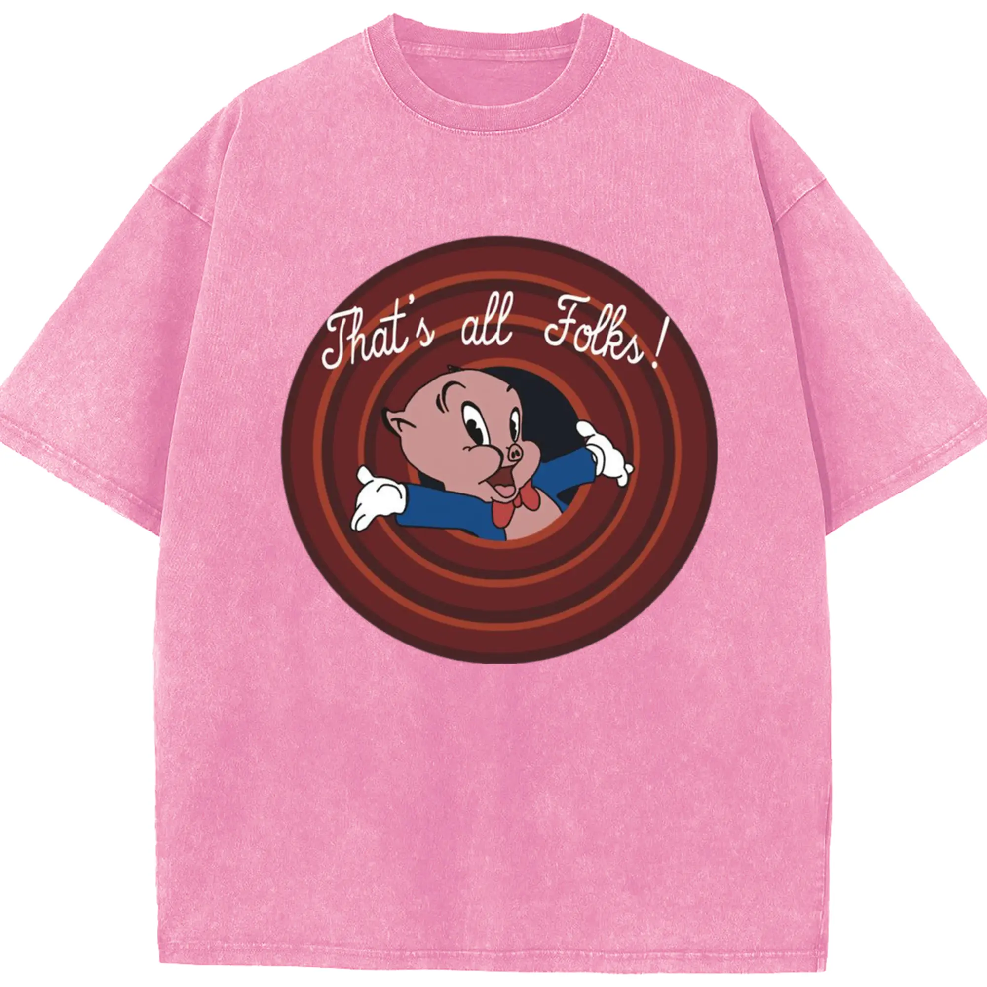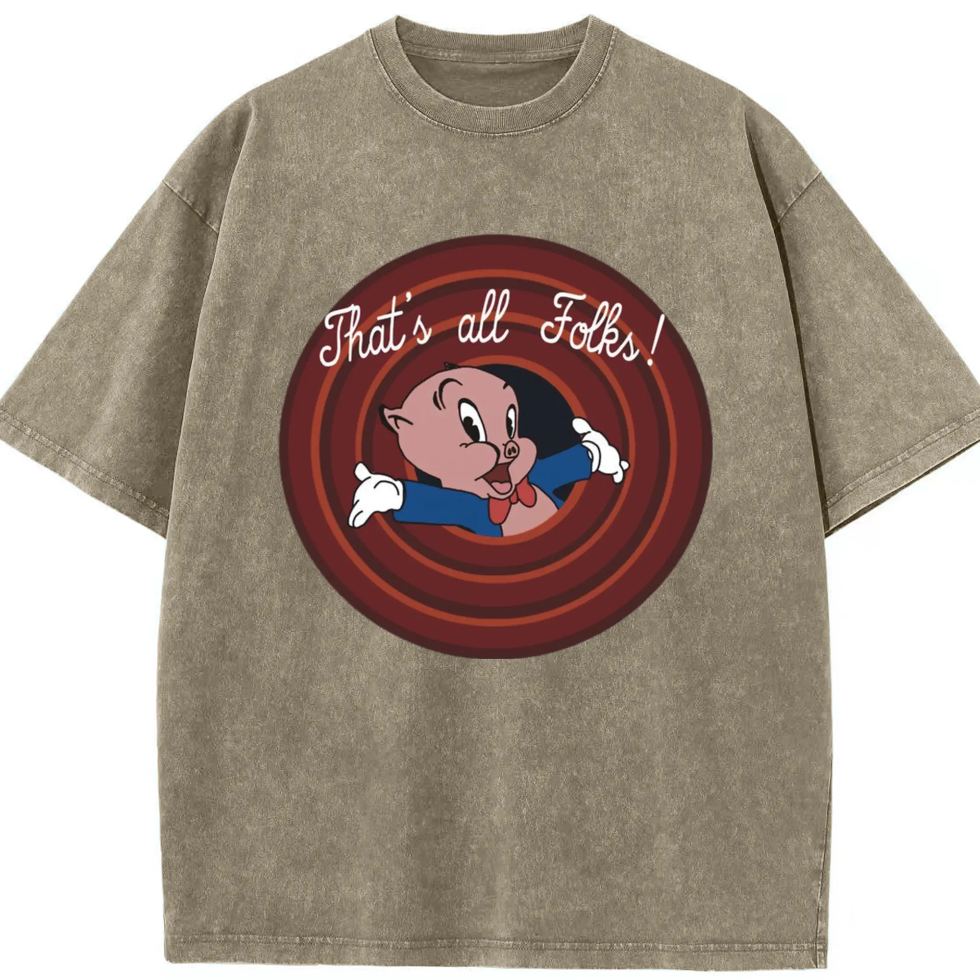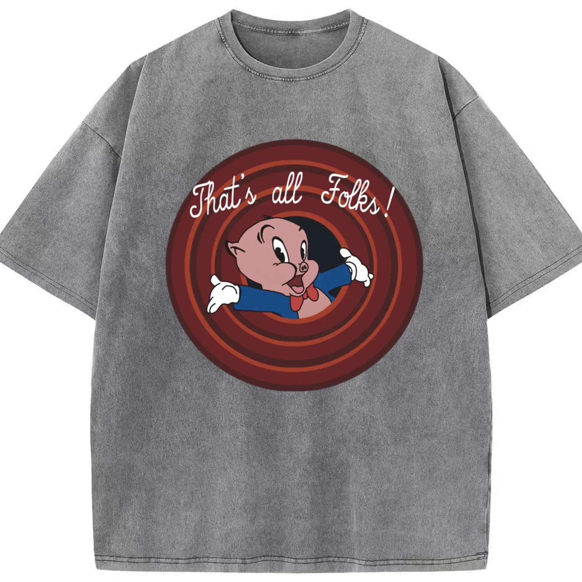Porky Pig face tee - Washed Vintage Look 230g Cotton Oversized T-Shirt With Front Heat Transfer Print – Soft, Lightweight, Stylish Fit – Comfortable Casual Wear For Sports & Everyday Use