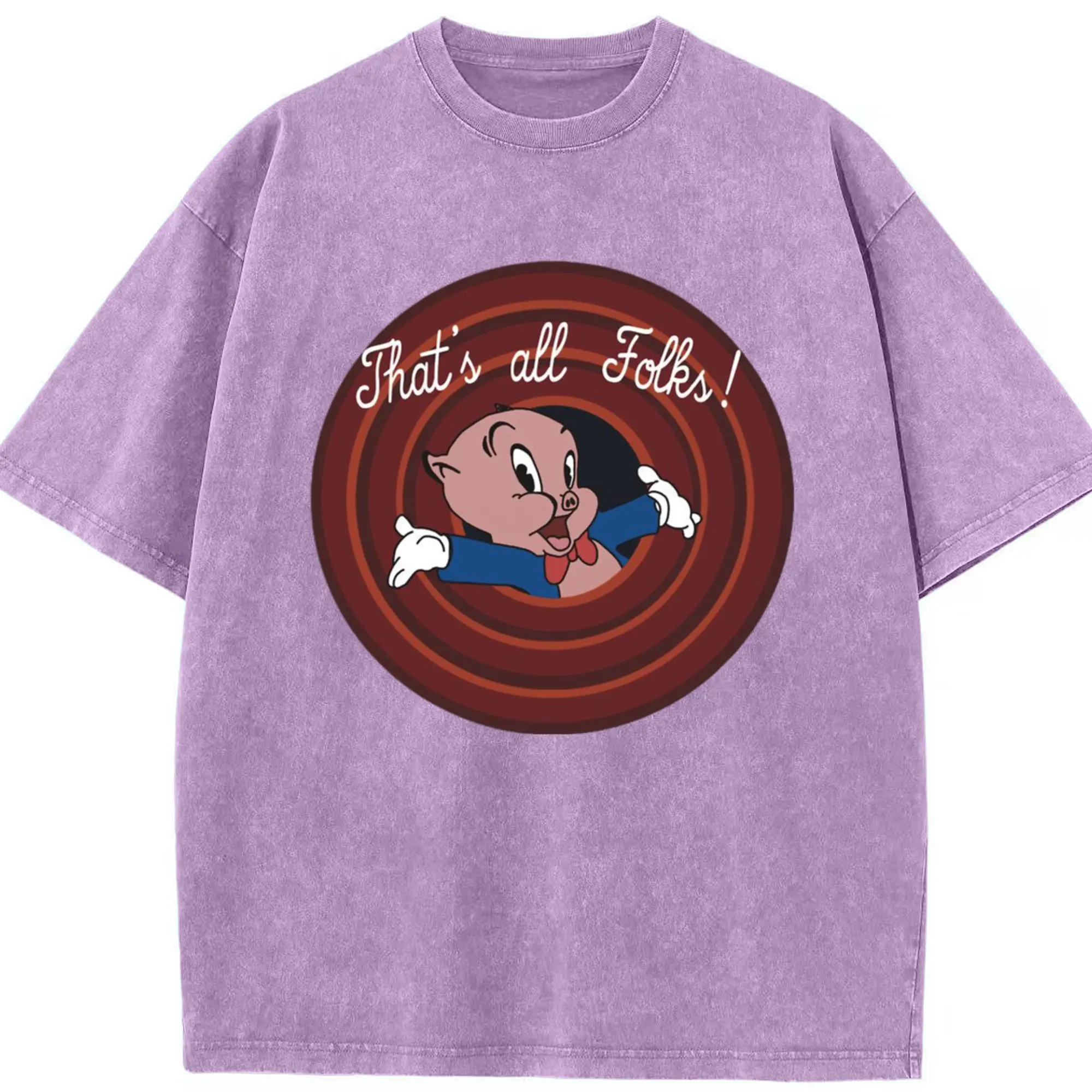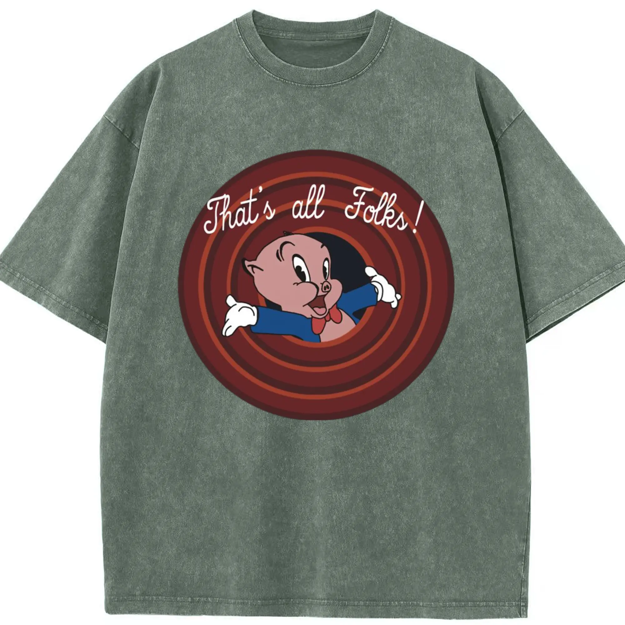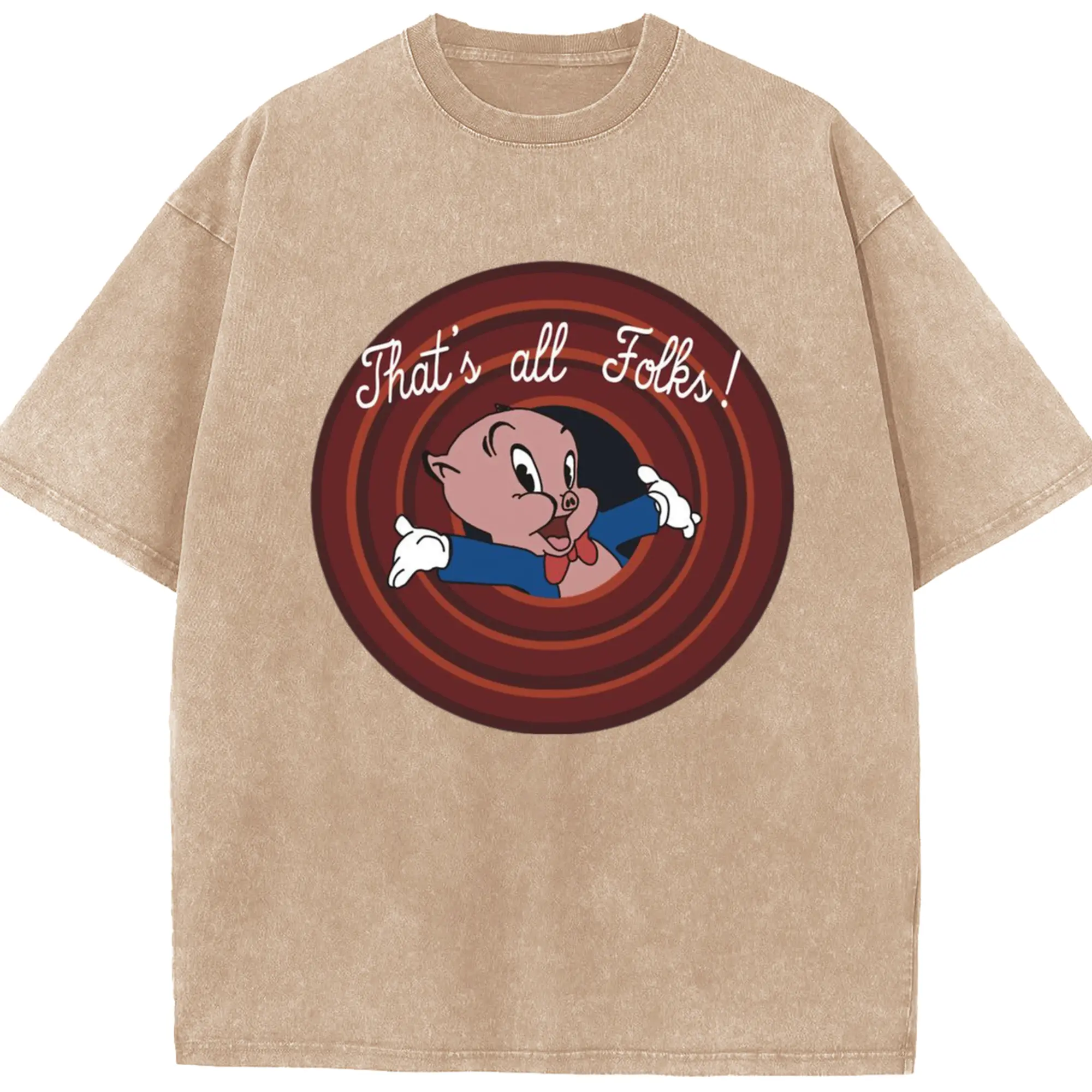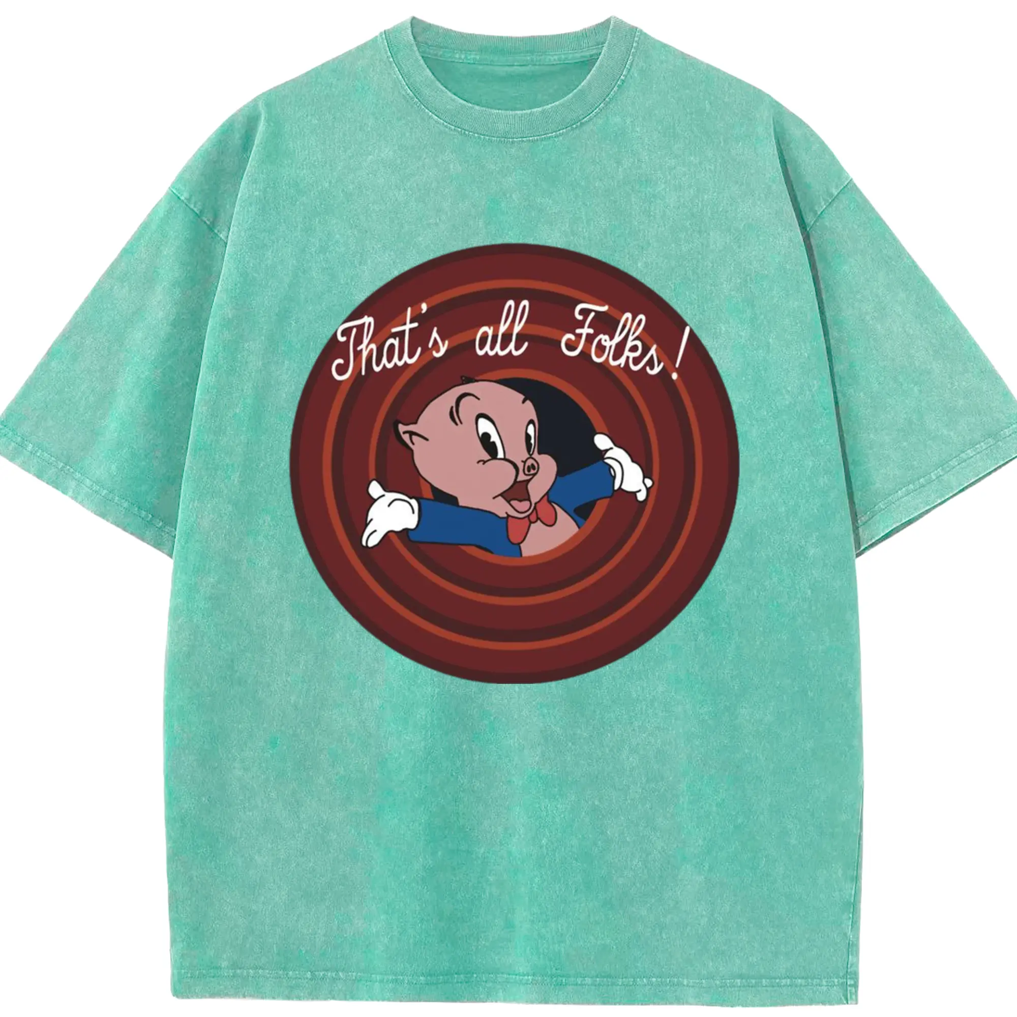 Porky Pig face tee - Washed Vintage Look 230g Cotton Oversized T-Shirt With Front Heat Transfer Print – Soft, Lightweight, Stylish Fit – Comfortable Casual Wear For Sports & Everyday Use