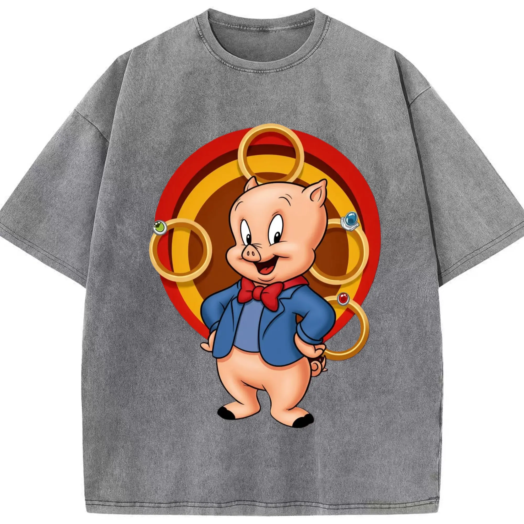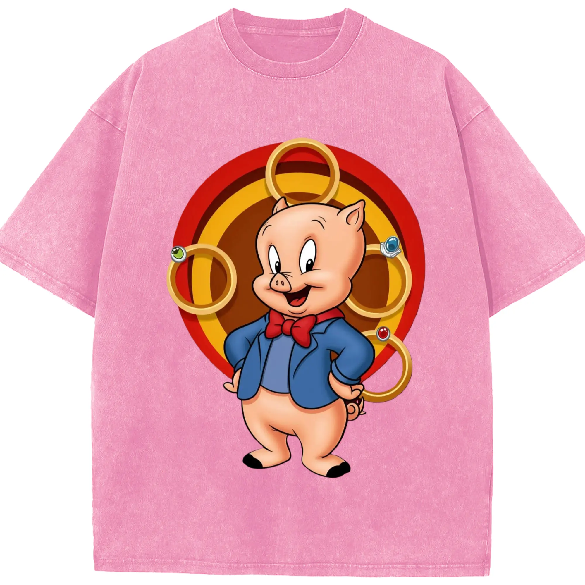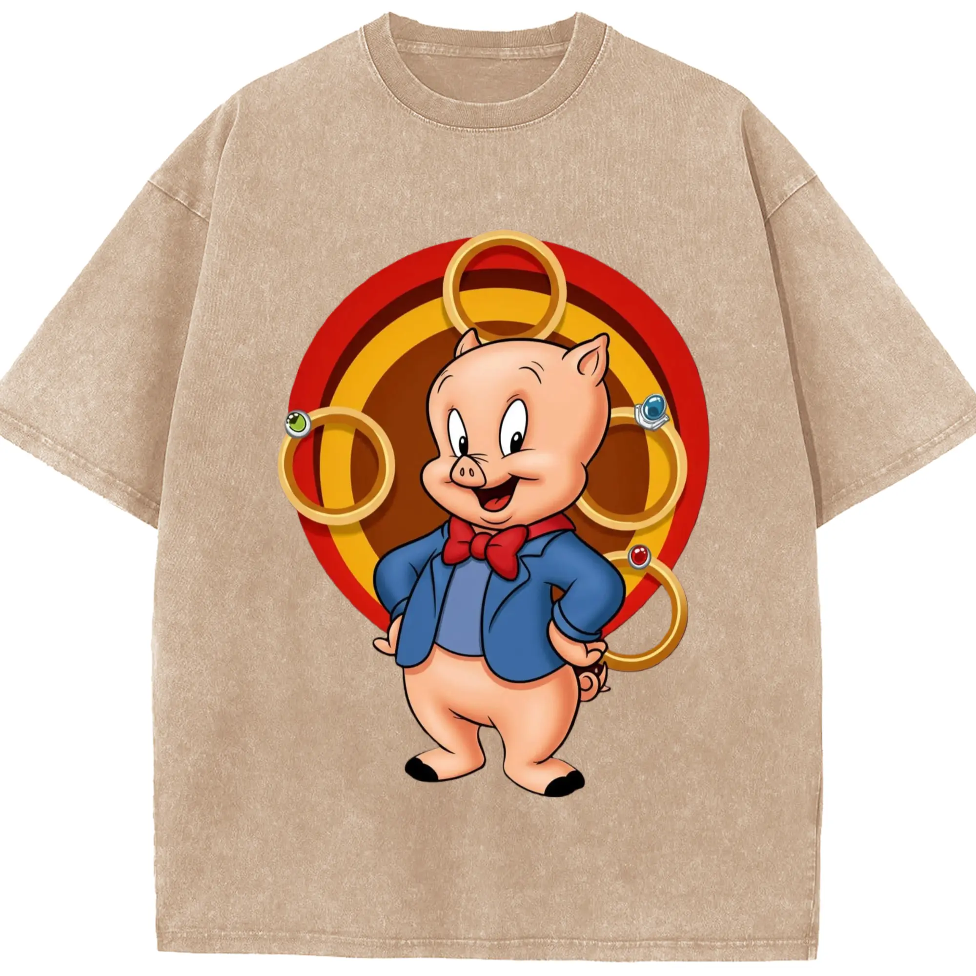 Porky Pig graphic shirt - Washed Vintage Look 230g Cotton Oversized T-Shirt With Front Heat Transfer Print – Soft, Lightweight, Stylish Fit – Comfortable Casual Wear For Sports & Everyday Use
