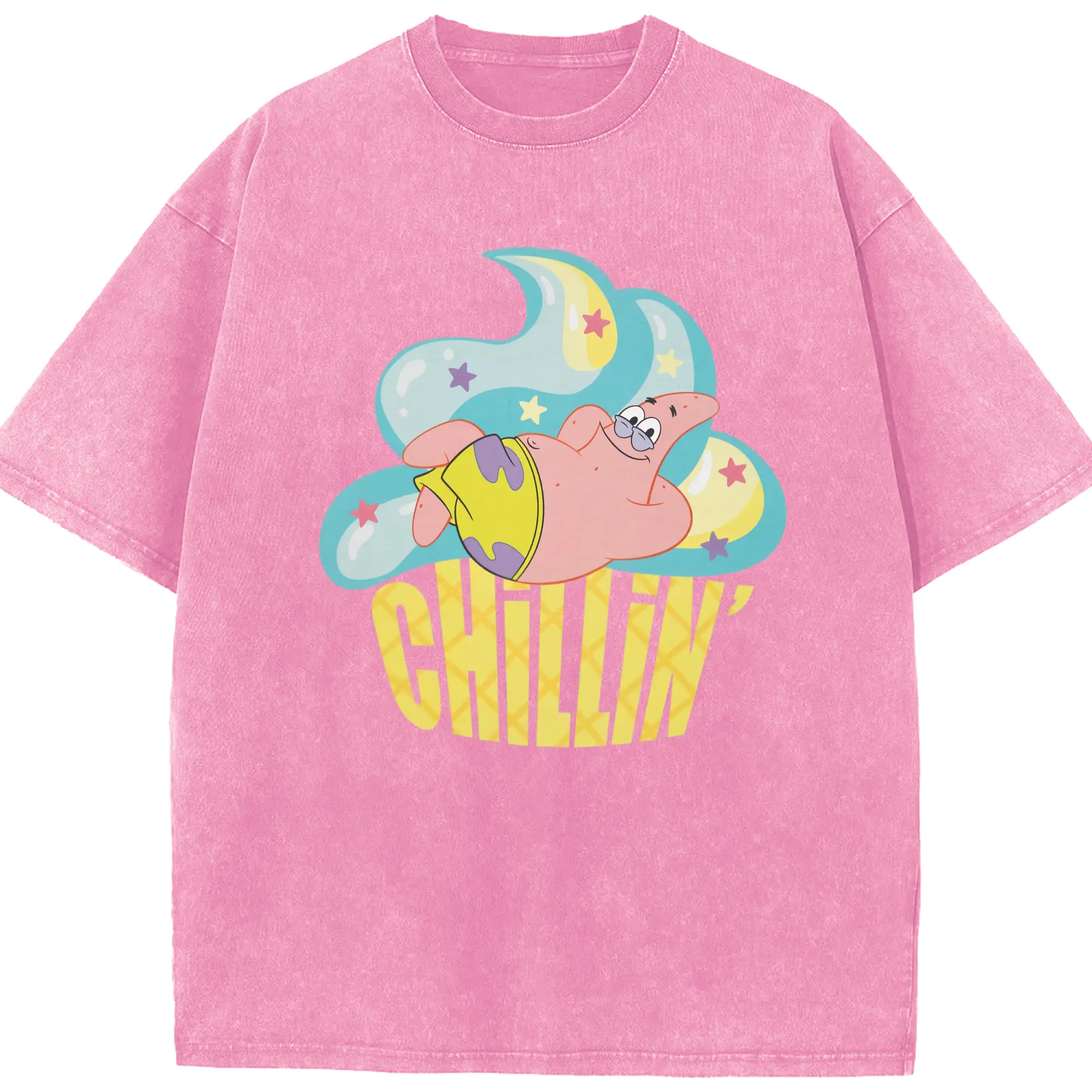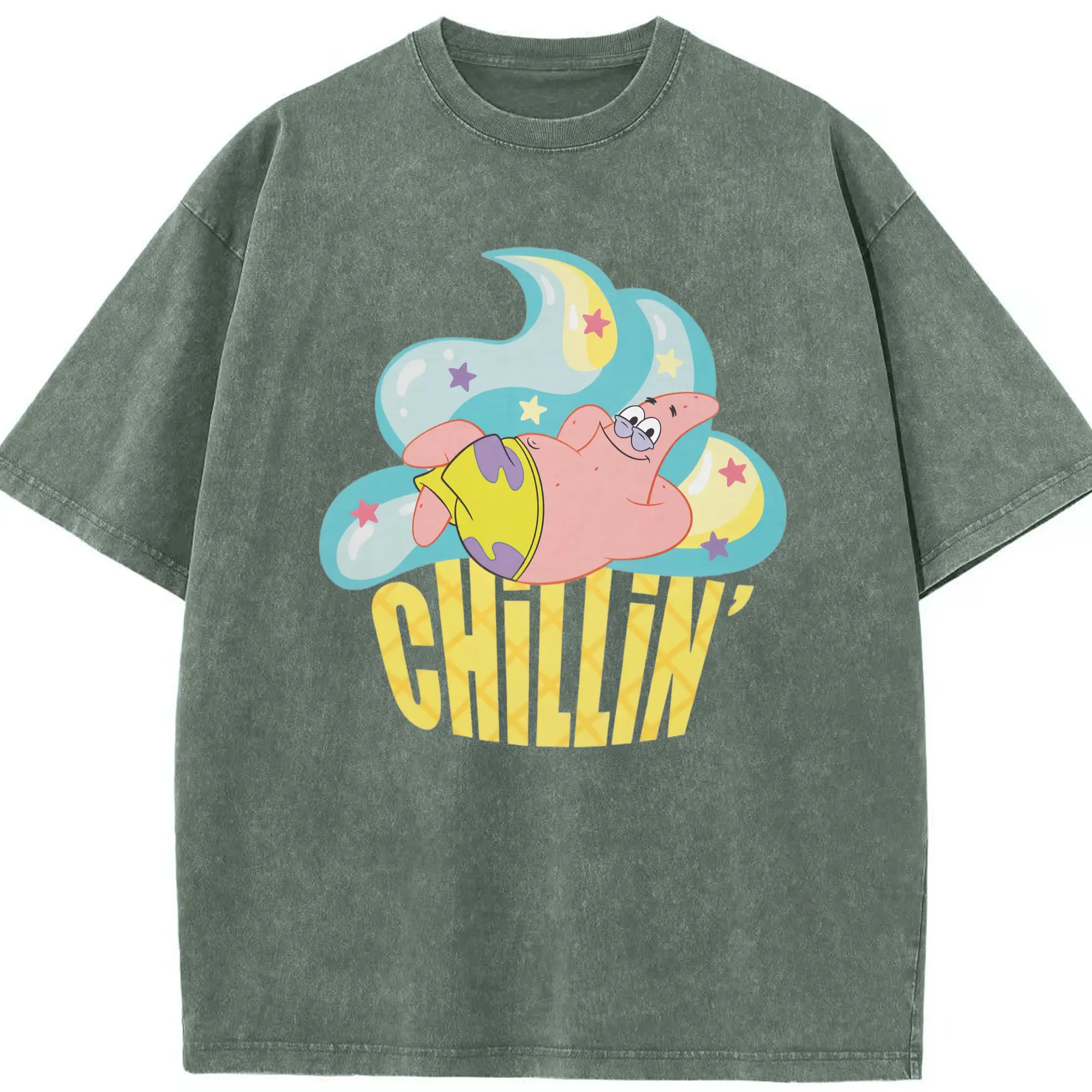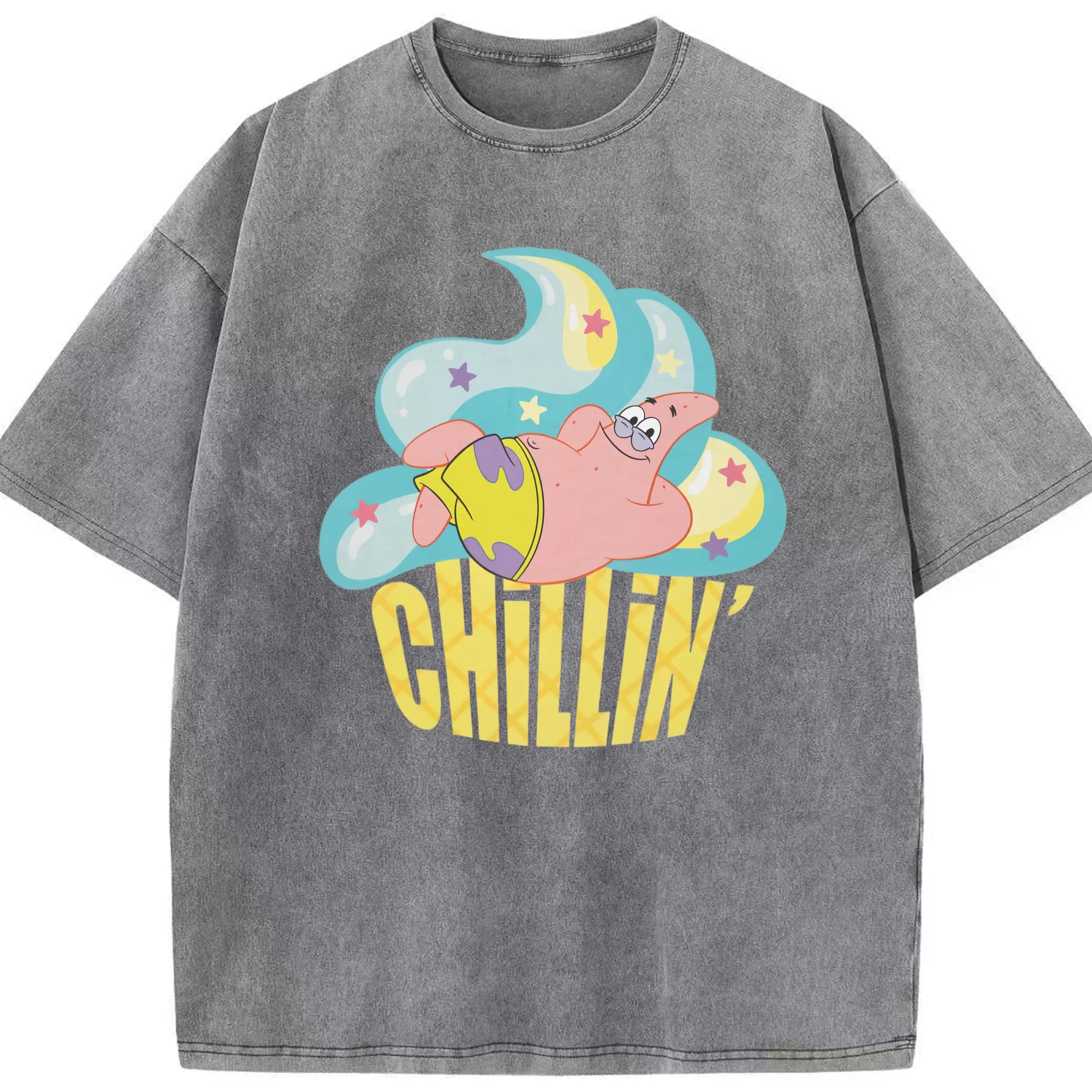 Spongebob Patrick Star chillin Graphic Tee - Washed Vintage Look 230g Cotton Oversized T-Shirt With Front Heat Transfer Print – Soft, Lightweight, Stylish Fit – Comfortable Casual Wear For Sports & Everyday Use