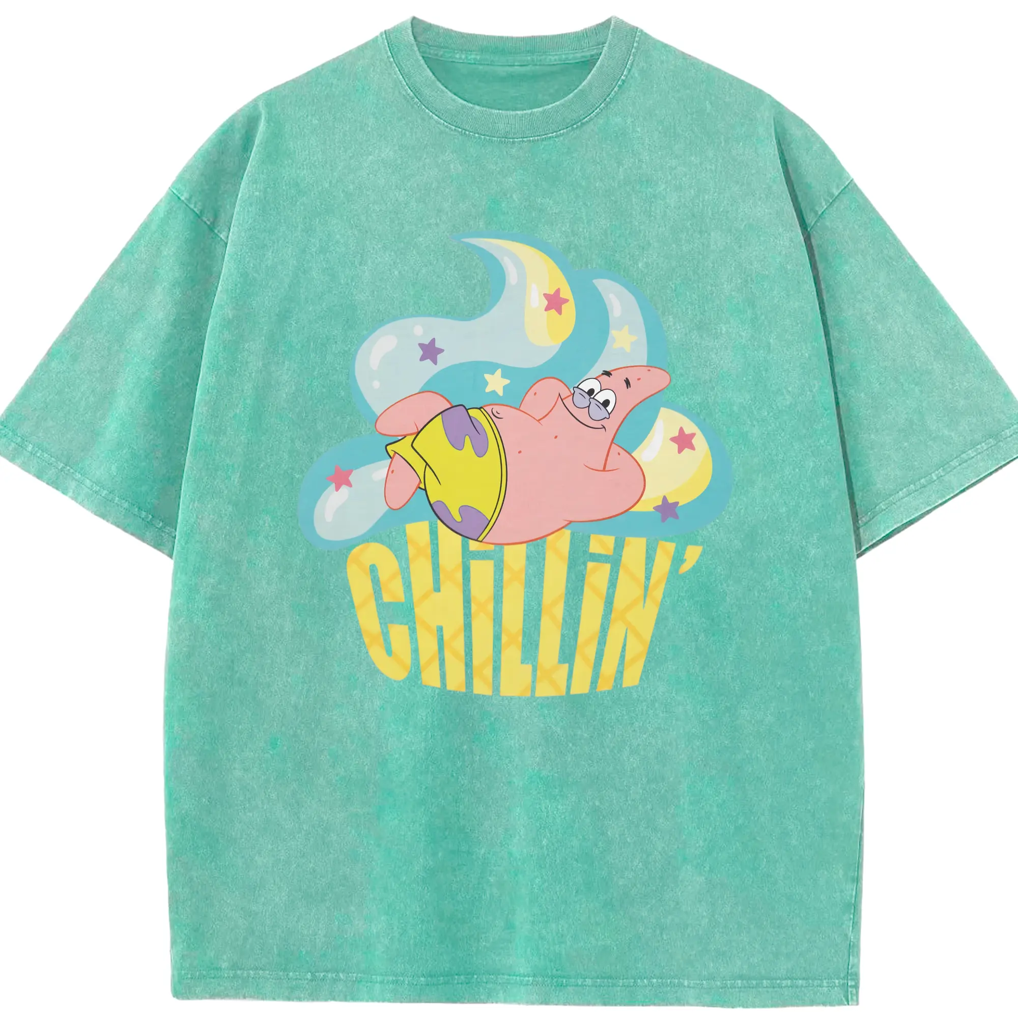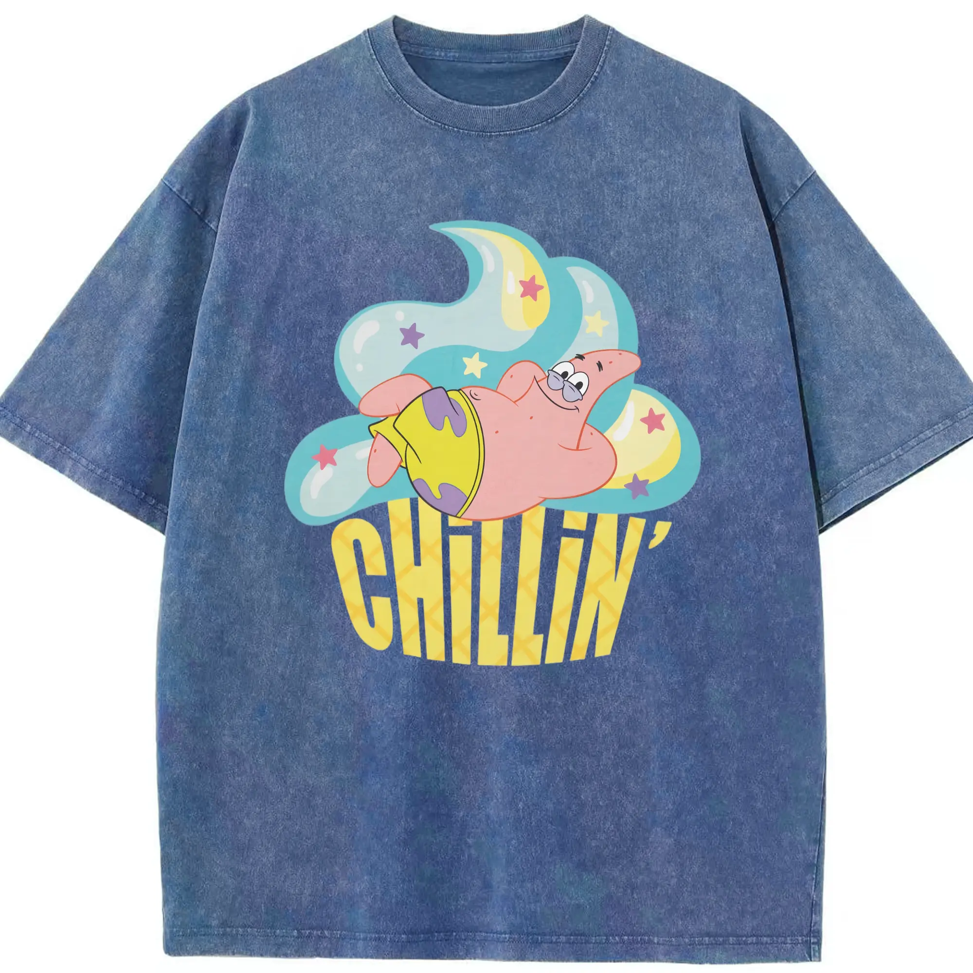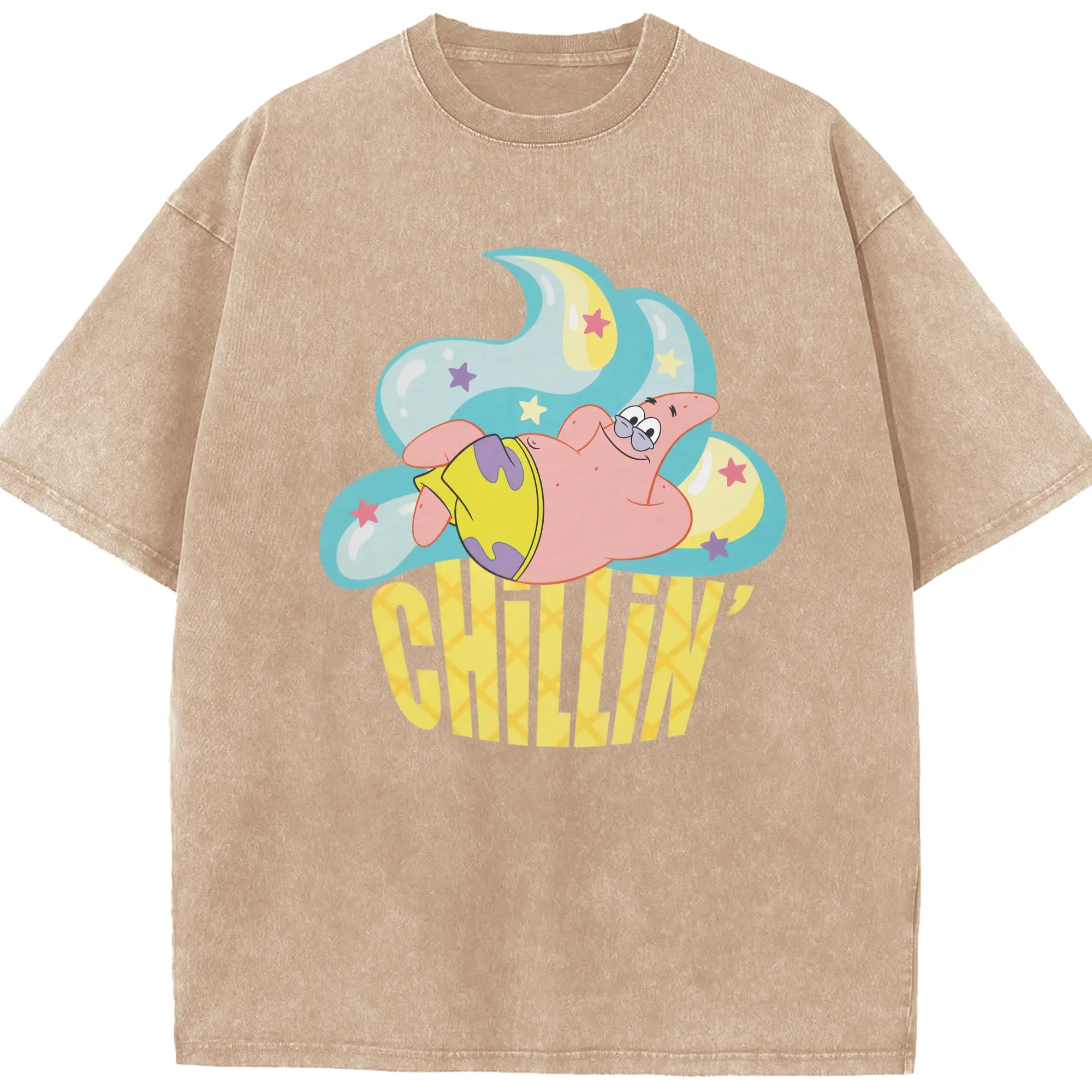 Spongebob Patrick Star chillin Graphic Tee - Washed Vintage Look 230g Cotton Oversized T-Shirt With Front Heat Transfer Print – Soft, Lightweight, Stylish Fit – Comfortable Casual Wear For Sports & Everyday Use
