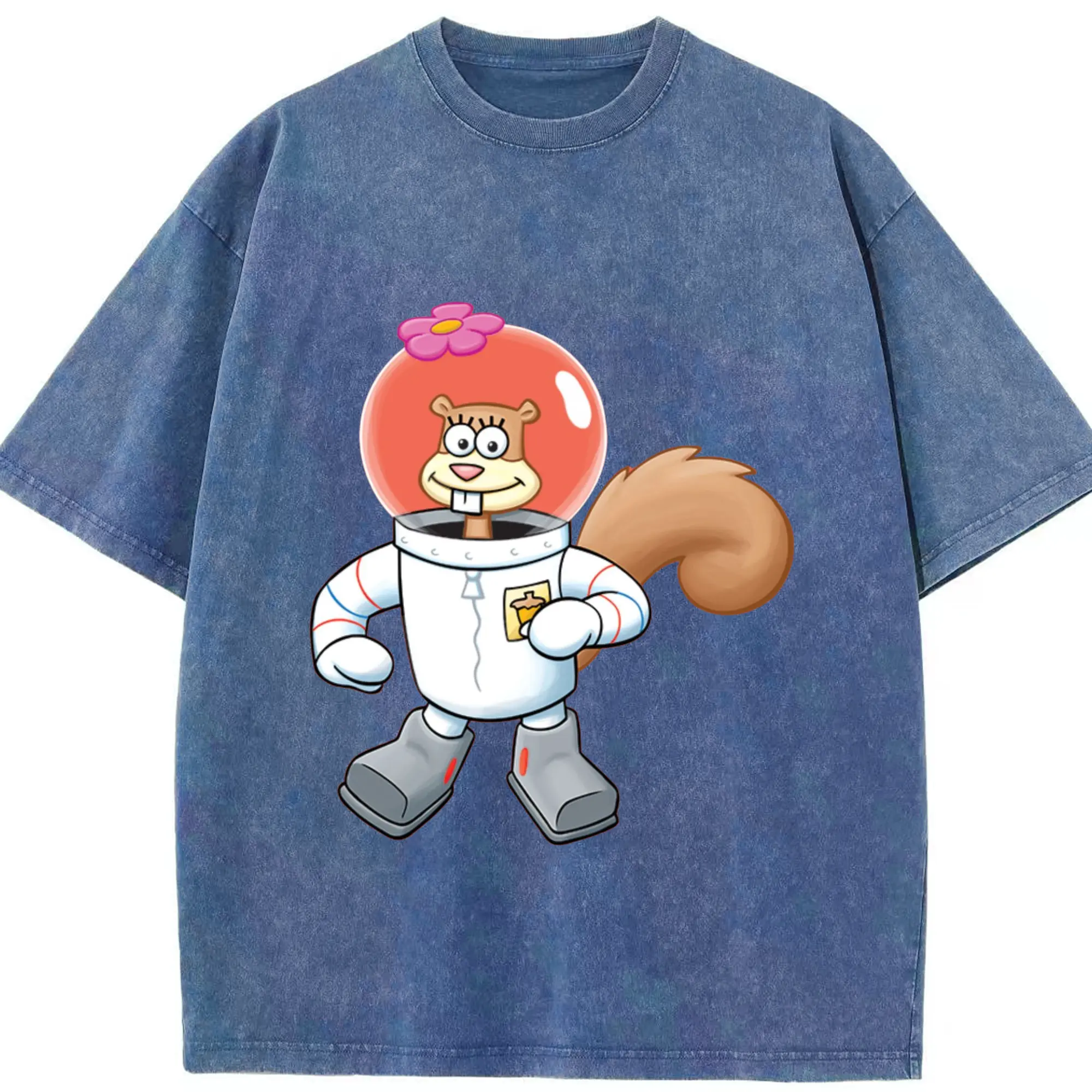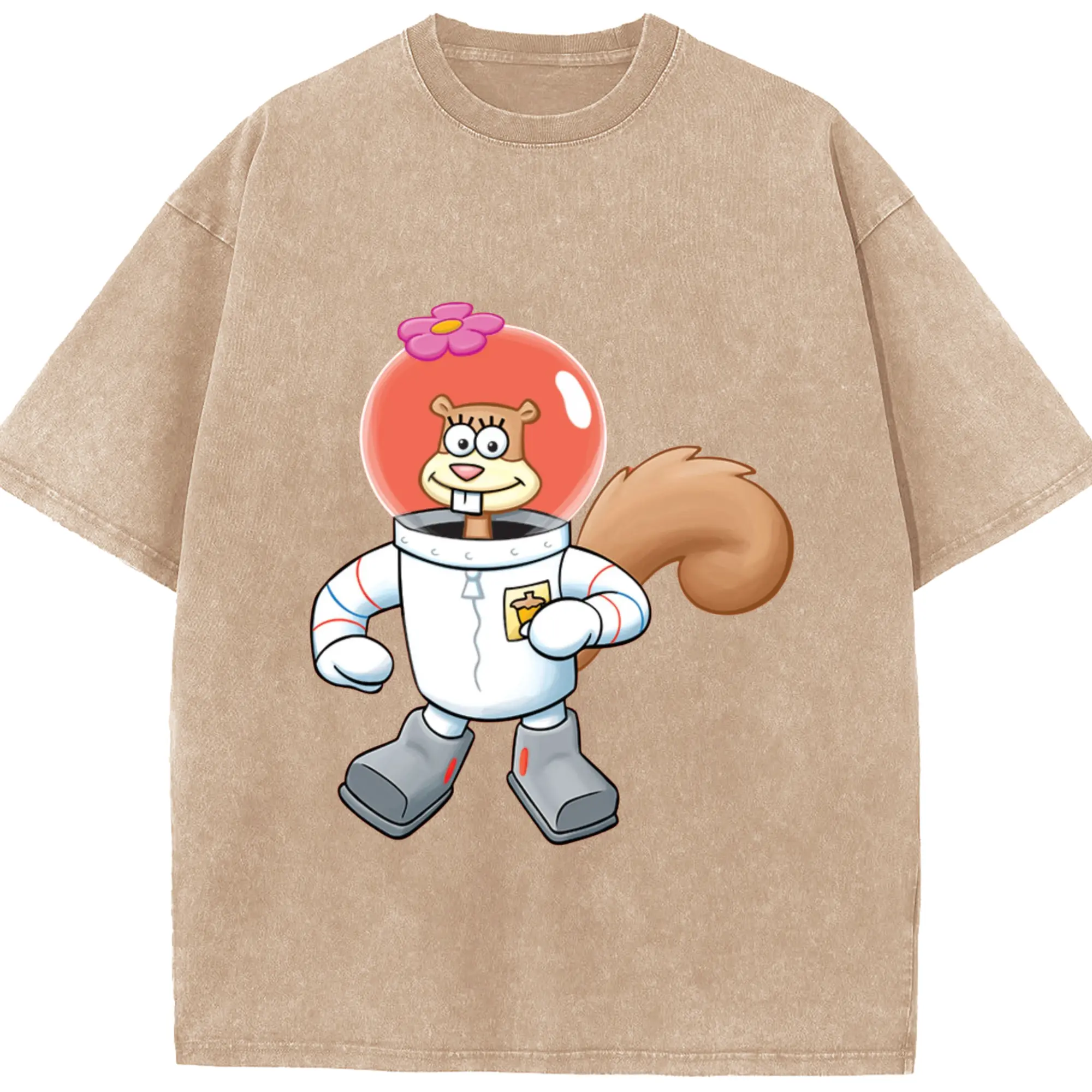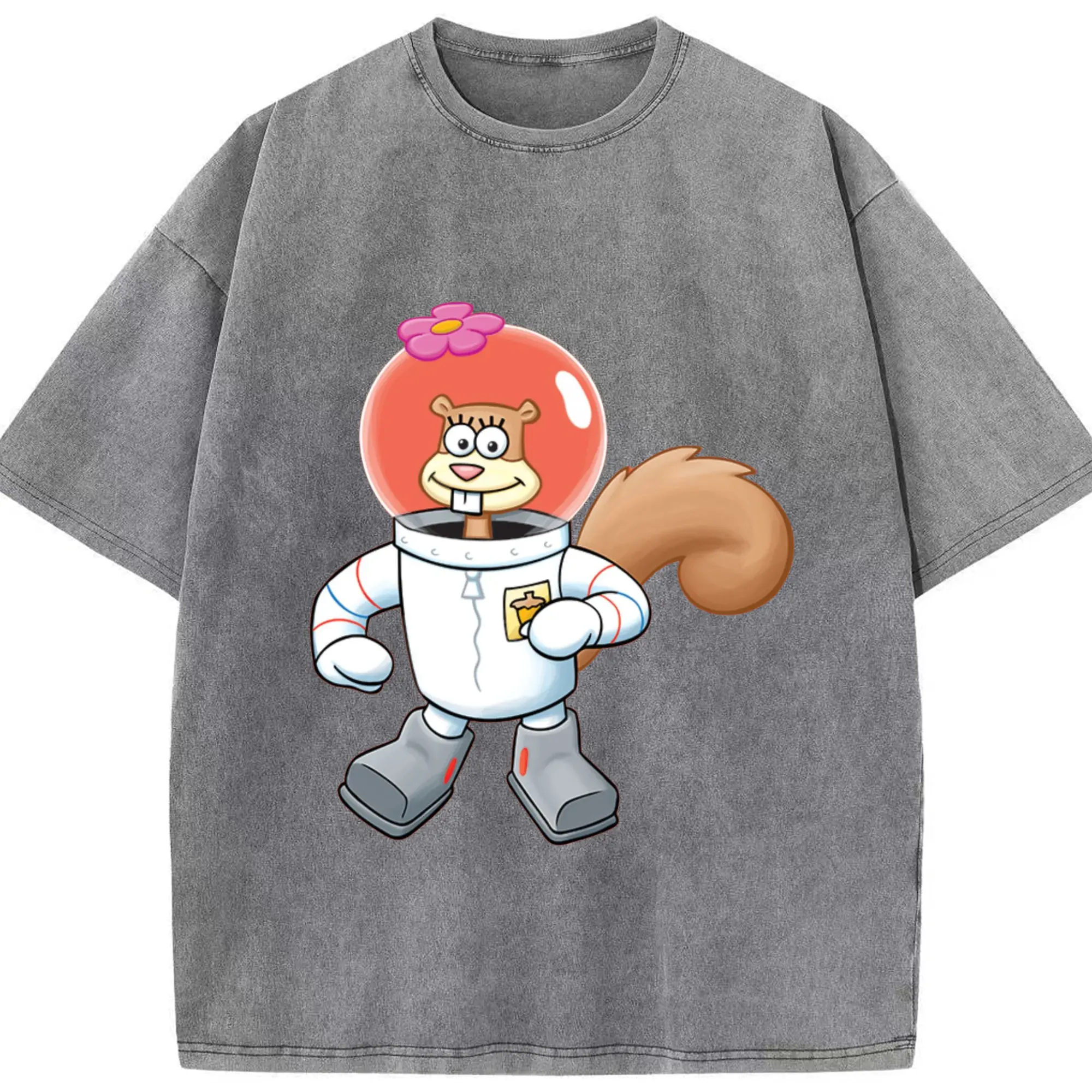 SpongeBob Sandy Cheeks cartoon t-shirt - Washed Vintage Look 230g Cotton Oversized T-Shirt With Front Heat Transfer Print – Soft, Lightweight, Stylish Fit – Comfortable Casual Wear For Sports & Everyday Use