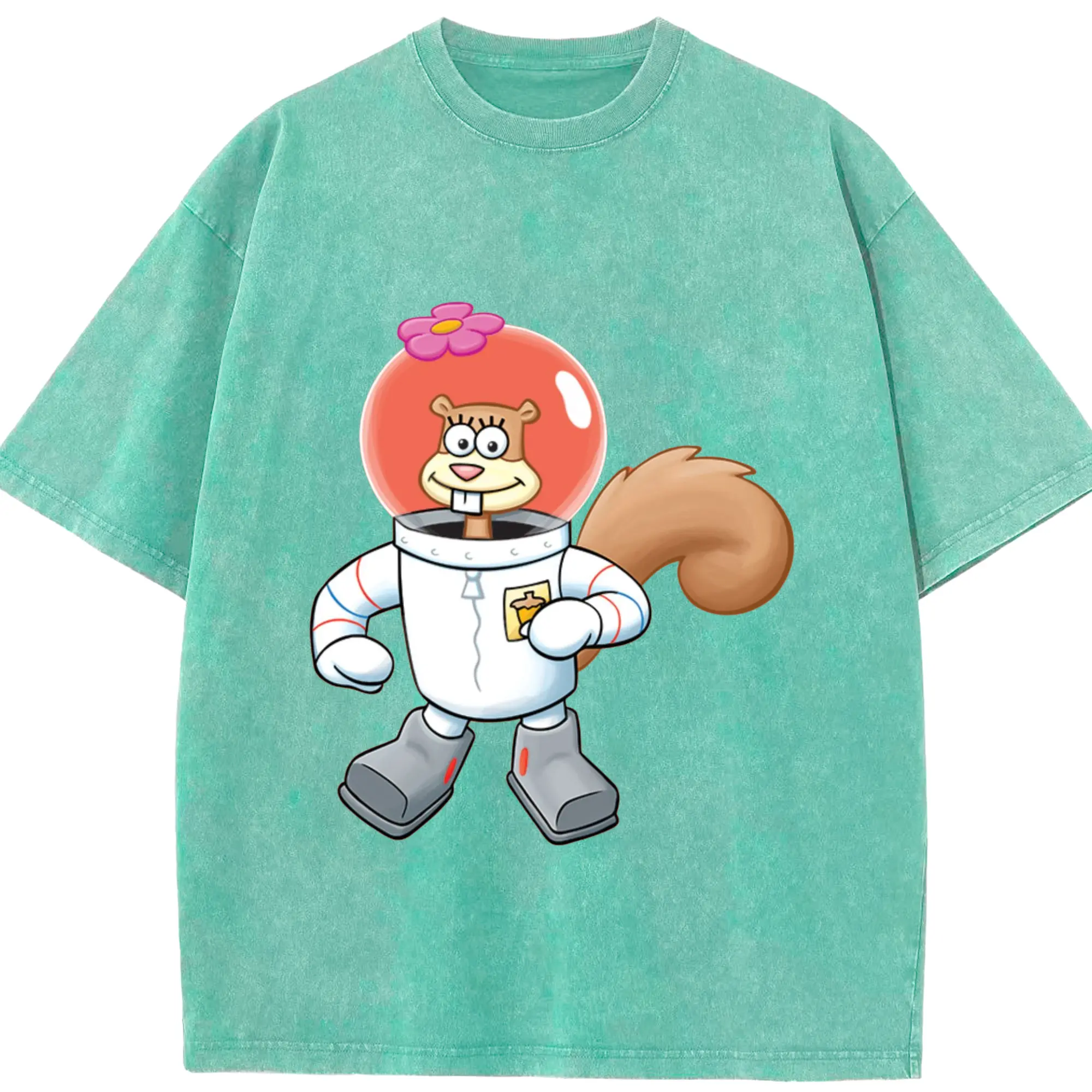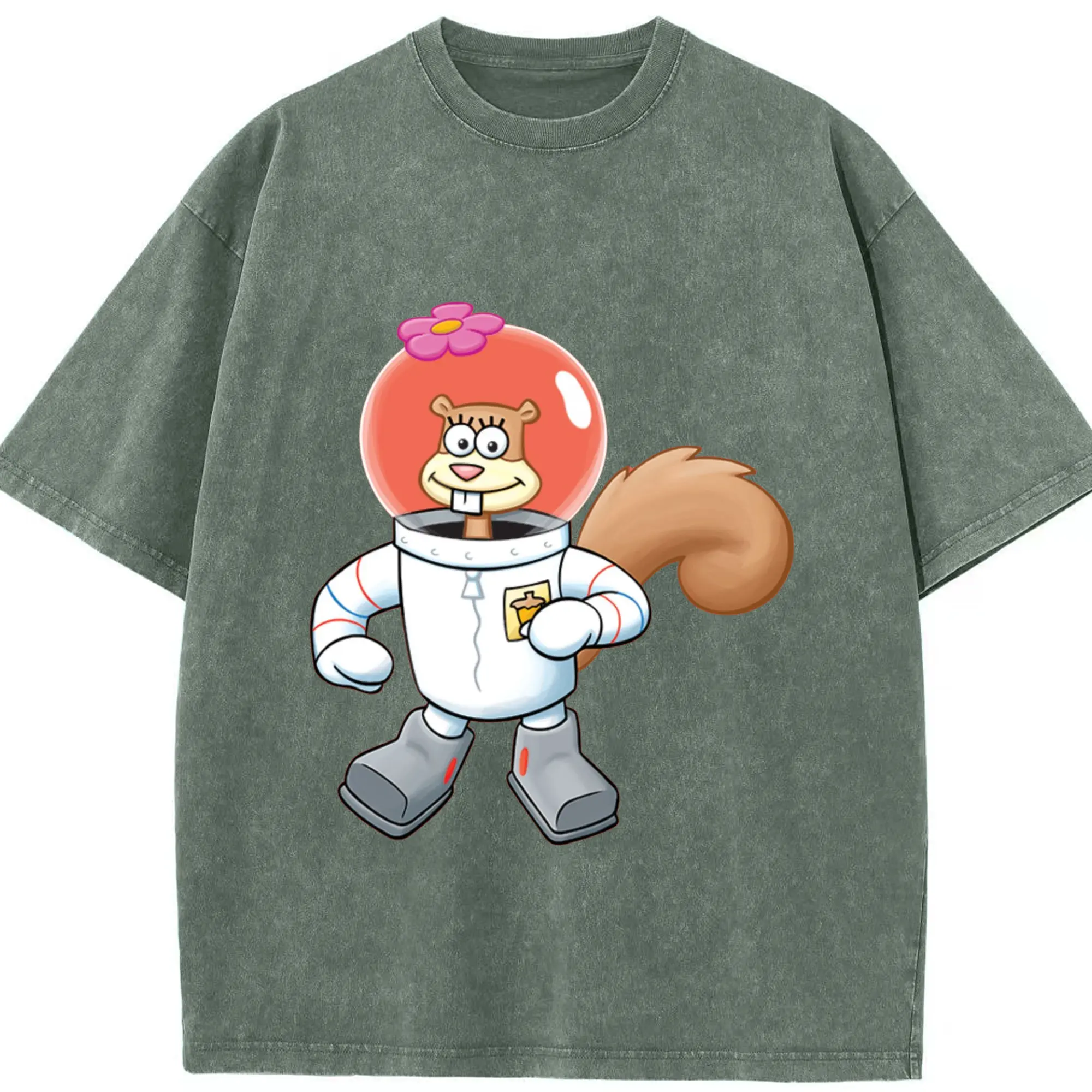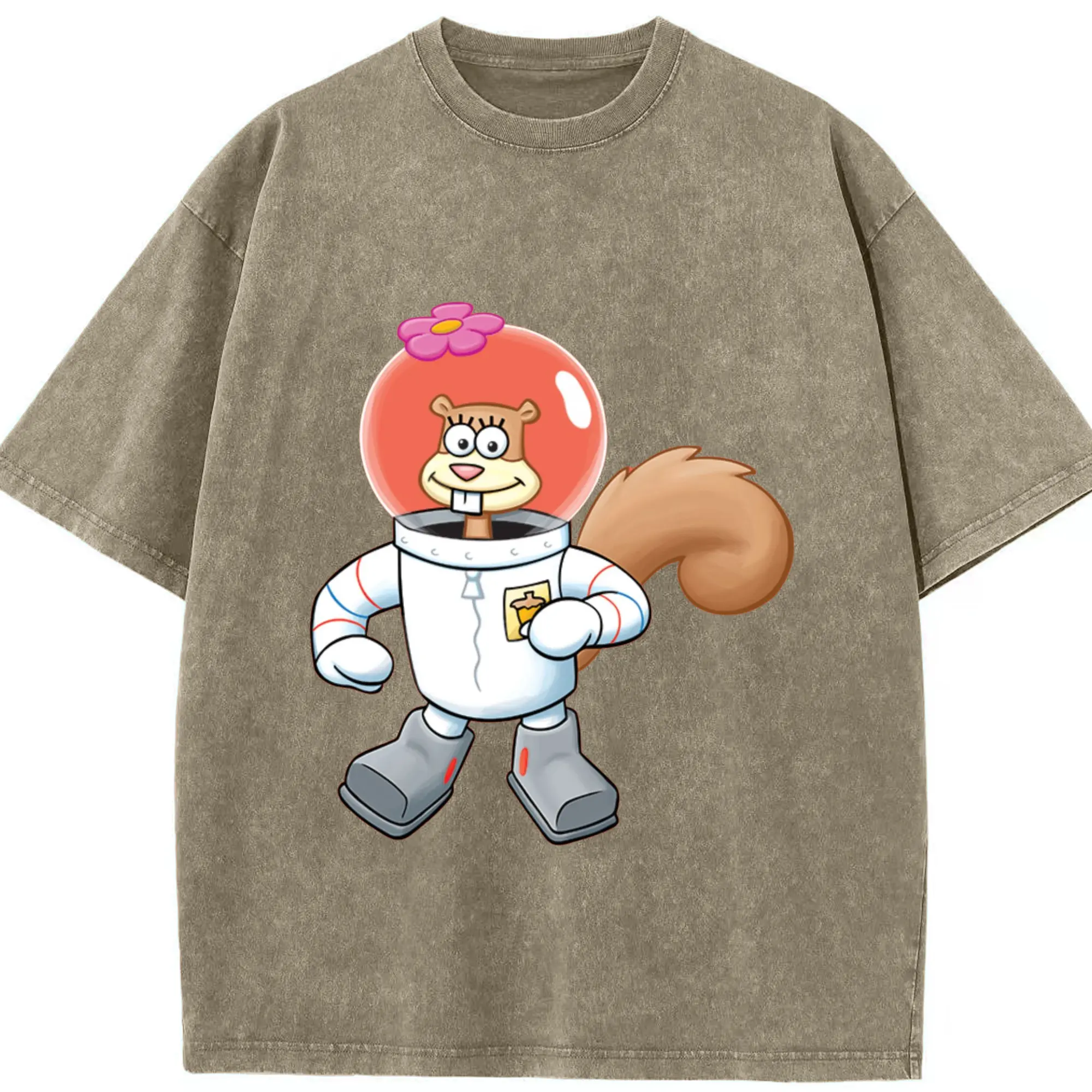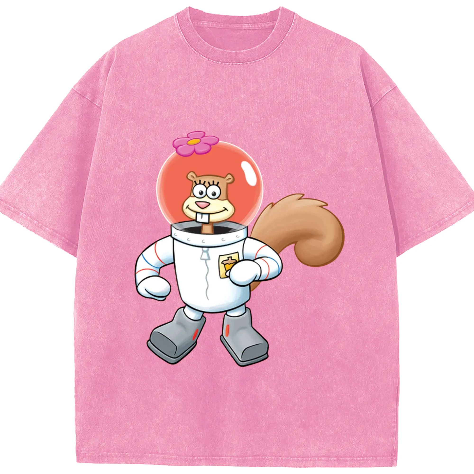 SpongeBob Sandy Cheeks cartoon t-shirt - Washed Vintage Look 230g Cotton Oversized T-Shirt With Front Heat Transfer Print – Soft, Lightweight, Stylish Fit – Comfortable Casual Wear For Sports & Everyday Use