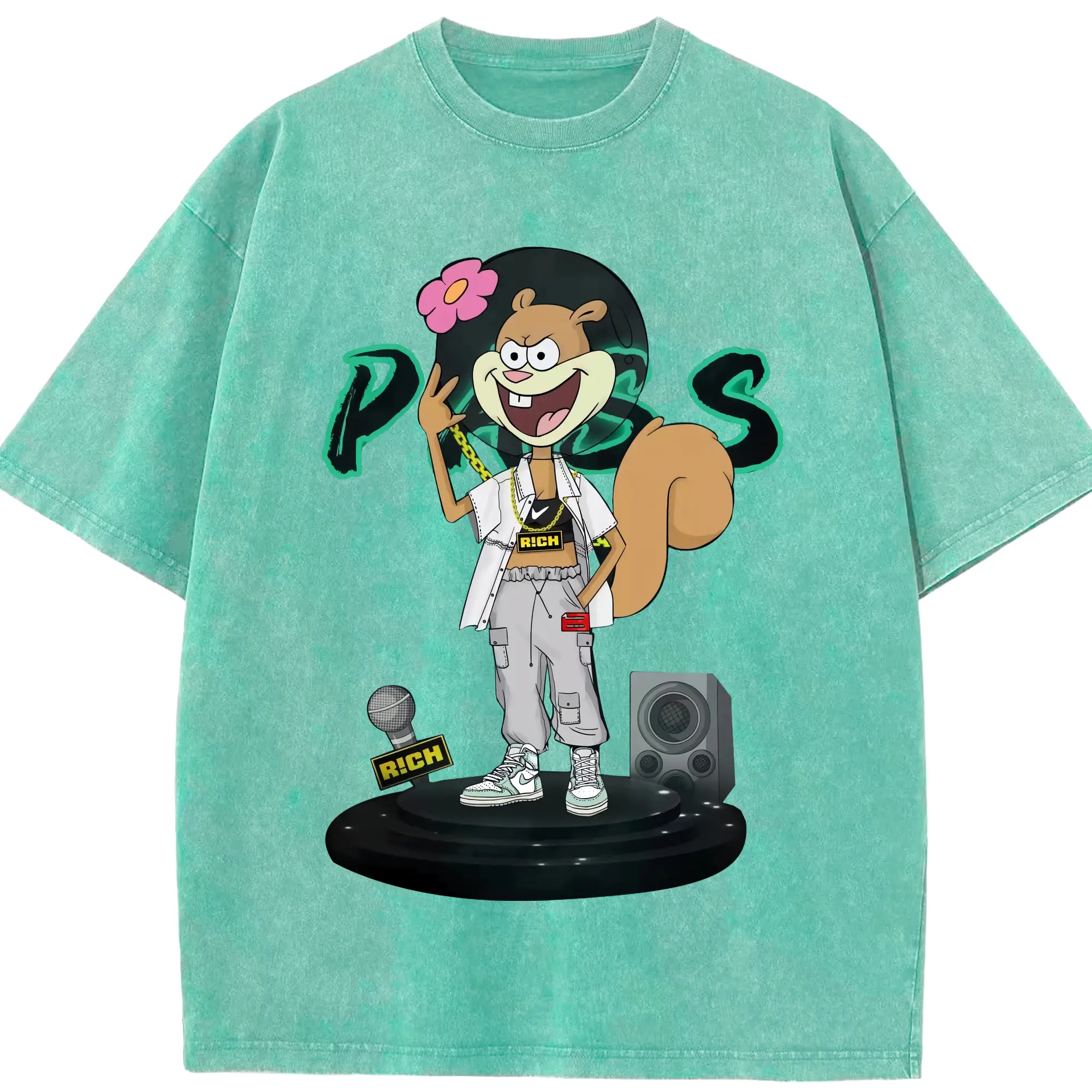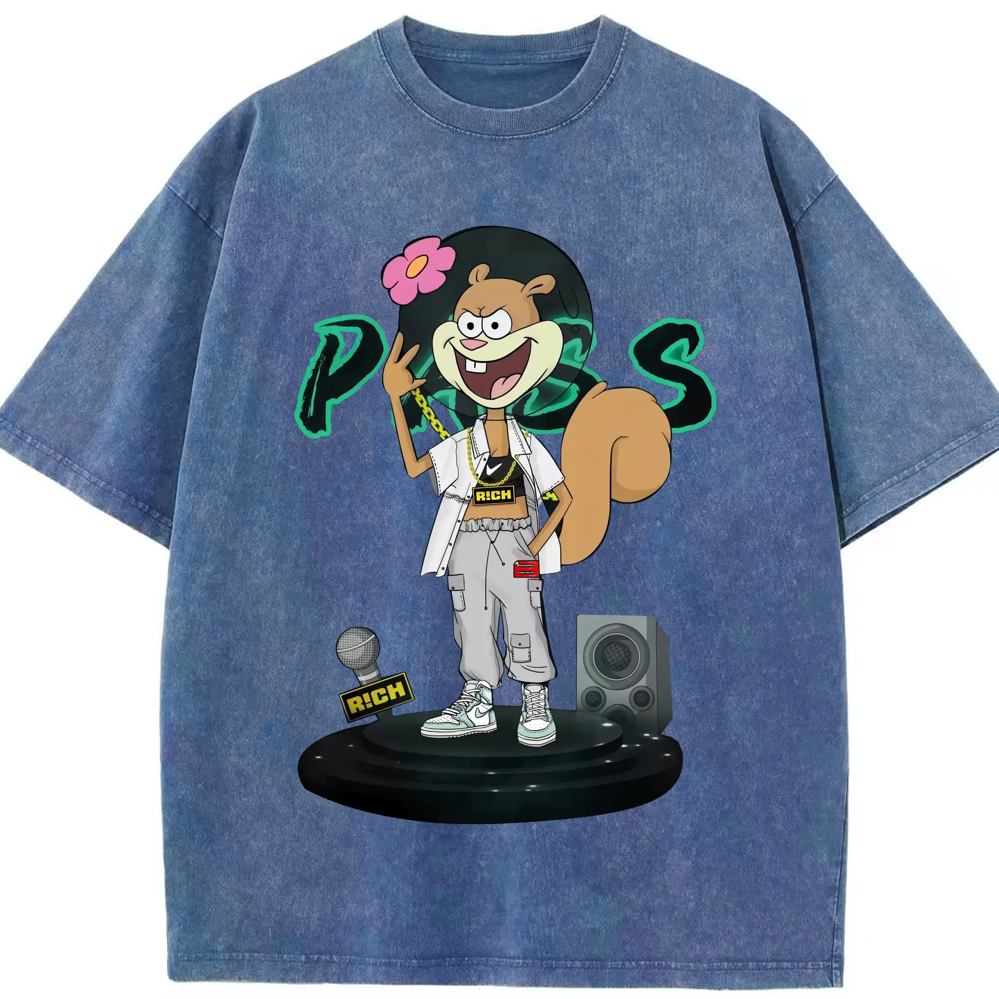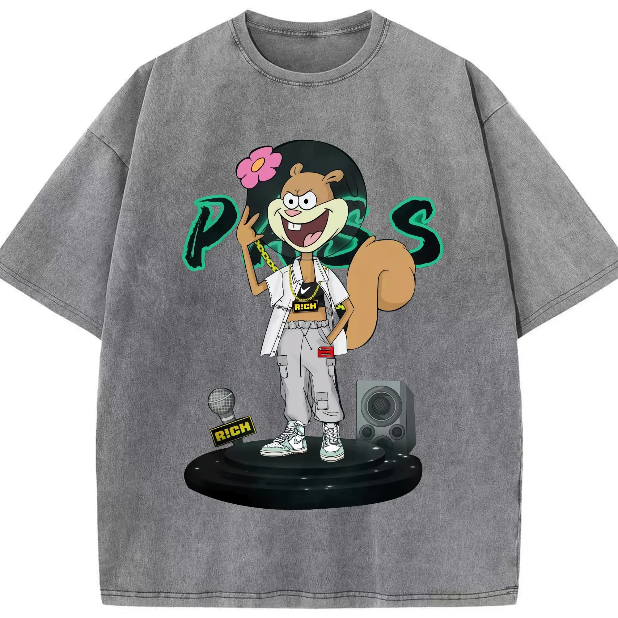 SpongeBob Sandy Cheeks hip hop Graphic Tee - Washed Vintage Look 230g Cotton Oversized T-Shirt With Front Heat Transfer Print – Soft, Lightweight, Stylish Fit – Comfortable Casual Wear For Sports & Everyday Use