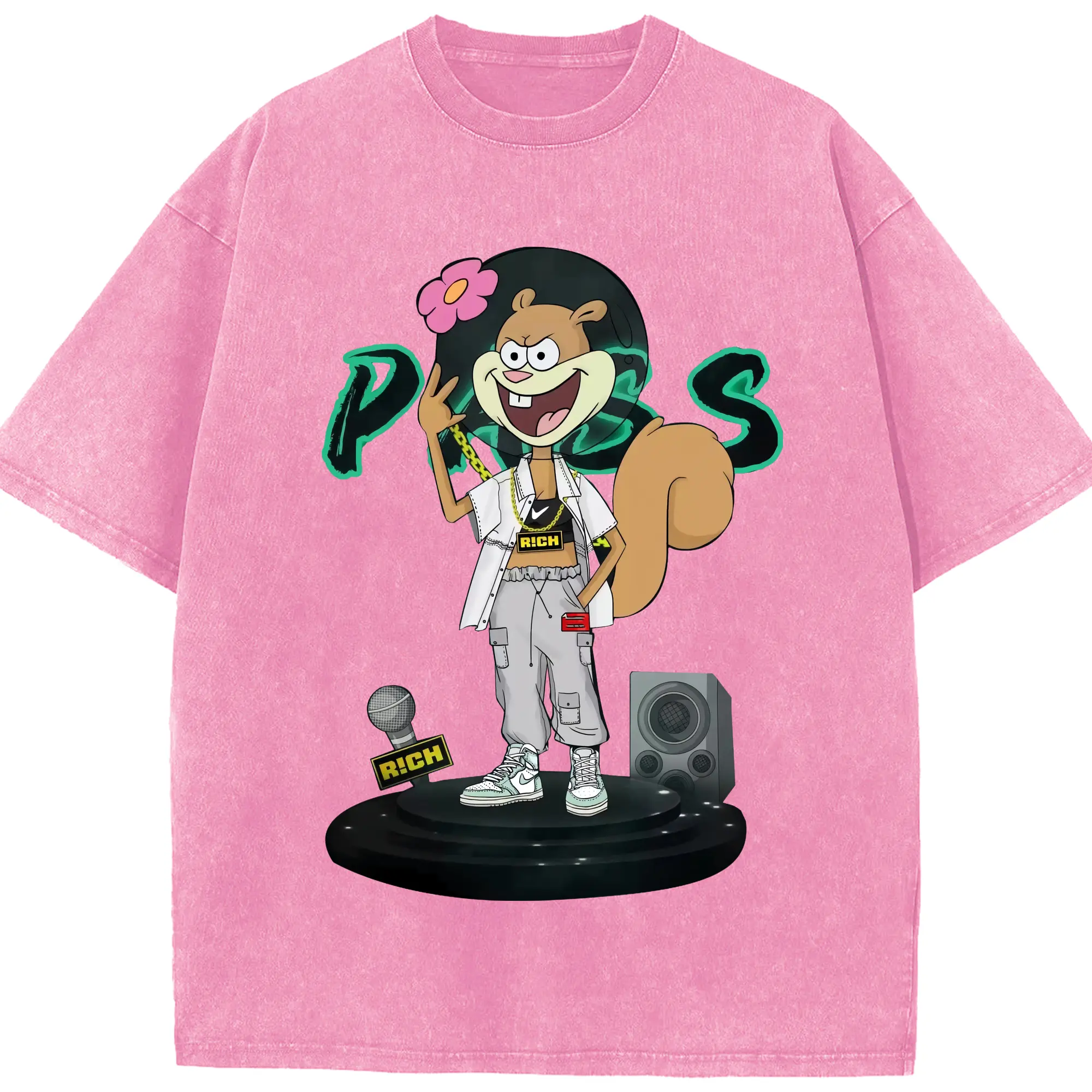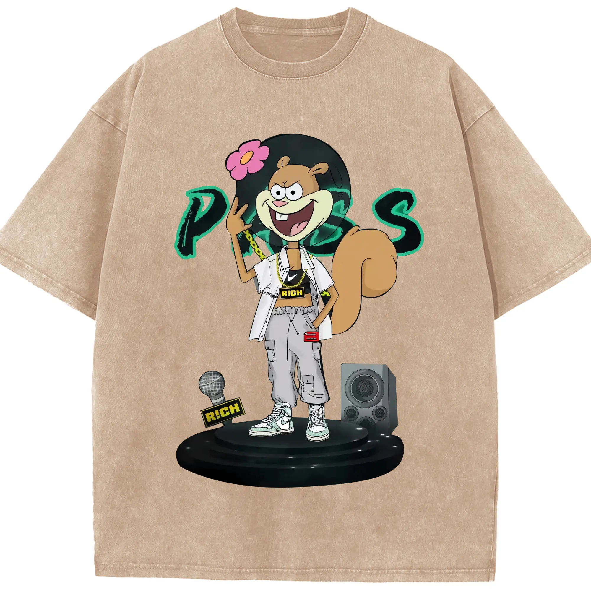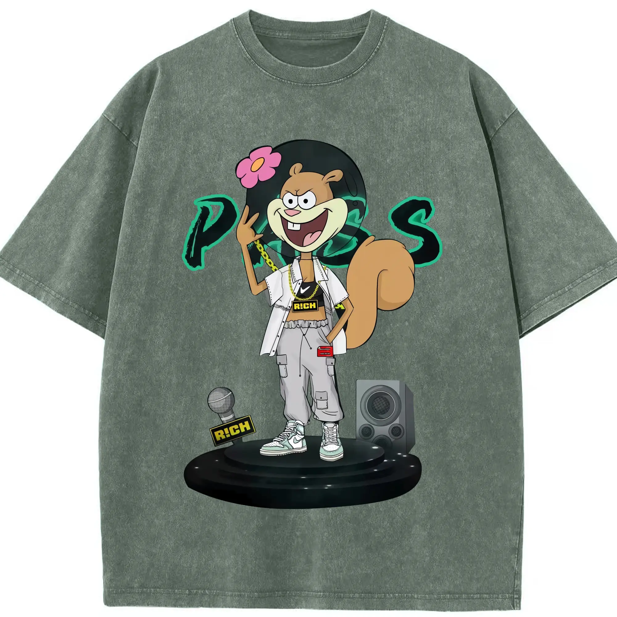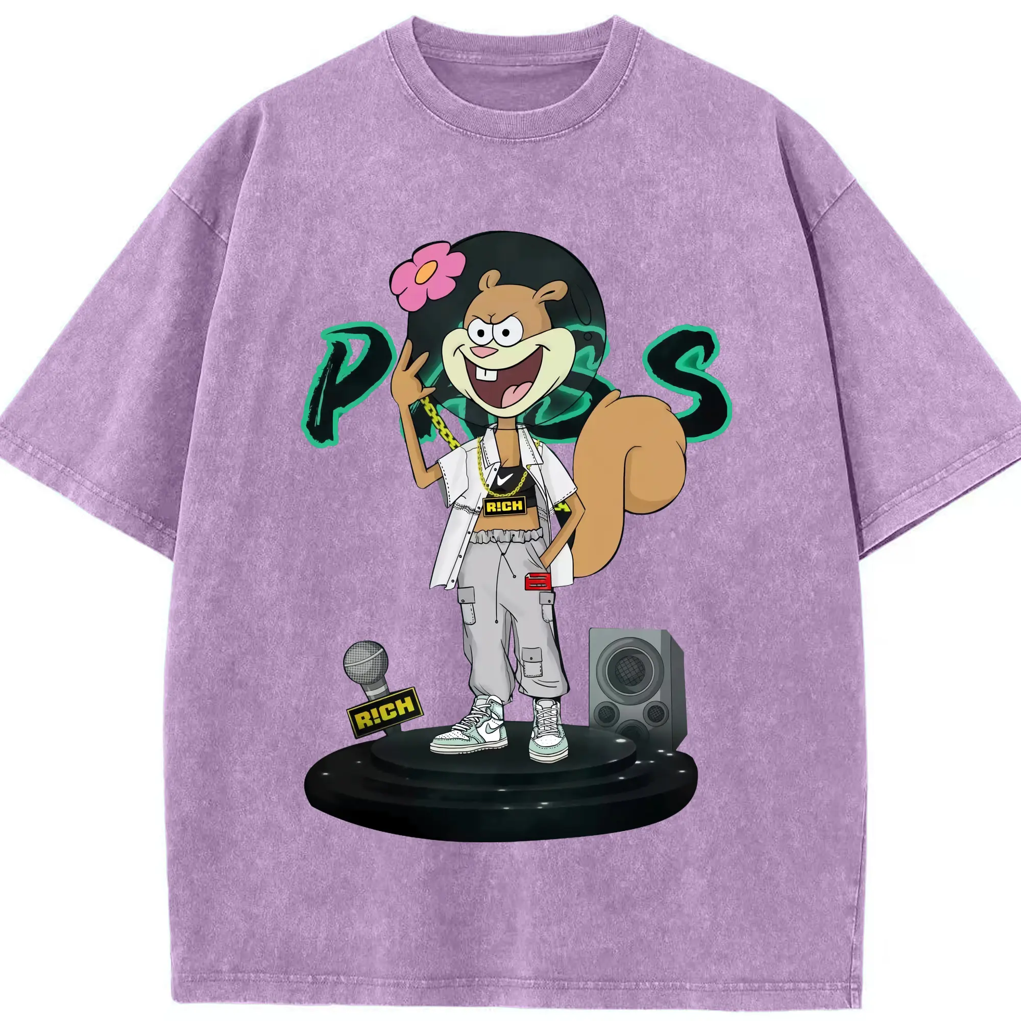 SpongeBob Sandy Cheeks hip hop Graphic Tee - Washed Vintage Look 230g Cotton Oversized T-Shirt With Front Heat Transfer Print – Soft, Lightweight, Stylish Fit – Comfortable Casual Wear For Sports & Everyday Use