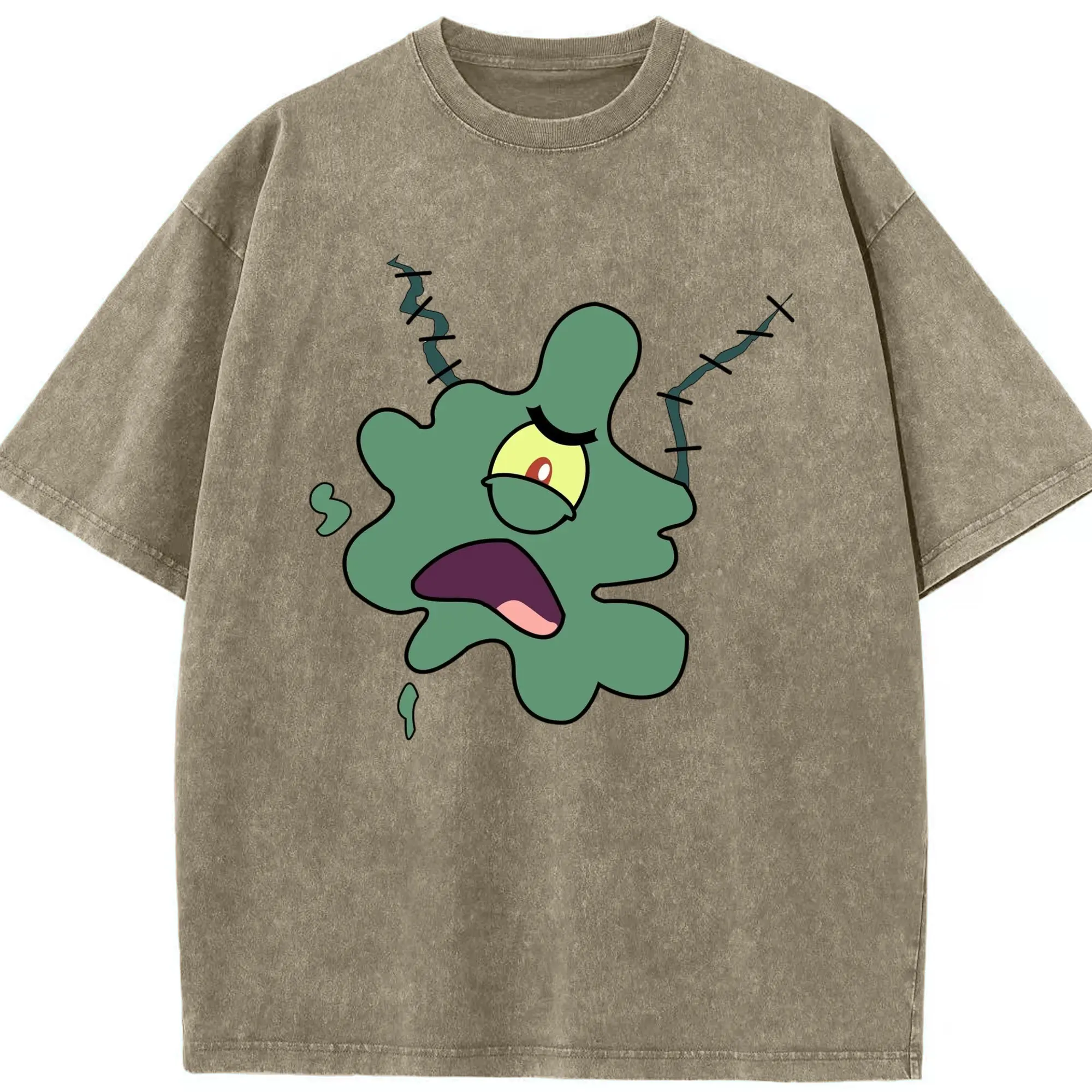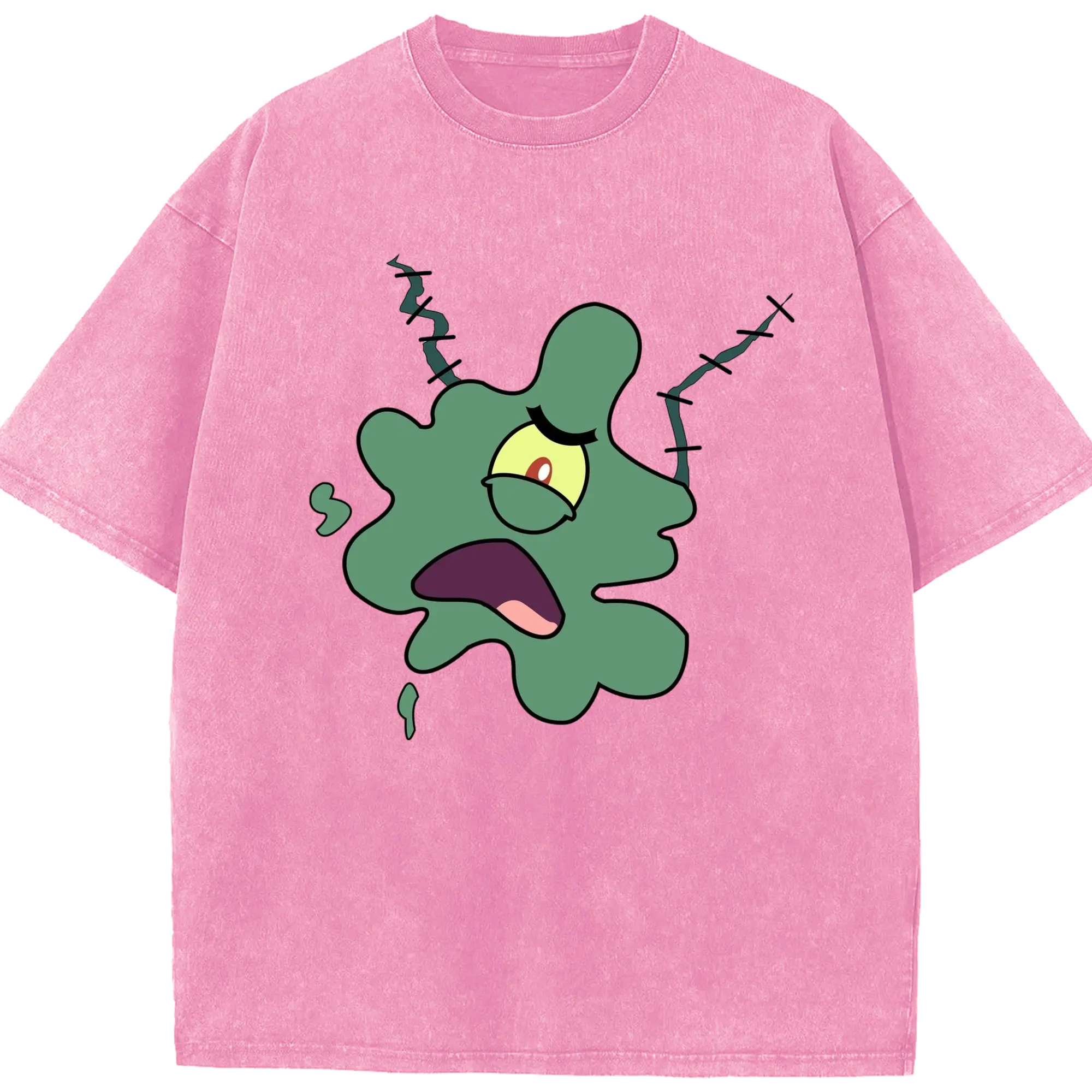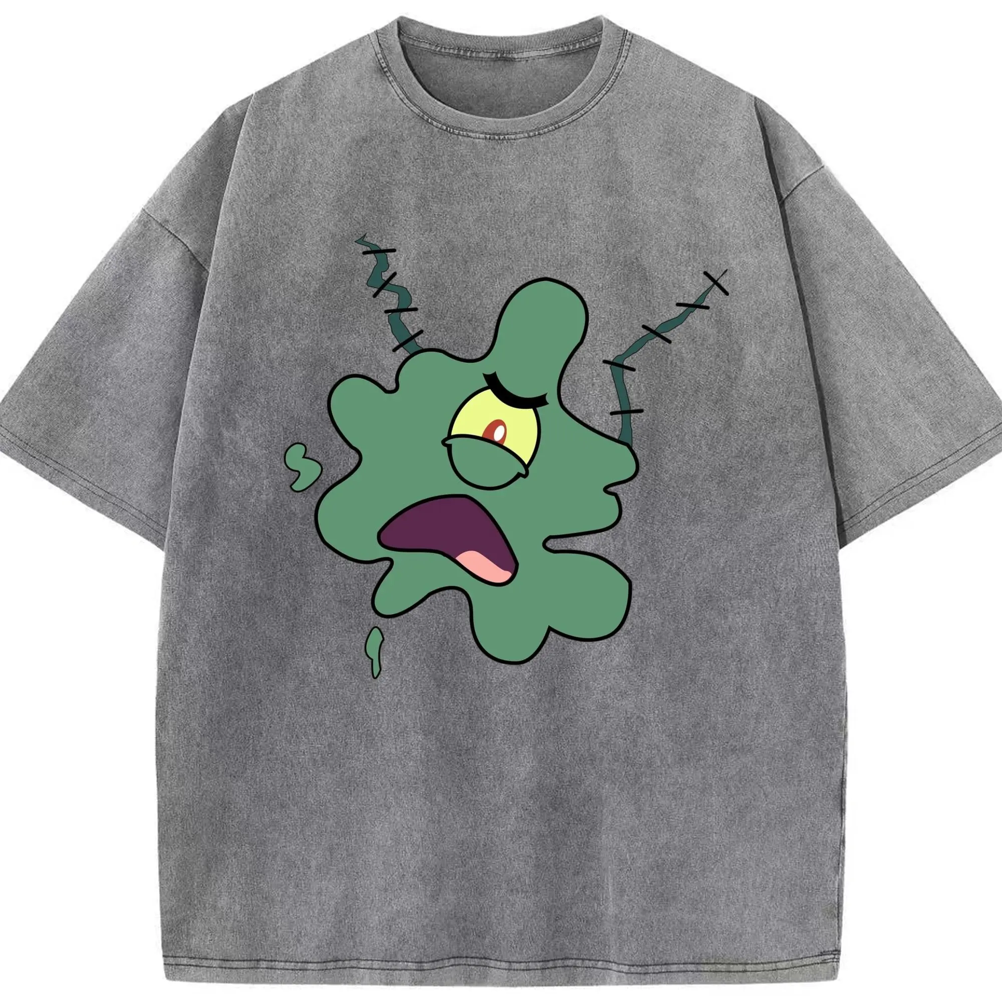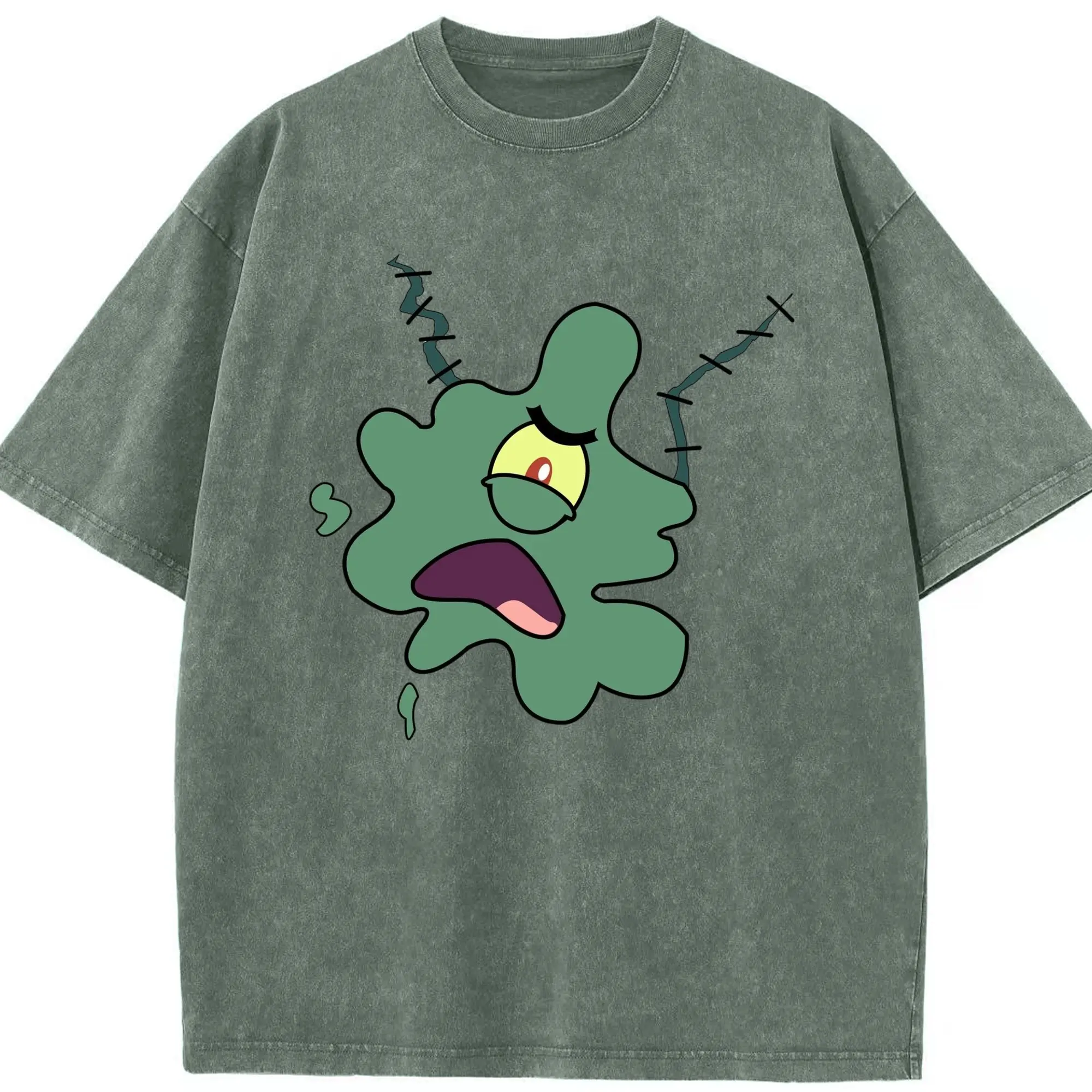 Spongebob Sheldon J. Plankton flaser mudface tee - Washed Vintage Look 230g Cotton Oversized T-Shirt With Front Heat Transfer Print – Soft, Lightweight, Stylish Fit – Comfortable Casual Wear For Sports & Everyday Use