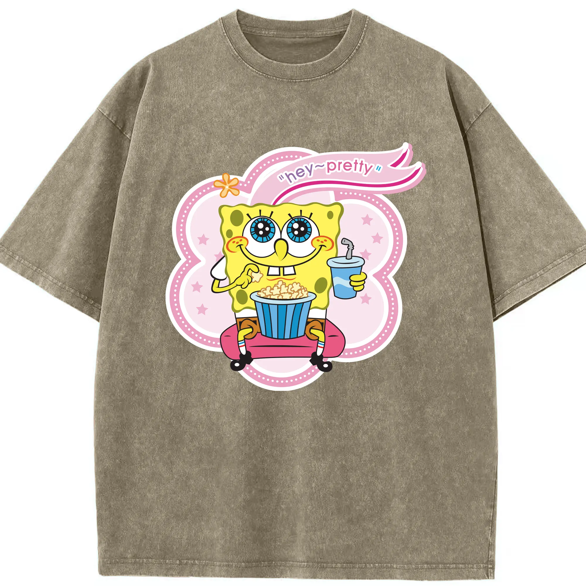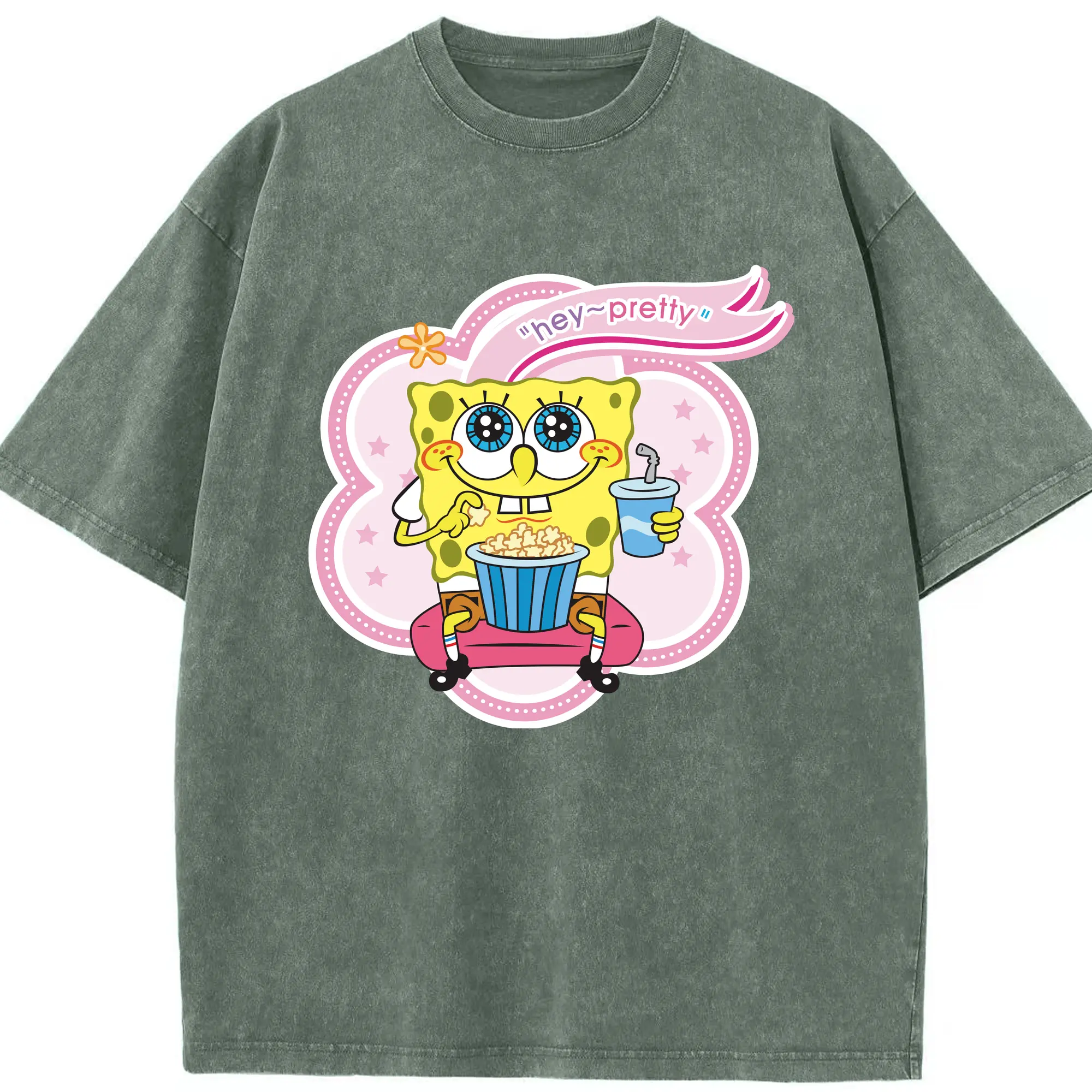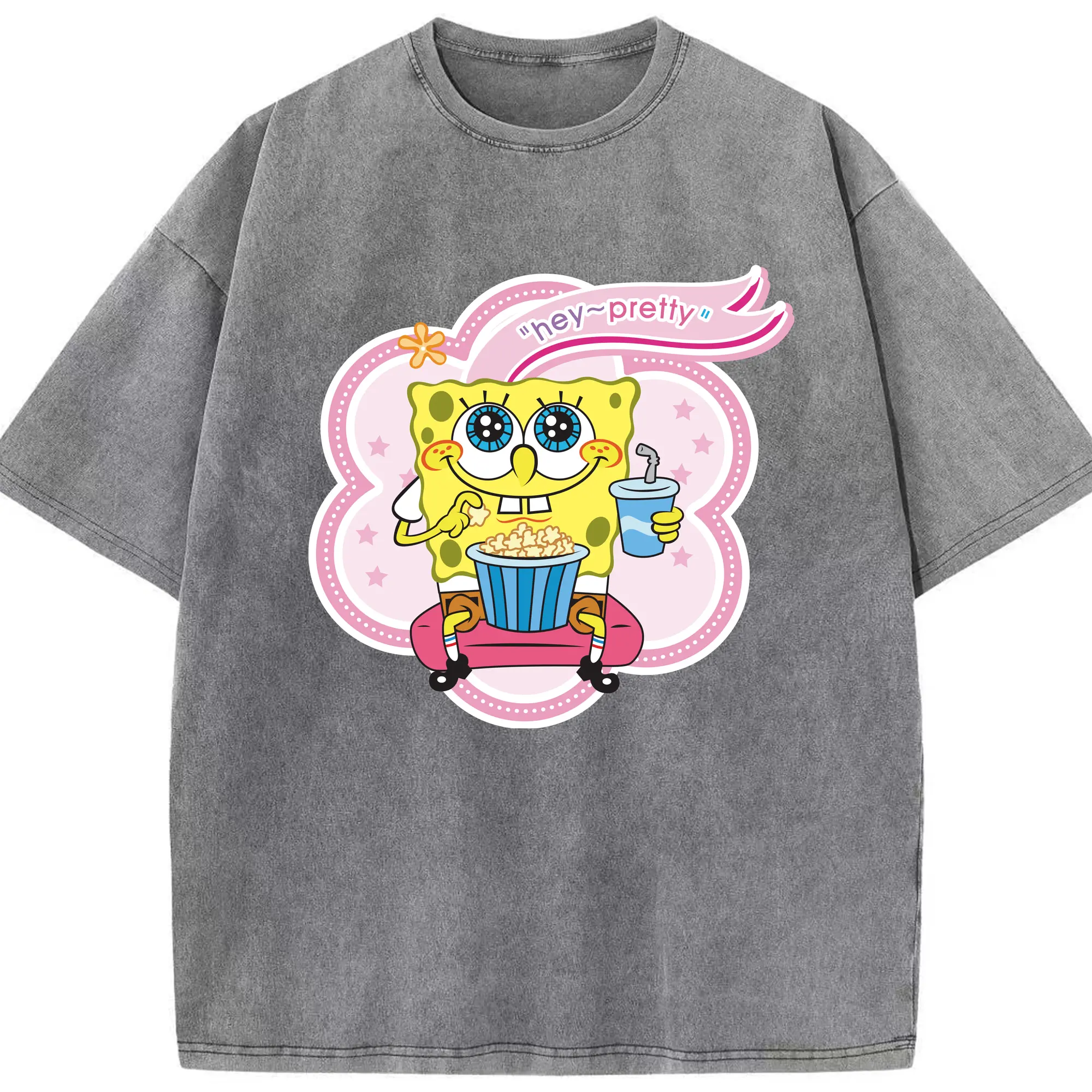 Spongebob squarepants 'ha! pretty' graphic t-shirt - Washed Vintage Look 230g Cotton Oversized T-Shirt With Front Heat Transfer Print – Soft, Lightweight, Stylish Fit – Comfortable Casual Wear For Sports & Everyday Use