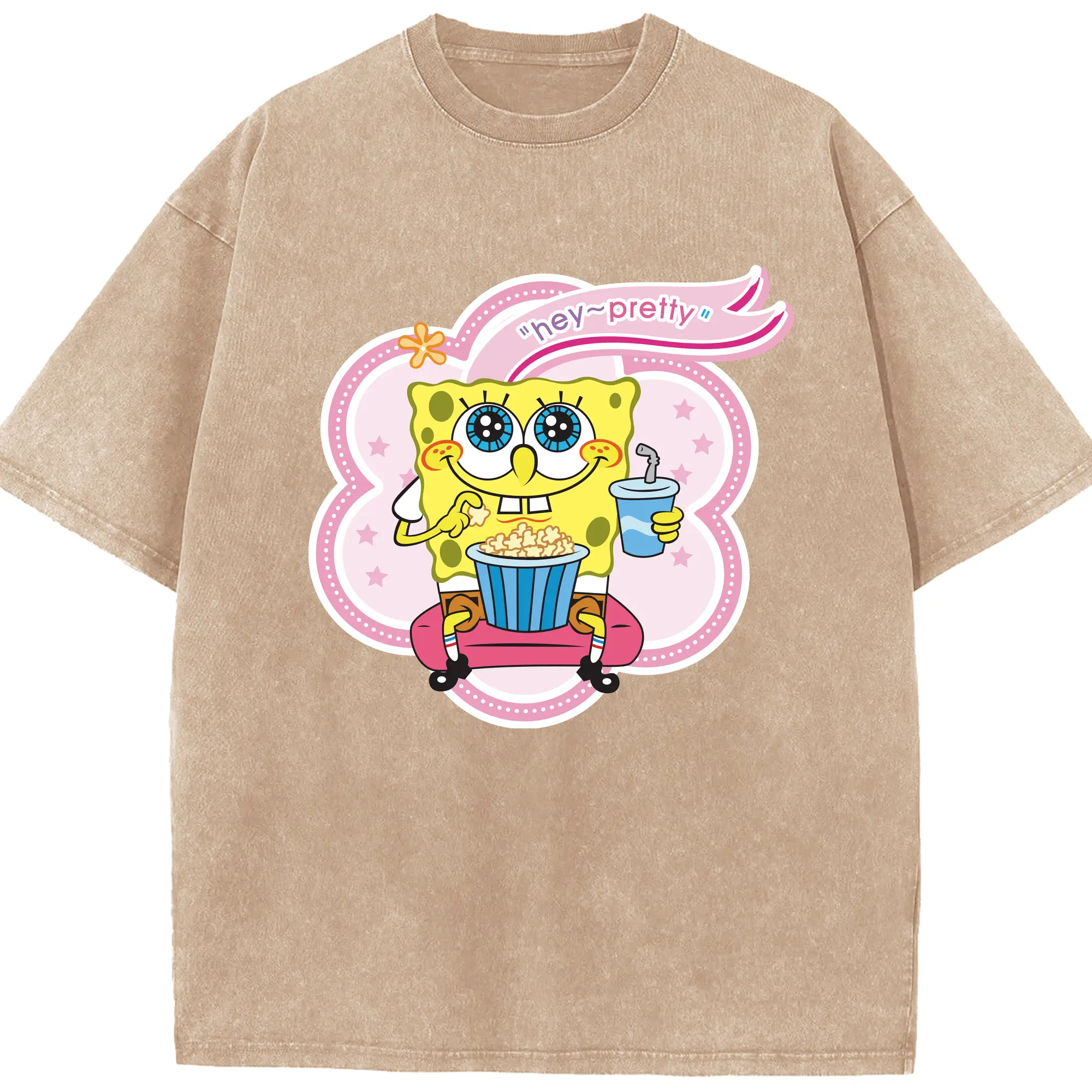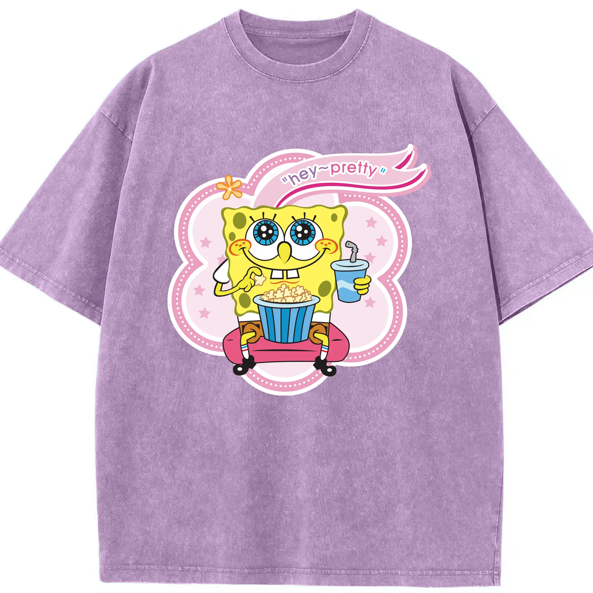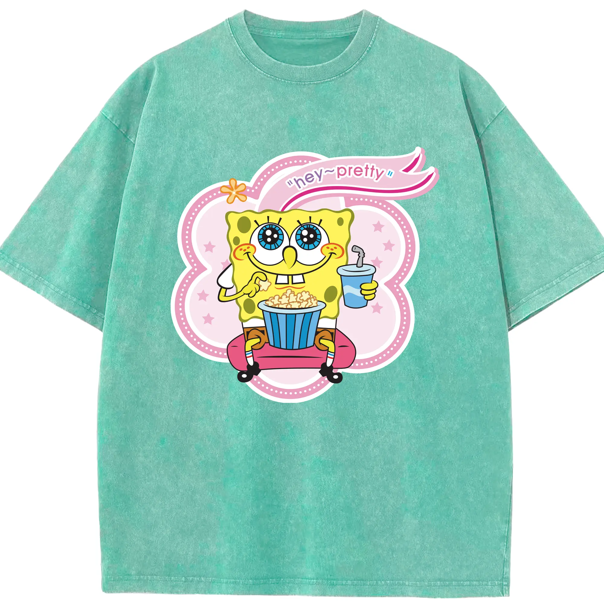Spongebob squarepants 'ha! pretty' graphic t-shirt - Washed Vintage Look 230g Cotton Oversized T-Shirt With Front Heat Transfer Print – Soft, Lightweight, Stylish Fit – Comfortable Casual Wear For Sports & Everyday Use