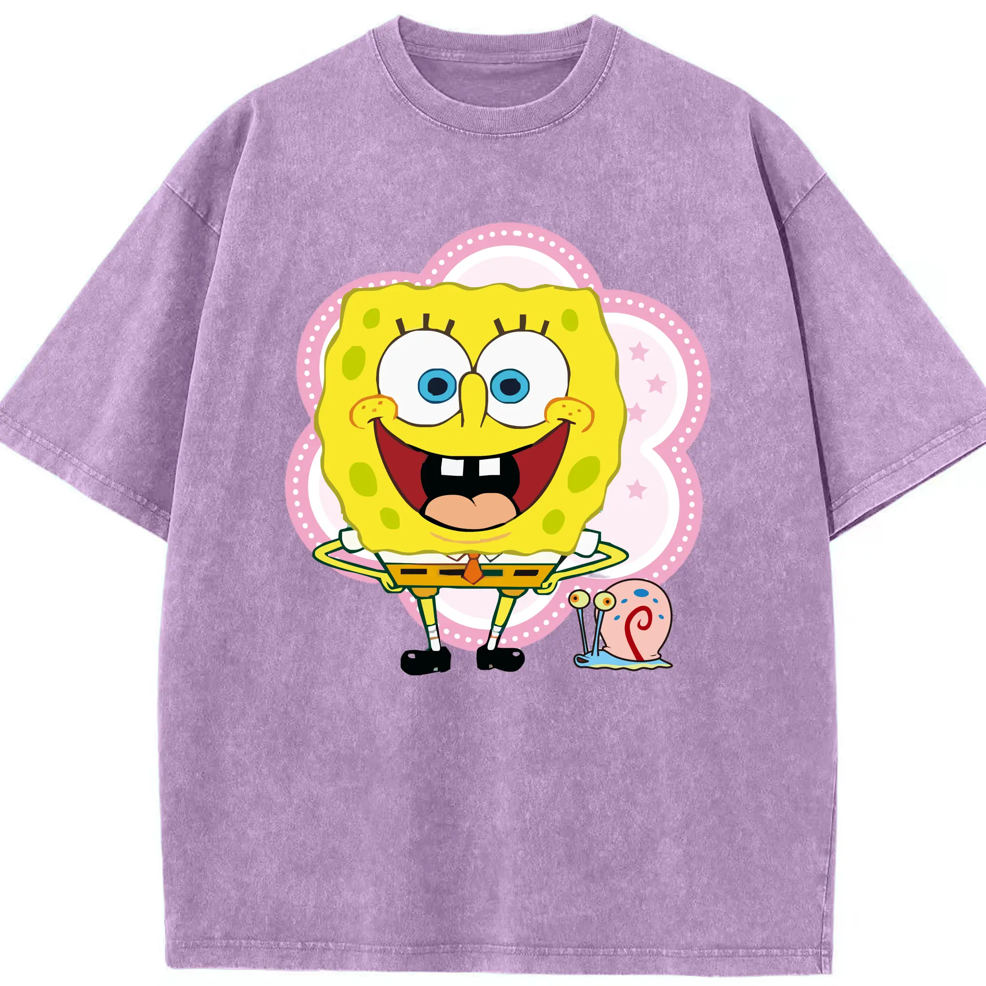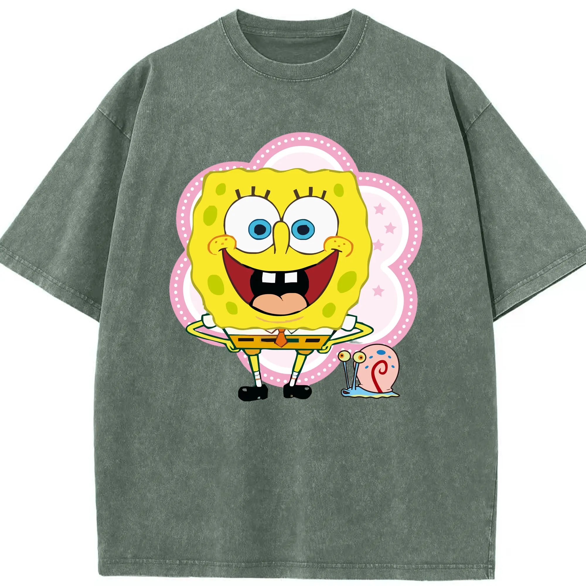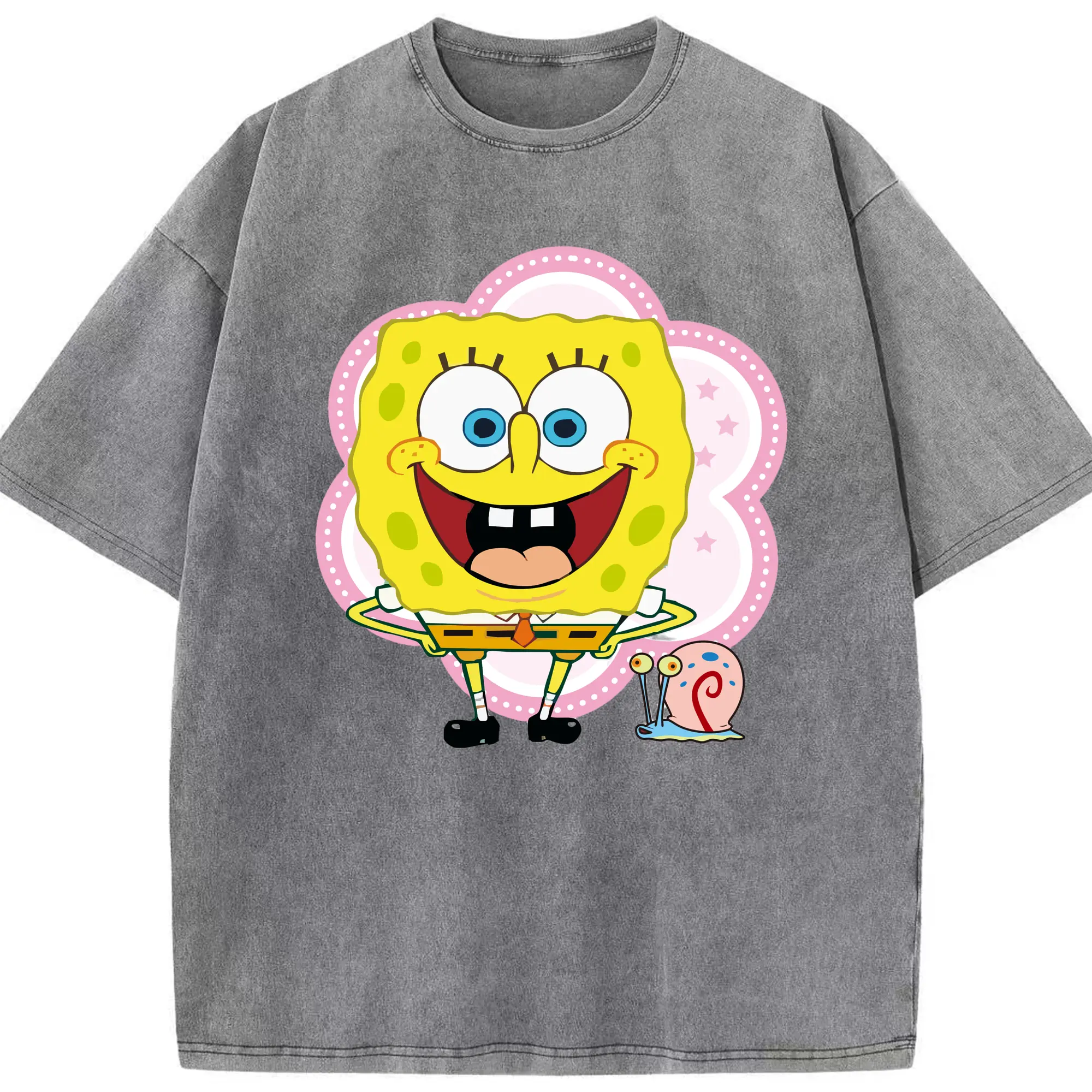 Spongebob squarepants and gay the snail graphic t-shirt - Washed Vintage Look 230g Cotton Oversized T-Shirt With Front Heat Transfer Print – Soft, Lightweight, Stylish Fit – Comfortable Casual Wear For Sports & Everyday Use