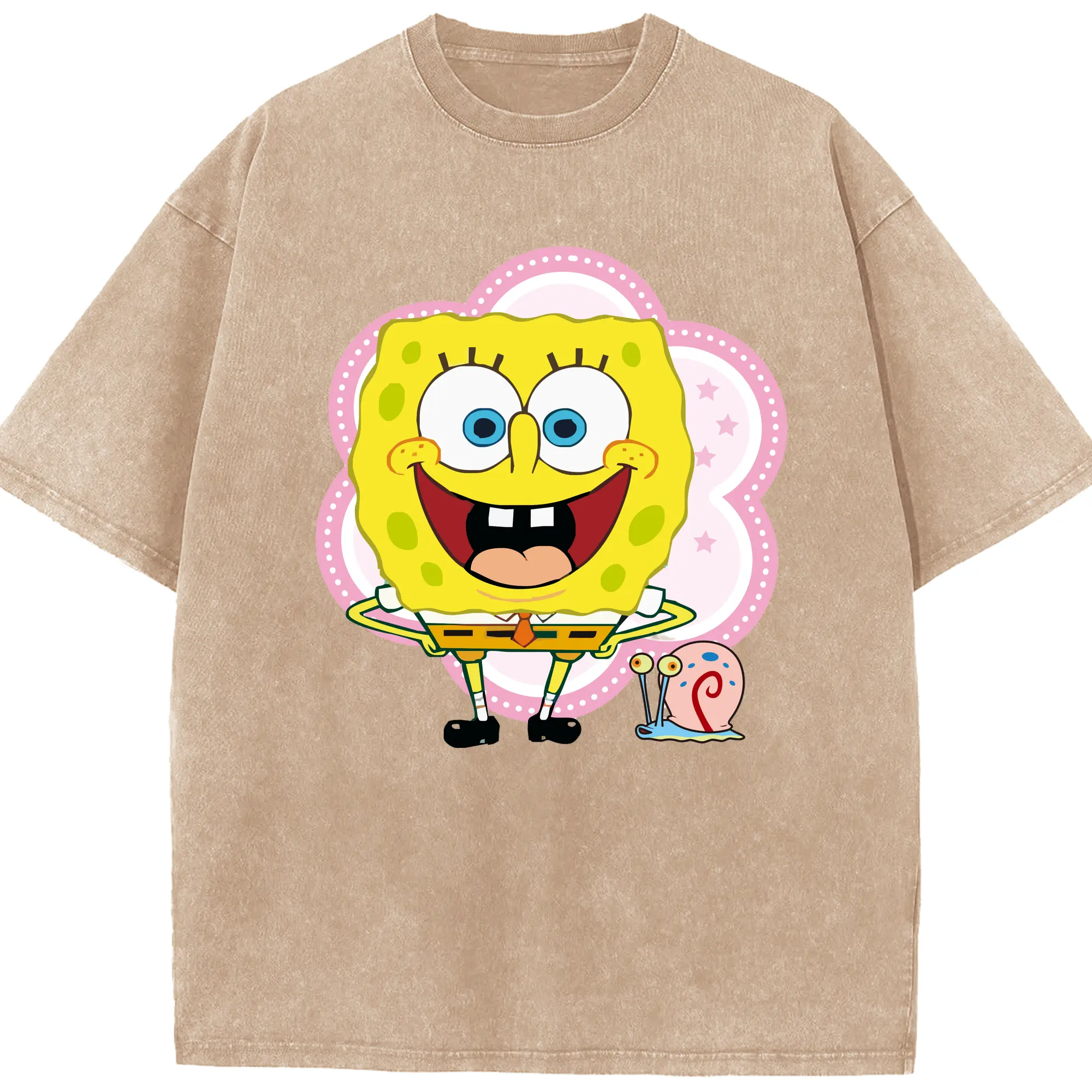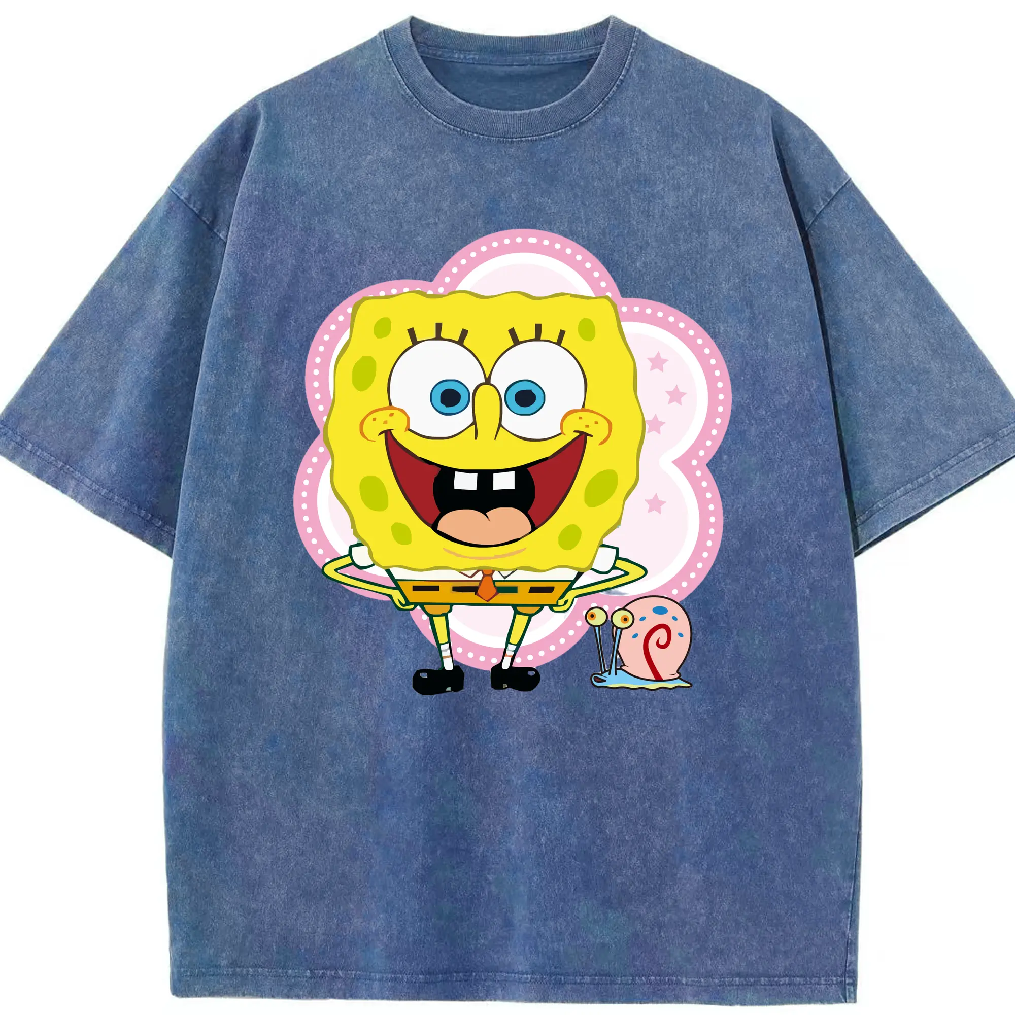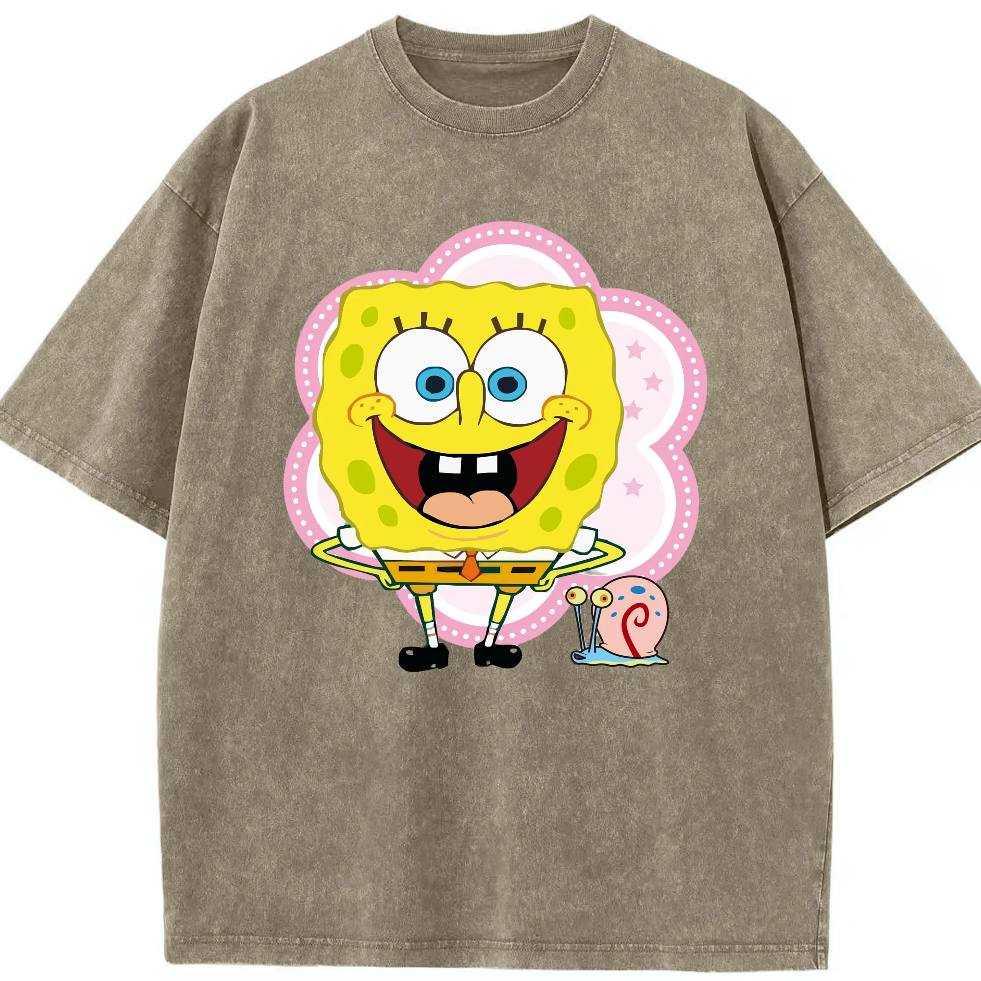 Spongebob squarepants and gay the snail graphic t-shirt - Washed Vintage Look 230g Cotton Oversized T-Shirt With Front Heat Transfer Print – Soft, Lightweight, Stylish Fit – Comfortable Casual Wear For Sports & Everyday Use