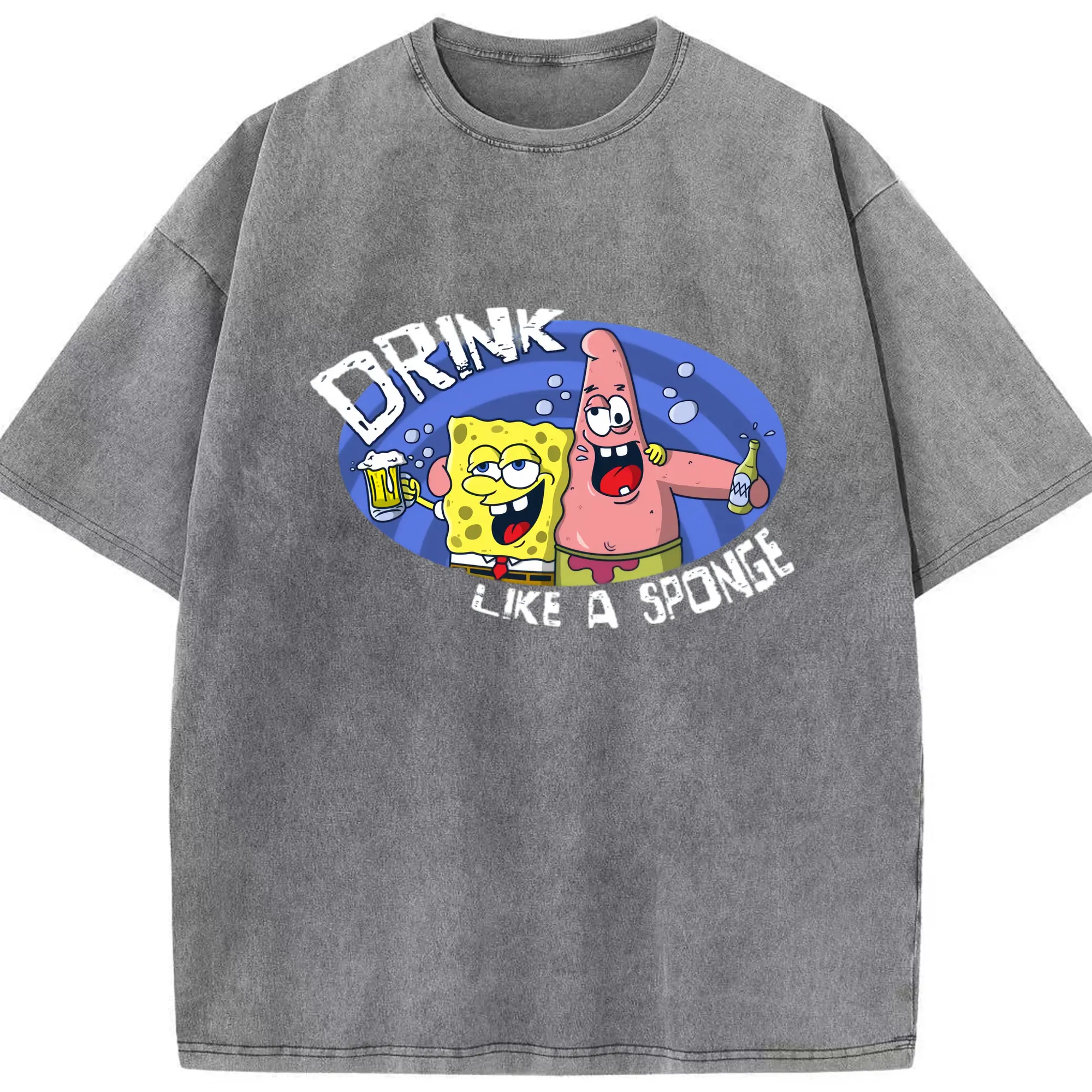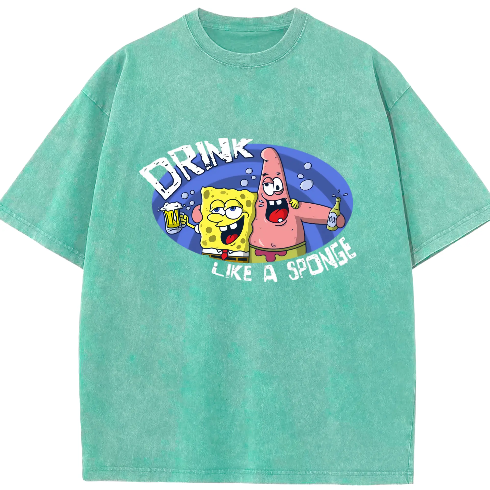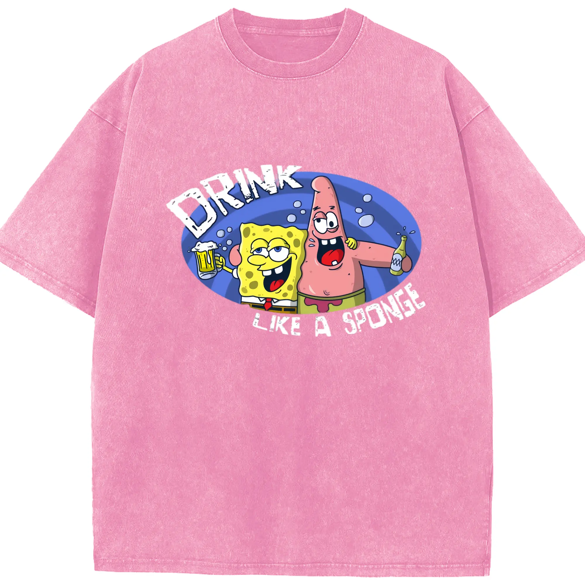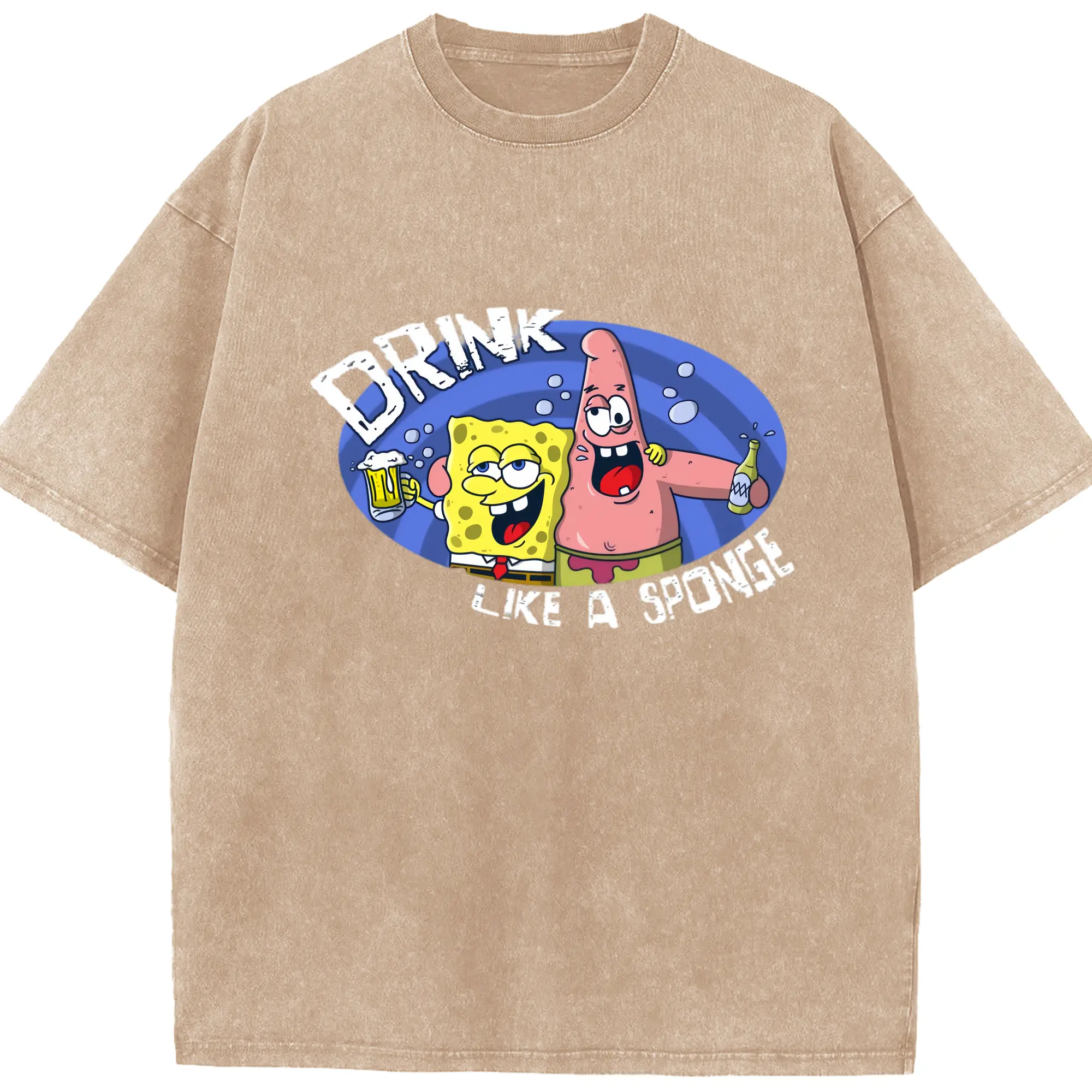 Spongebob squarepants and Patrick Star drink t-shirt - Washed Vintage Look 230g Cotton Oversized T-Shirt With Front Heat Transfer Print – Soft, Lightweight, Stylish Fit – Comfortable Casual Wear For Sports & Everyday Use
