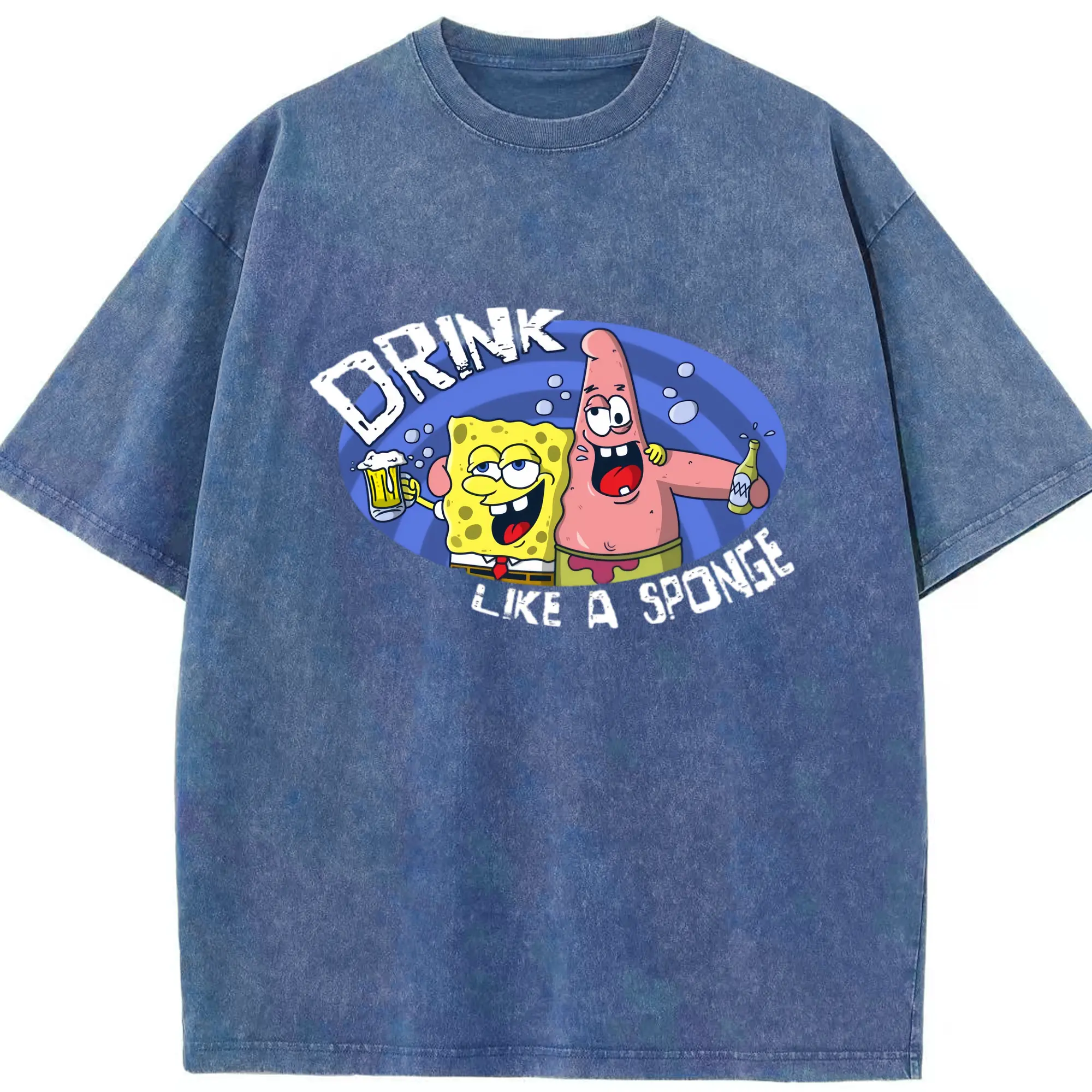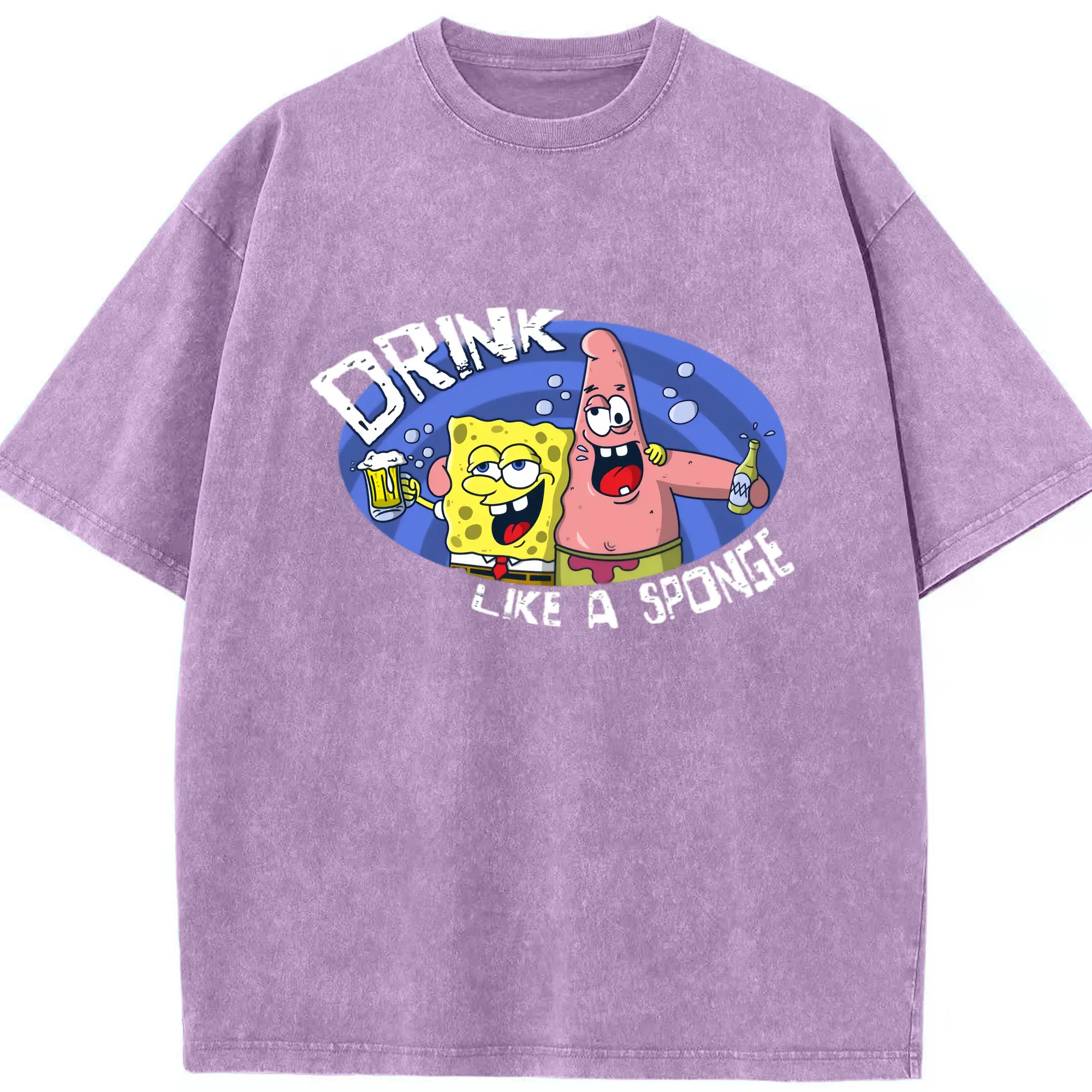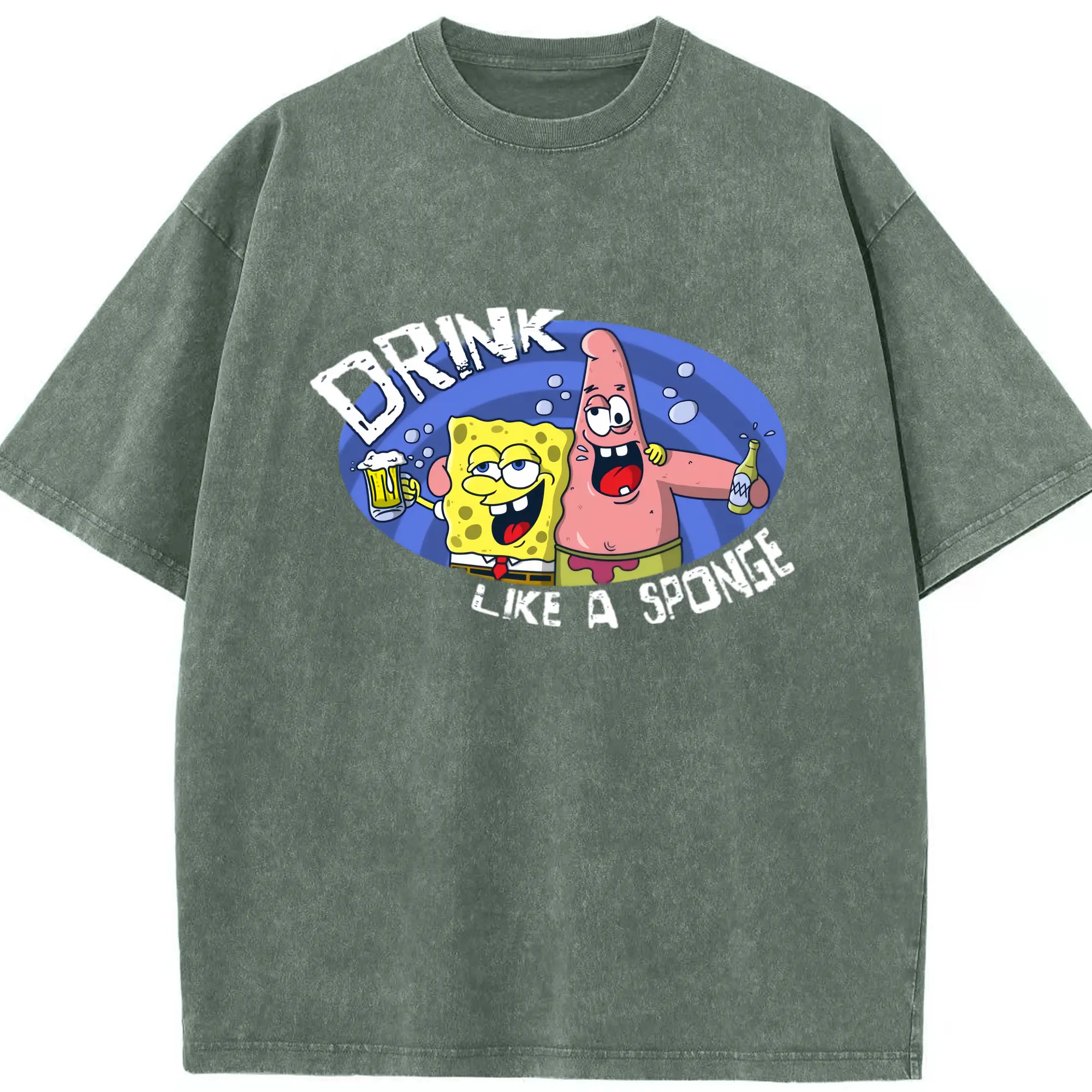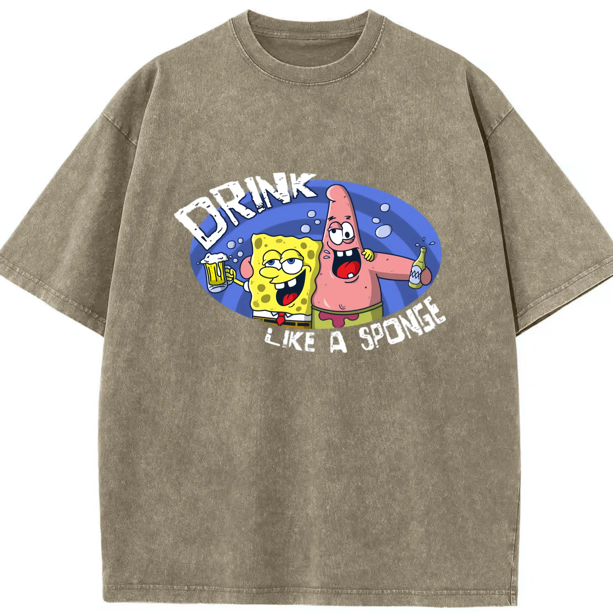 Spongebob squarepants and Patrick Star drink t-shirt - Washed Vintage Look 230g Cotton Oversized T-Shirt With Front Heat Transfer Print – Soft, Lightweight, Stylish Fit – Comfortable Casual Wear For Sports & Everyday Use