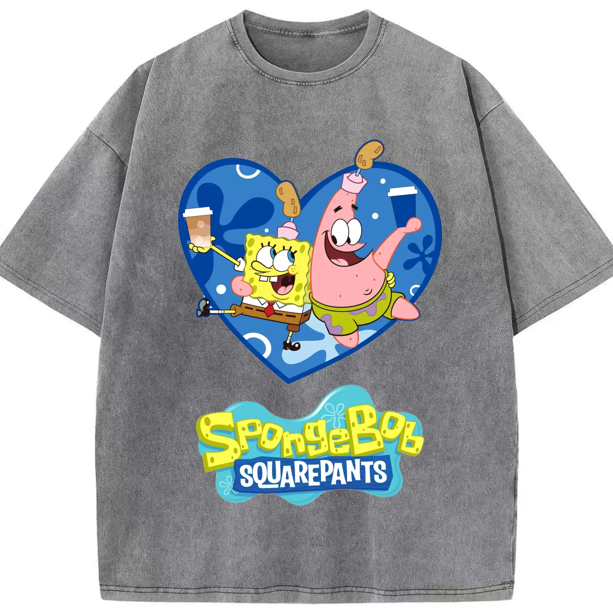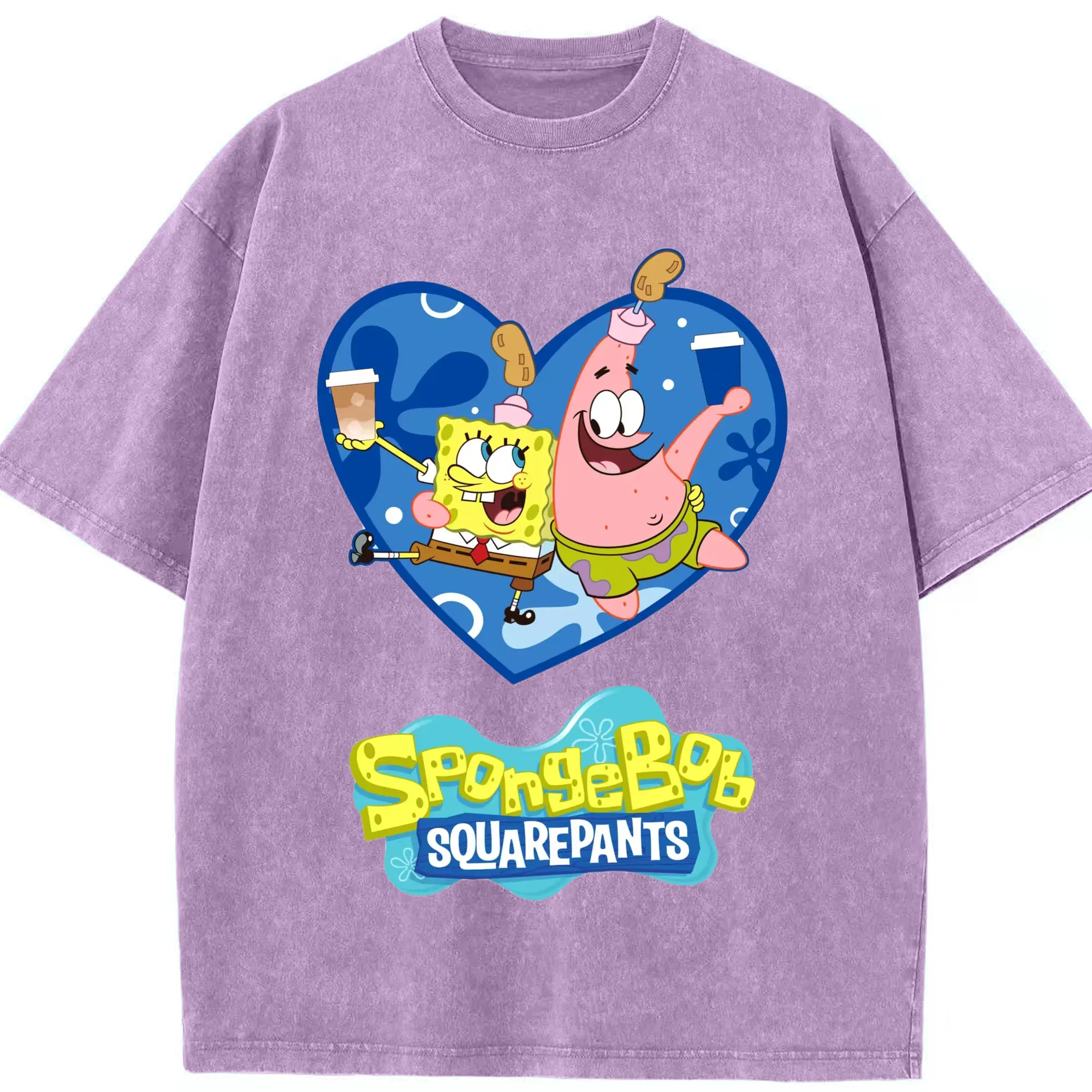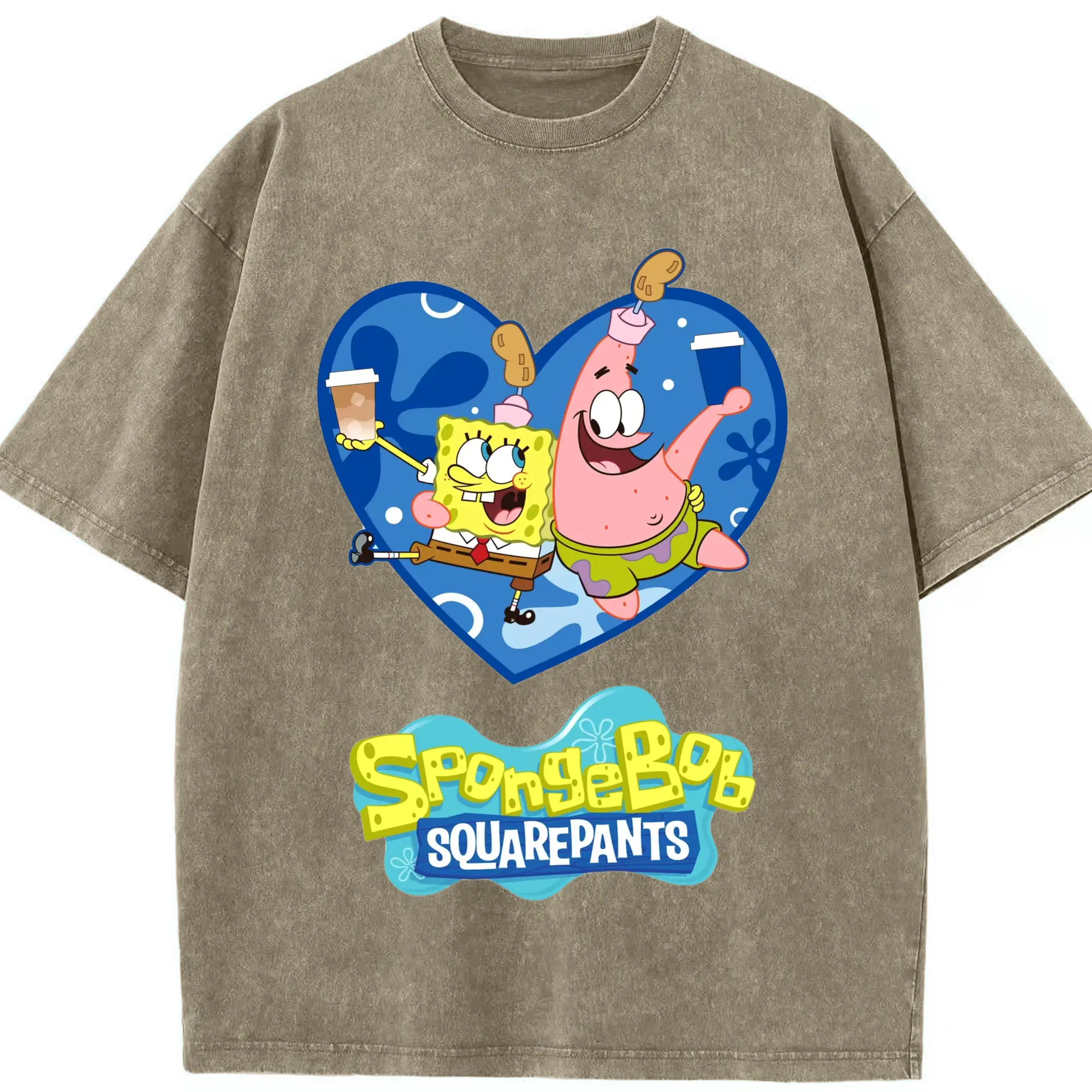 Spongebob squarepants and Patrick Star tee - Washed Vintage Look 230g Cotton Oversized T-Shirt With Front Heat Transfer Print – Soft, Lightweight, Stylish Fit – Comfortable Casual Wear For Sports & Everyday Use