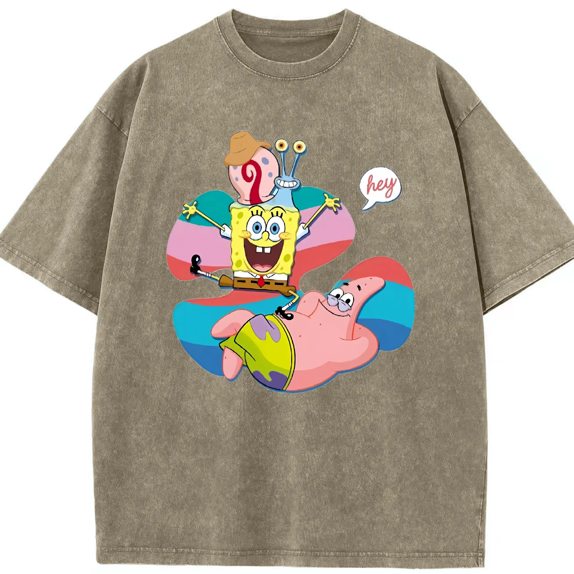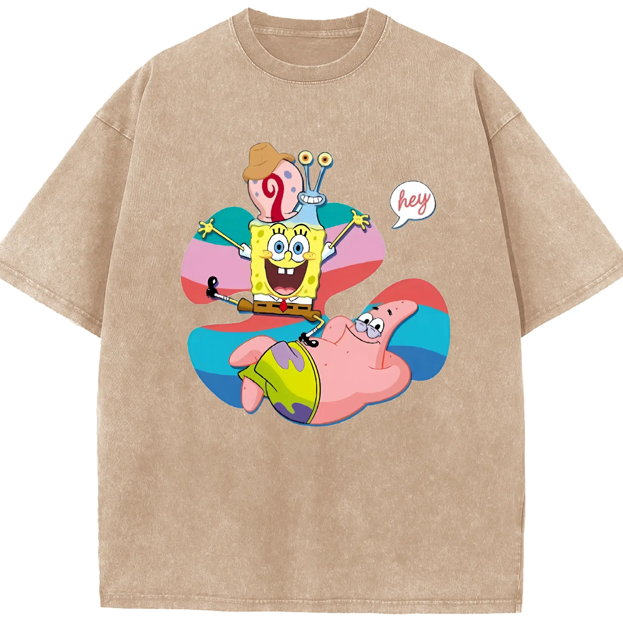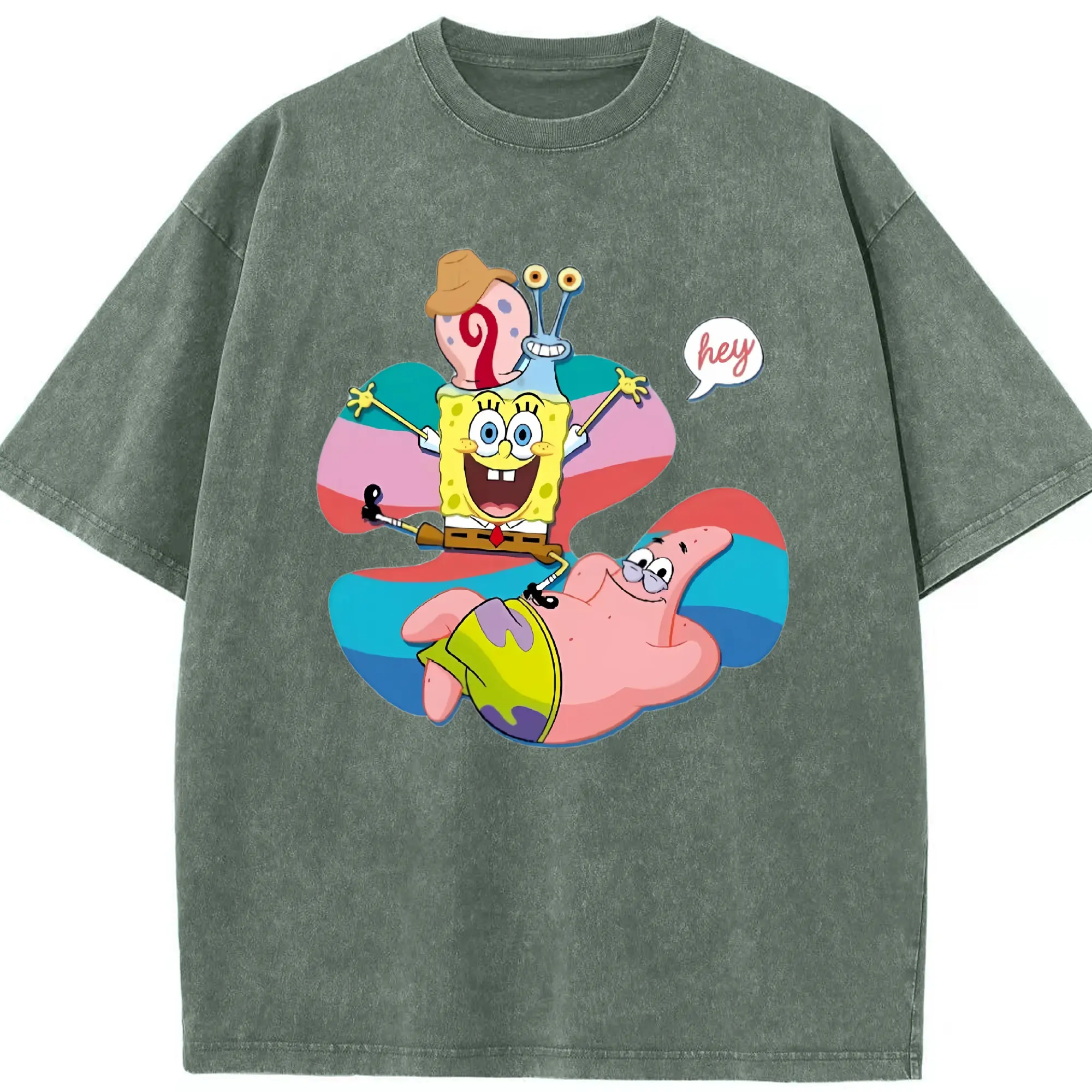 Spongebob squarepants and Patrick Star,Gary the Snail t-shirt - Washed Vintage Look 230g Cotton Oversized T-Shirt With Front Heat Transfer Print – Soft, Lightweight, Stylish Fit – Comfortable Casual Wear For Sports & Everyday Use