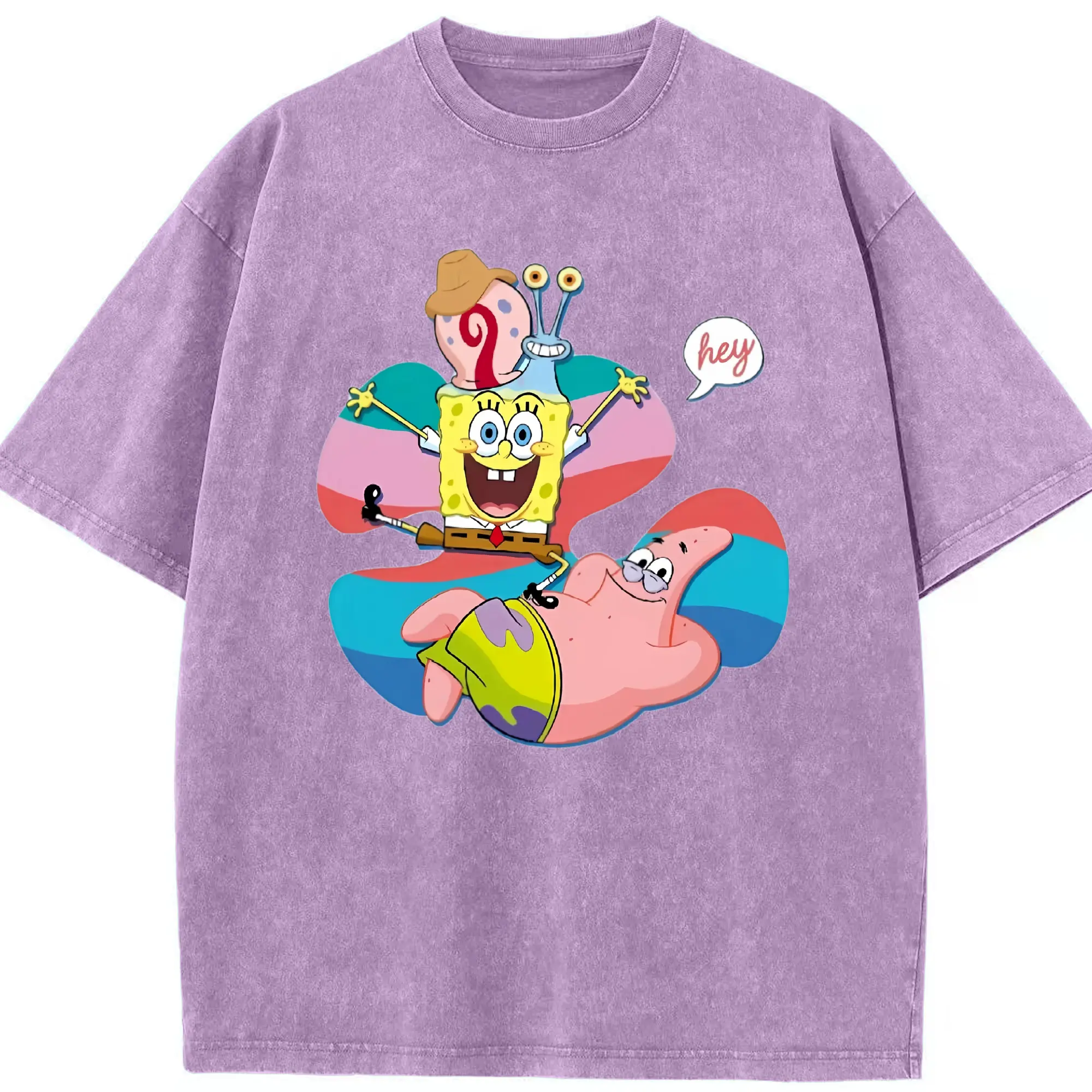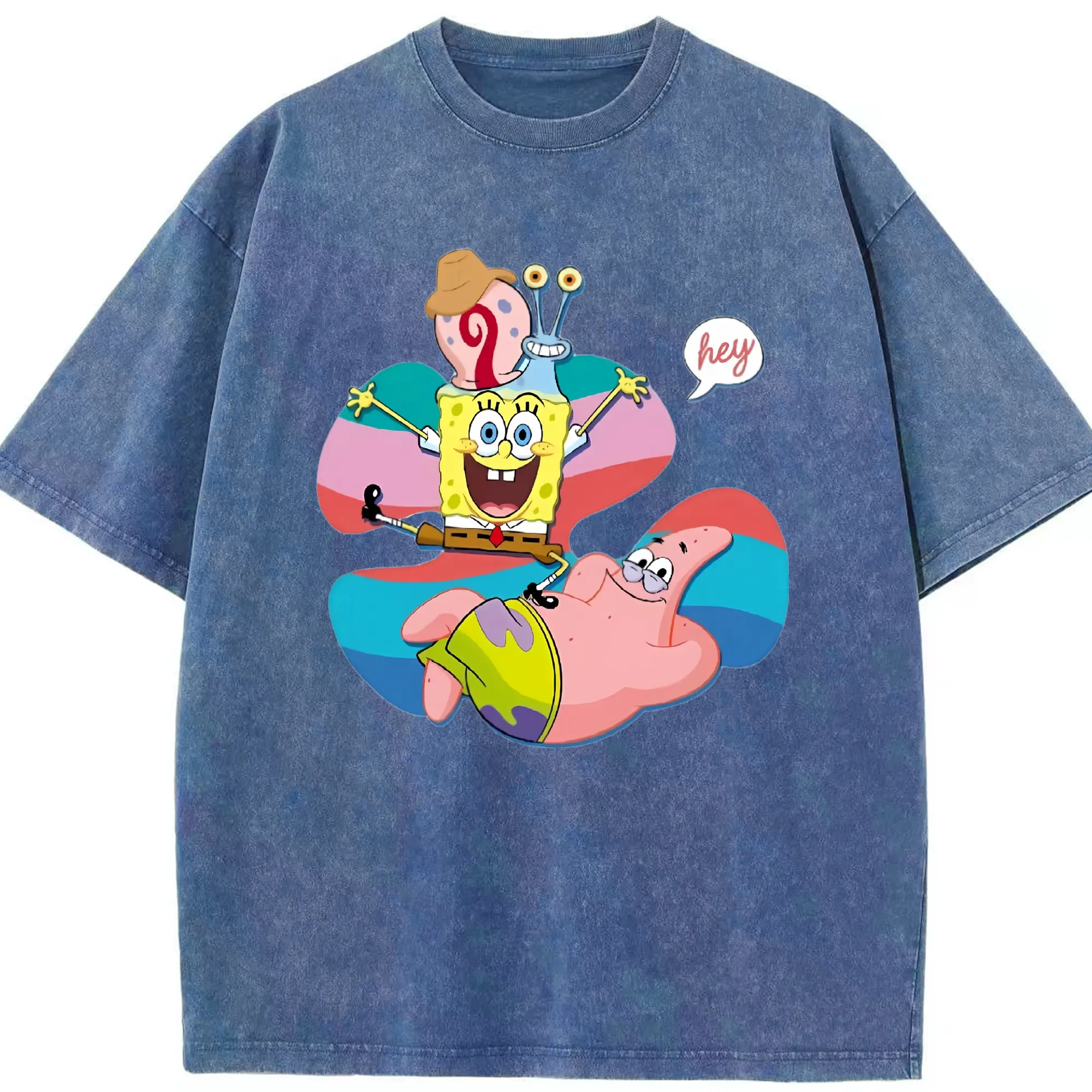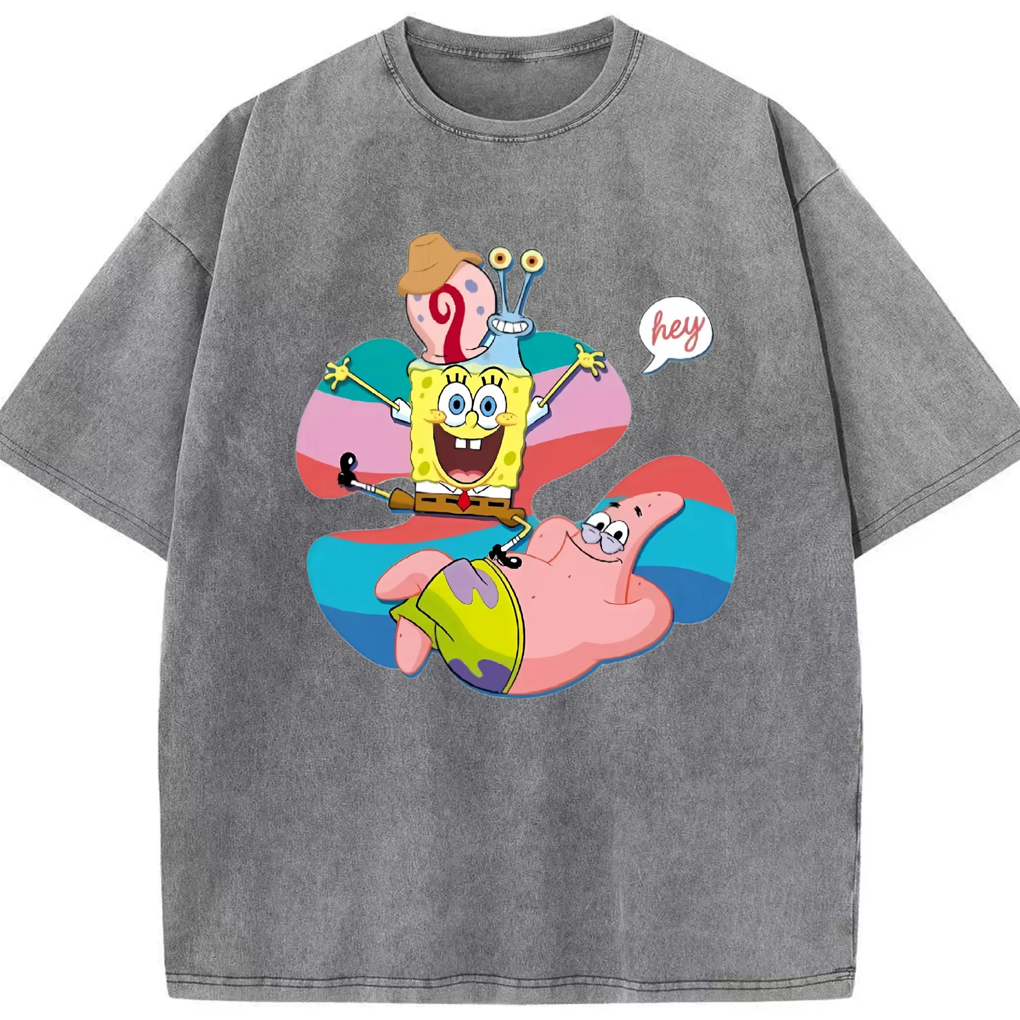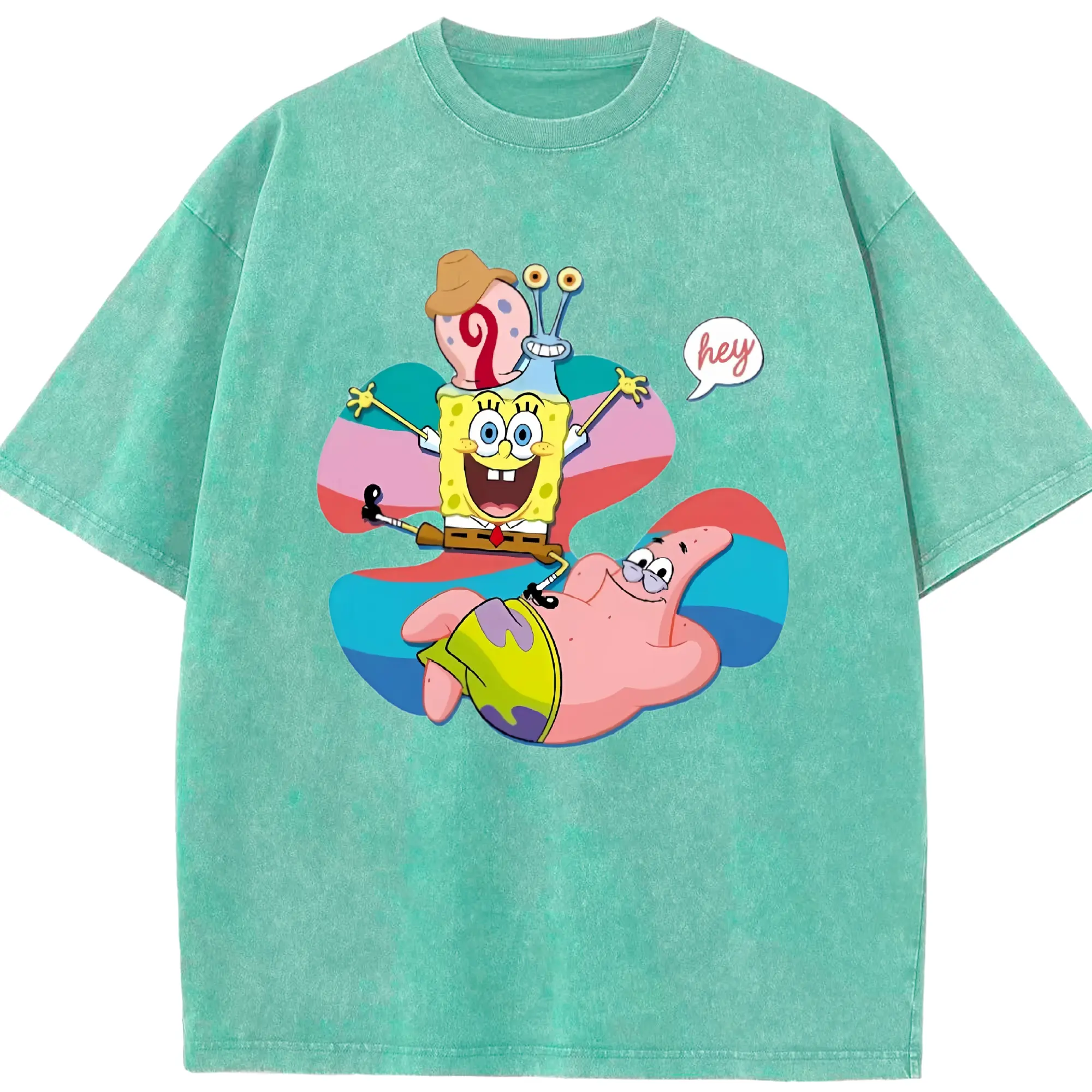 Spongebob squarepants and Patrick Star,Gary the Snail t-shirt - Washed Vintage Look 230g Cotton Oversized T-Shirt With Front Heat Transfer Print – Soft, Lightweight, Stylish Fit – Comfortable Casual Wear For Sports & Everyday Use