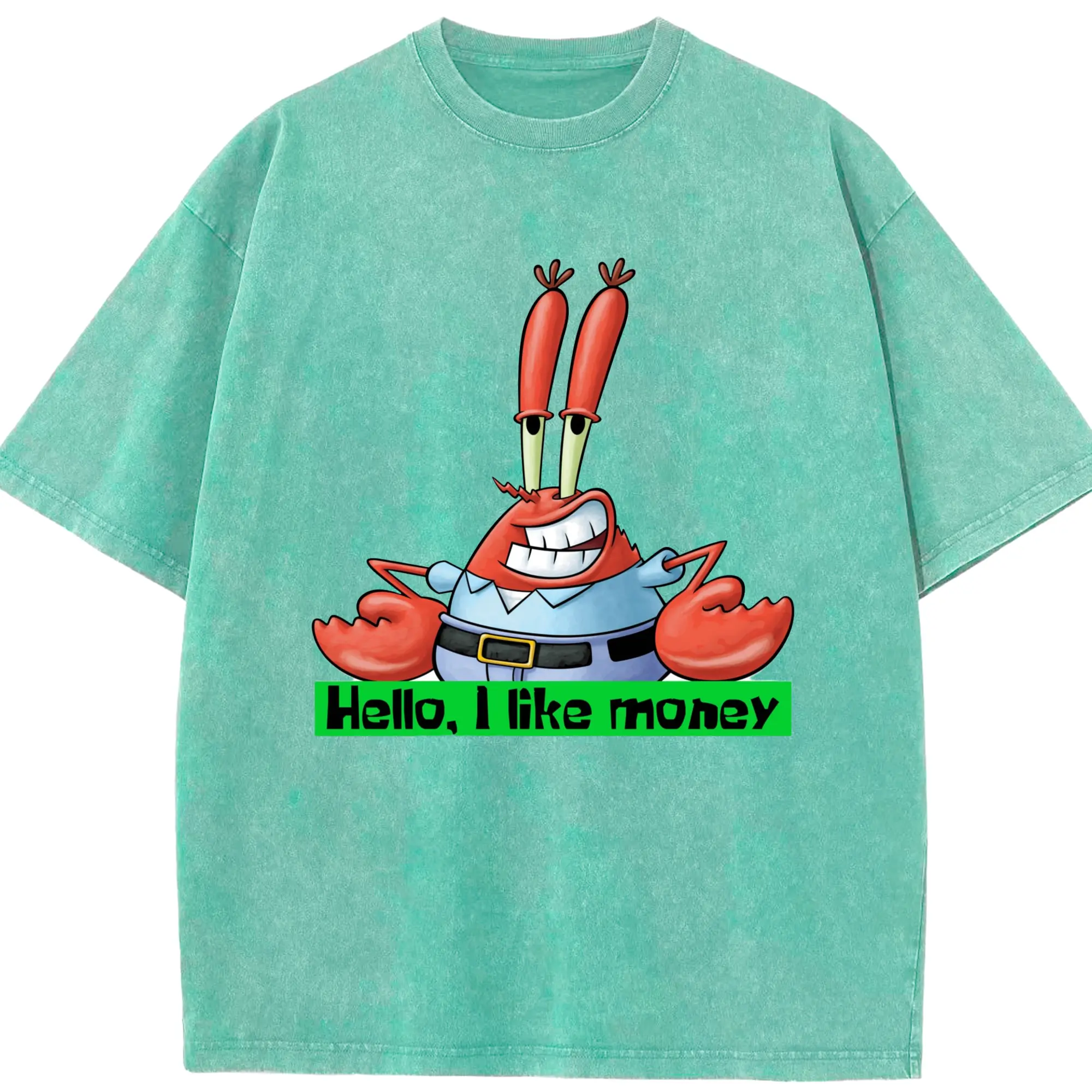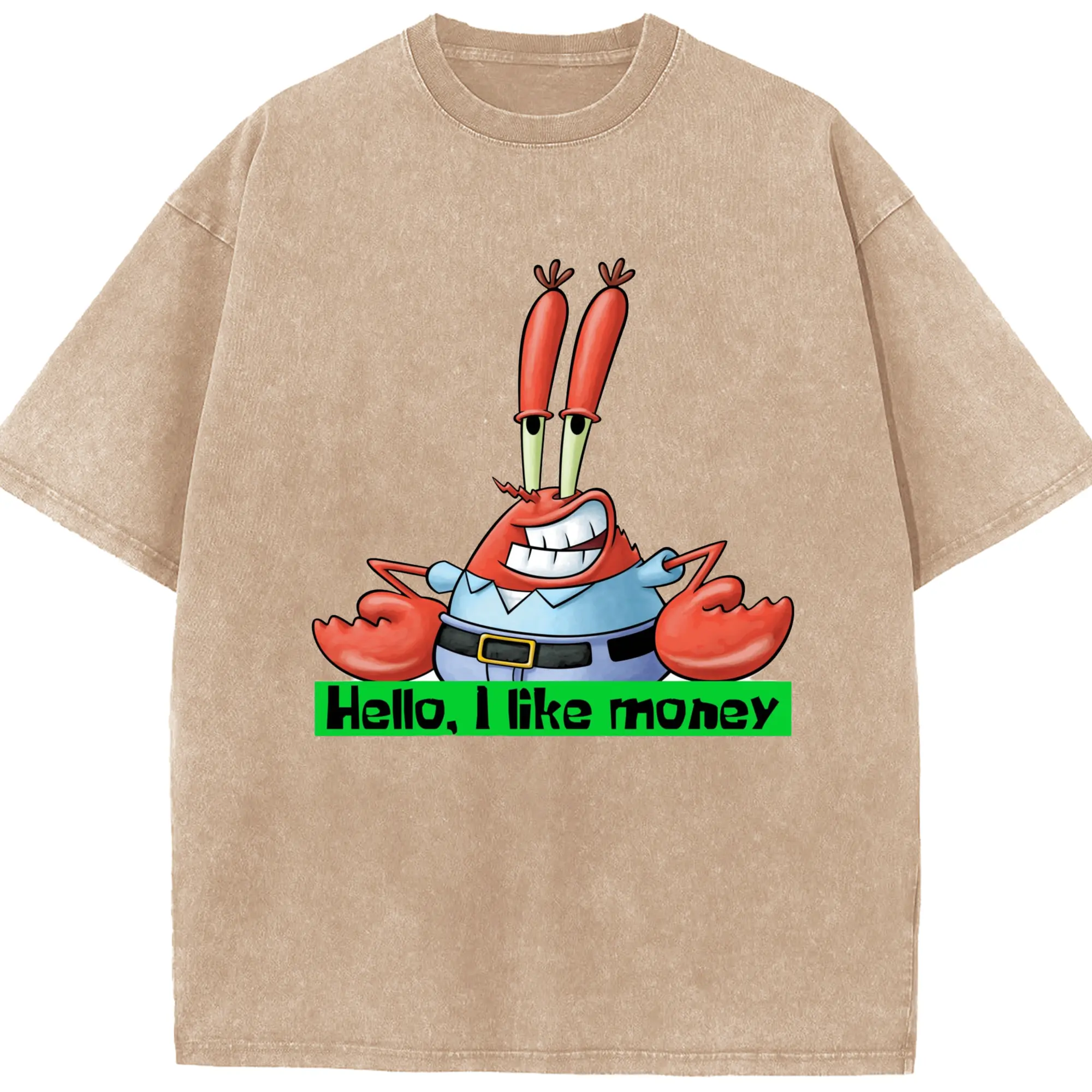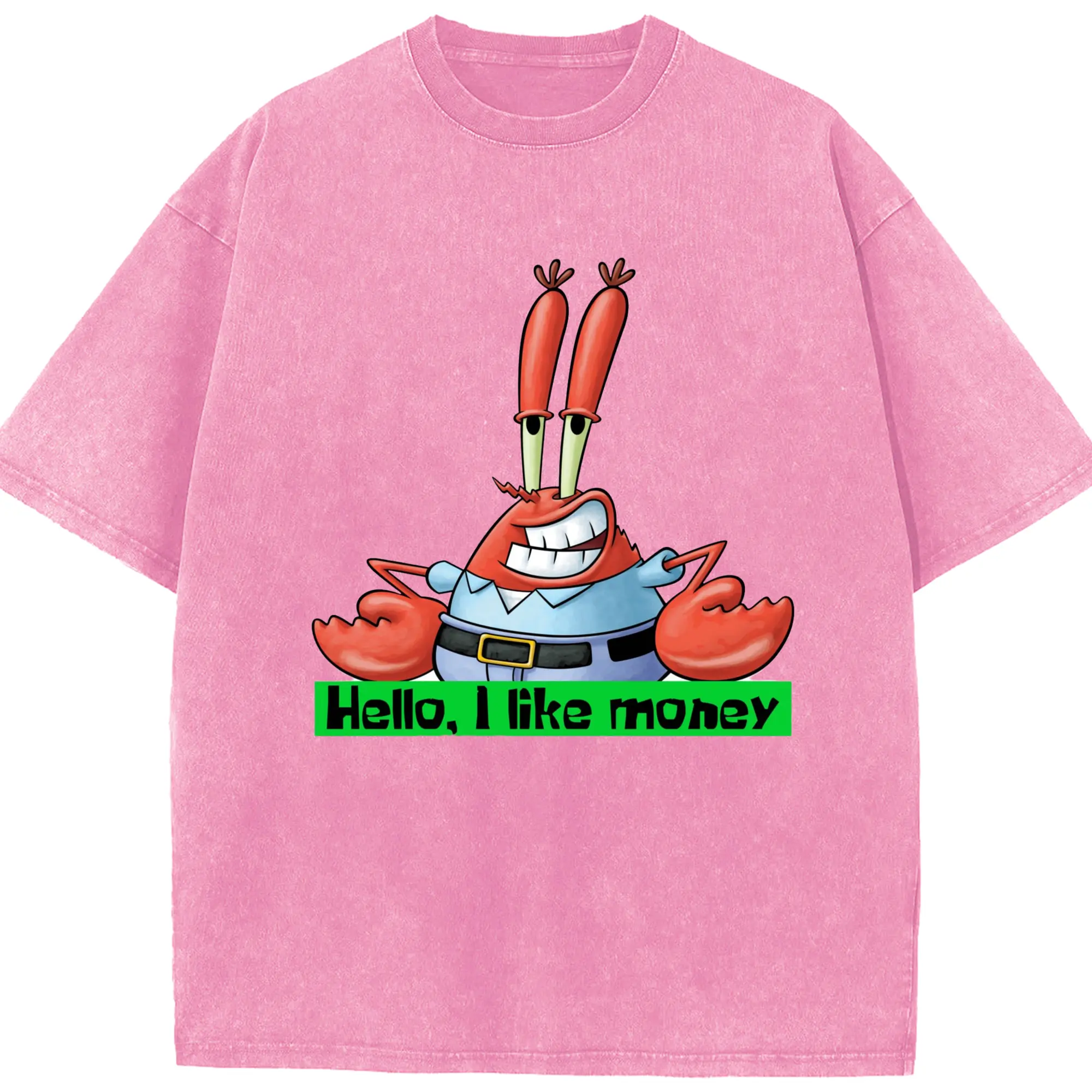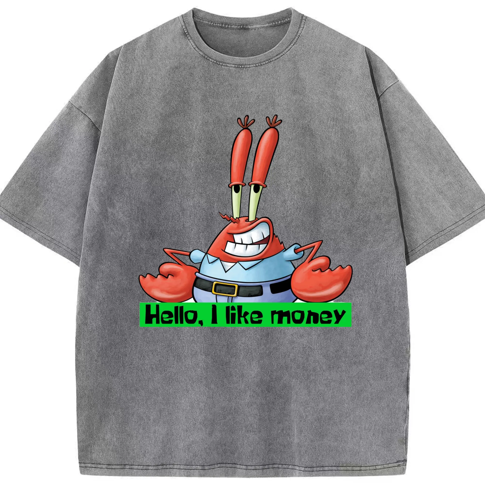 Spongebob Squarepants Mr. Krabs i like monry Shirt - Washed Vintage Look 230g Cotton Oversized T-Shirt With Front Heat Transfer Print – Soft, Lightweight, Stylish Fit – Comfortable Casual Wear For Sports & Everyday Use