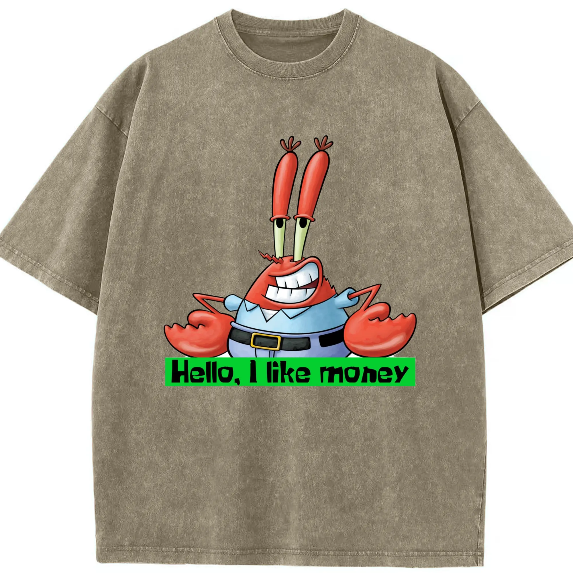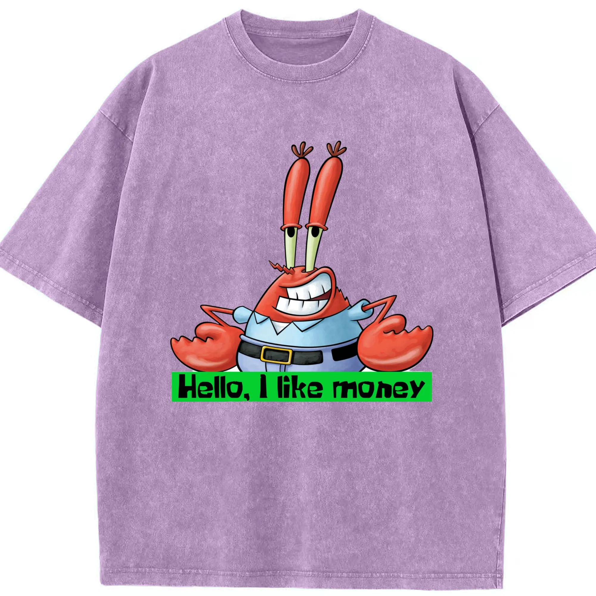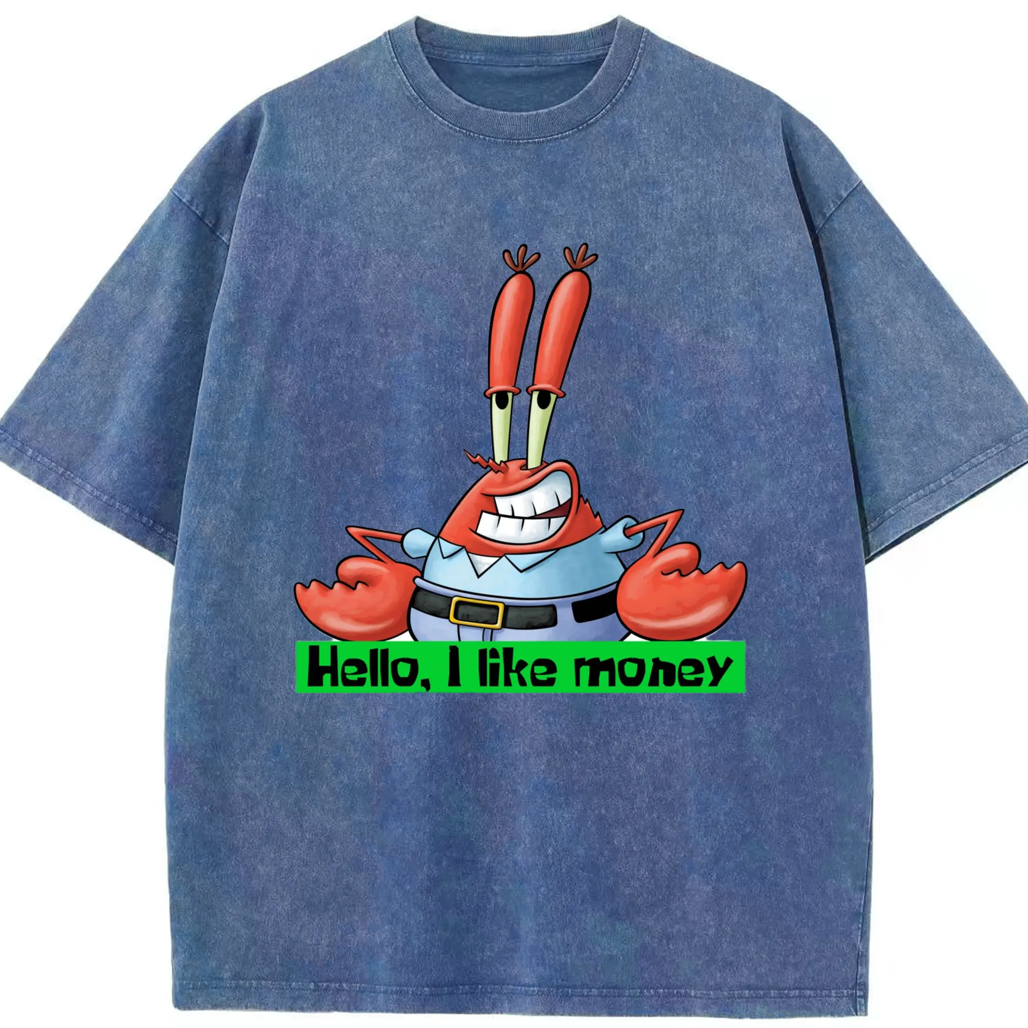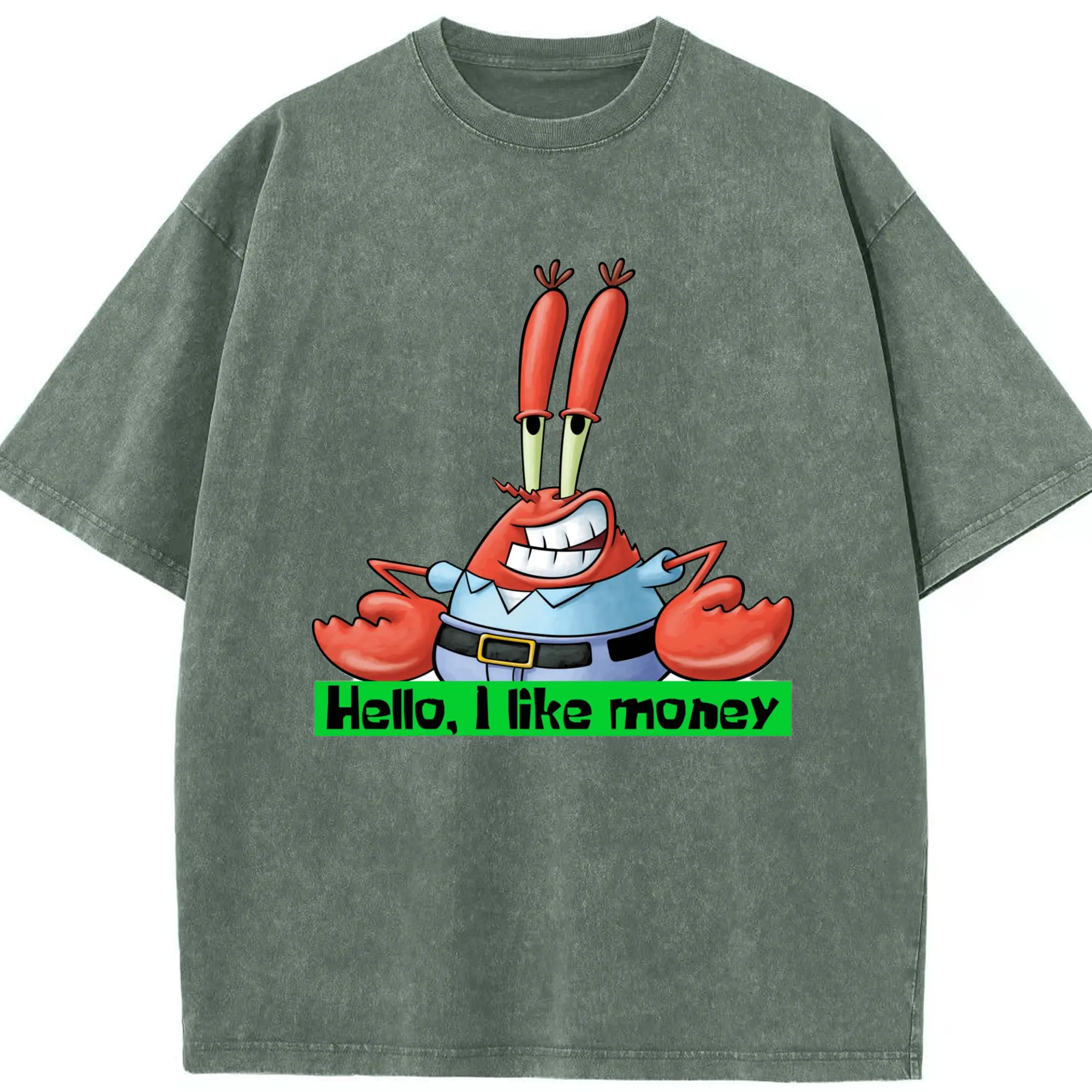 Spongebob Squarepants Mr. Krabs i like monry Shirt - Washed Vintage Look 230g Cotton Oversized T-Shirt With Front Heat Transfer Print – Soft, Lightweight, Stylish Fit – Comfortable Casual Wear For Sports & Everyday Use
