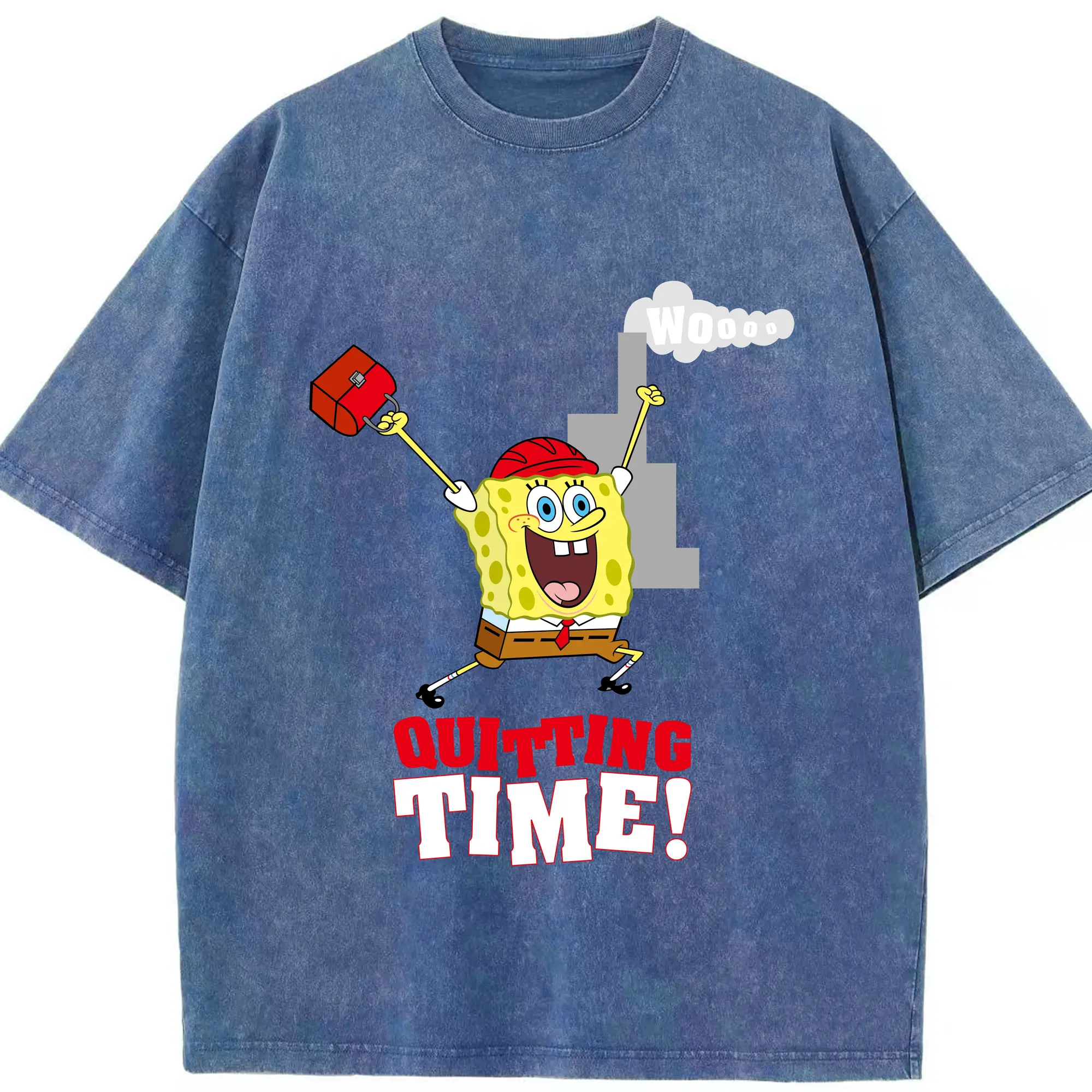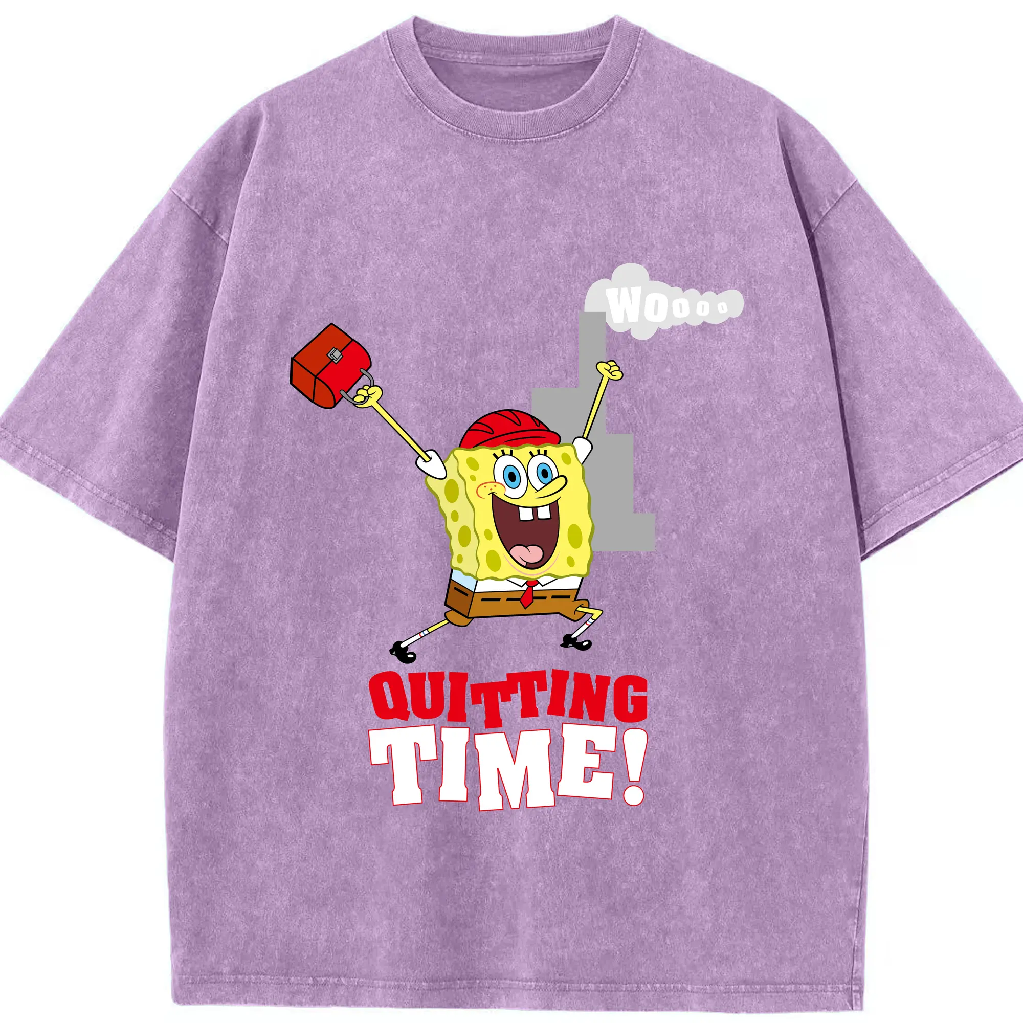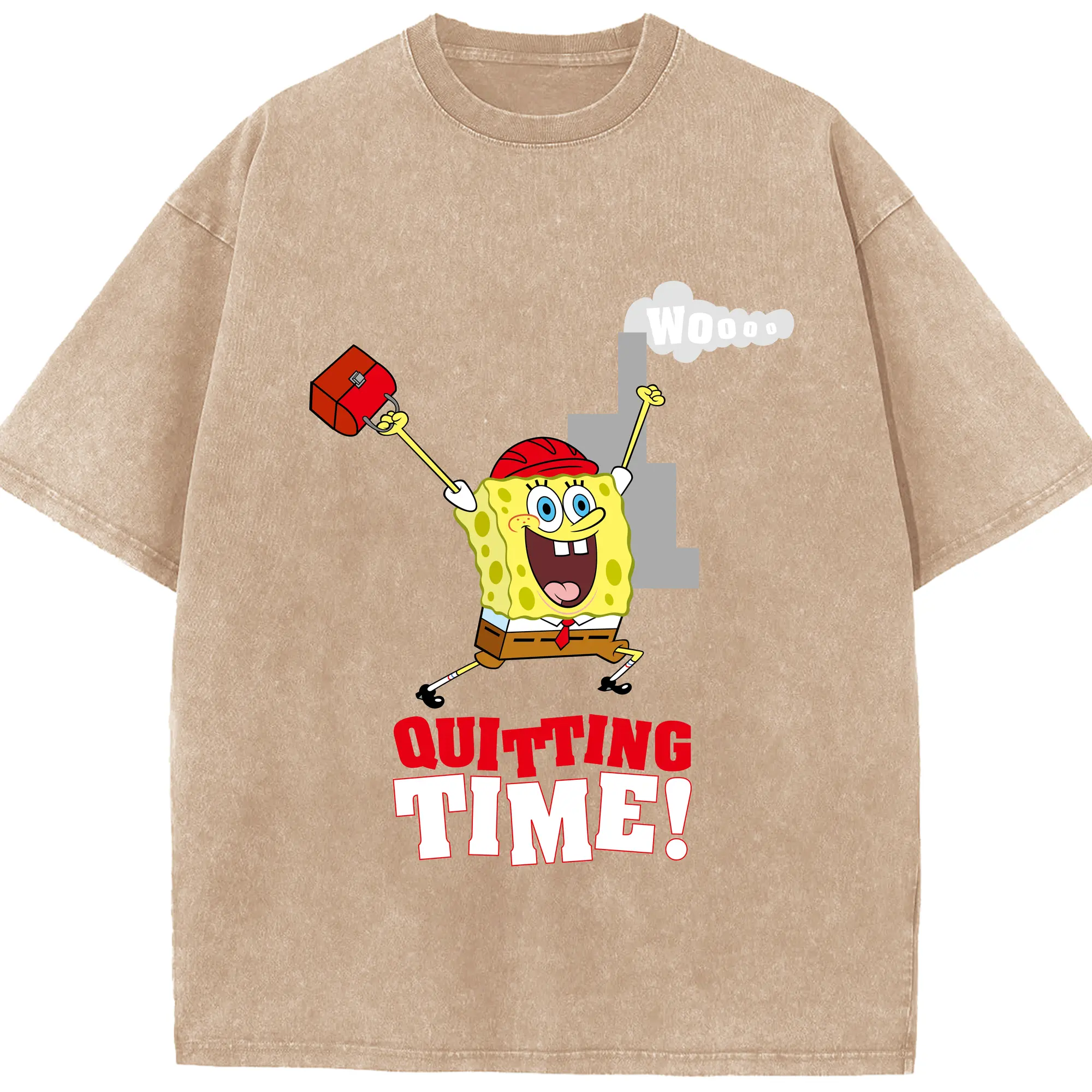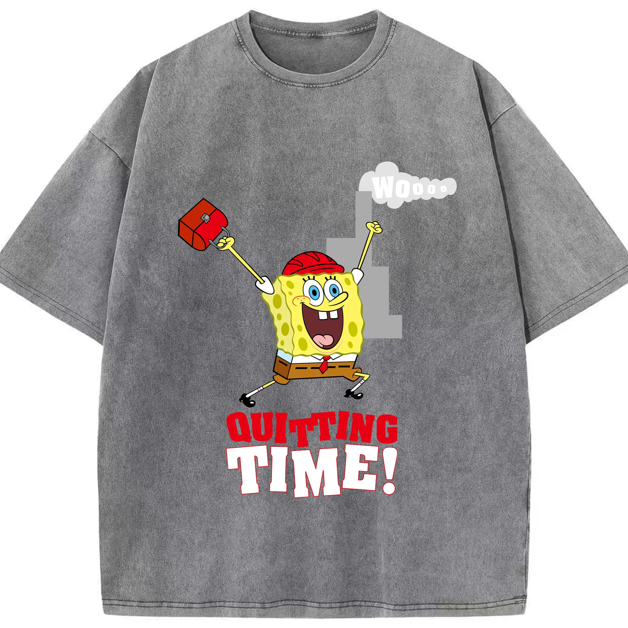 Spongebob squarepants quitting time graphic t-shirt - Washed Vintage Look 230g Cotton Oversized T-Shirt With Front Heat Transfer Print – Soft, Lightweight, Stylish Fit – Comfortable Casual Wear For Sports & Everyday Use