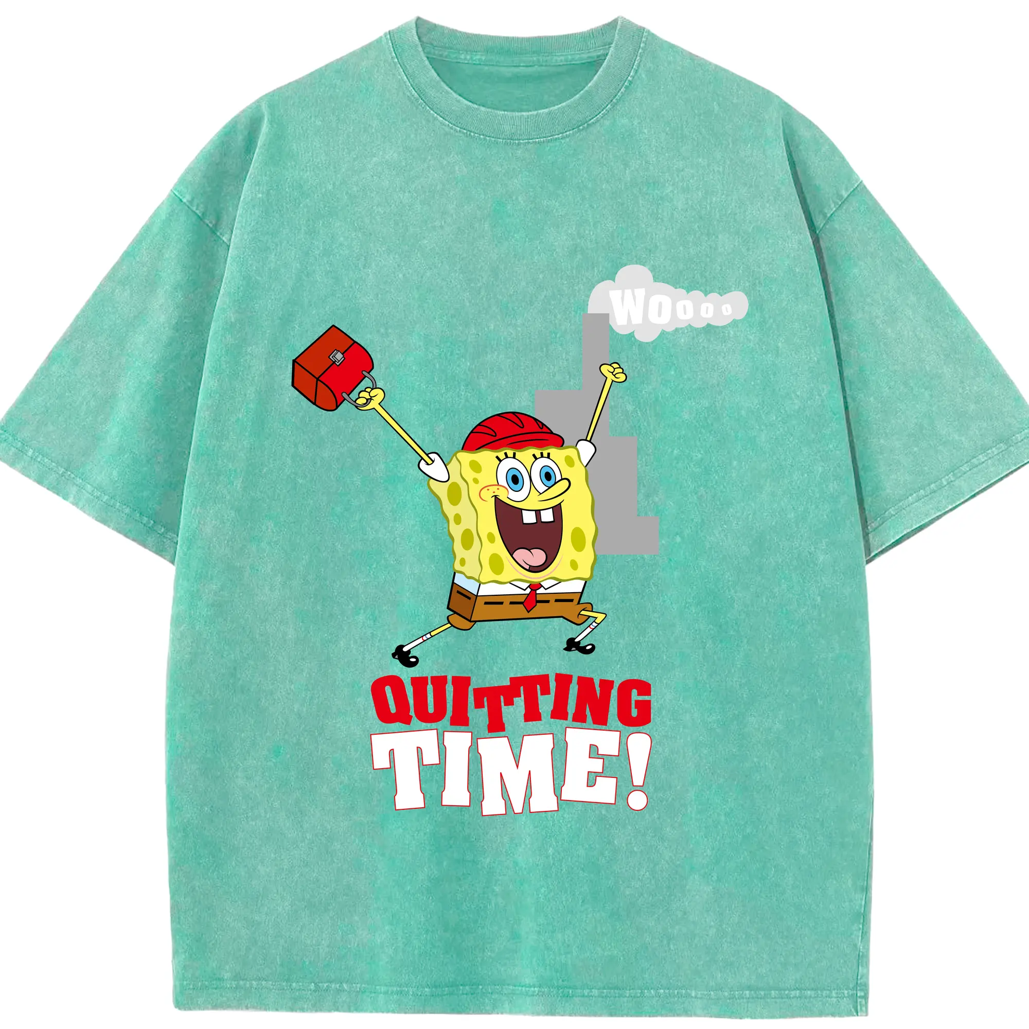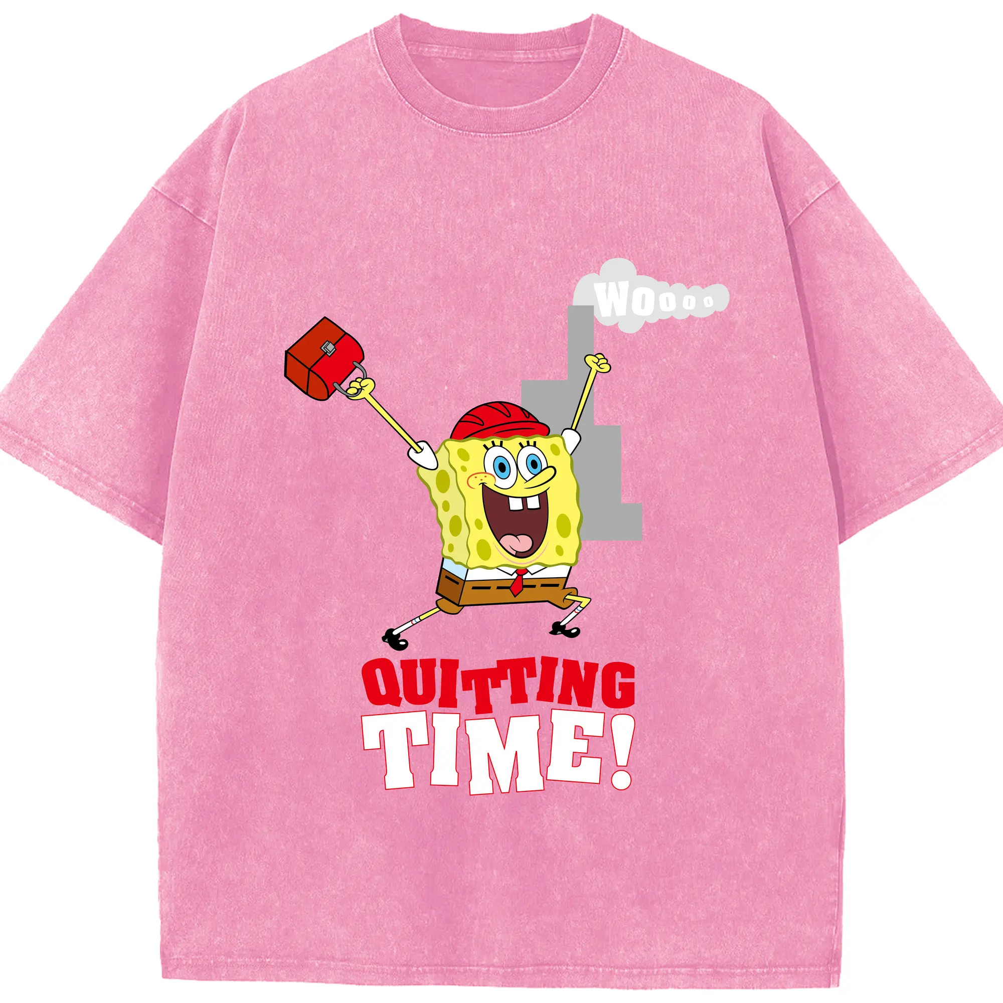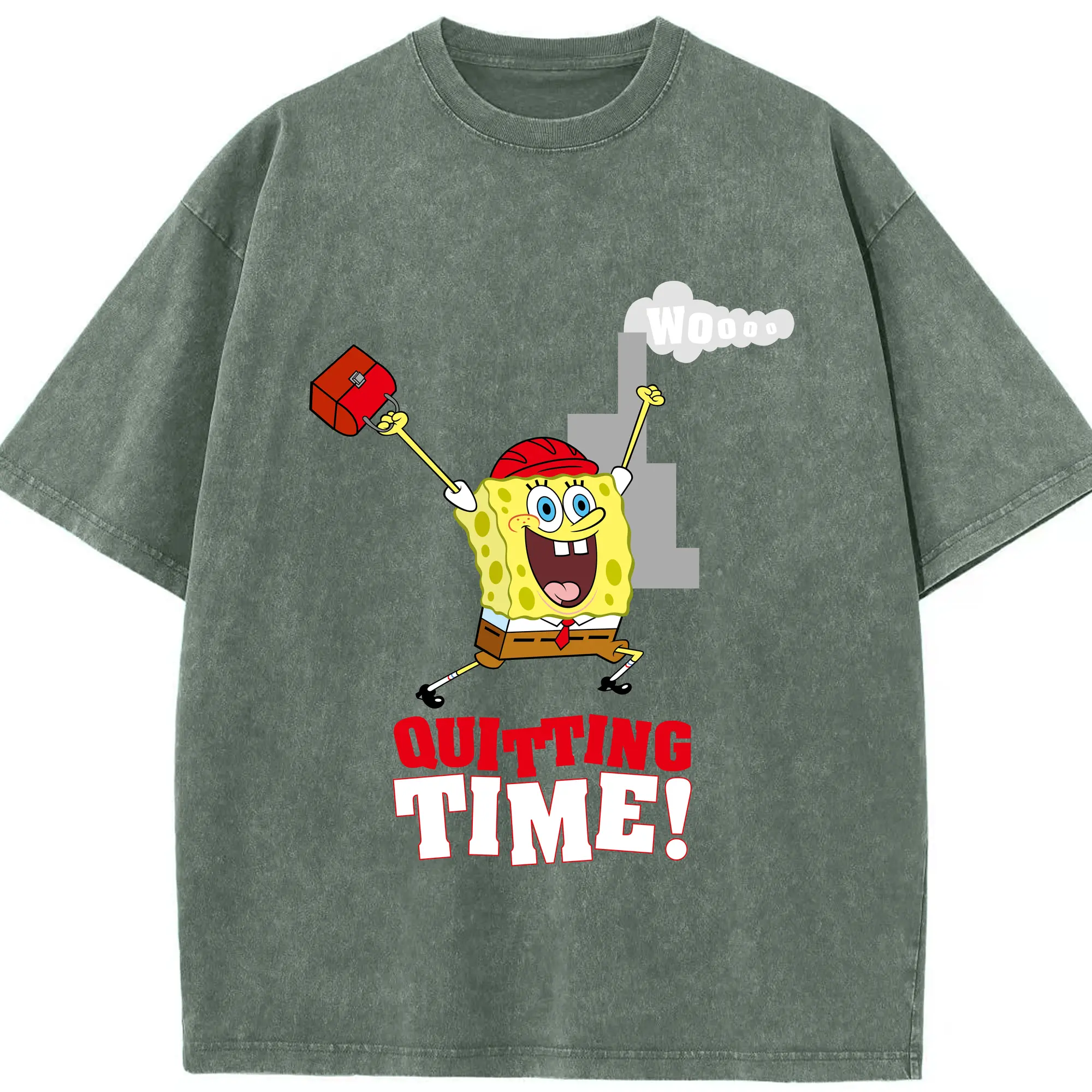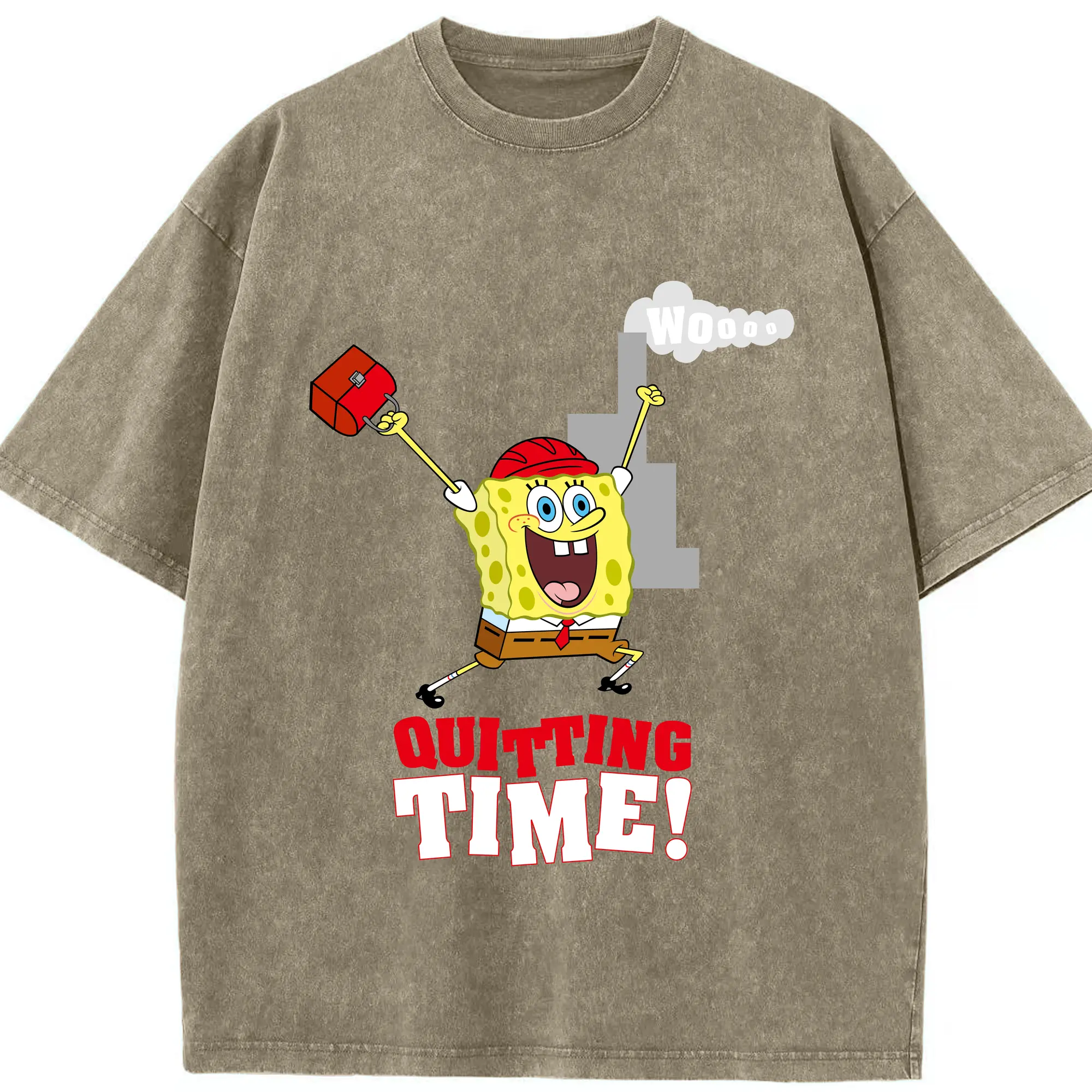 Spongebob squarepants quitting time graphic t-shirt - Washed Vintage Look 230g Cotton Oversized T-Shirt With Front Heat Transfer Print – Soft, Lightweight, Stylish Fit – Comfortable Casual Wear For Sports & Everyday Use