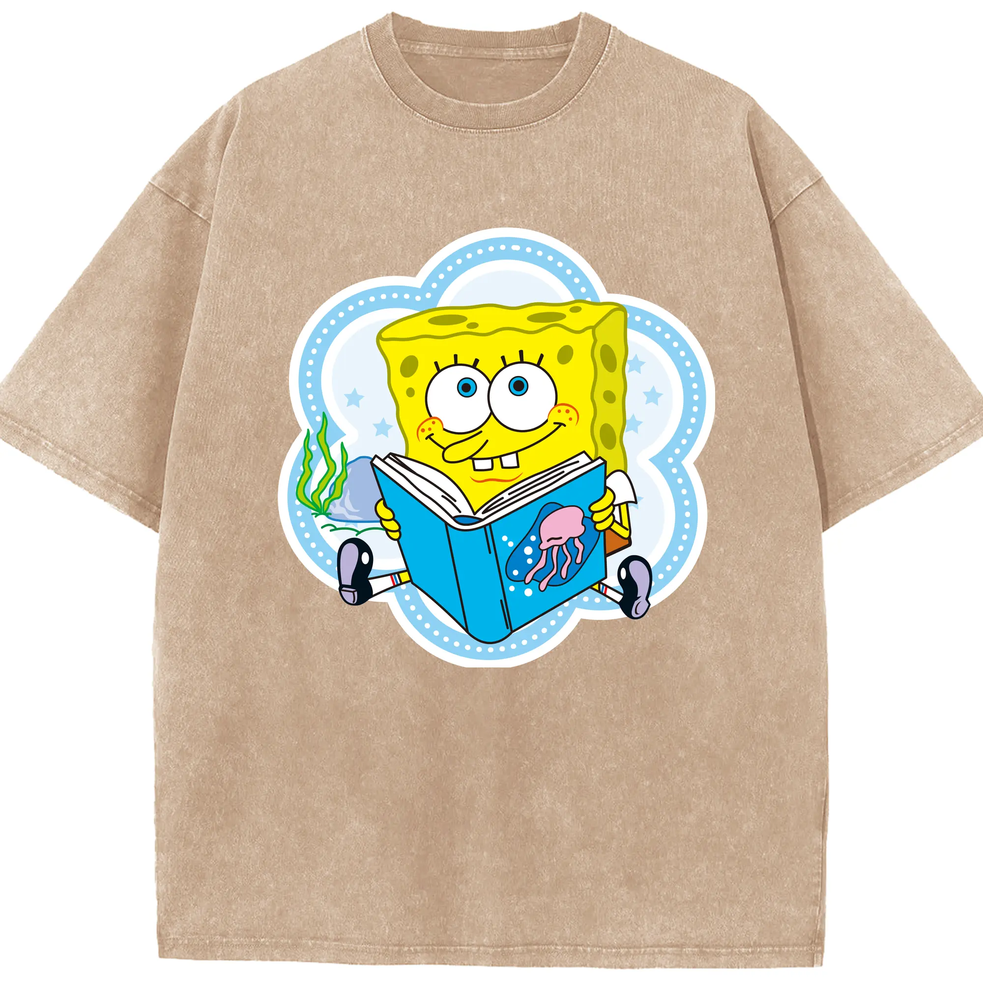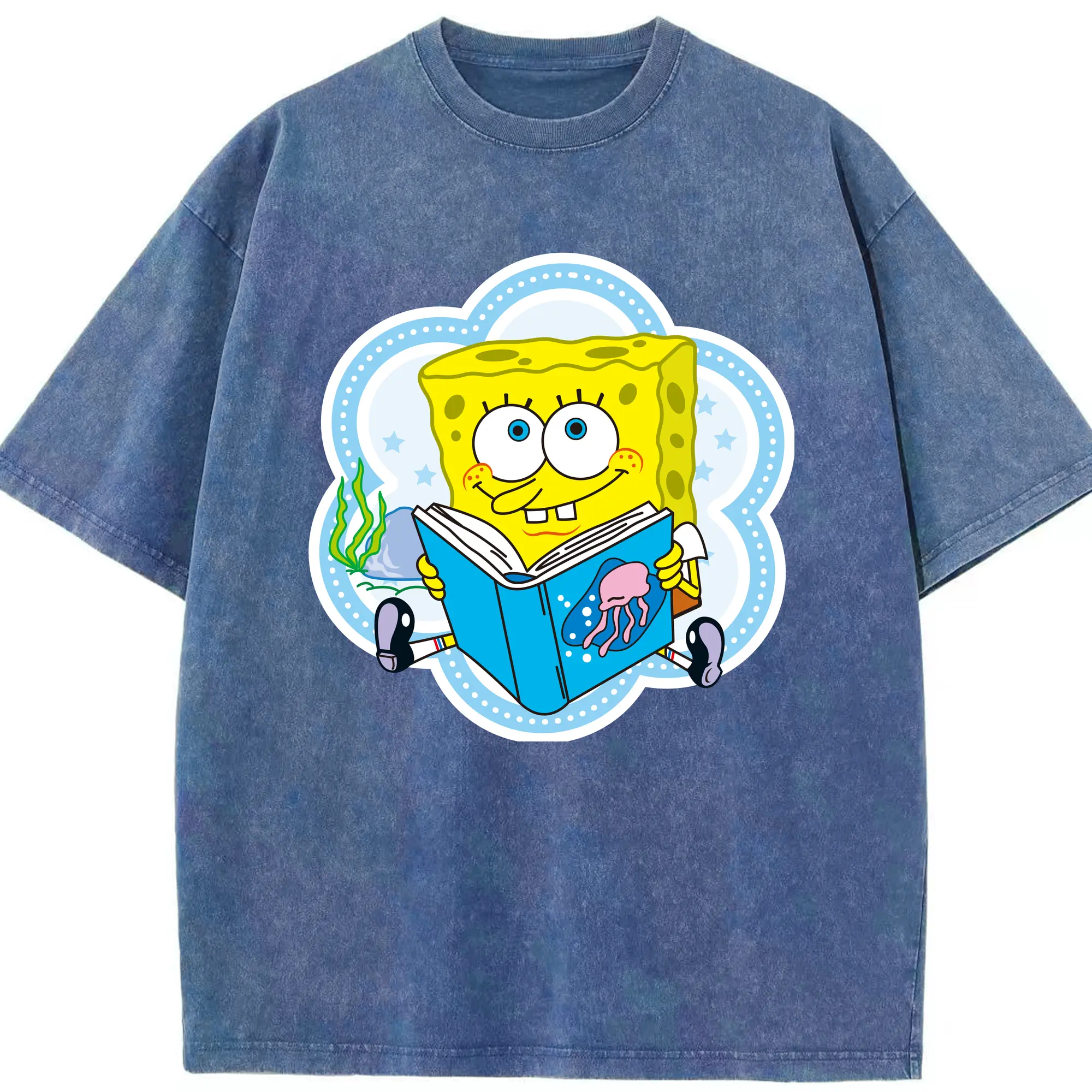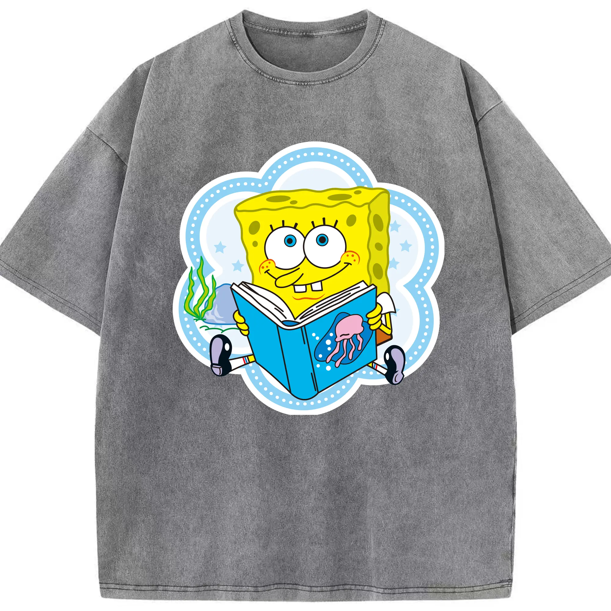 Spongebob squarepants reading book graphic t-shirt - Washed Vintage Look 230g Cotton Oversized T-Shirt With Front Heat Transfer Print – Soft, Lightweight, Stylish Fit – Comfortable Casual Wear For Sports & Everyday Use